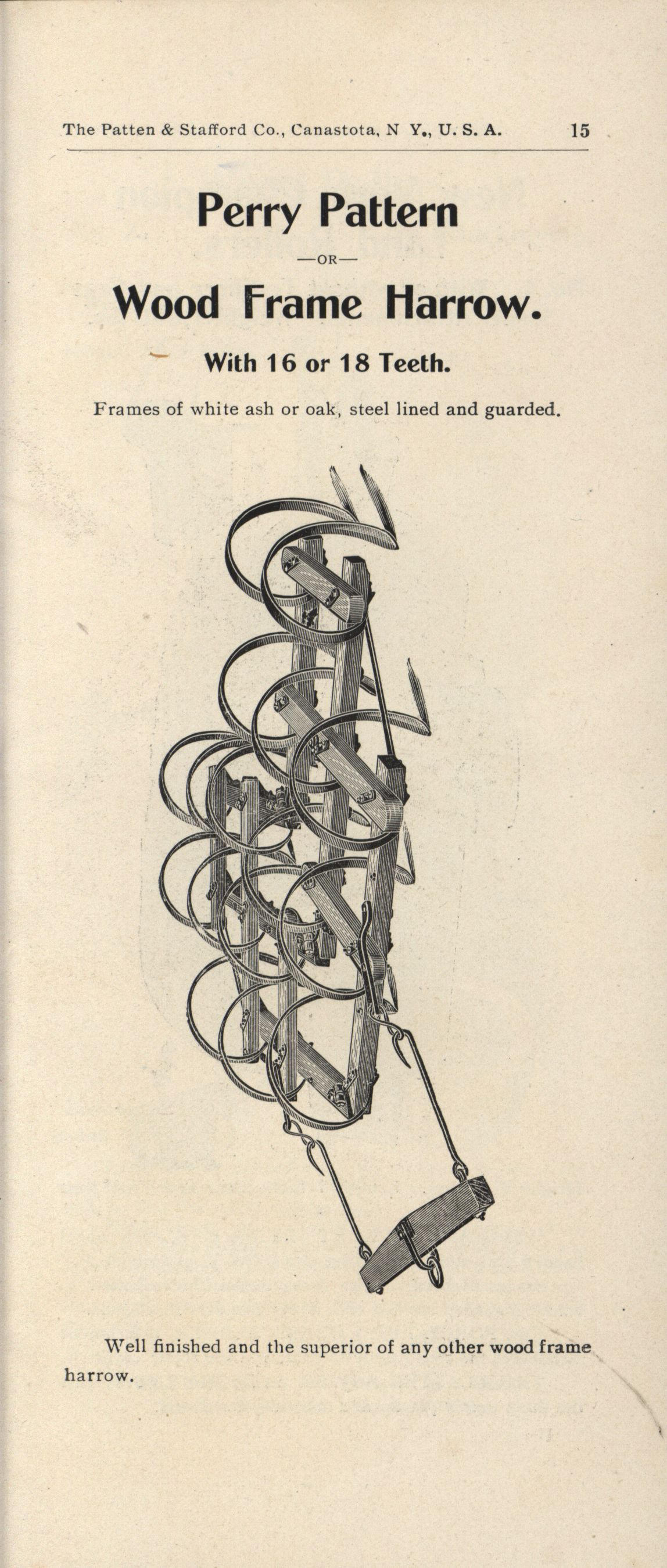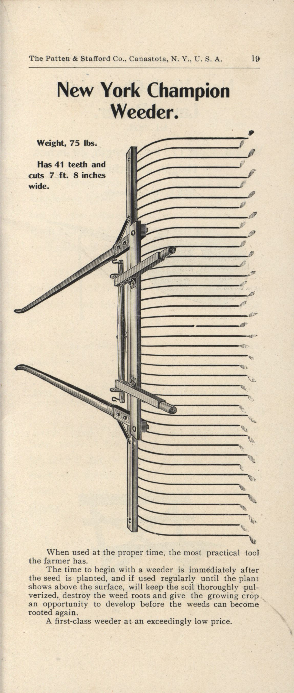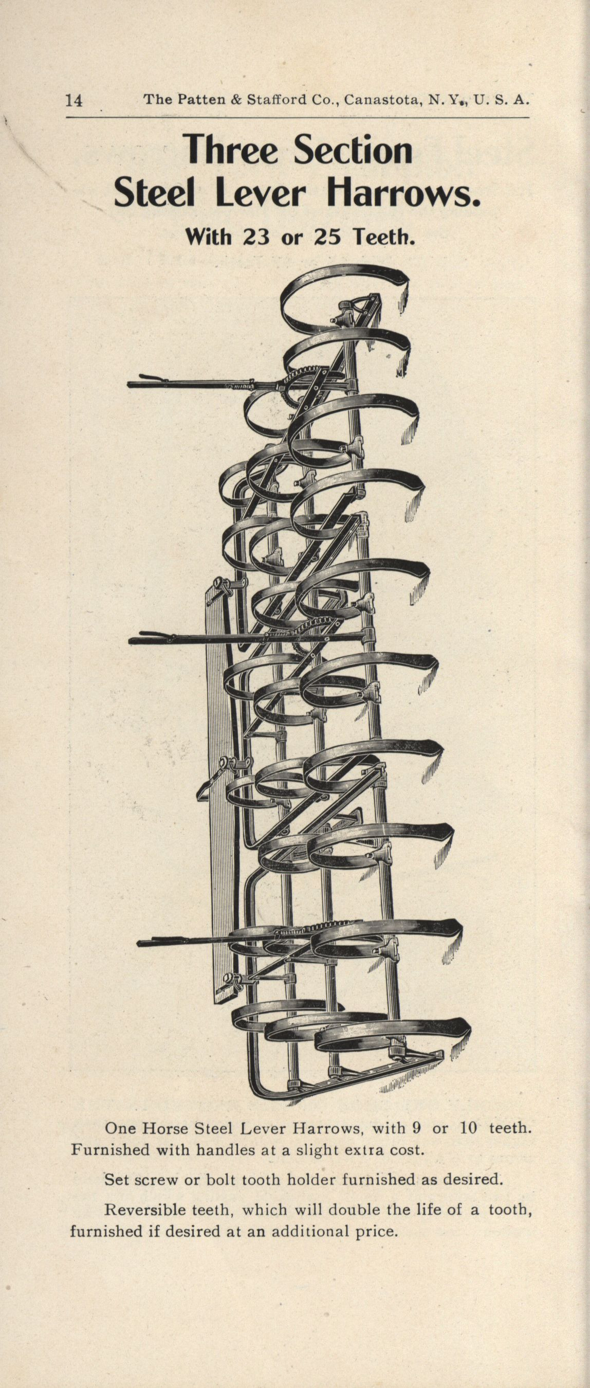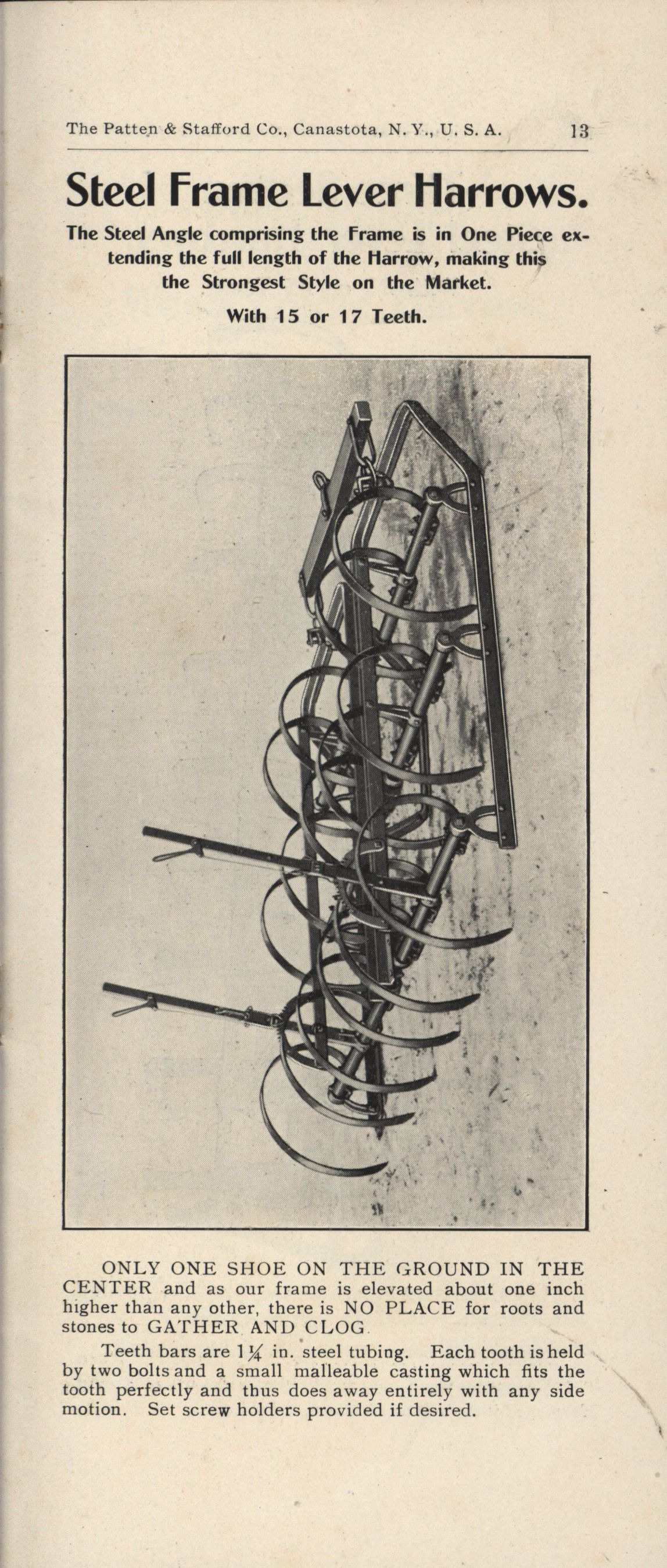 - Illustrated catalog describing the New York Champion Rakes and Spring Tooth Lever Harrows offered by Patten and Stafford Company.