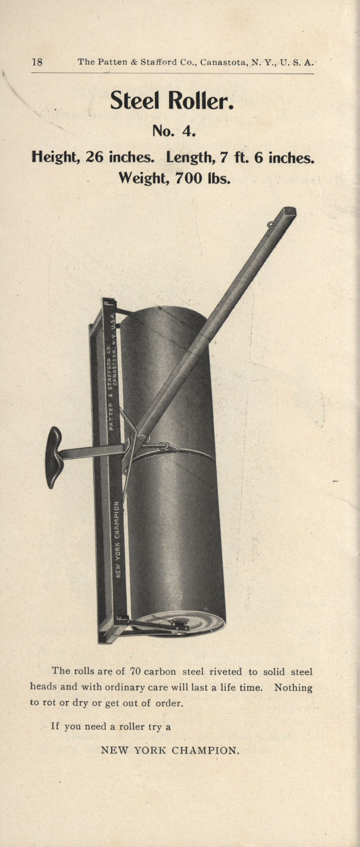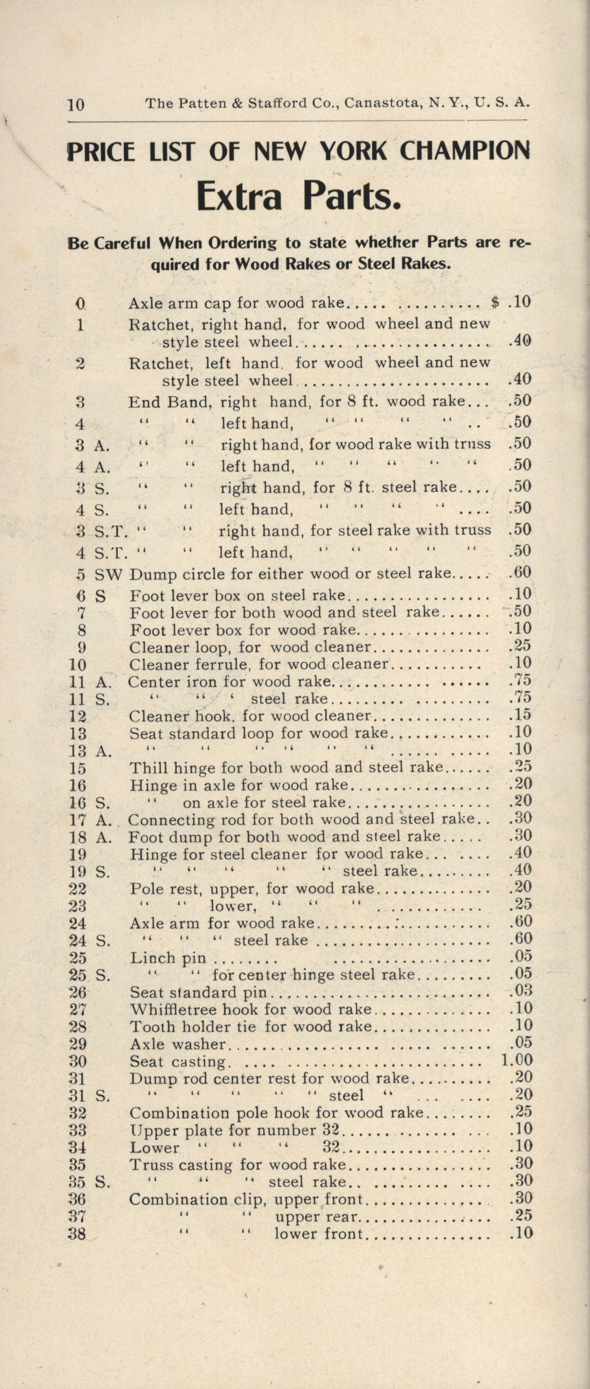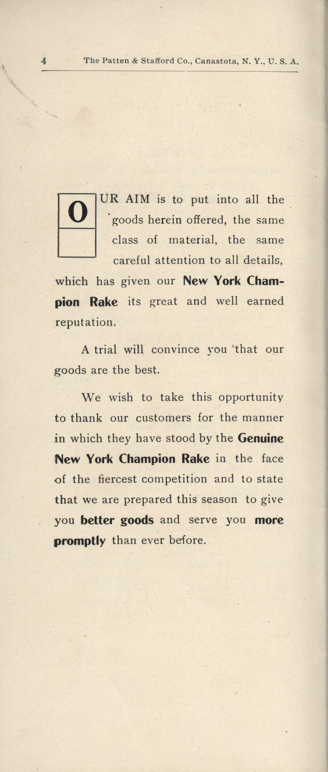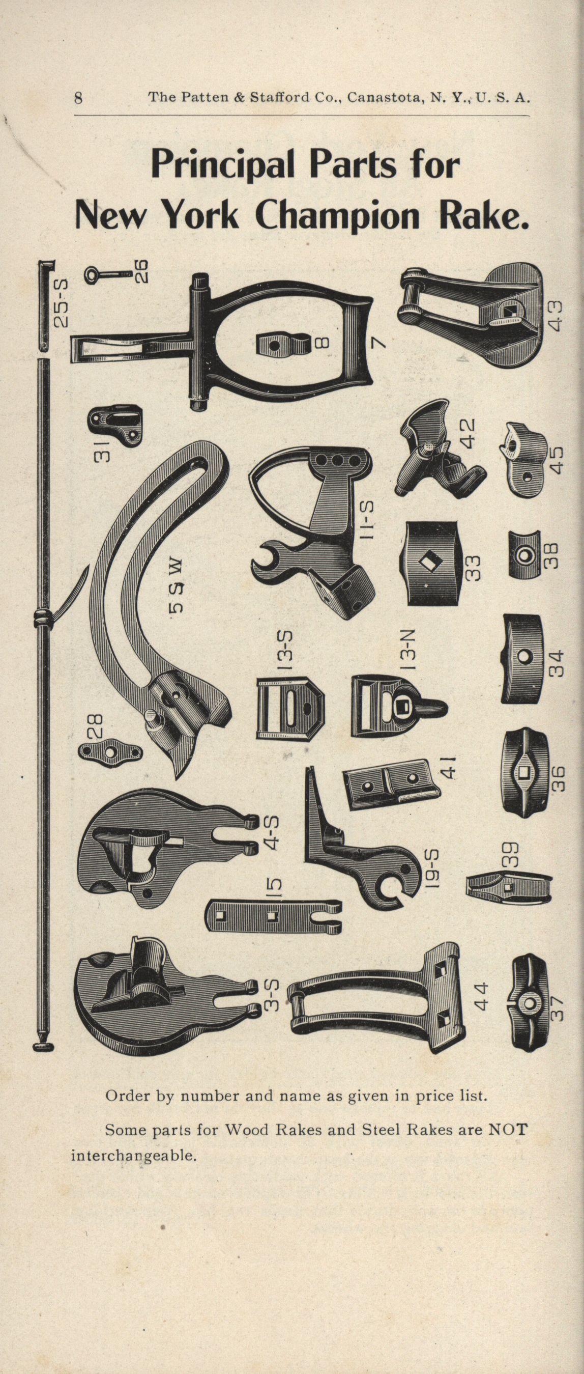 - Illustrated catalog describing the New York Champion Rakes and Spring Tooth Lever Harrows offered by Patten and Stafford Company.