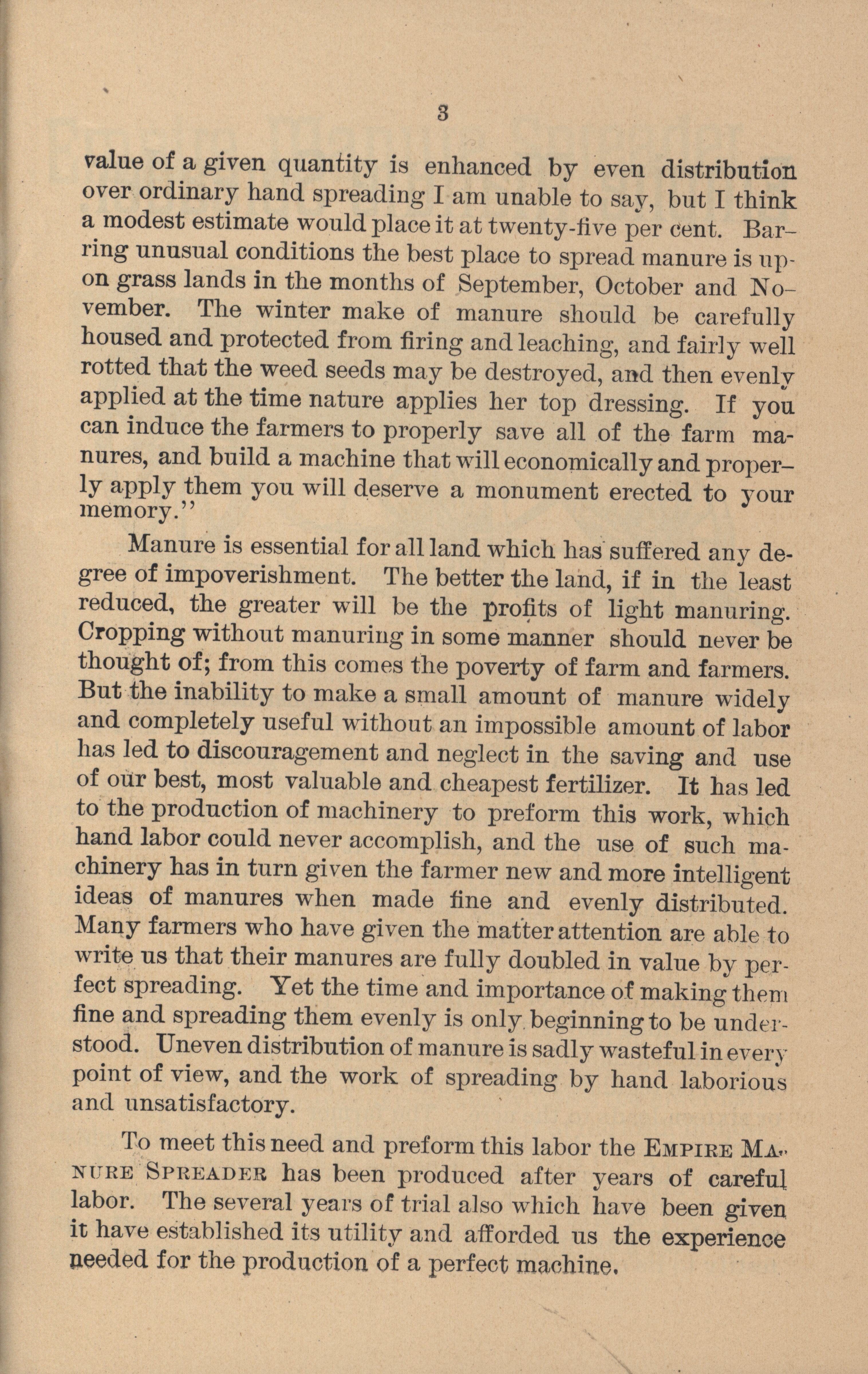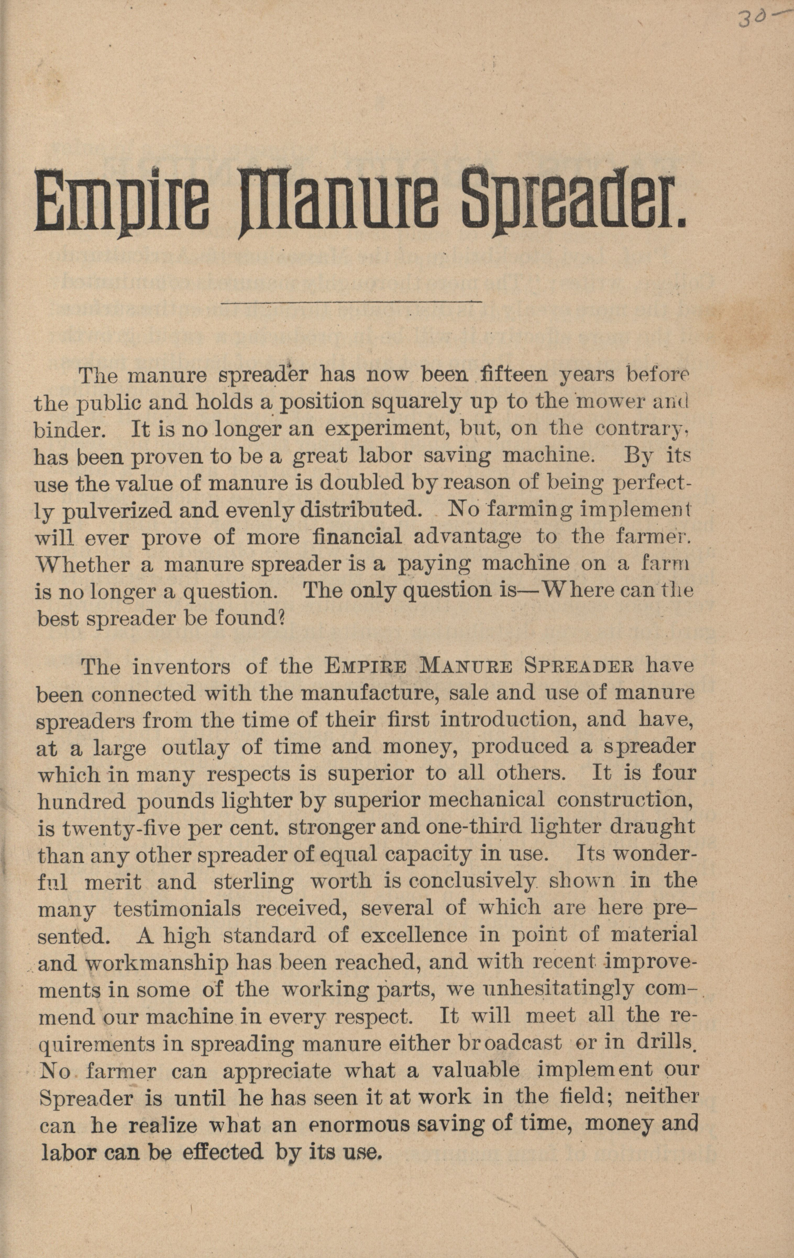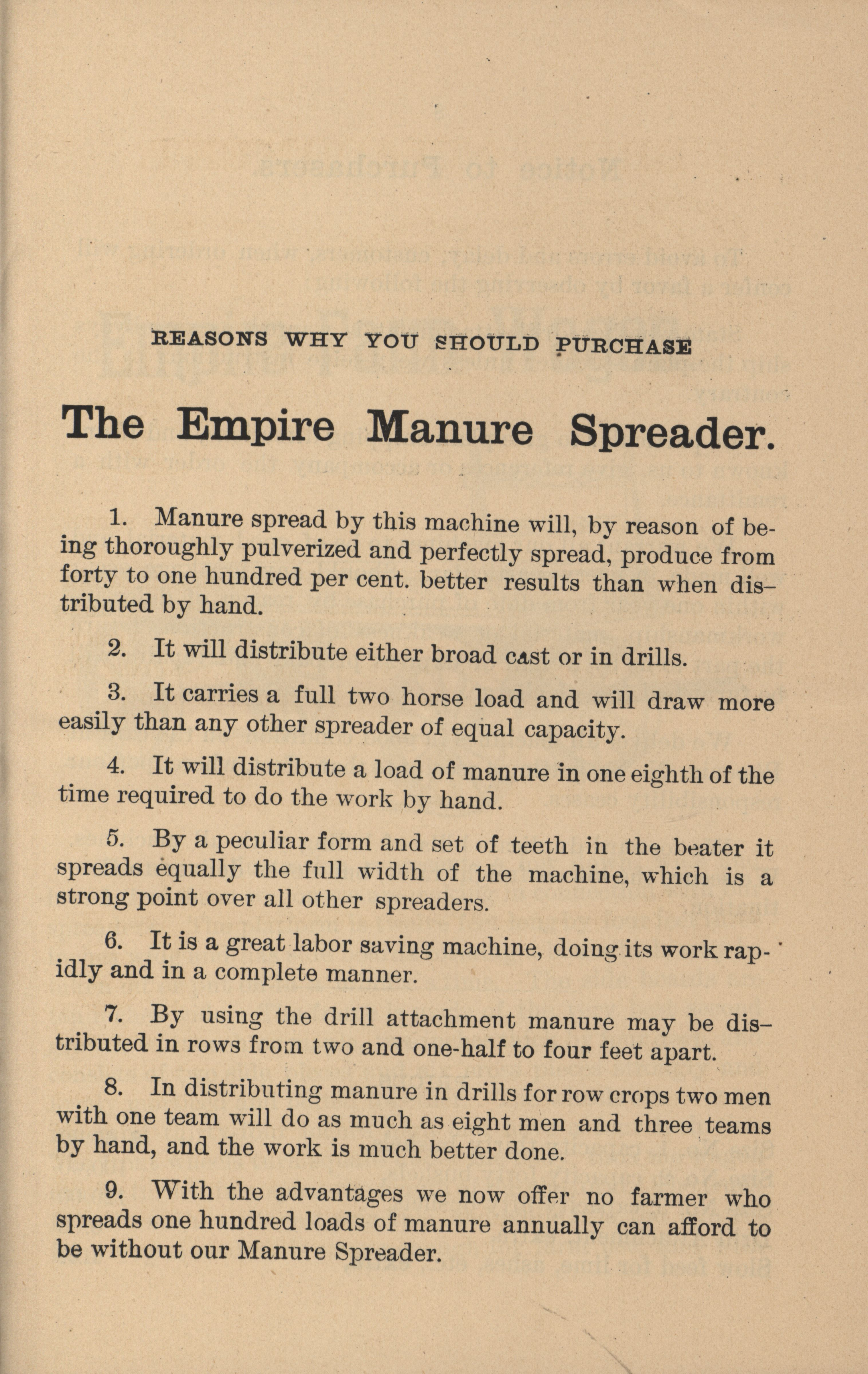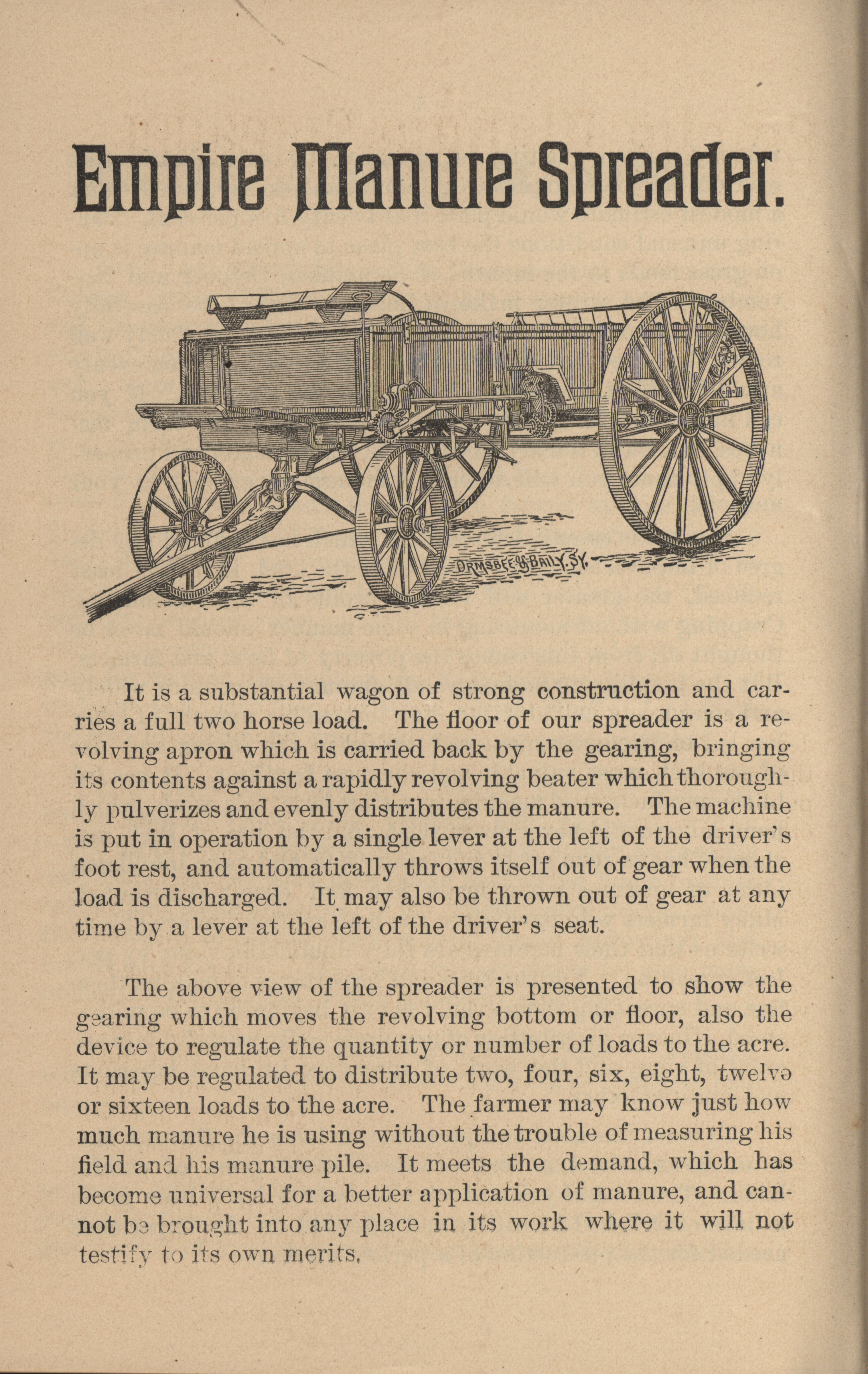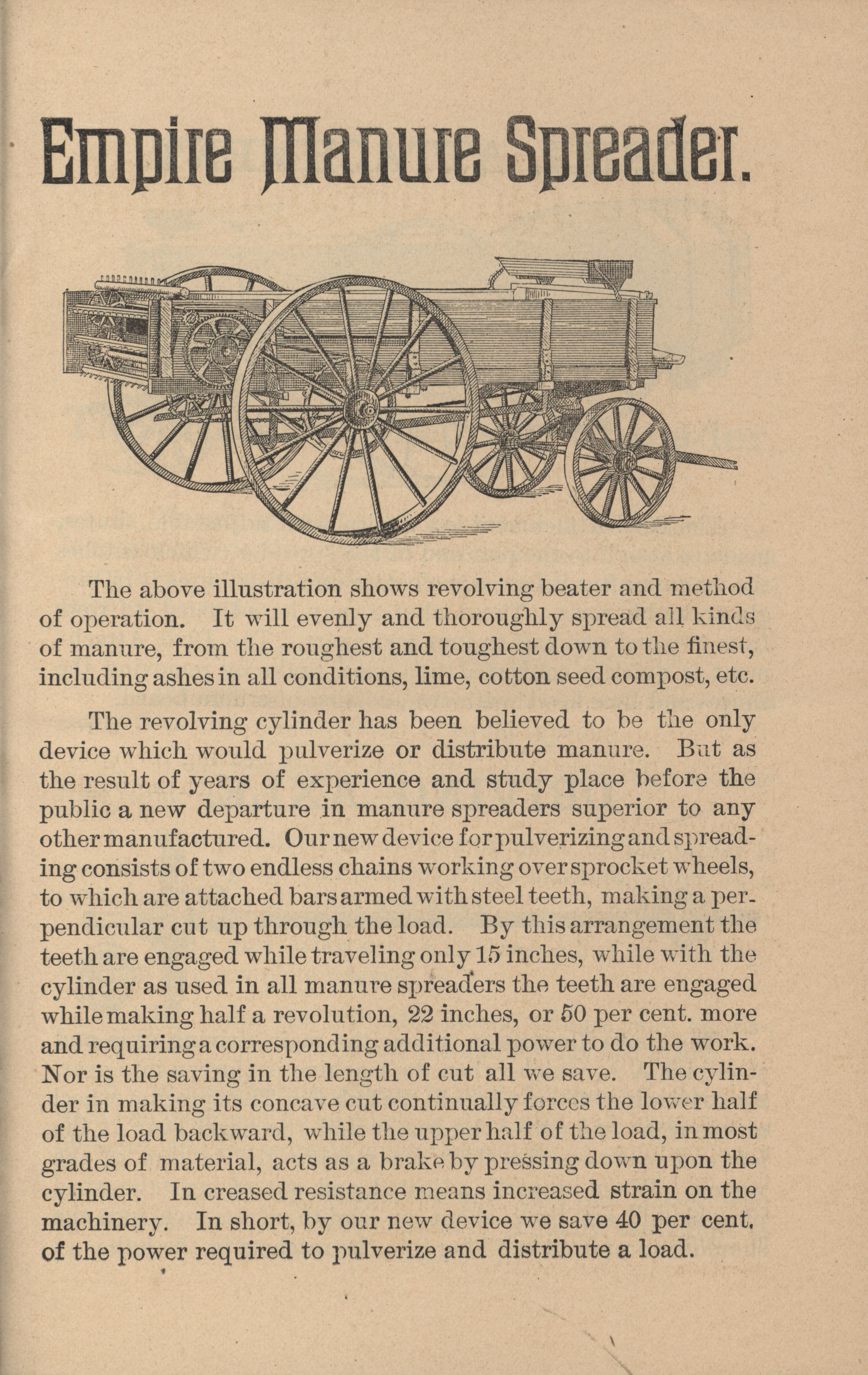 - Illustrated catalog describing the Empire Manure Spreader offered by The Phoenix Spreader Company.