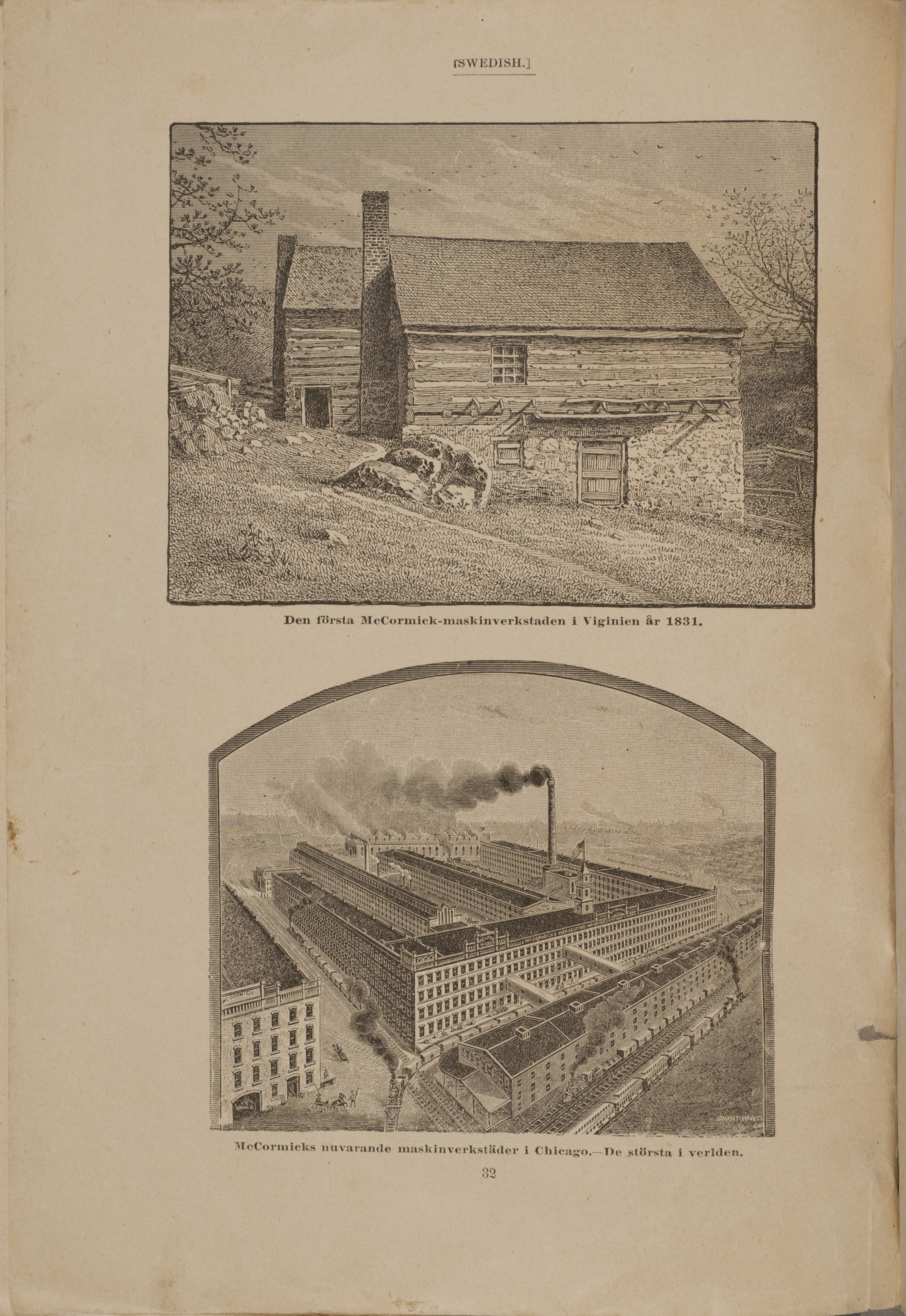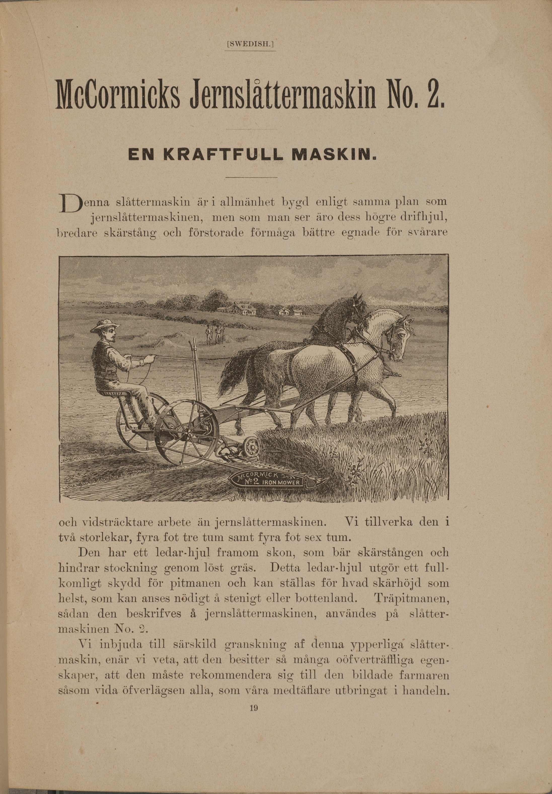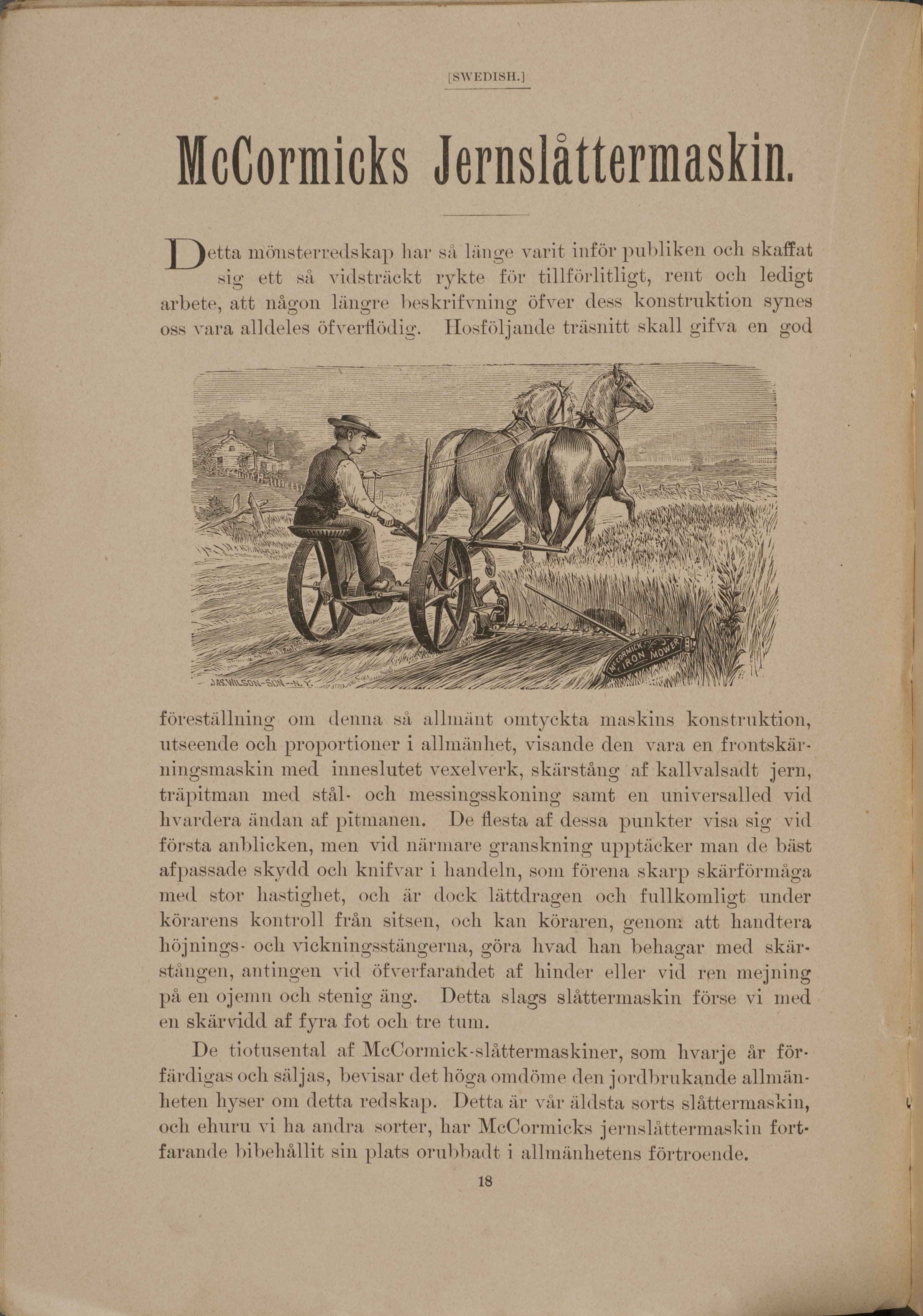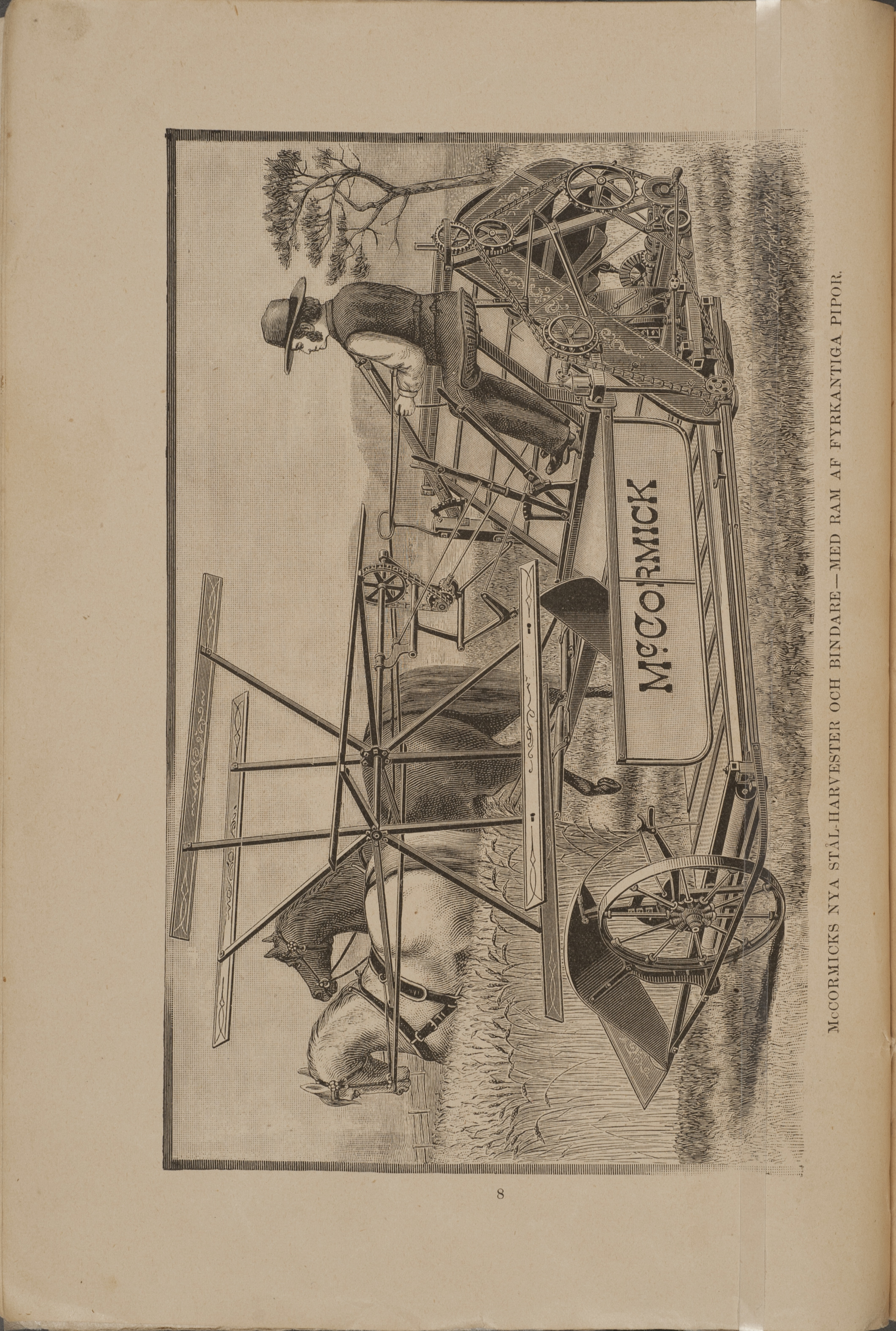 - Illustrated catalog in Swedish advertising the products manufactured by McCormick Machine Company.