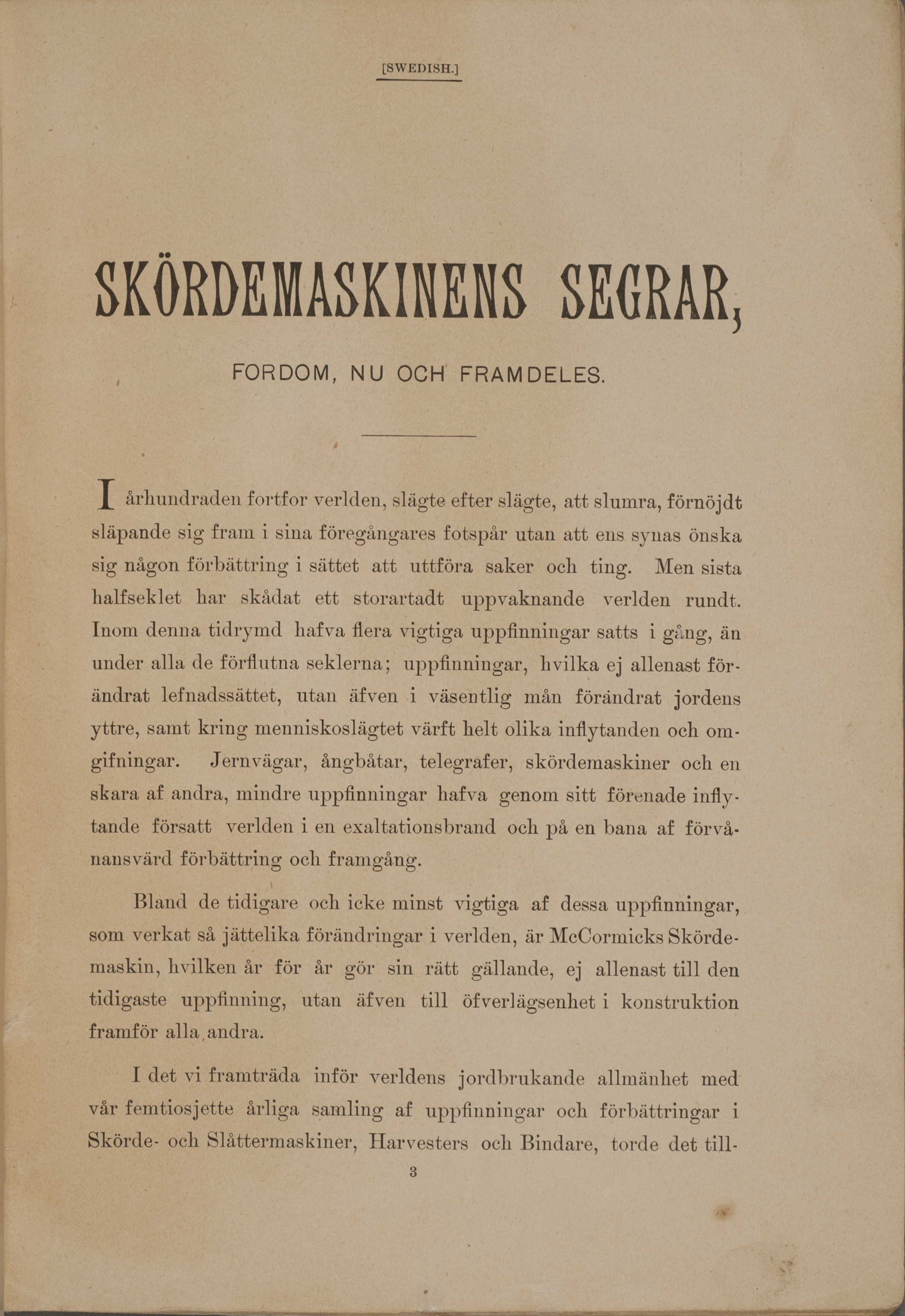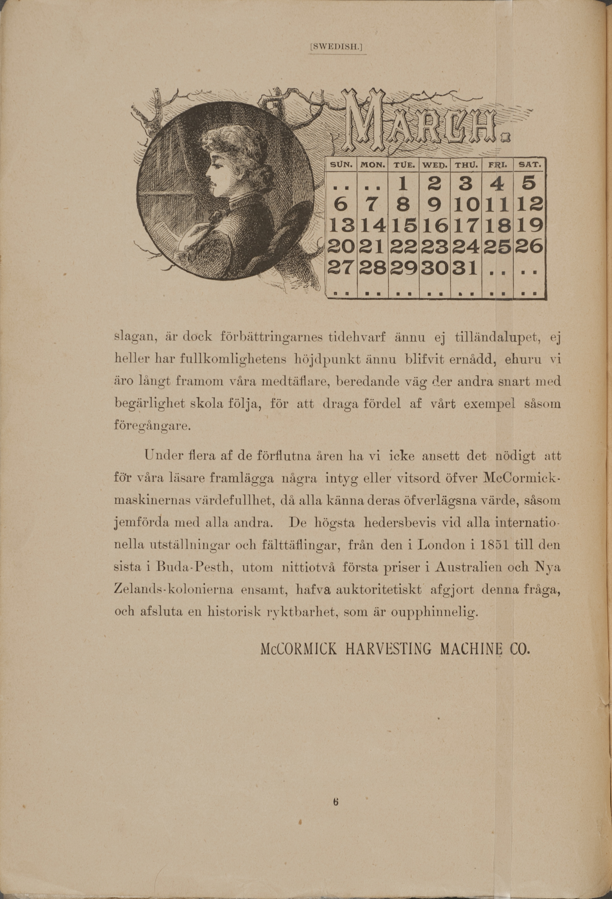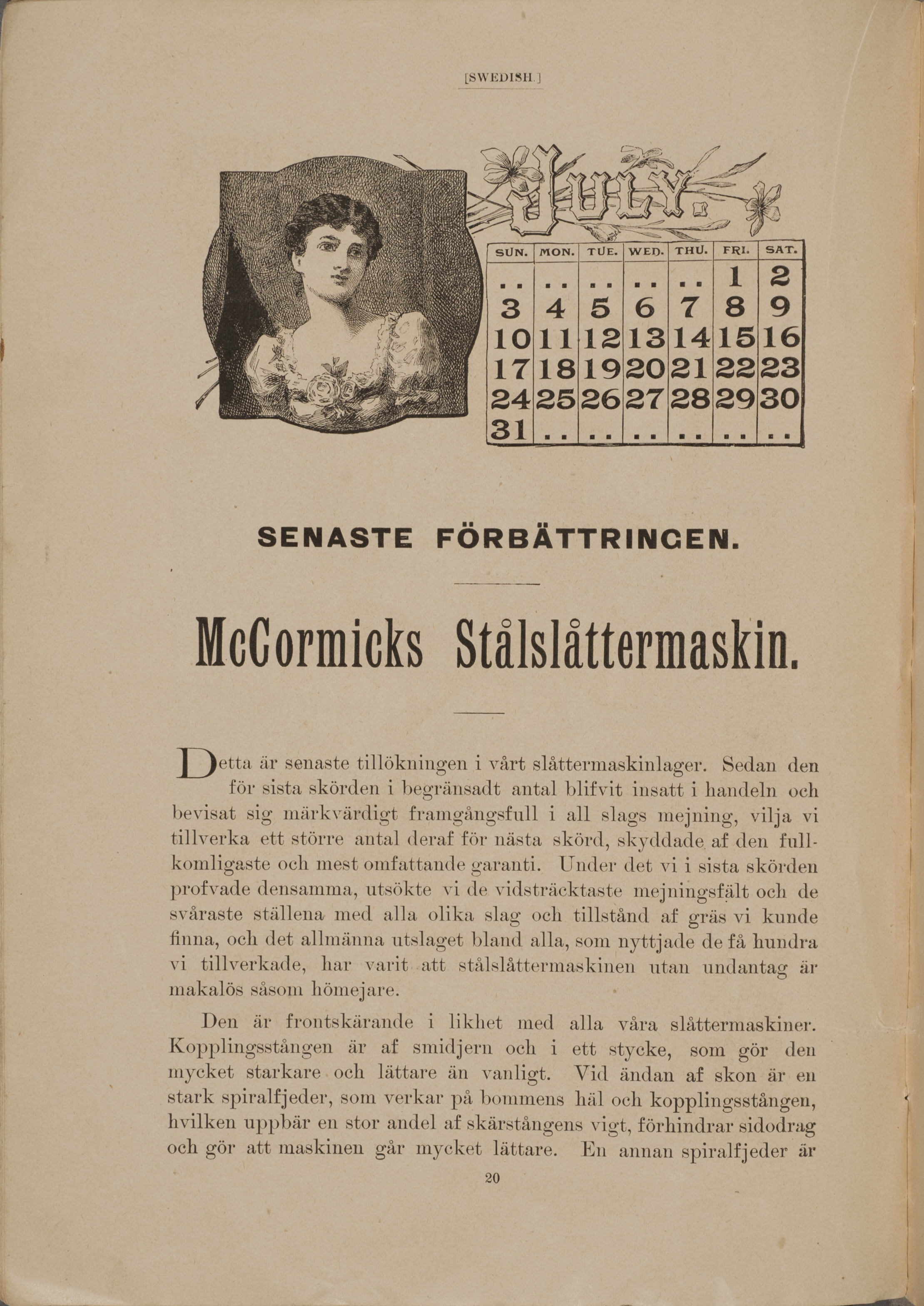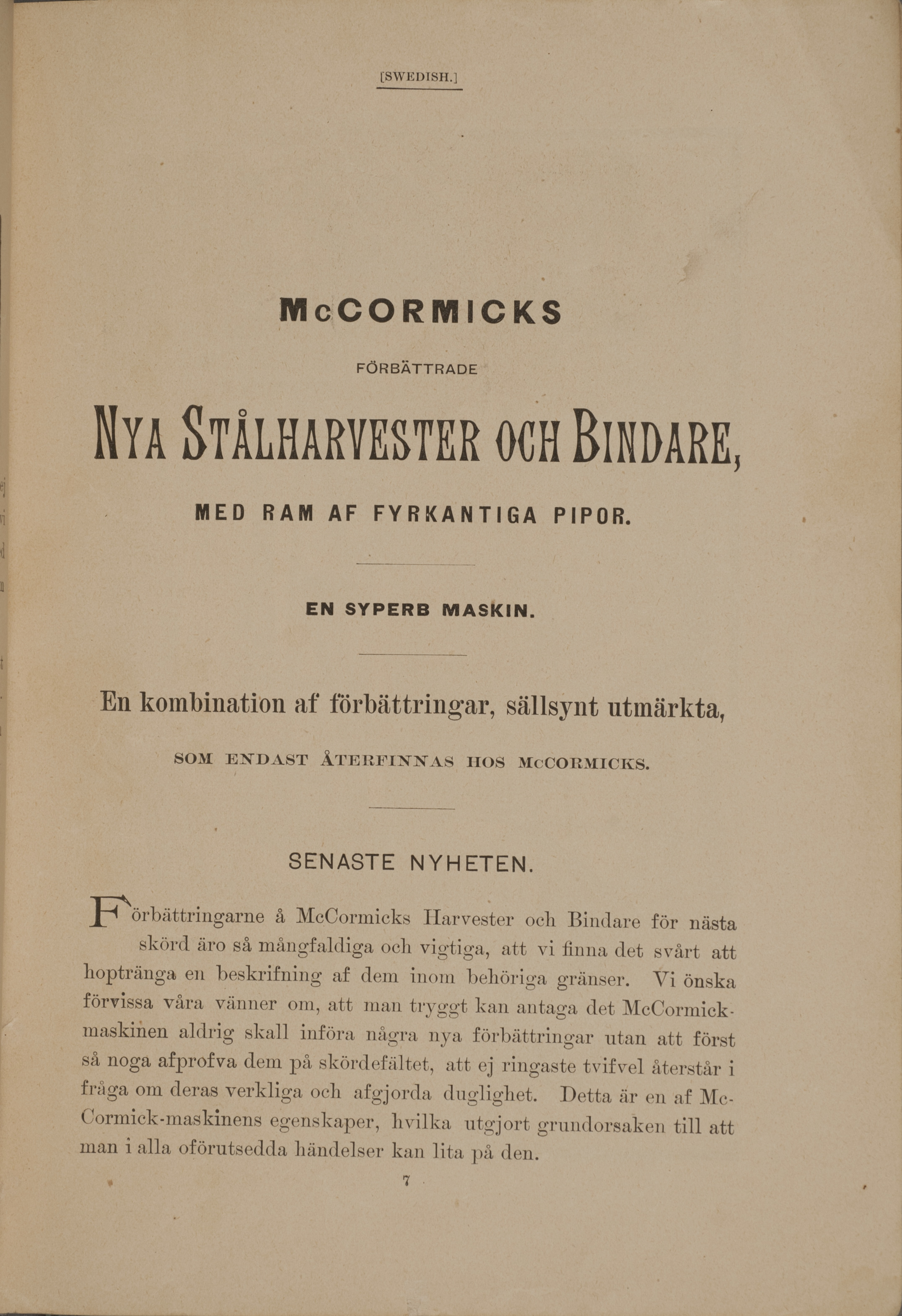 - Illustrated catalog in Swedish advertising the products manufactured by McCormick Machine Company.