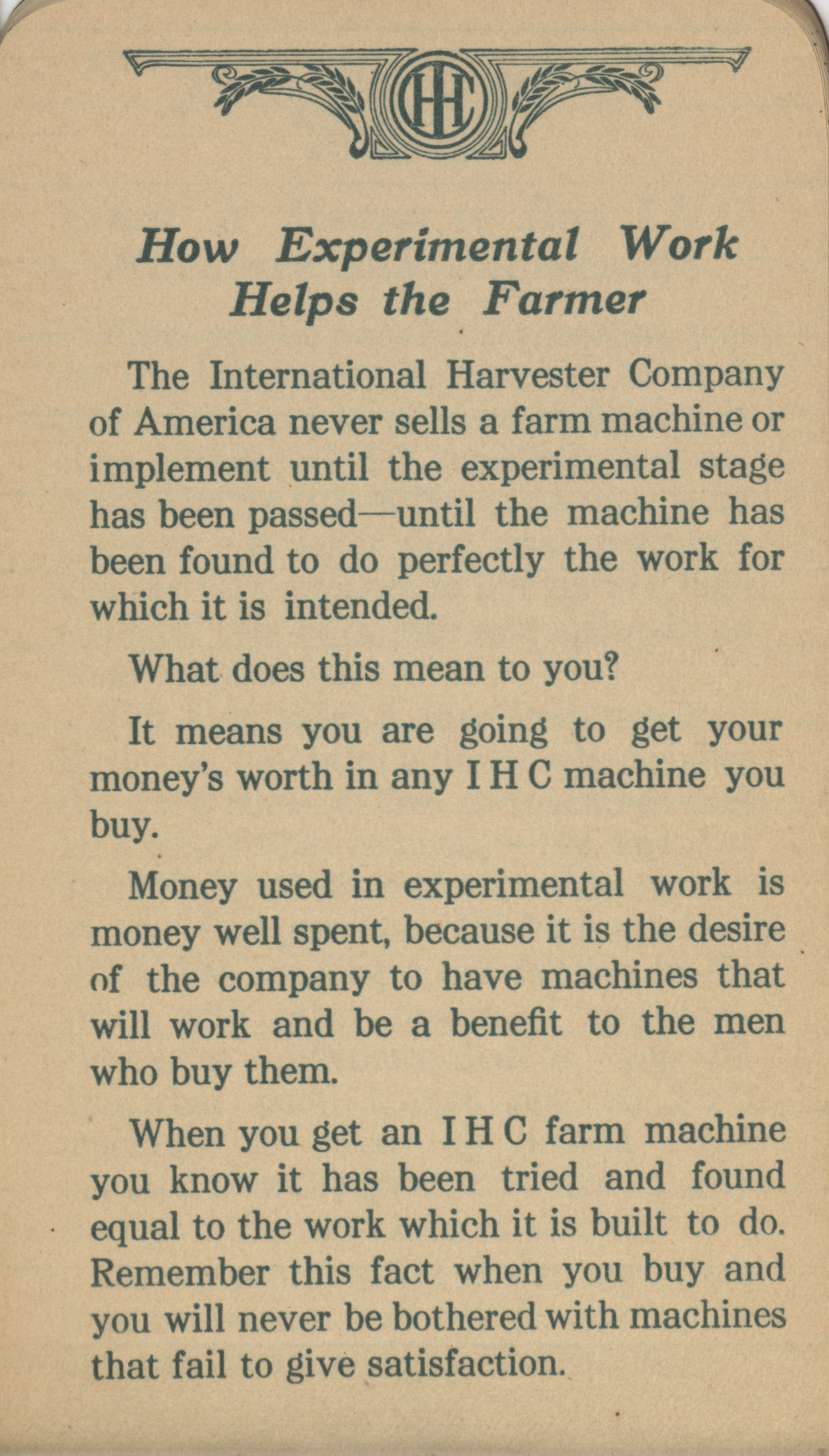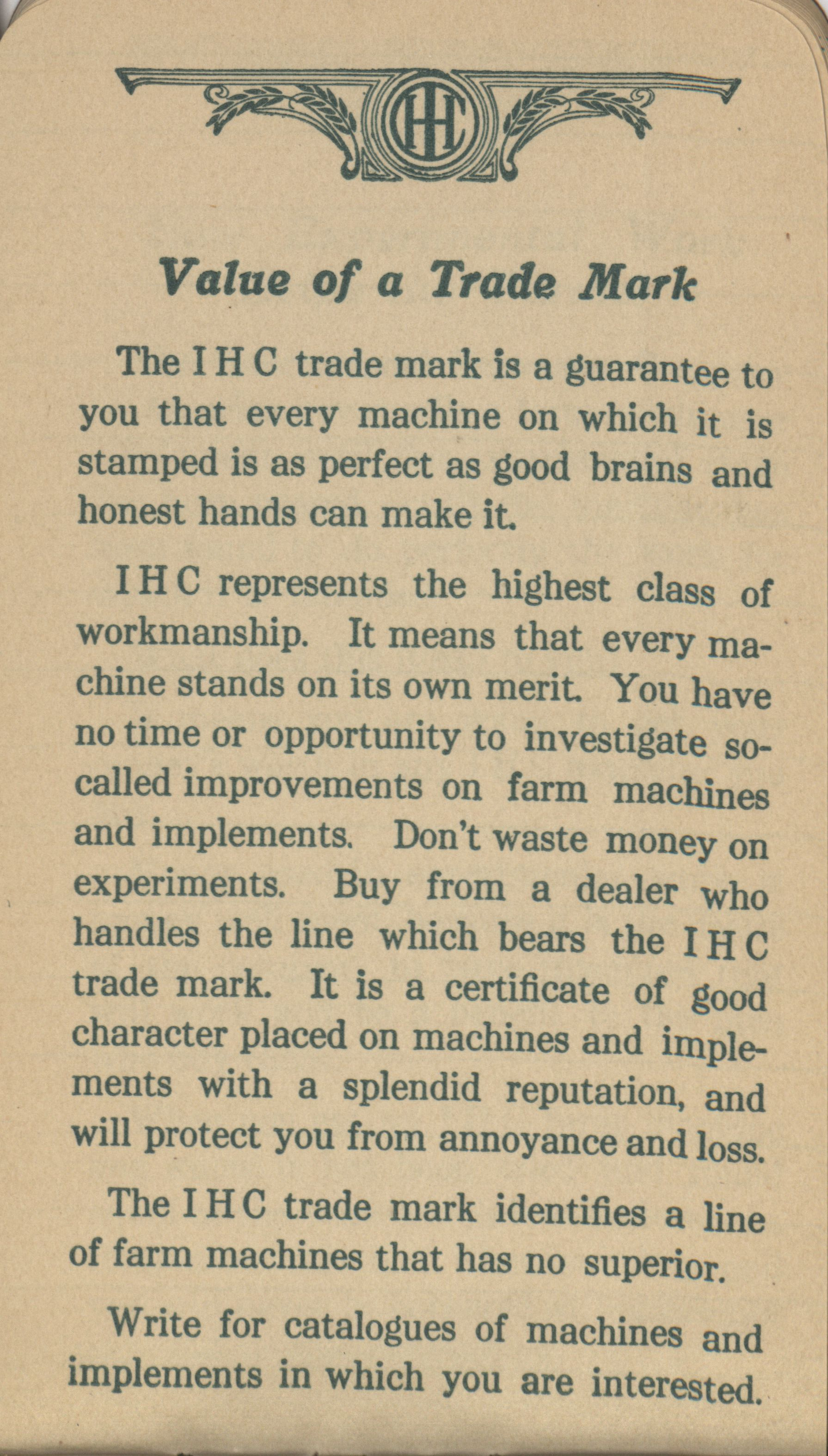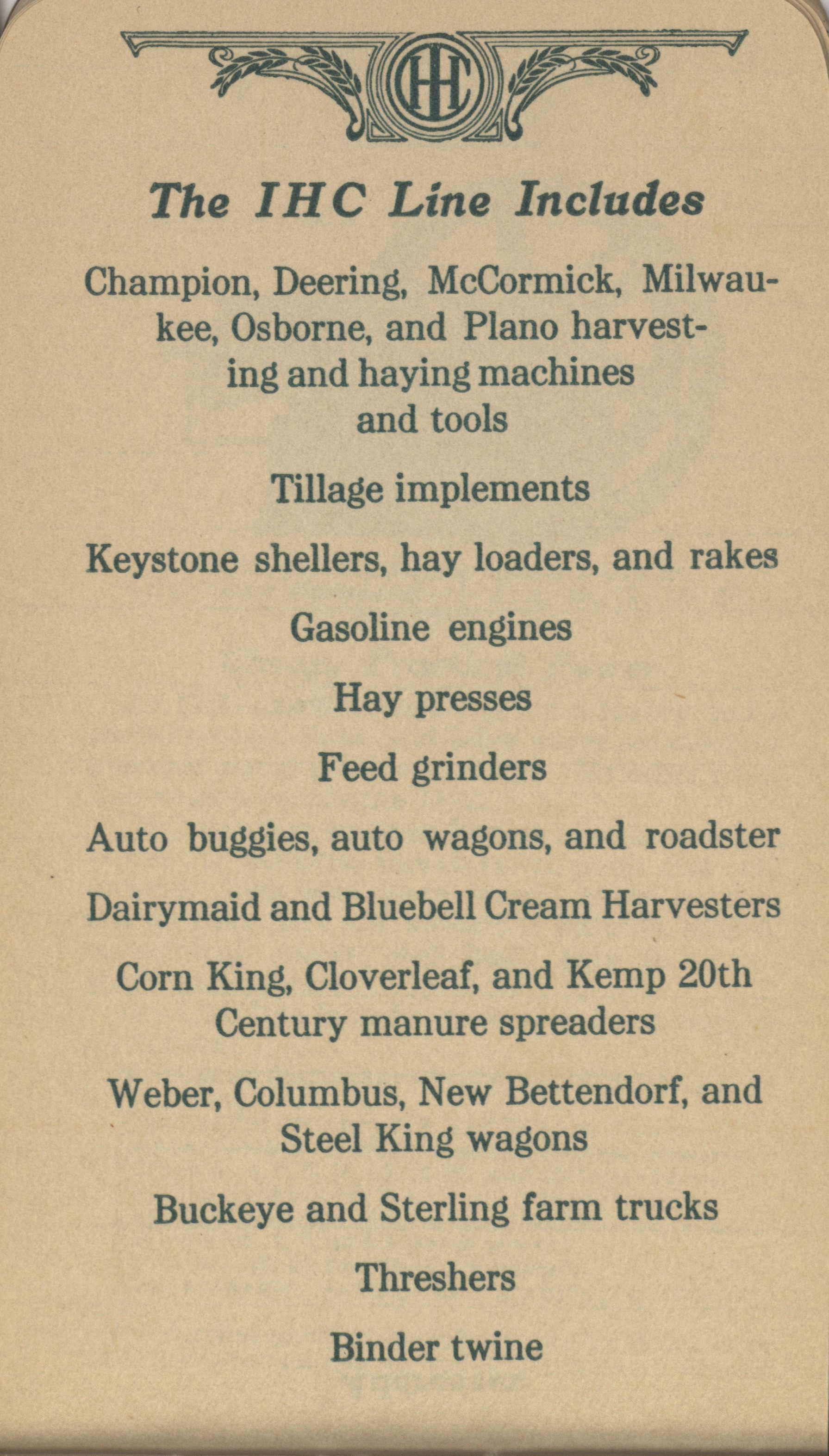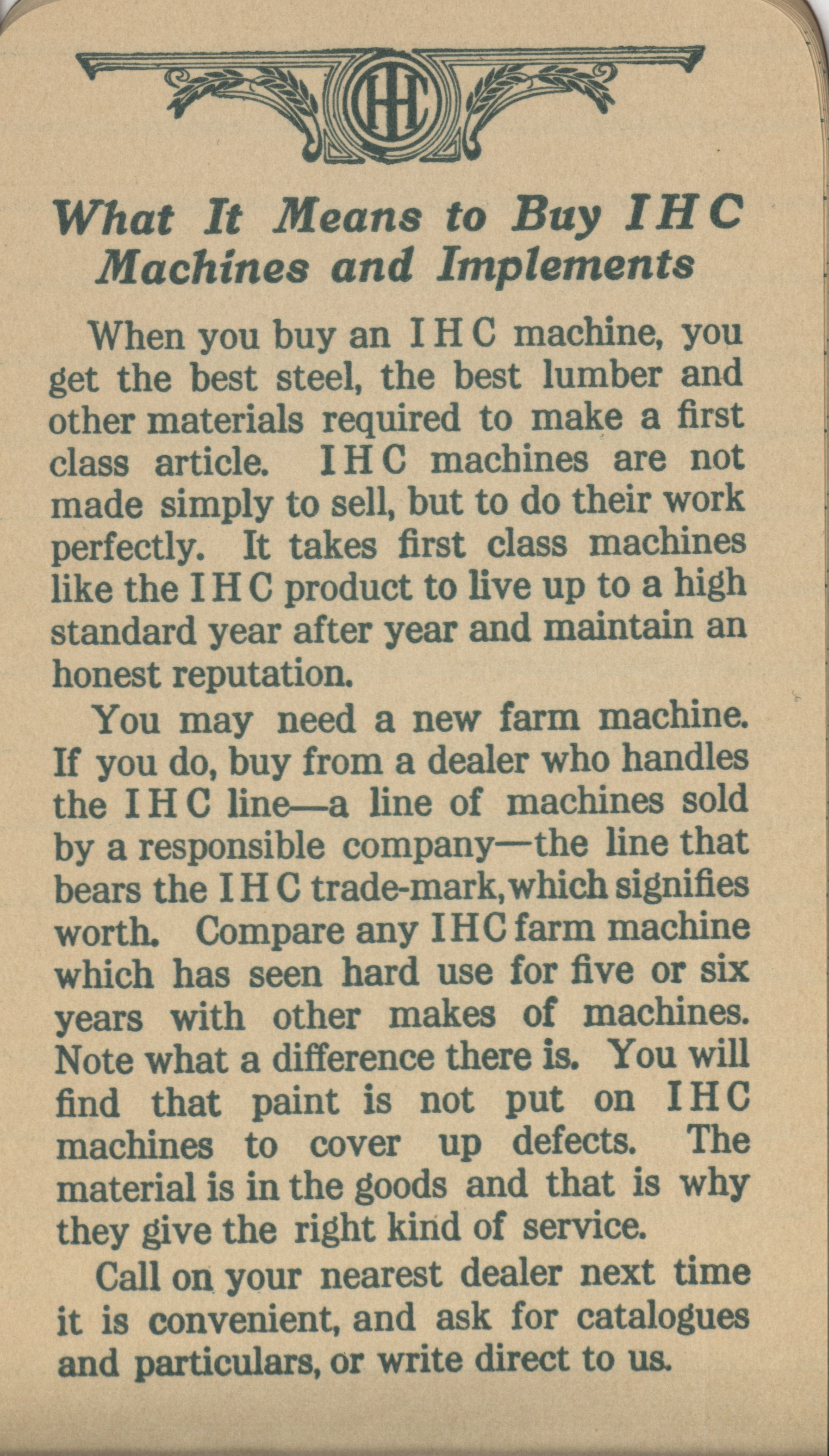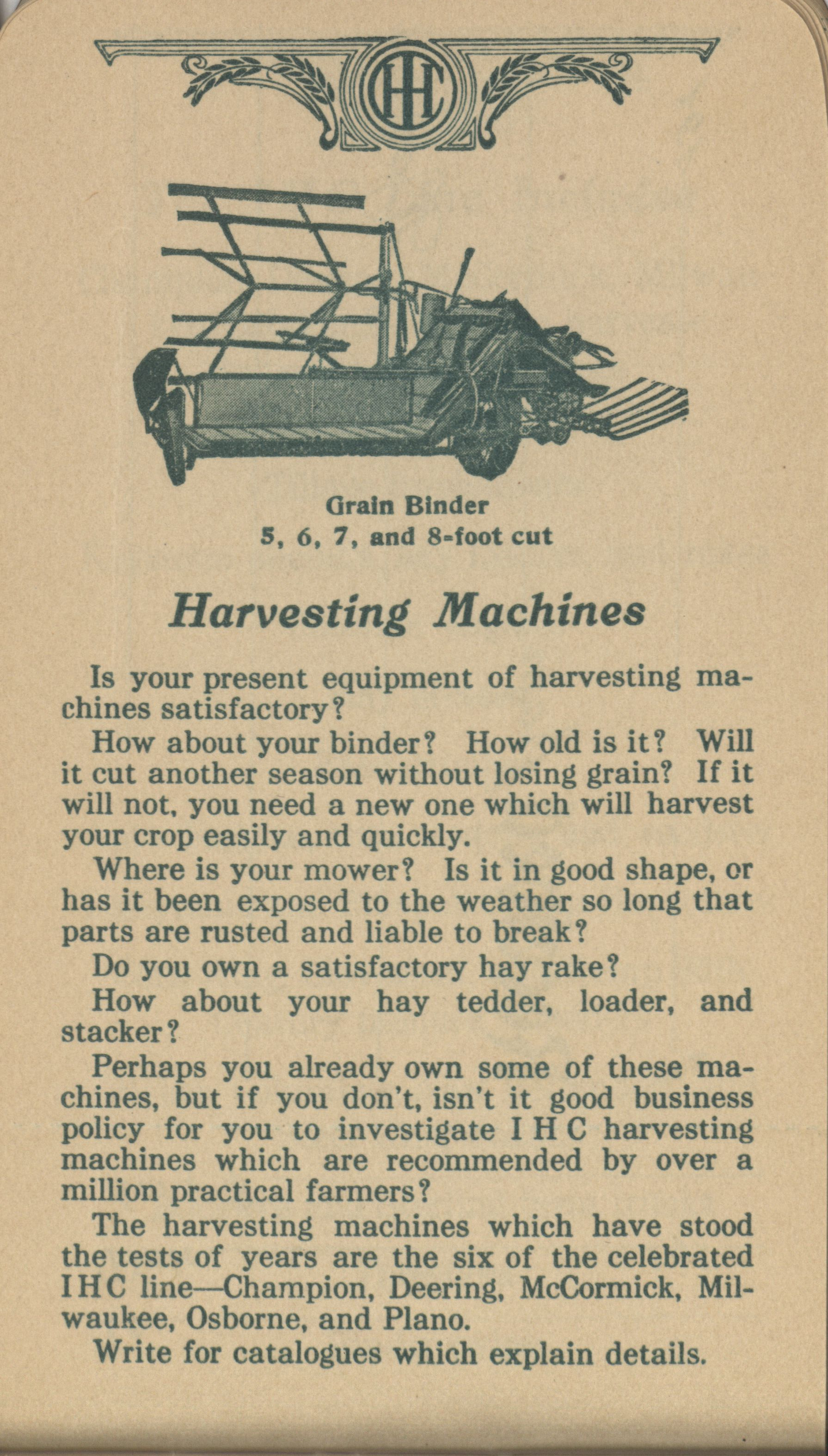 - "International Harvester Company of America 1901 pocket book", Agricultural Machinery Literature Collection, Iowa State University Library Digital Collections