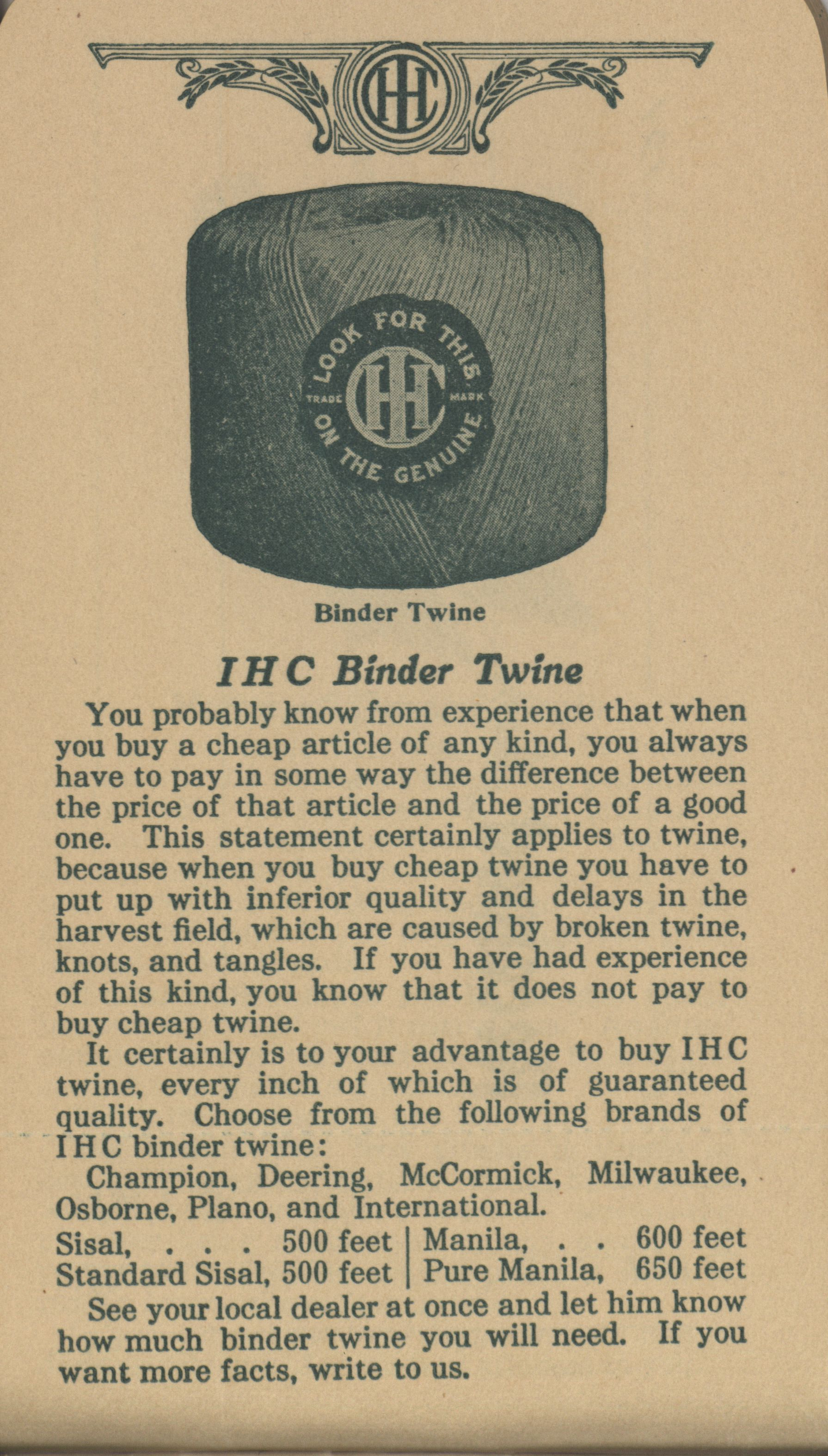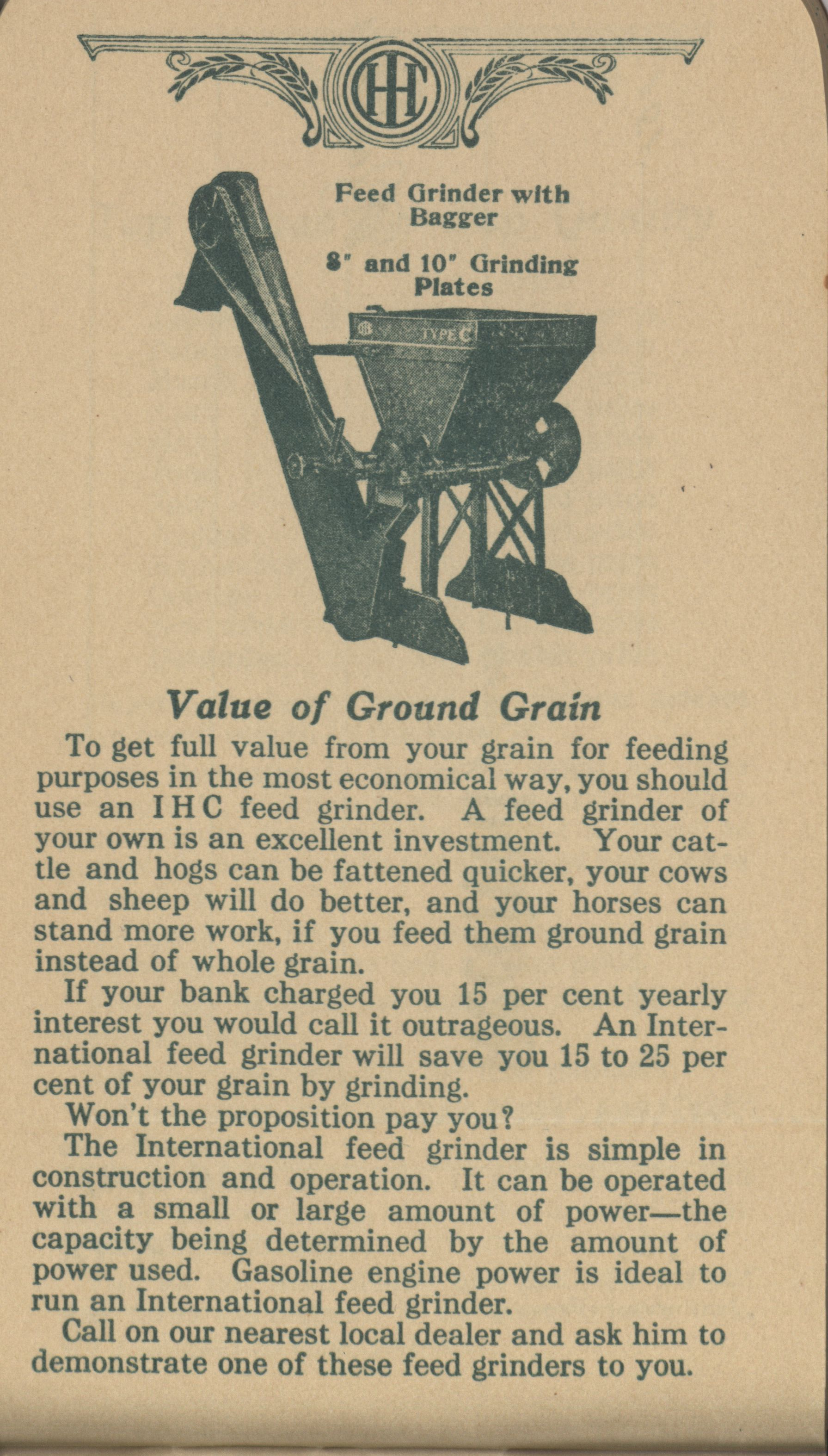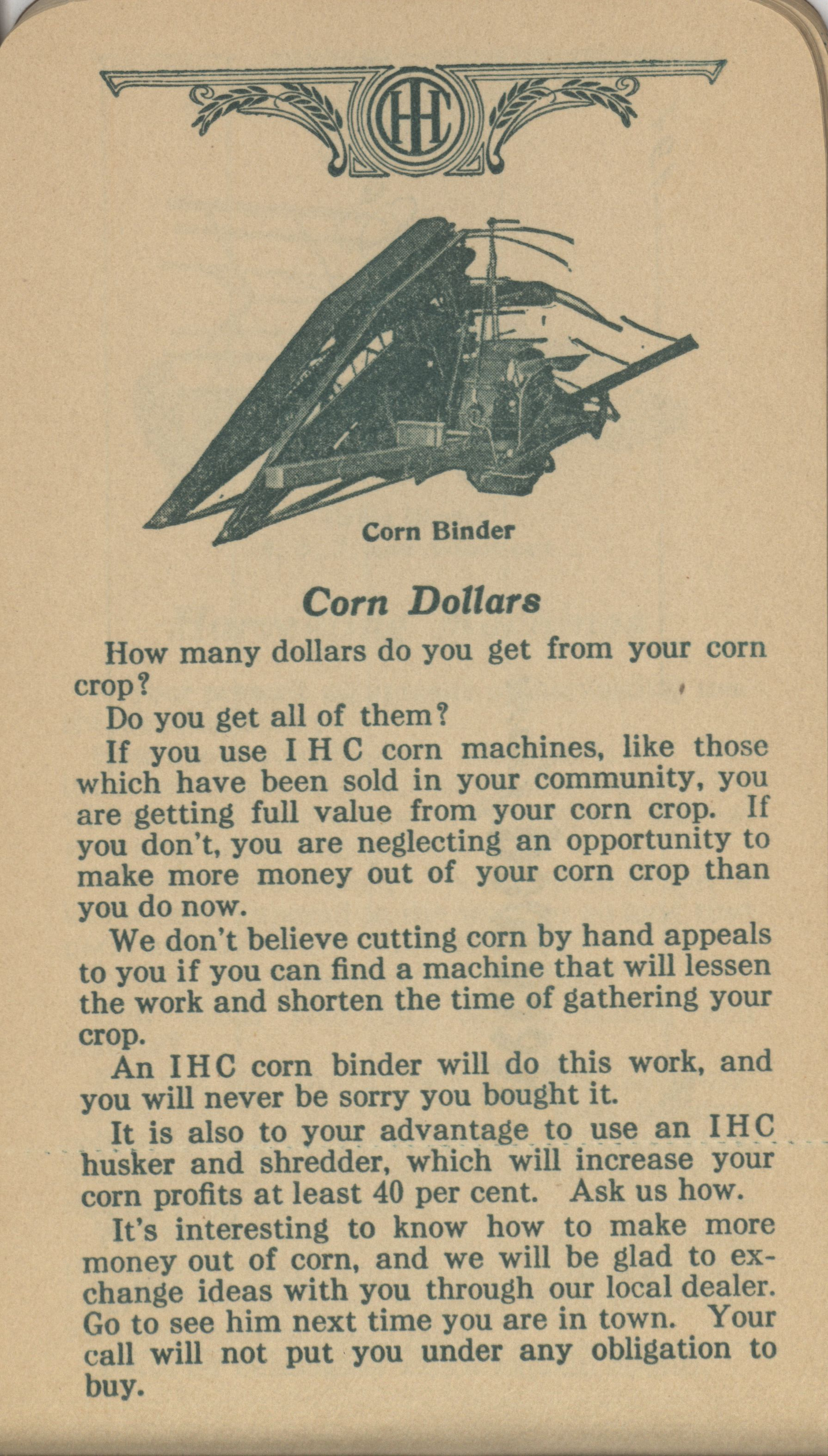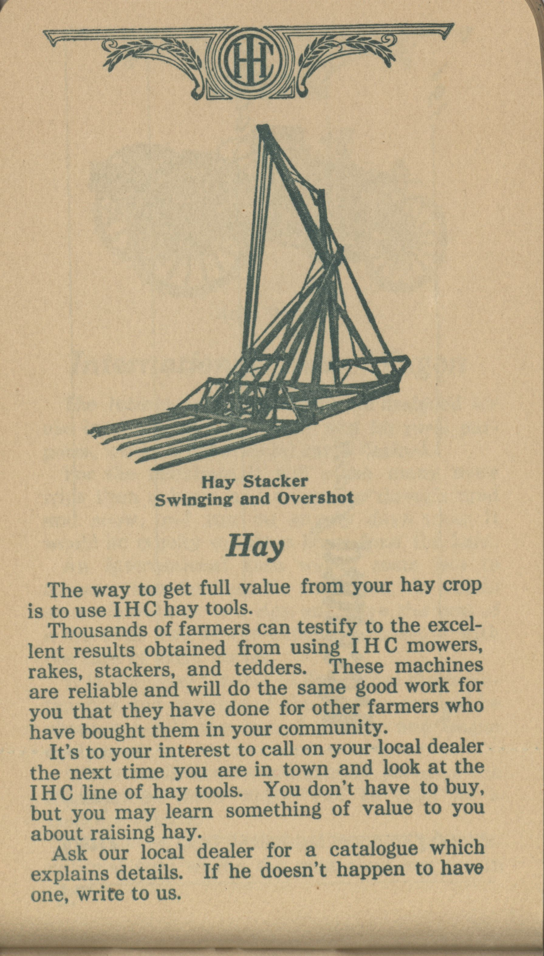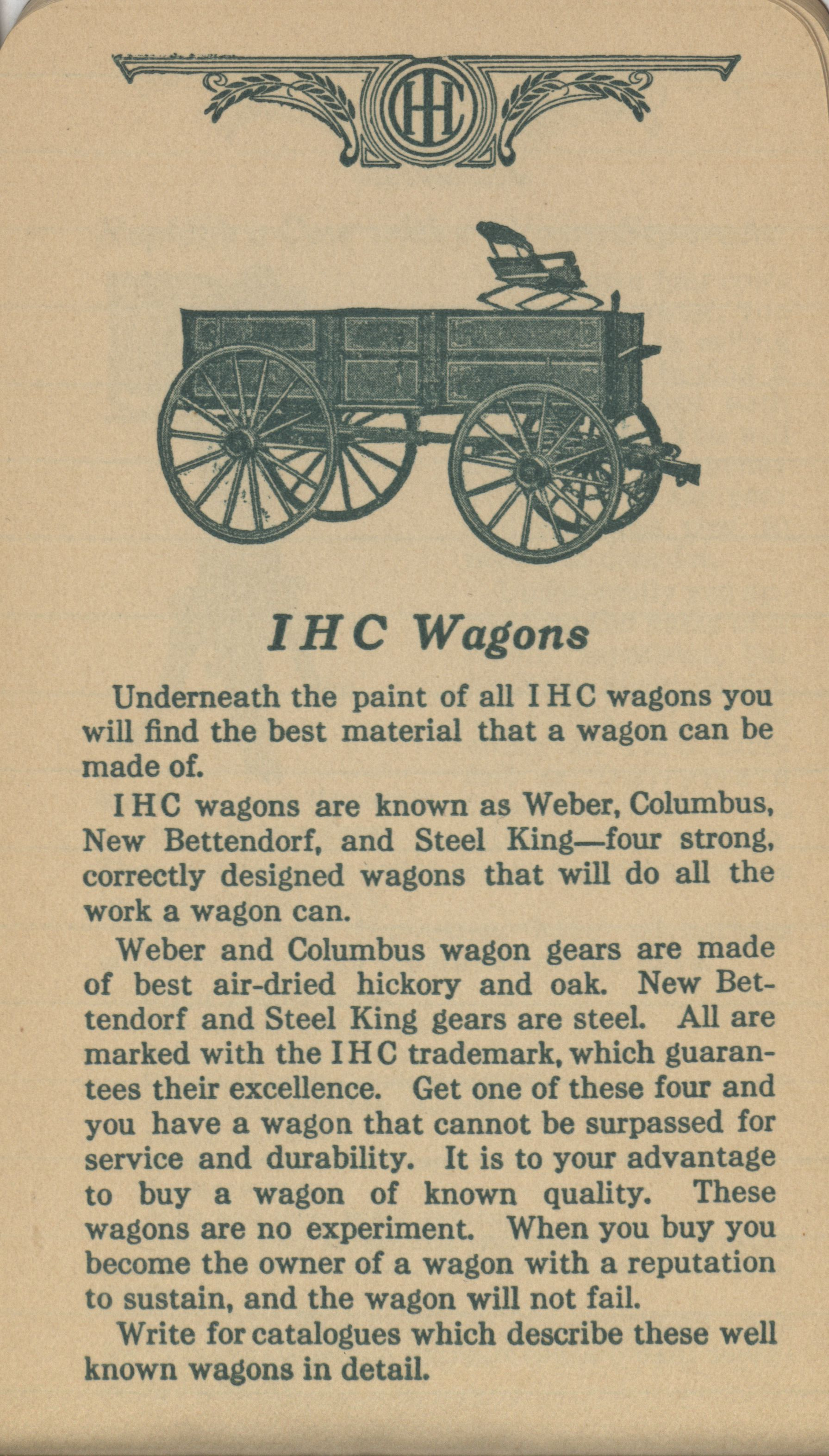 - "International Harvester Company of America 1901 pocket book", Agricultural Machinery Literature Collection, Iowa State University Library Digital Collections