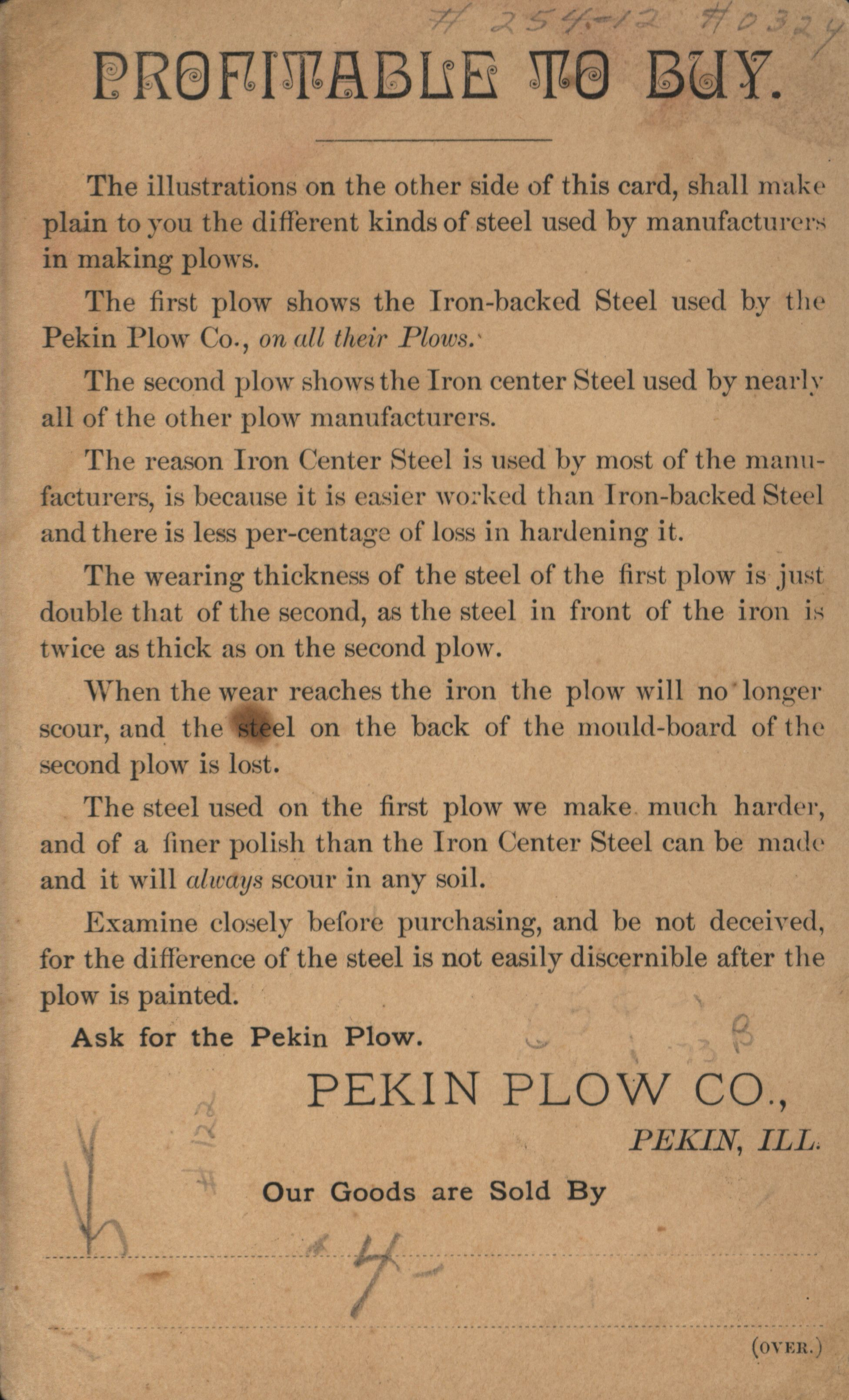 - "Illustrated advertisement card for the Pekin Plow Company", Agricultural Machinery Literature Collection, Iowa State University Library Digital Collections