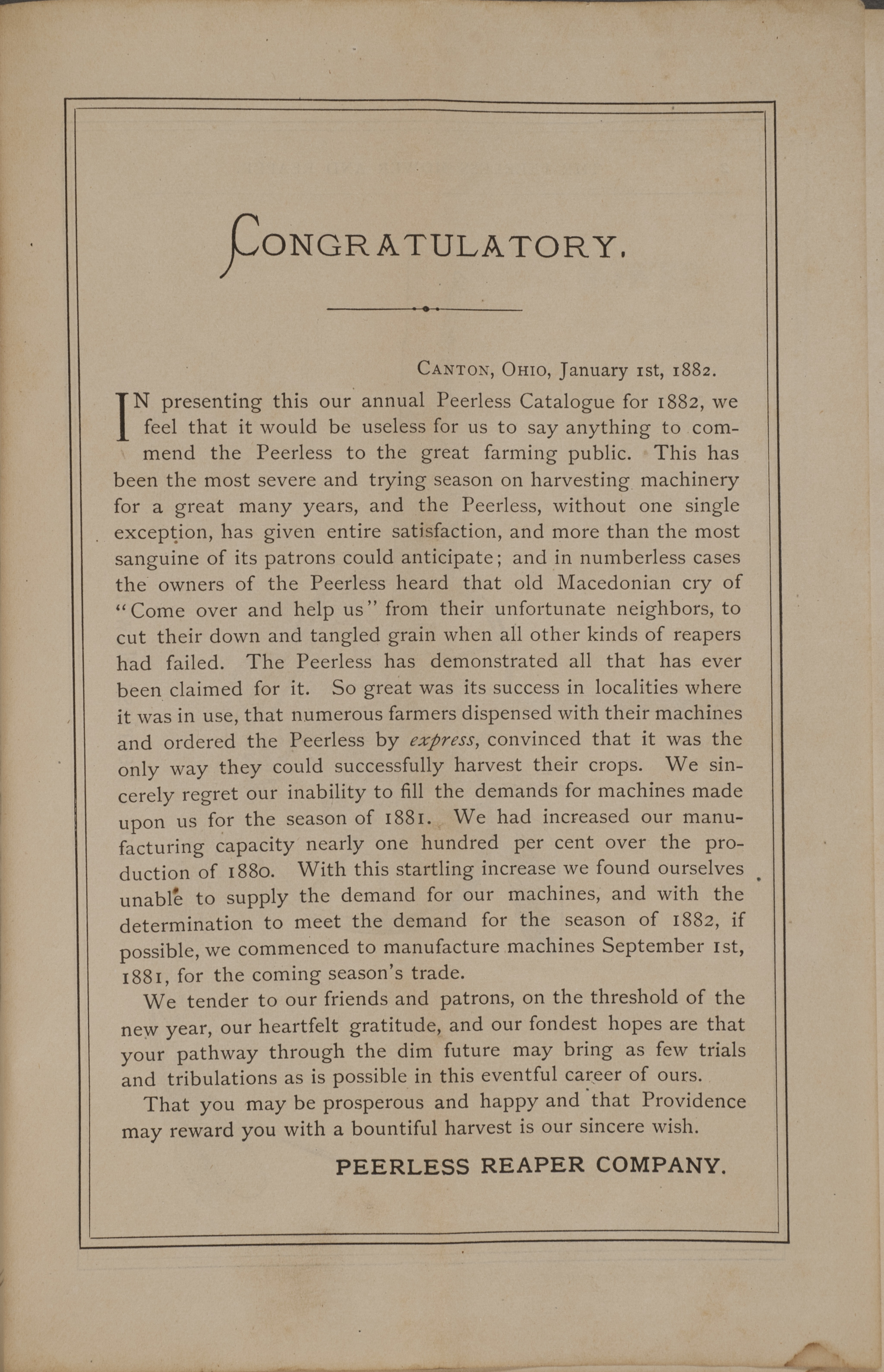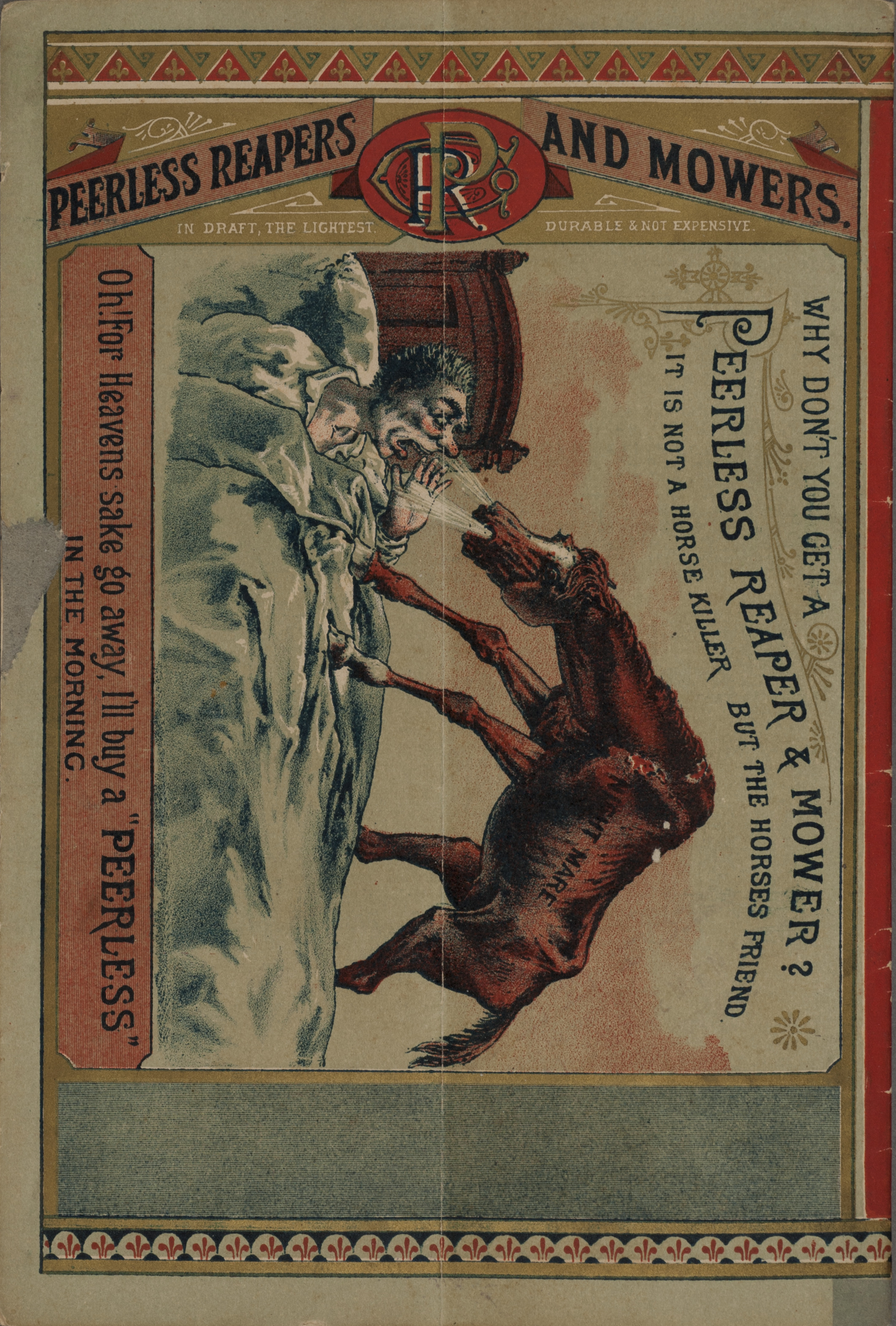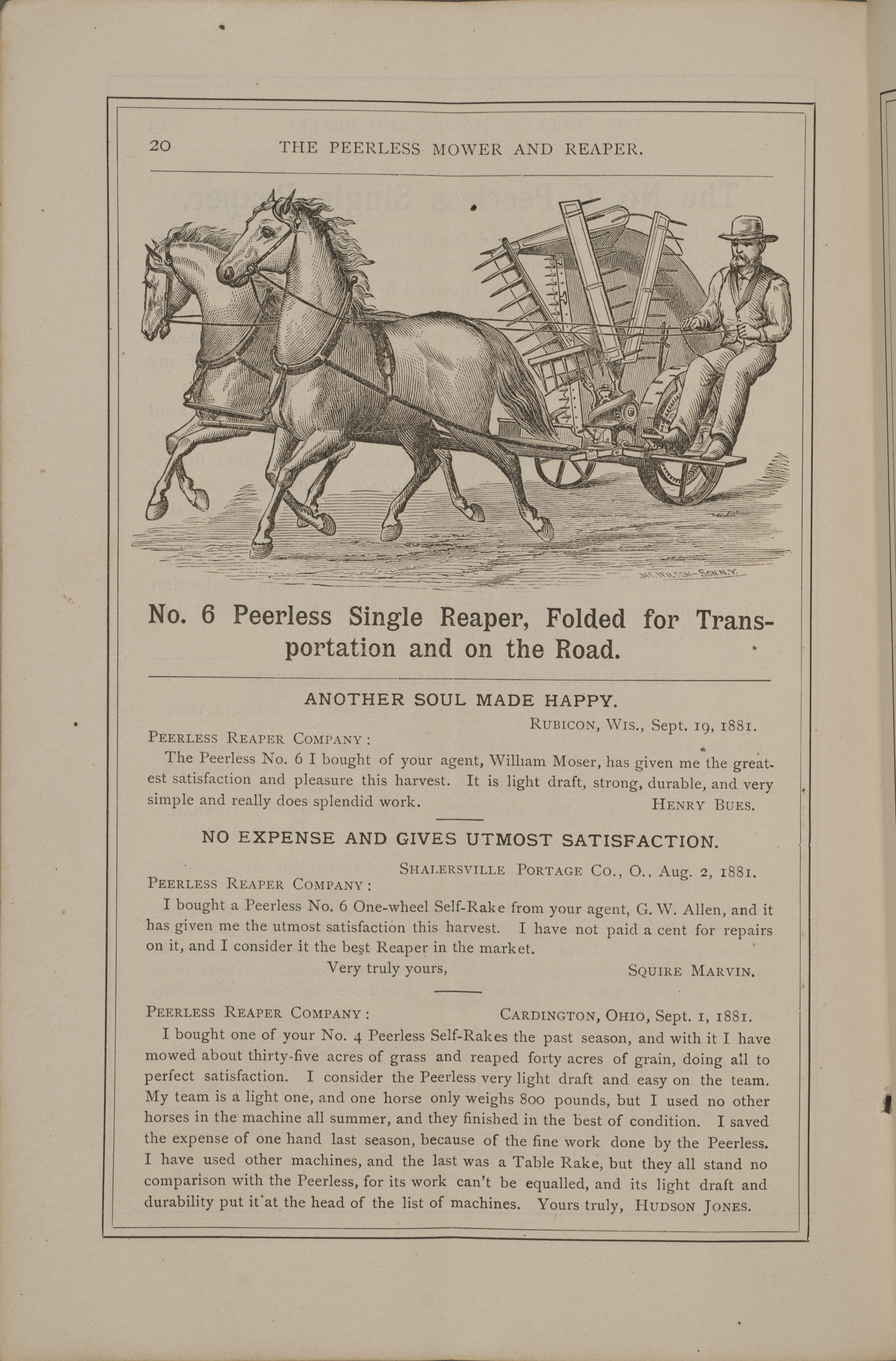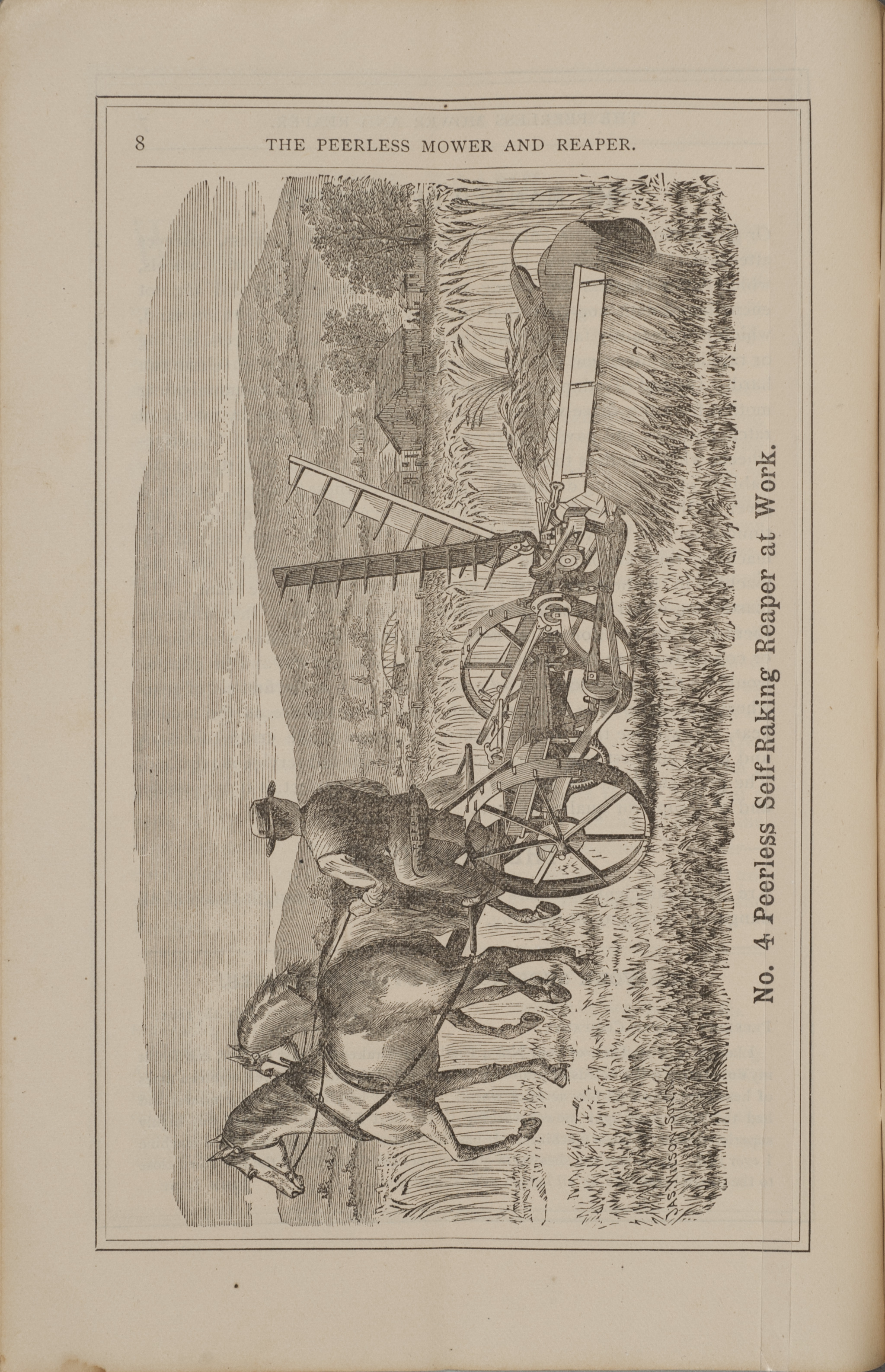- Illustrated catalog describing the agricultural implements offered by Peerless Reaper Company in 1882.