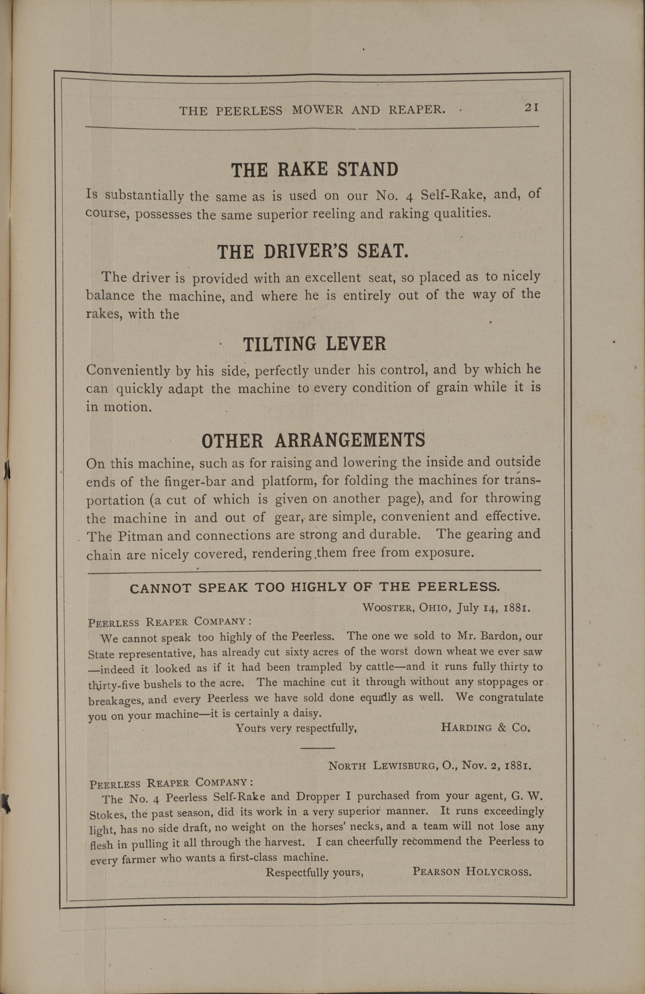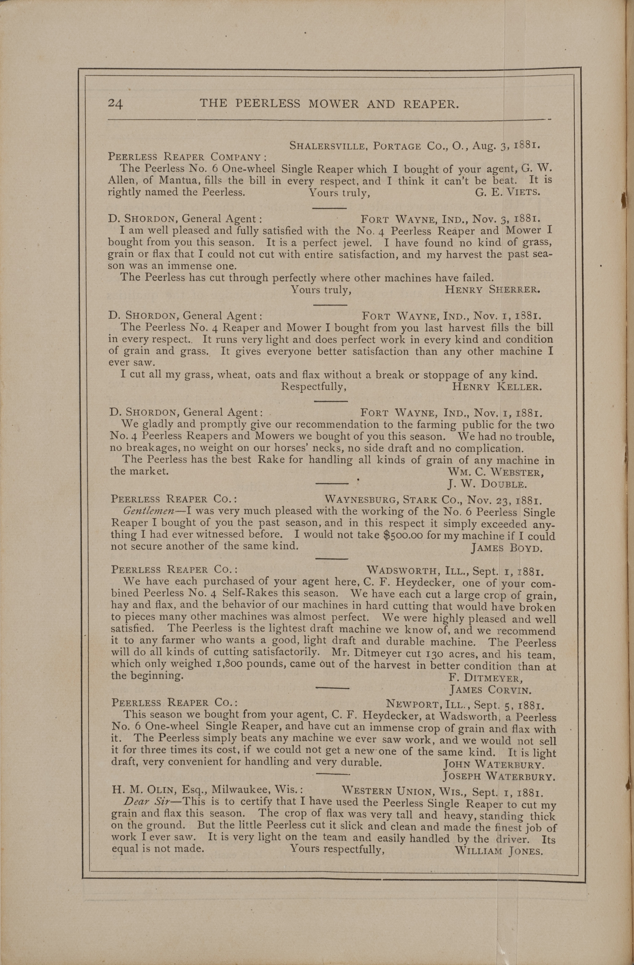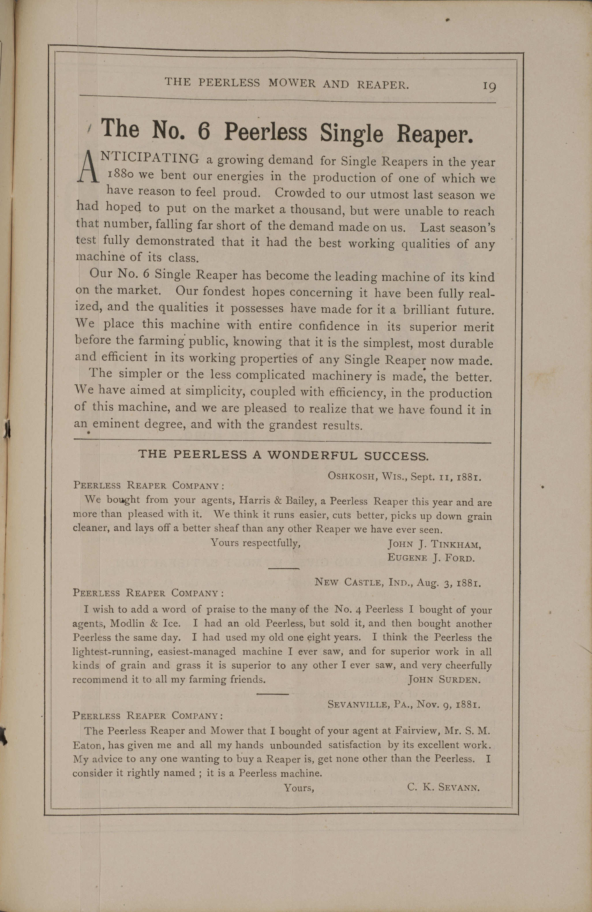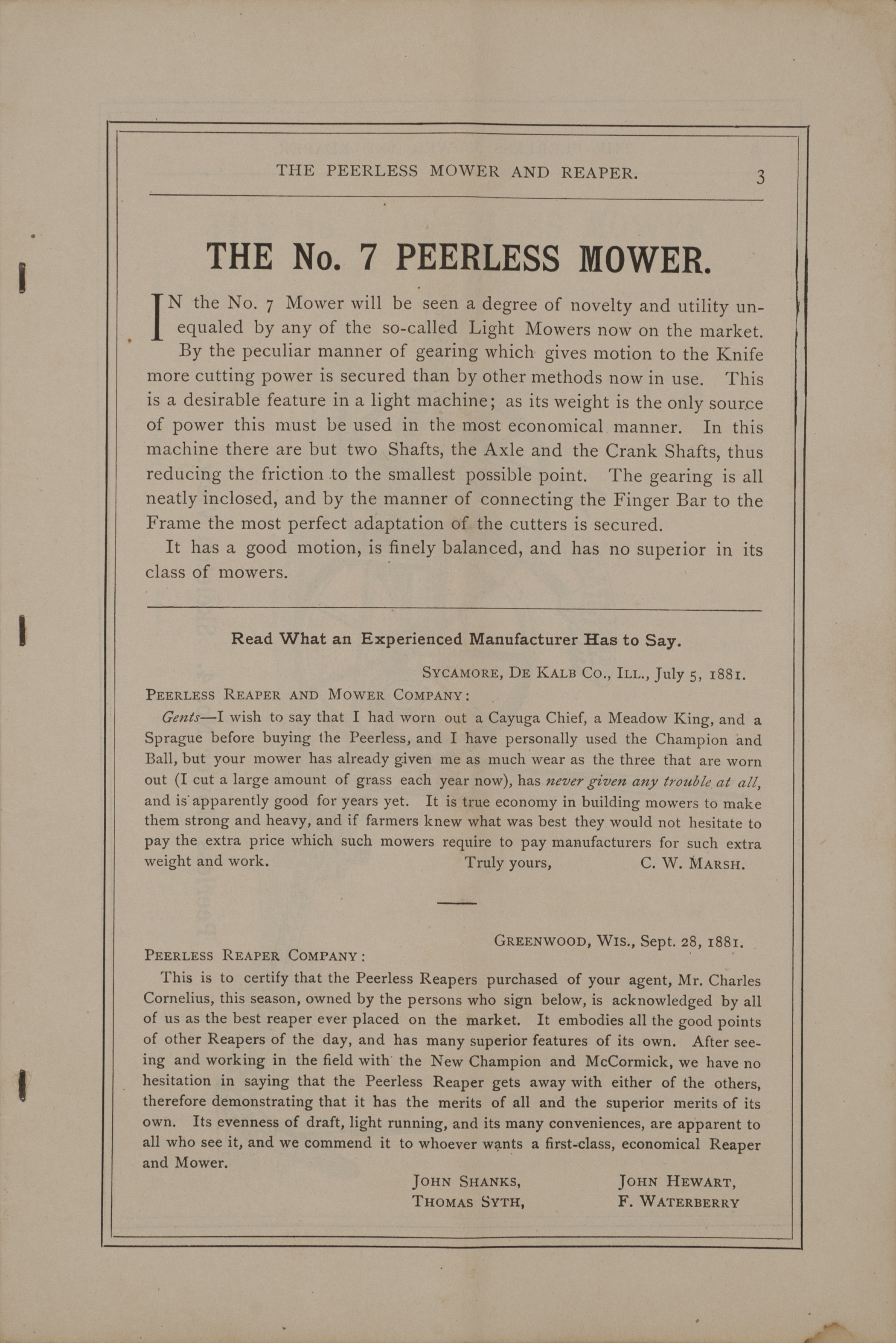 - "Peerless Reaper Company 1882 catalog", Agricultural Machinery Literature Collection, Iowa State University Library Digital Collections