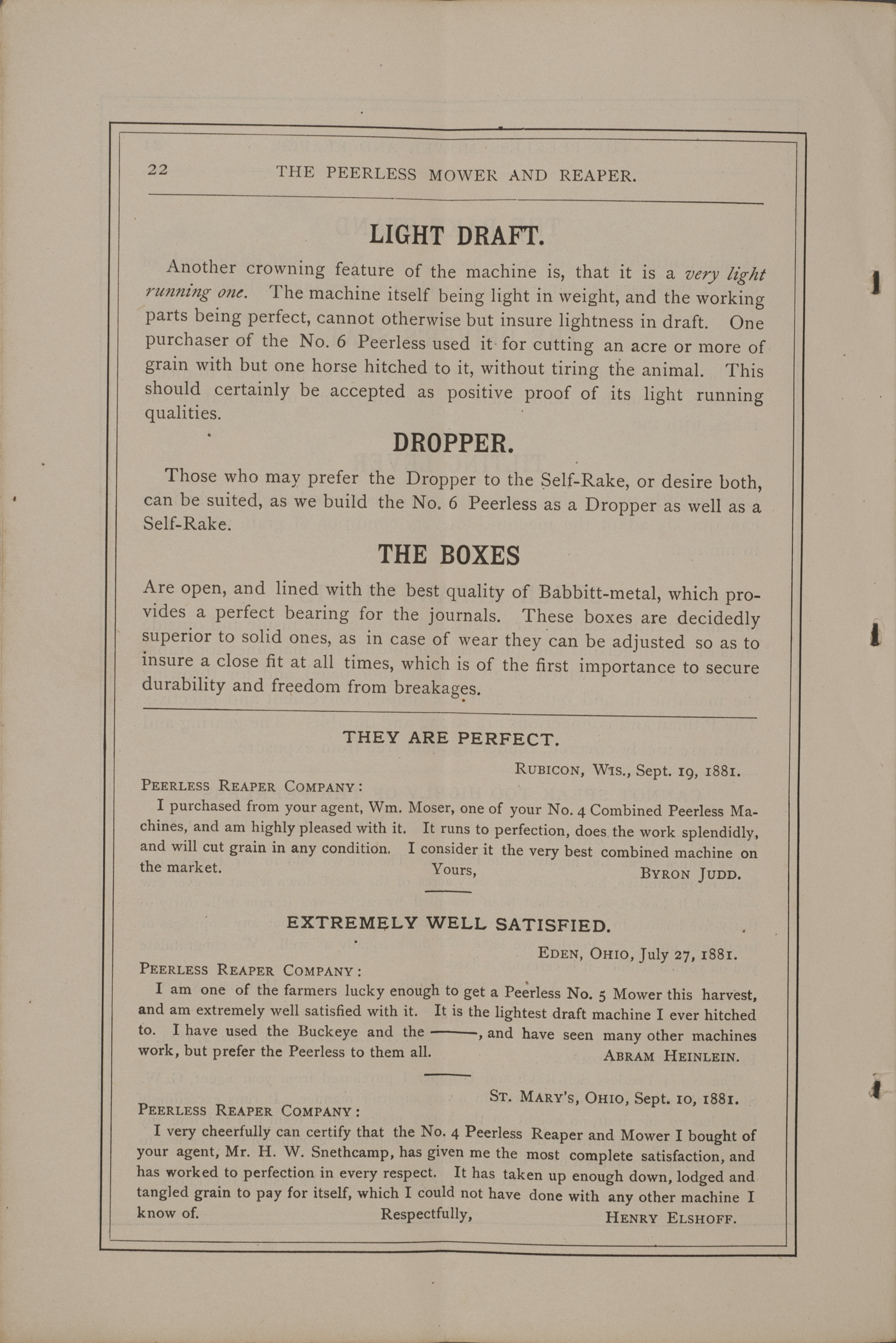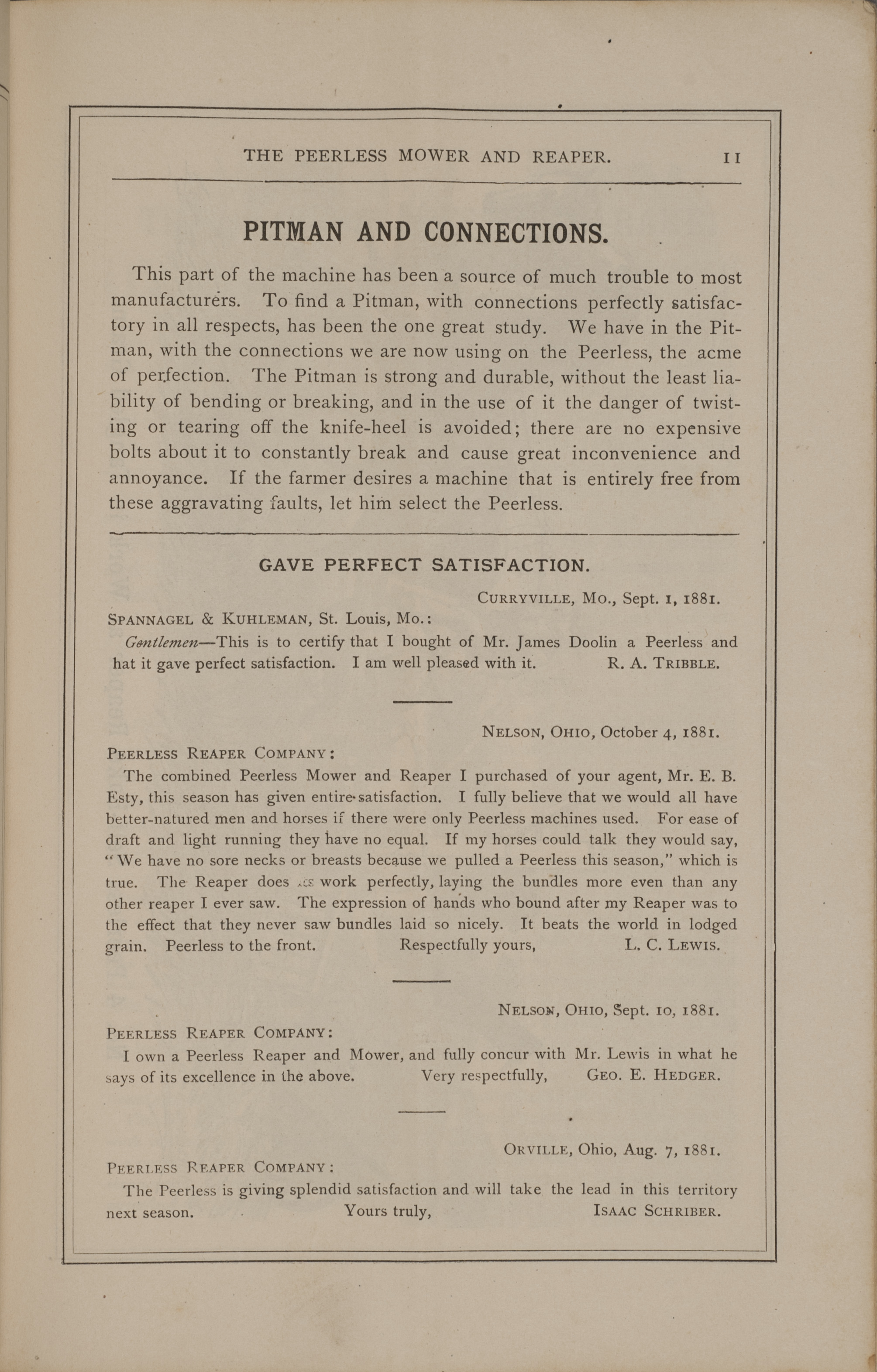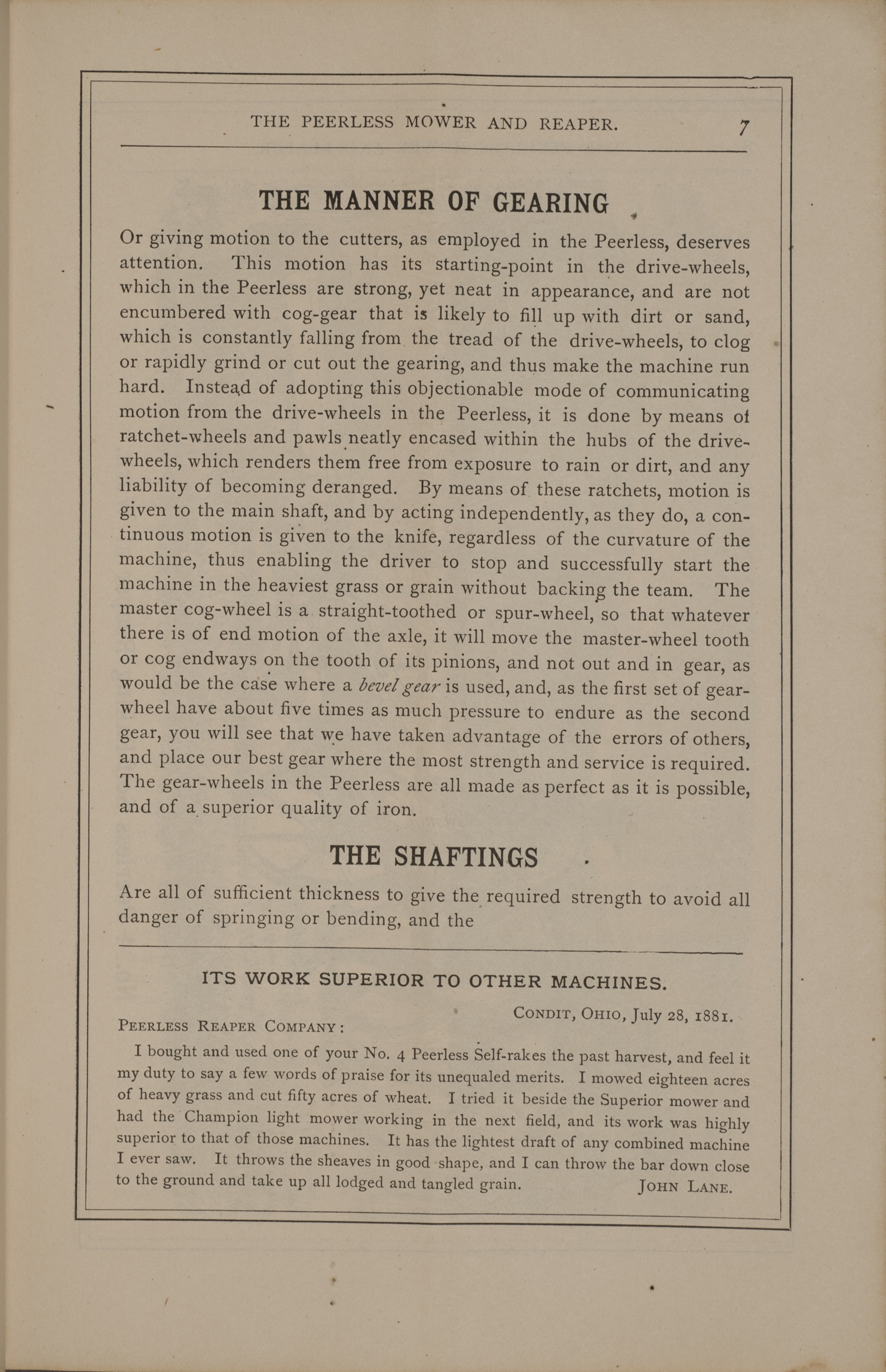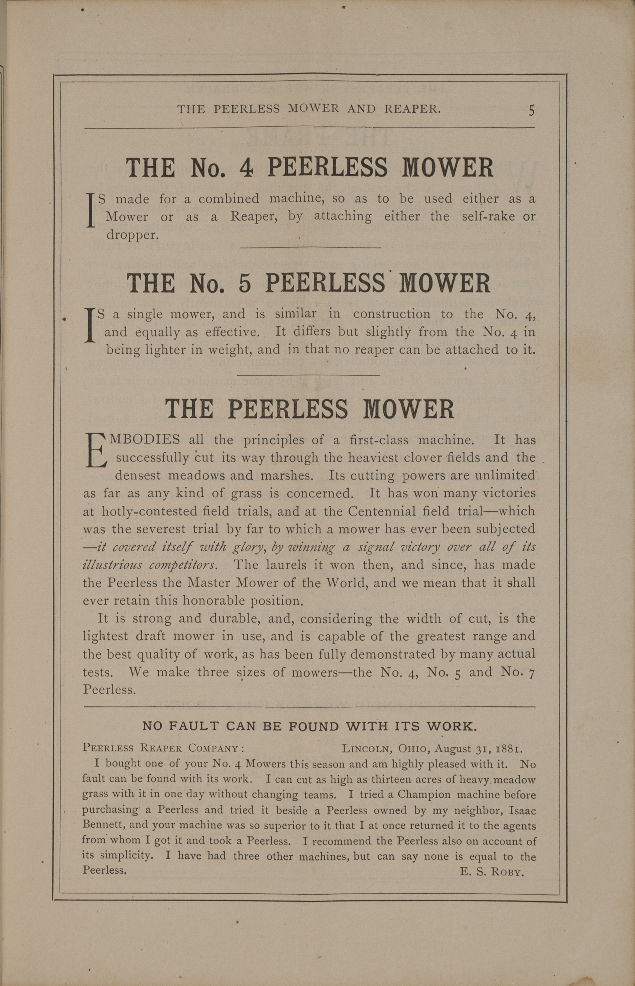 - "Peerless Reaper Company 1882 catalog", Agricultural Machinery Literature Collection, Iowa State University Library Digital Collections