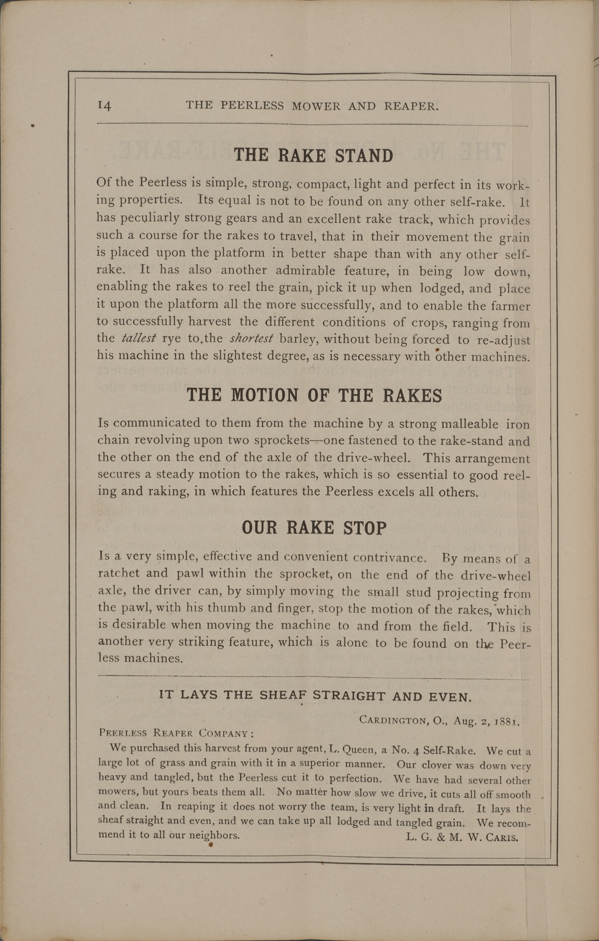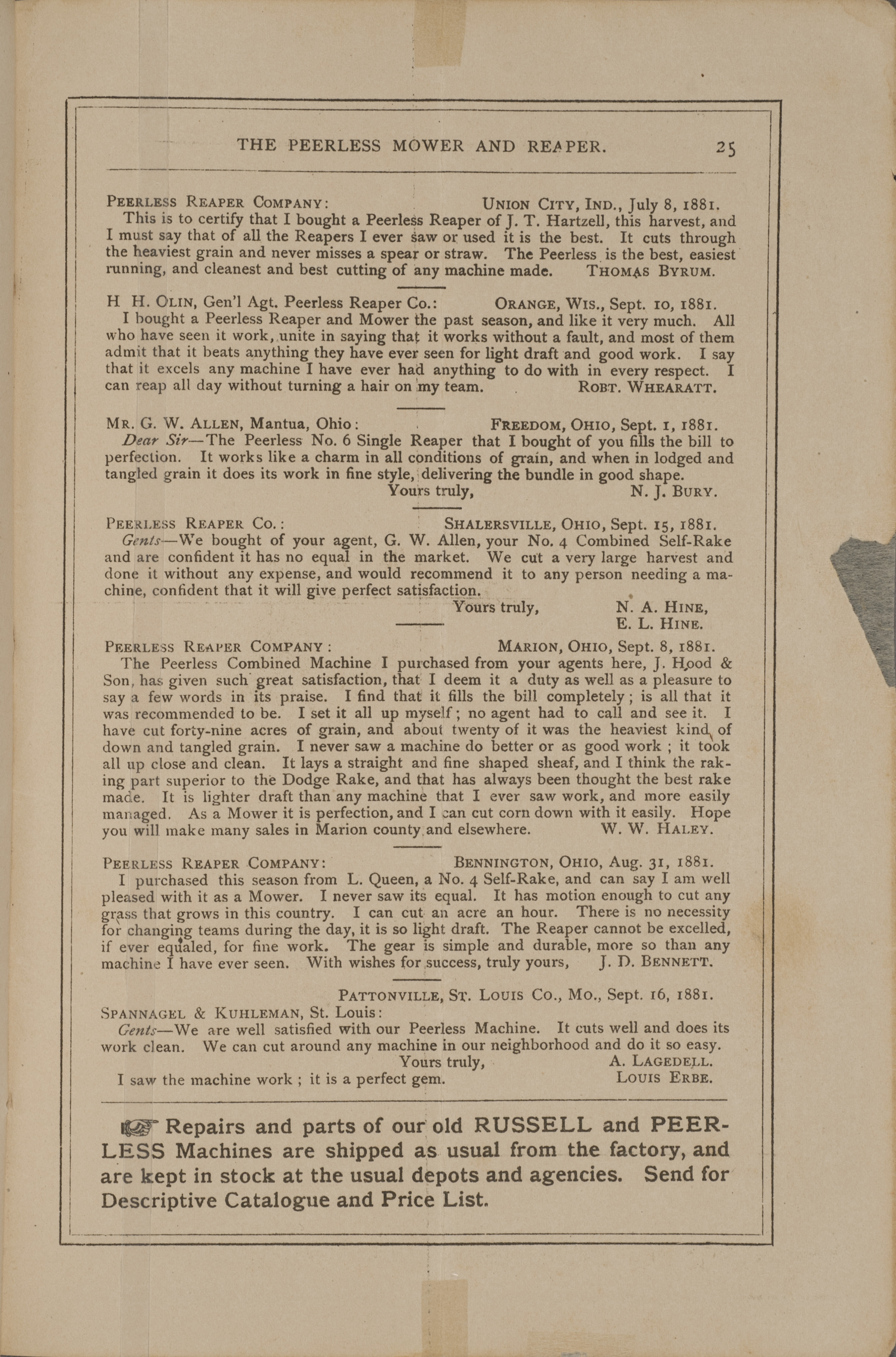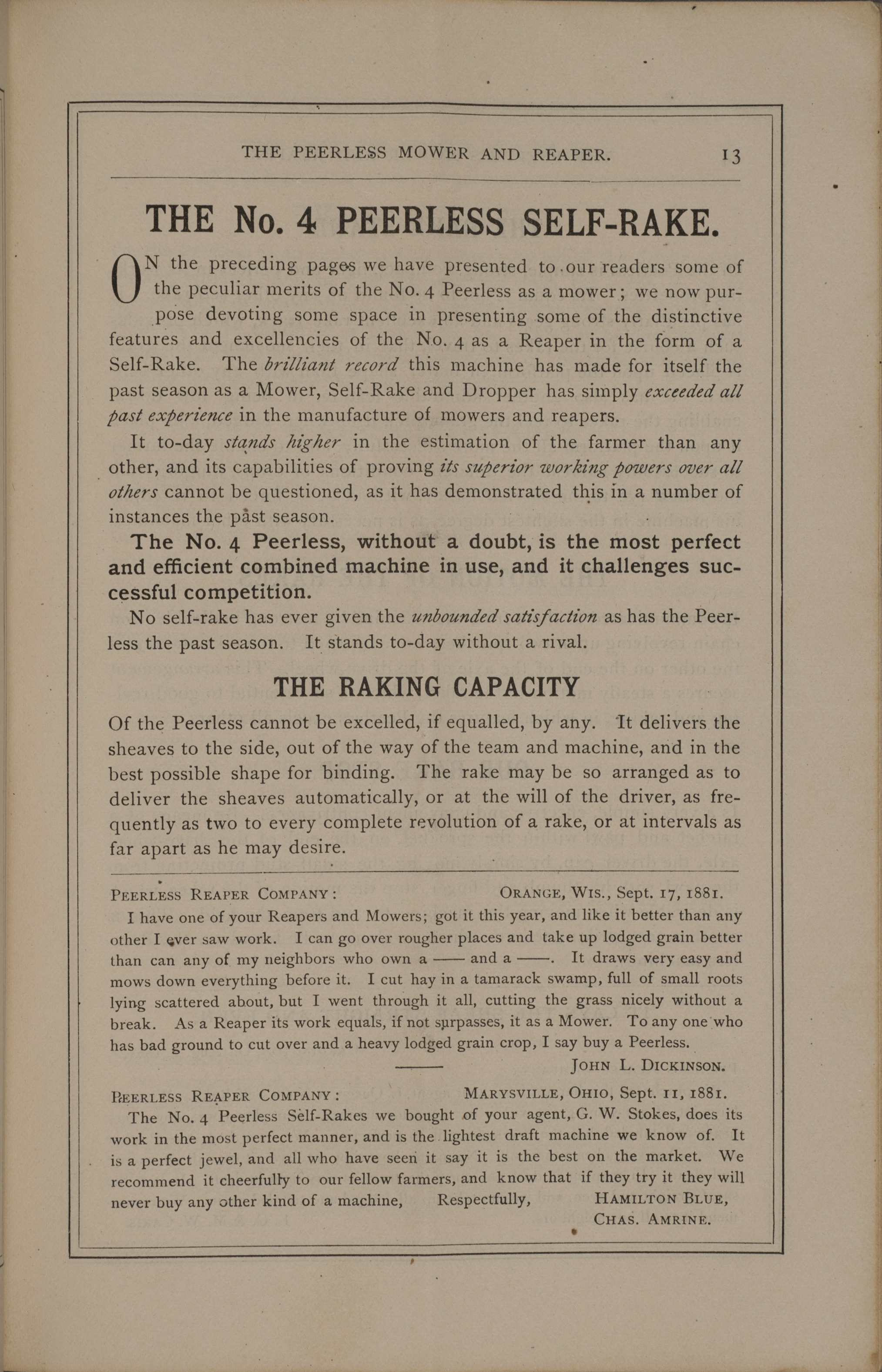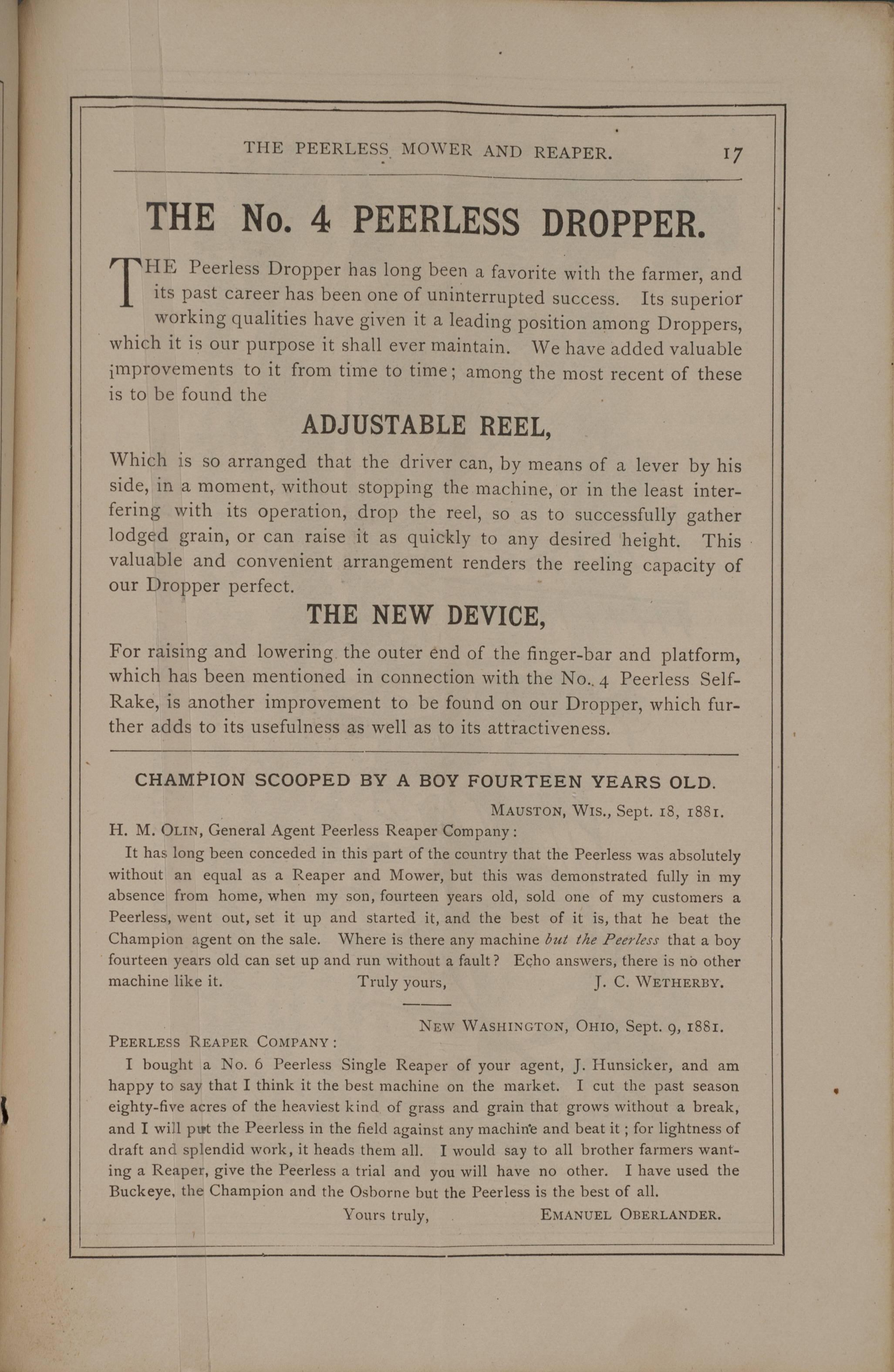 - "Peerless Reaper Company 1882 catalog", Agricultural Machinery Literature Collection, Iowa State University Library Digital Collections