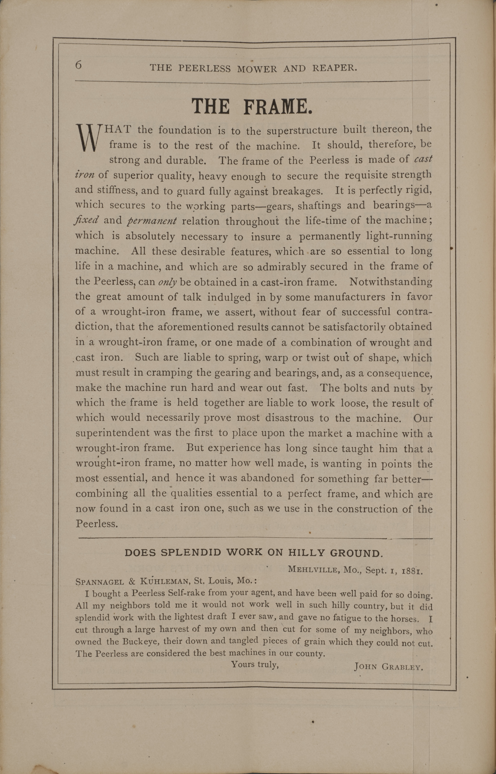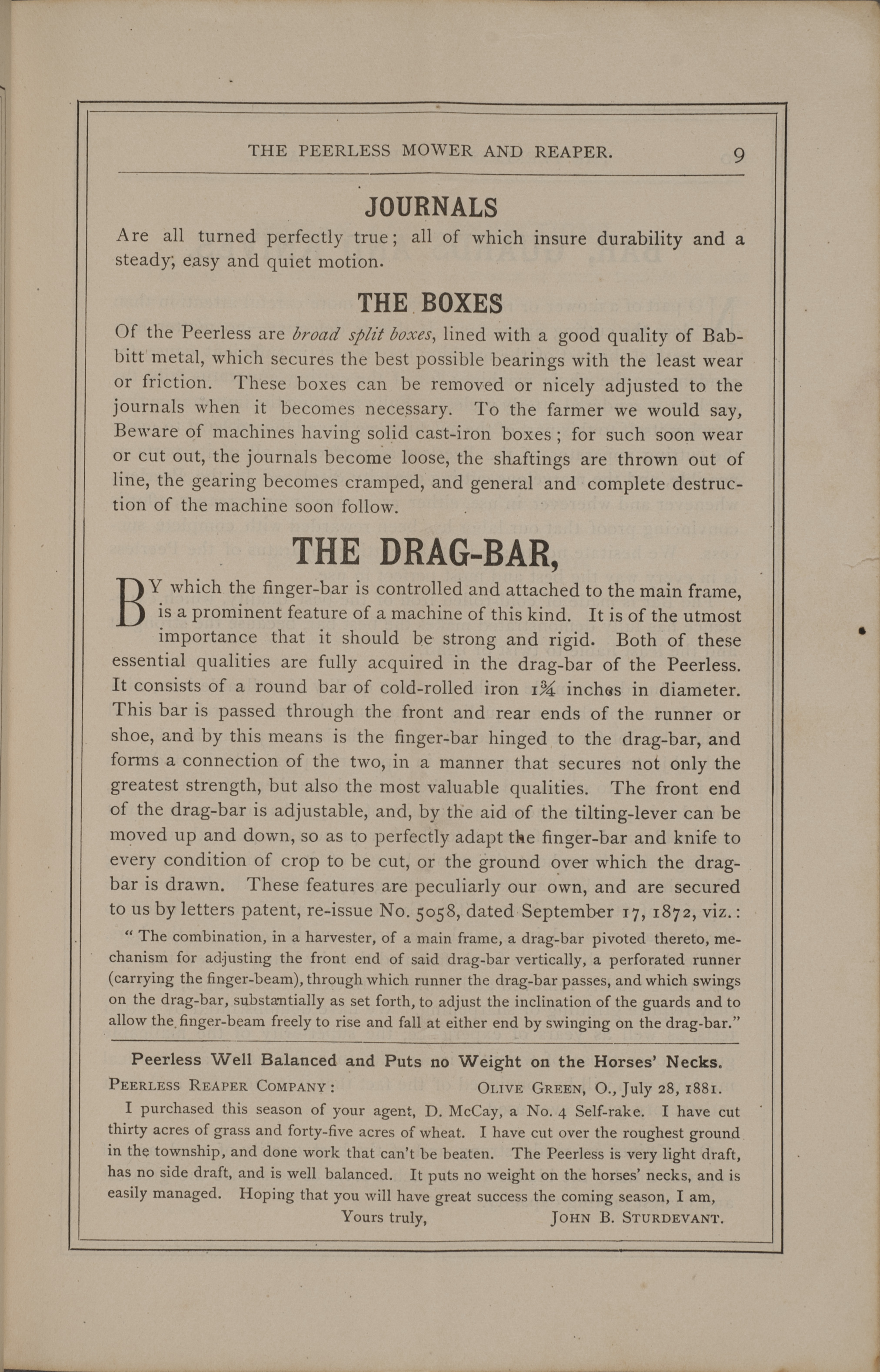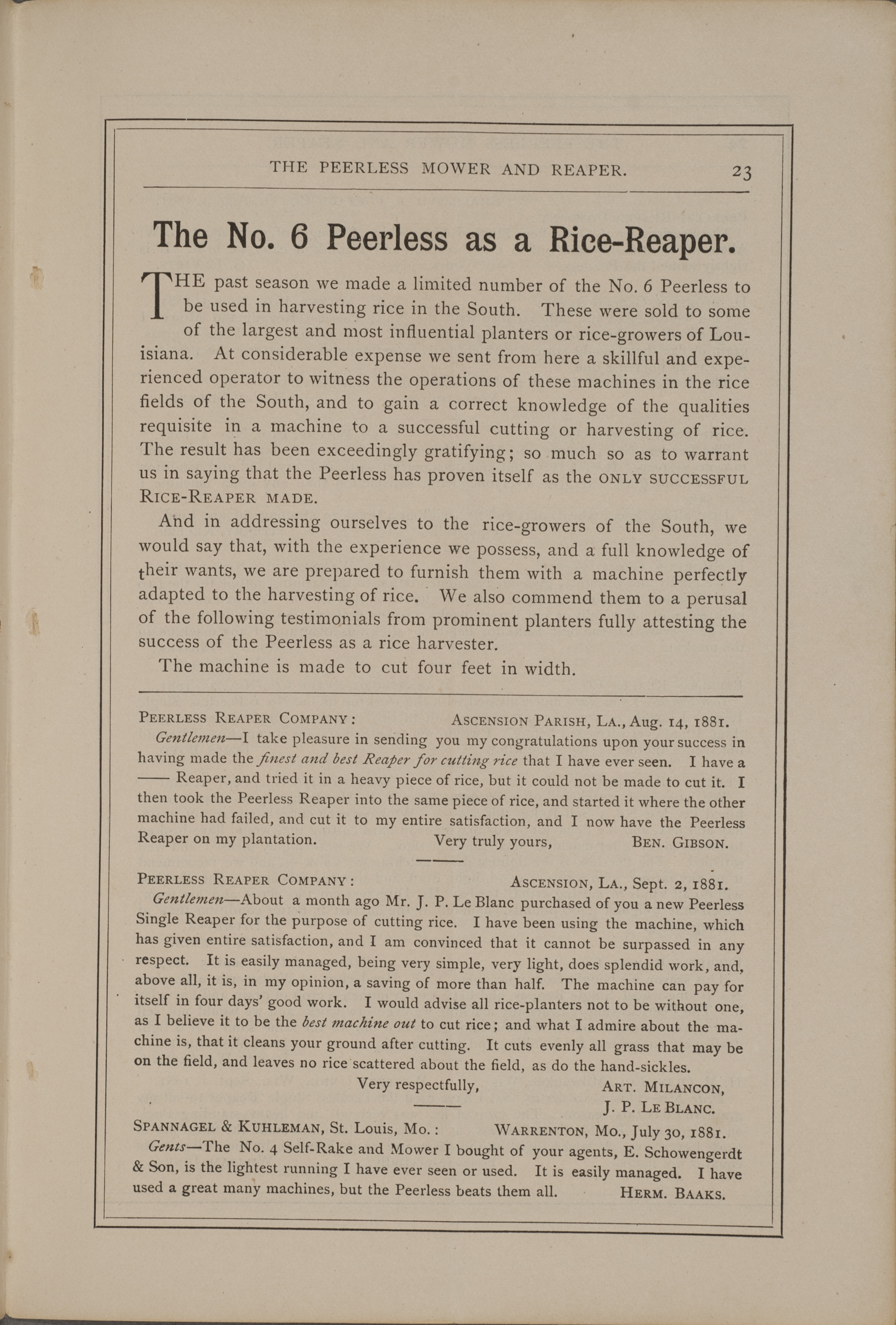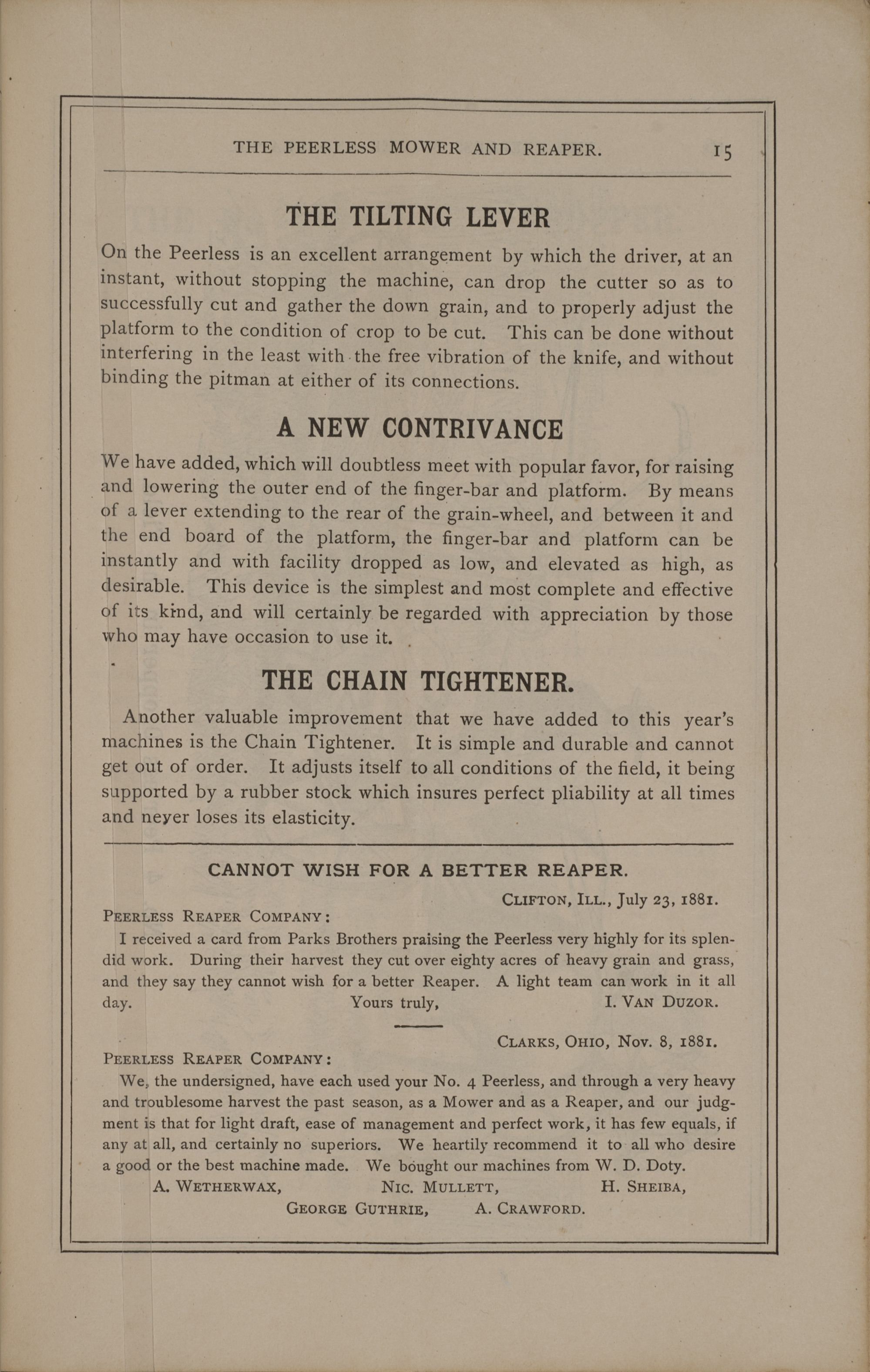 - "Peerless Reaper Company 1882 catalog", Agricultural Machinery Literature Collection, Iowa State University Library Digital Collections