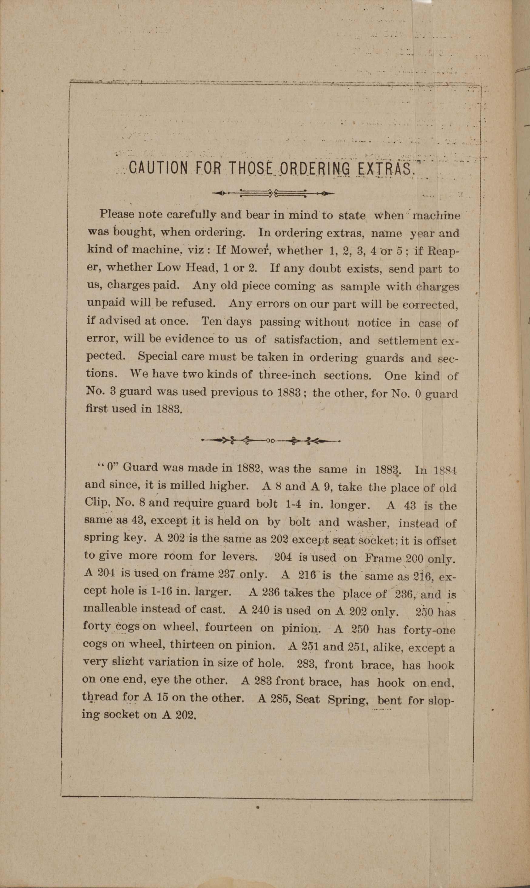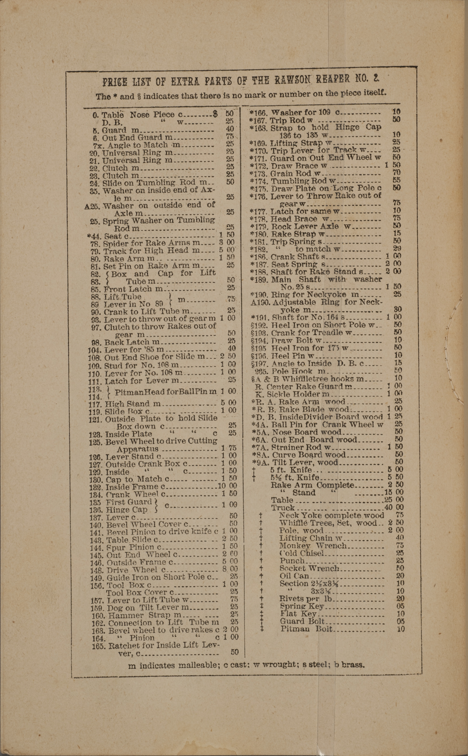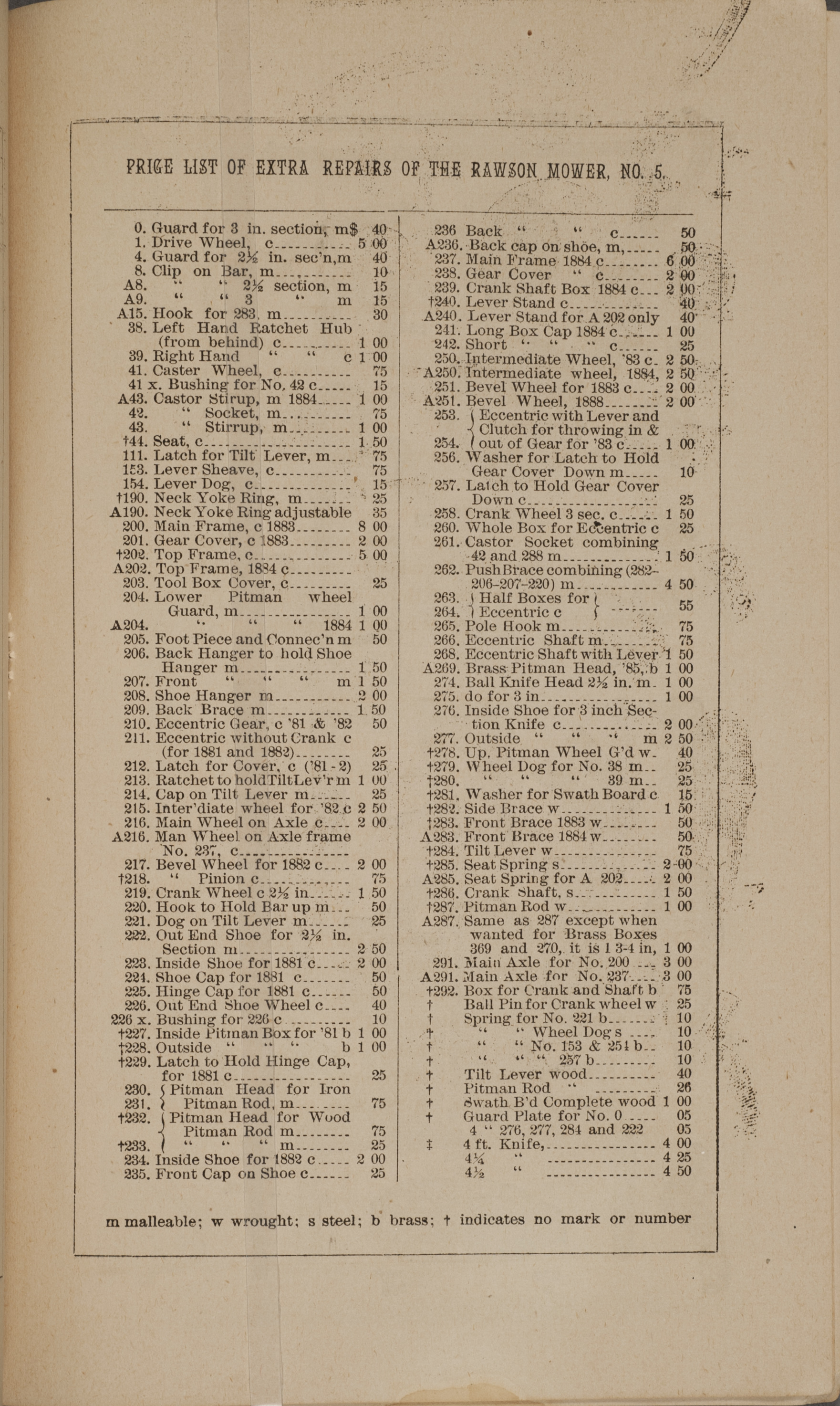 Rawson Manufacturing Company Mower and Reaper catalog Item Info