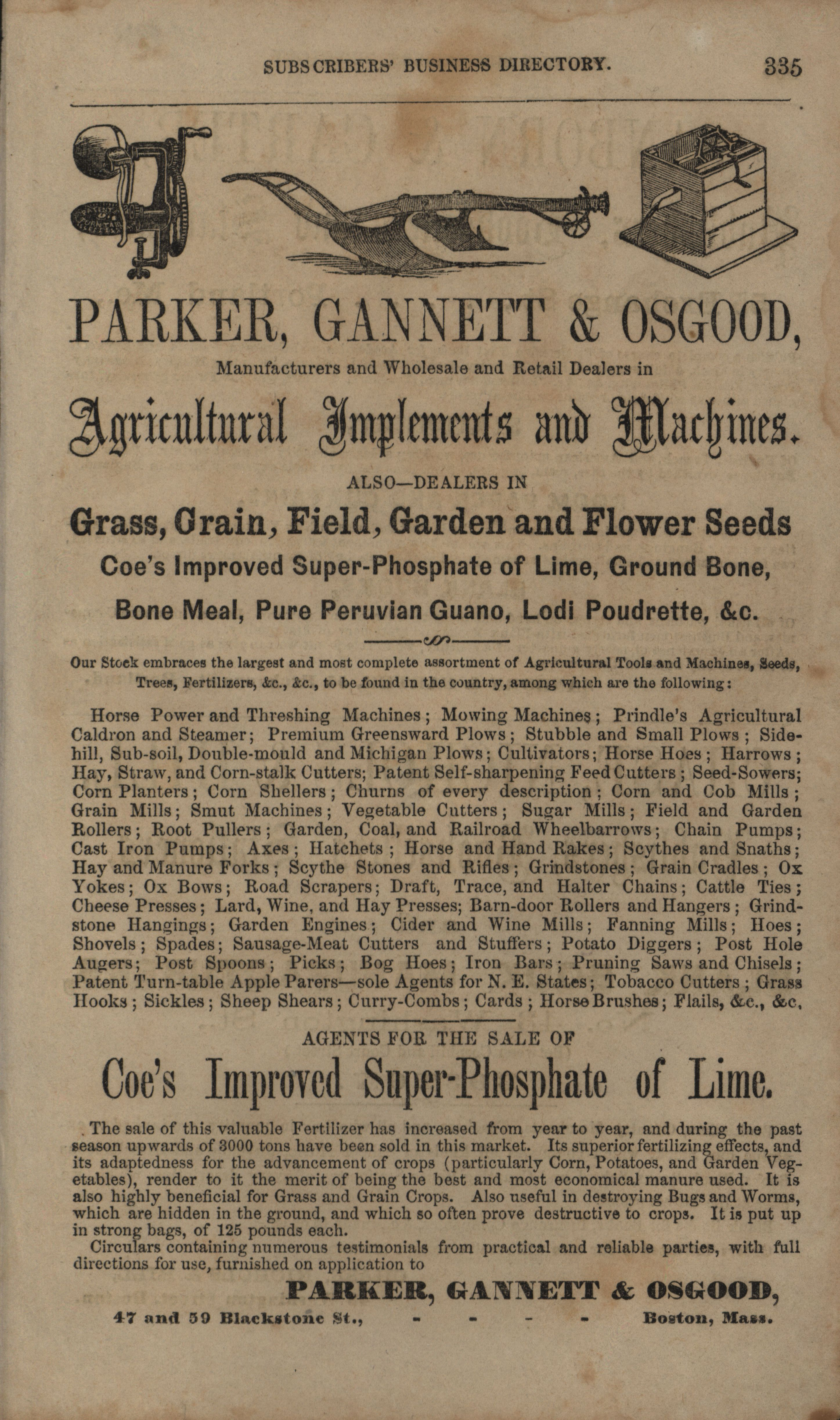 - Parker, Gannett and Osgood agricultural implements and machines advertisement