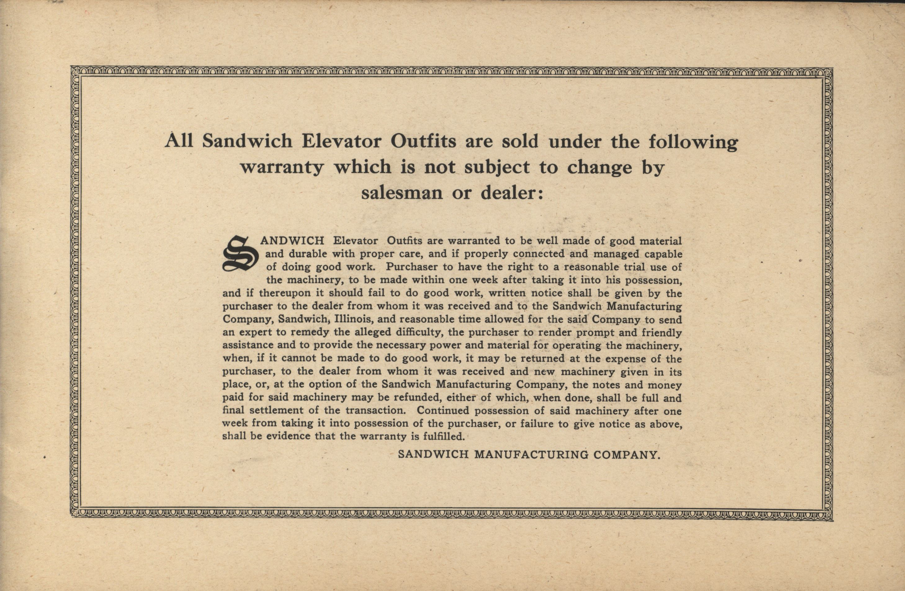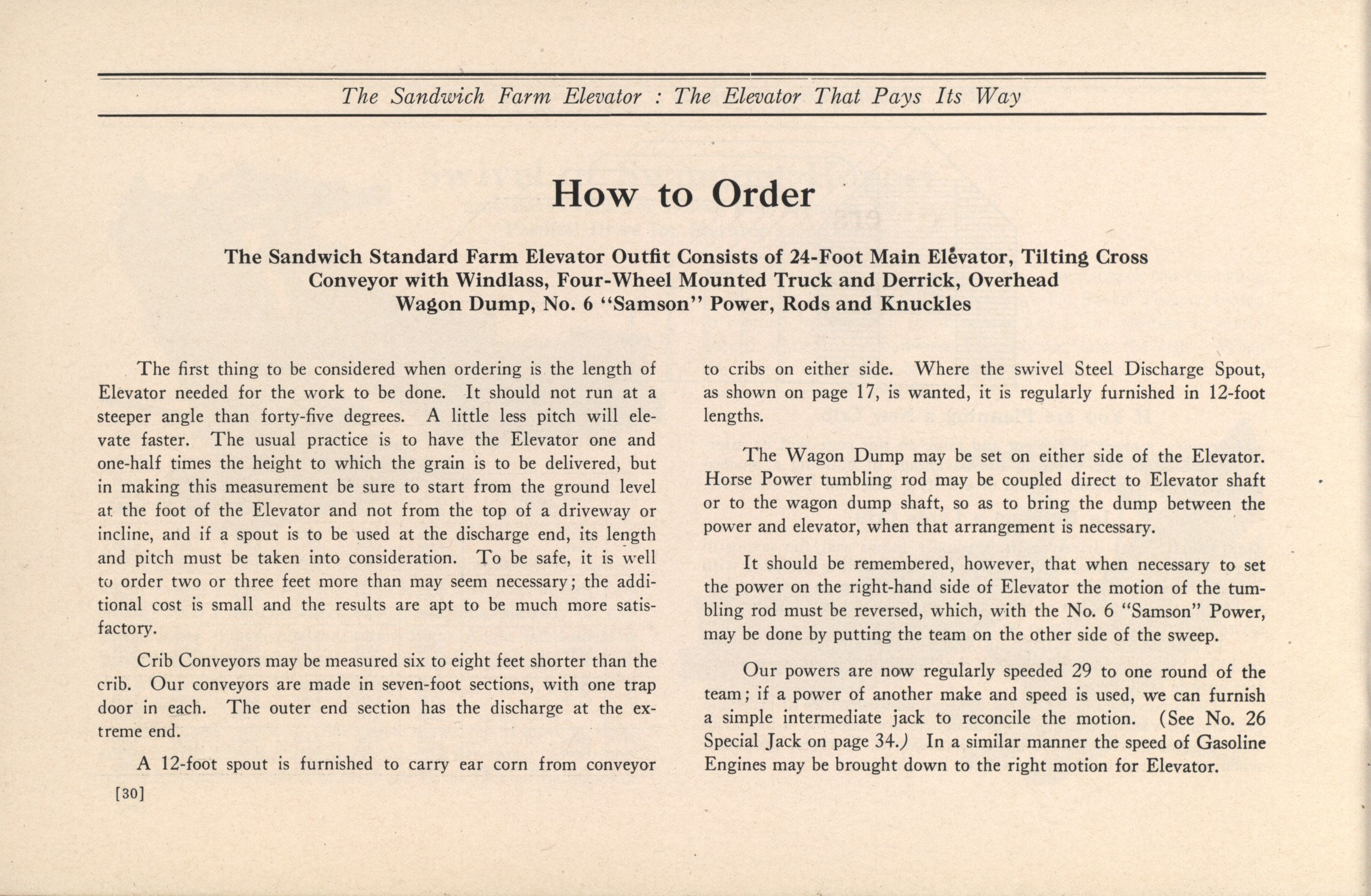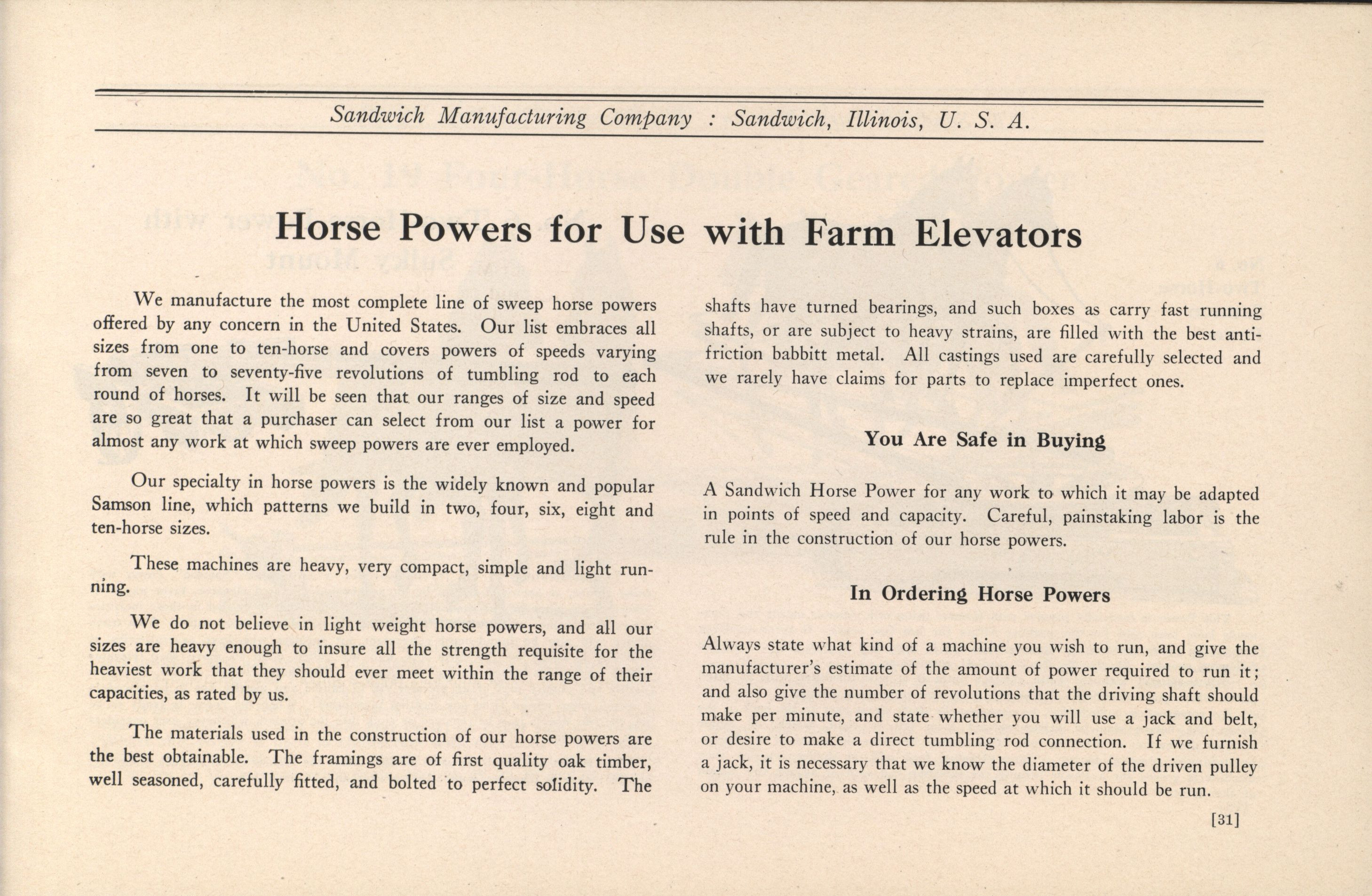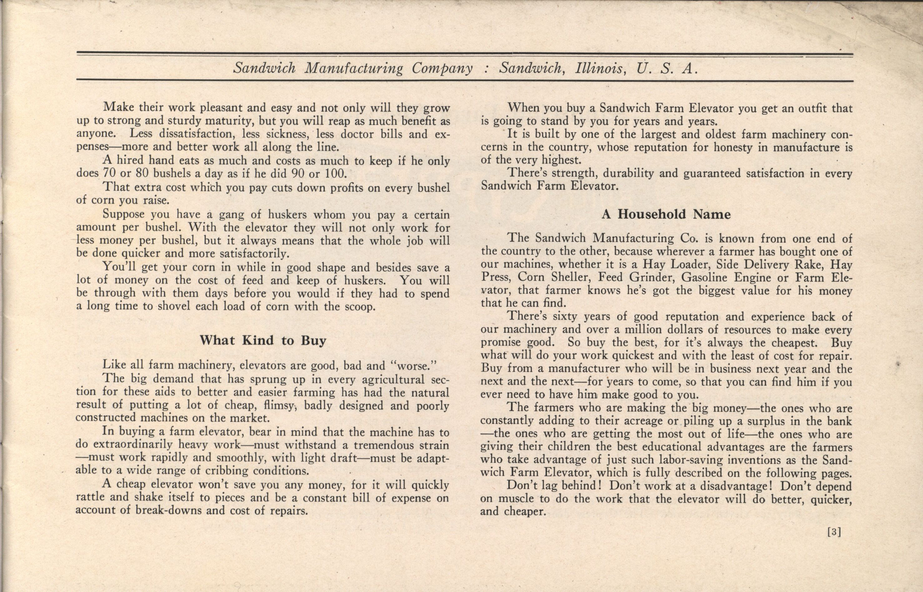 - "Sandwich Manufacturing Company farm elevators catalog", Agricultural Machinery Literature Collection, Iowa State University Library Digital Collections