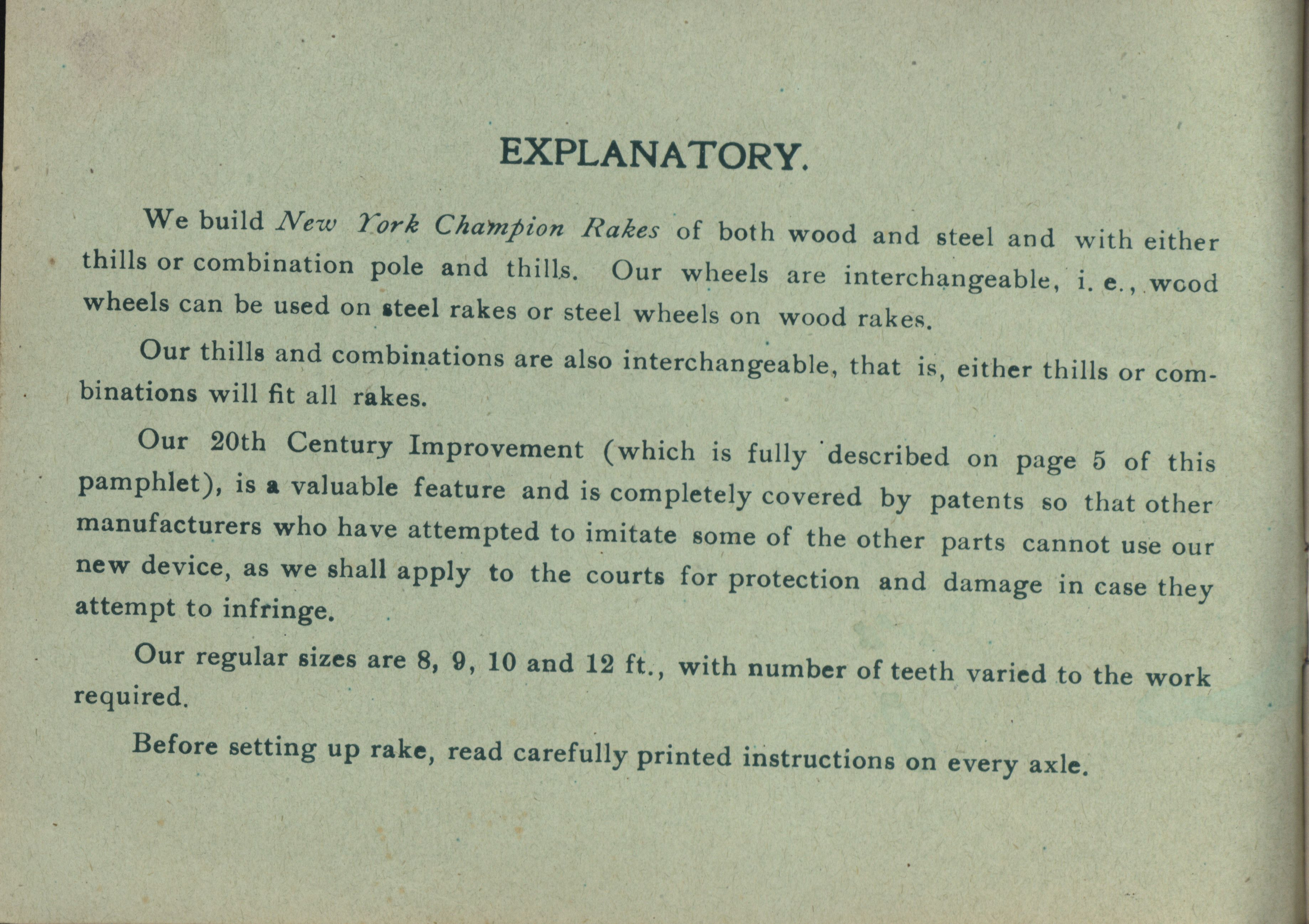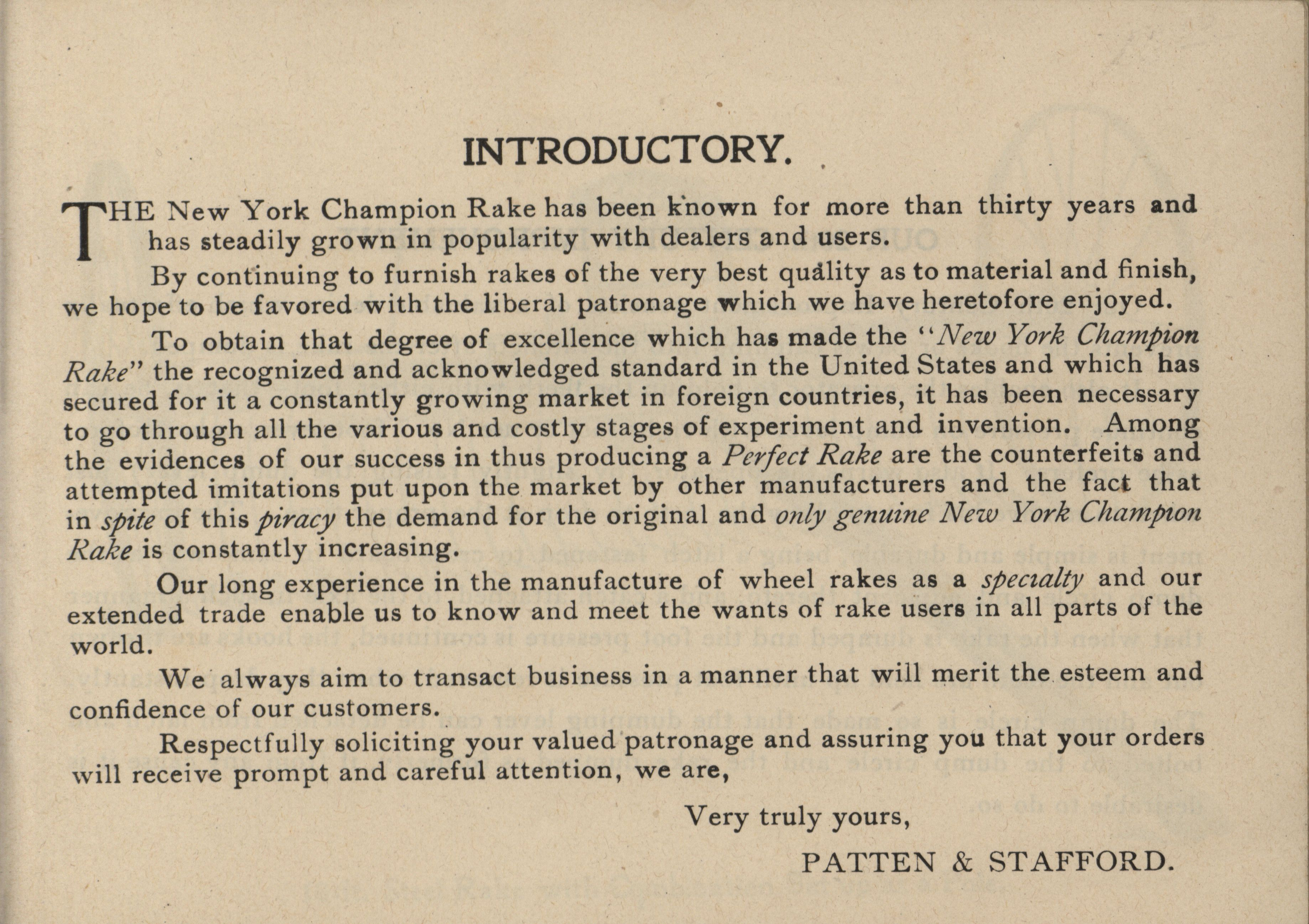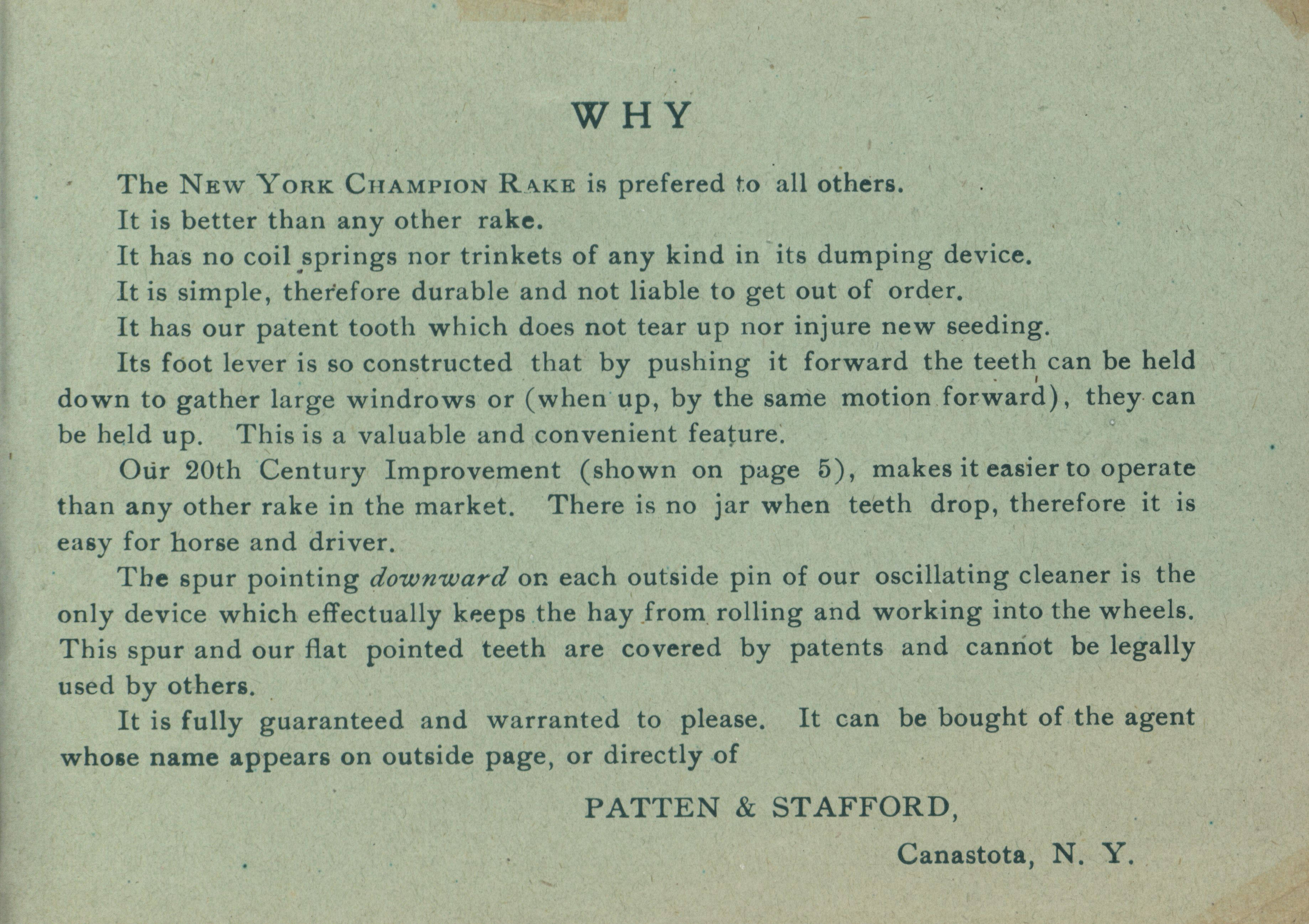 - "Patten and Stafford manufacturer wheel rakes catalog", Agricultural Machinery Literature Collection, Iowa State University Library Digital Collections