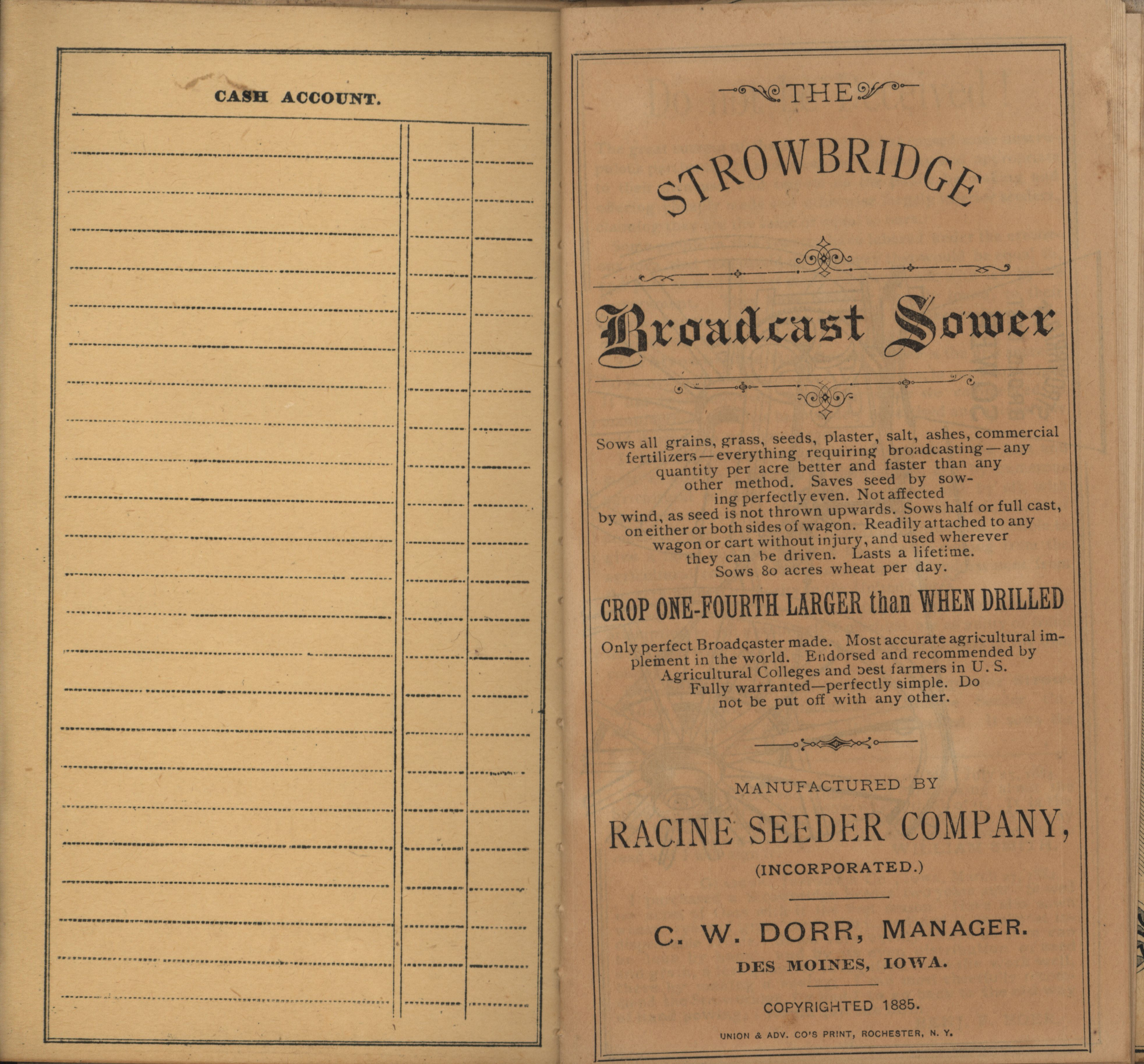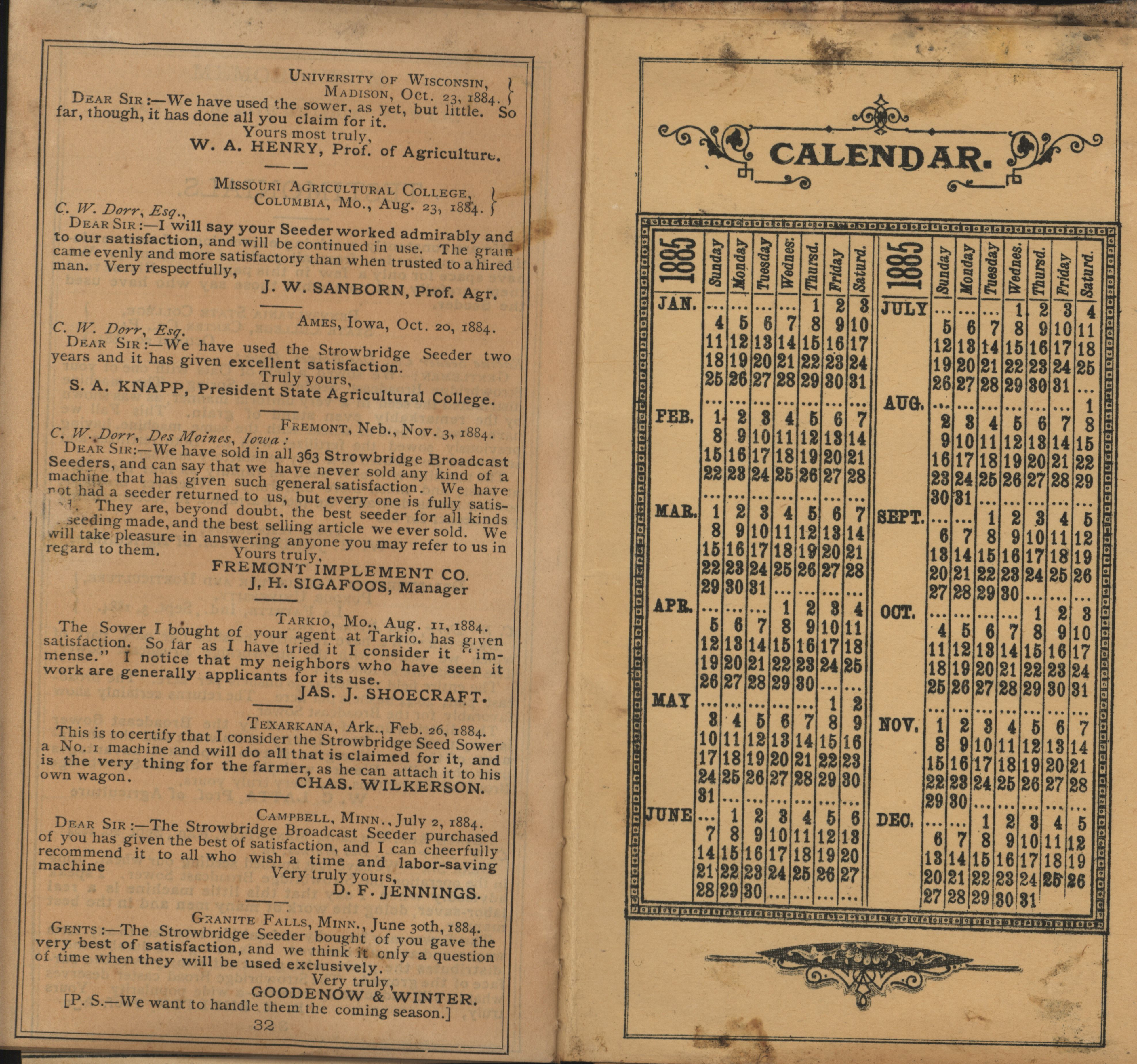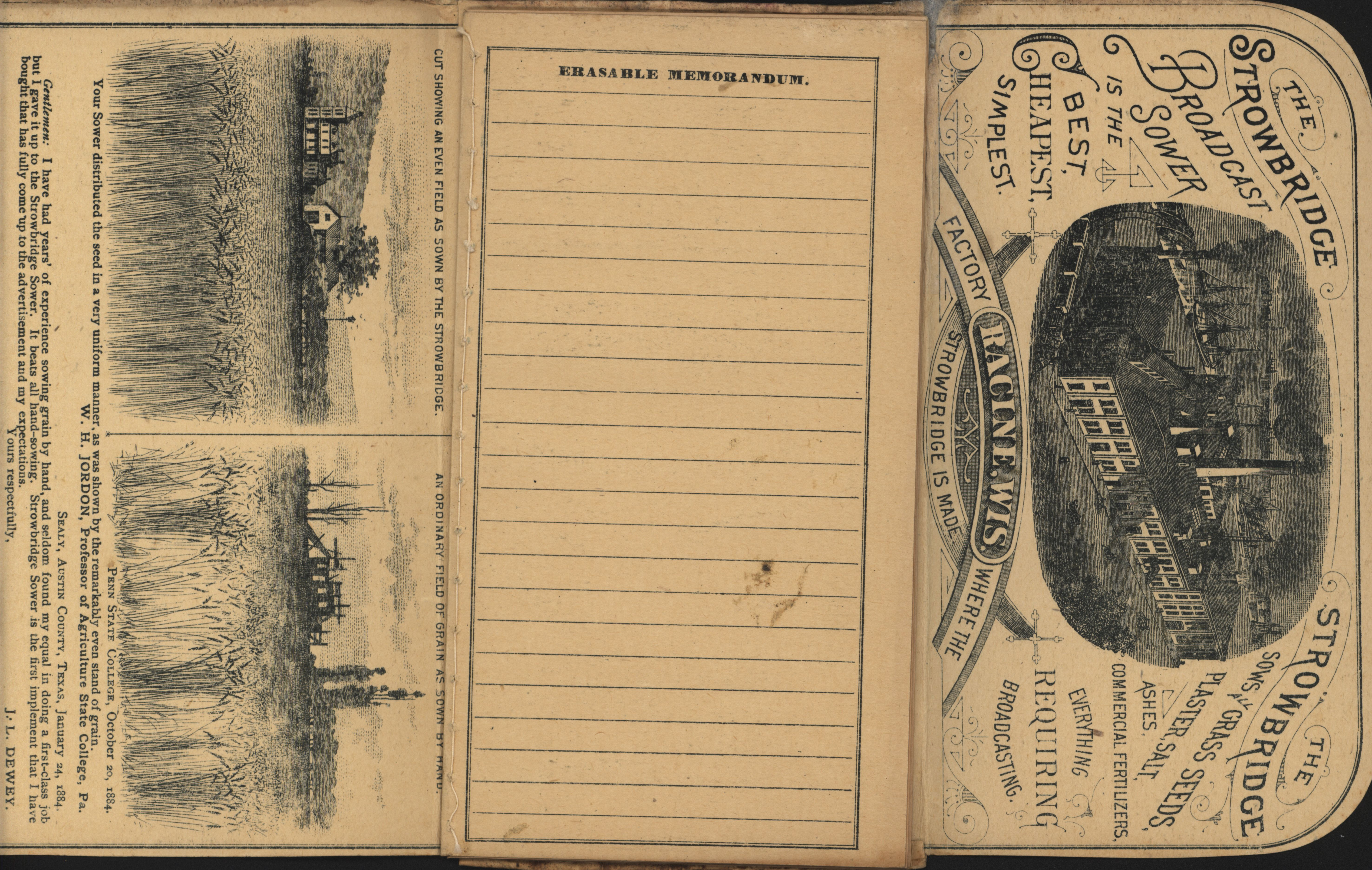 - "Racine Seeder Company 1885 Strowbridge pocket memorandum and calendar", Agricultural Machinery Literature Collection, Iowa State University Library Digital Collections