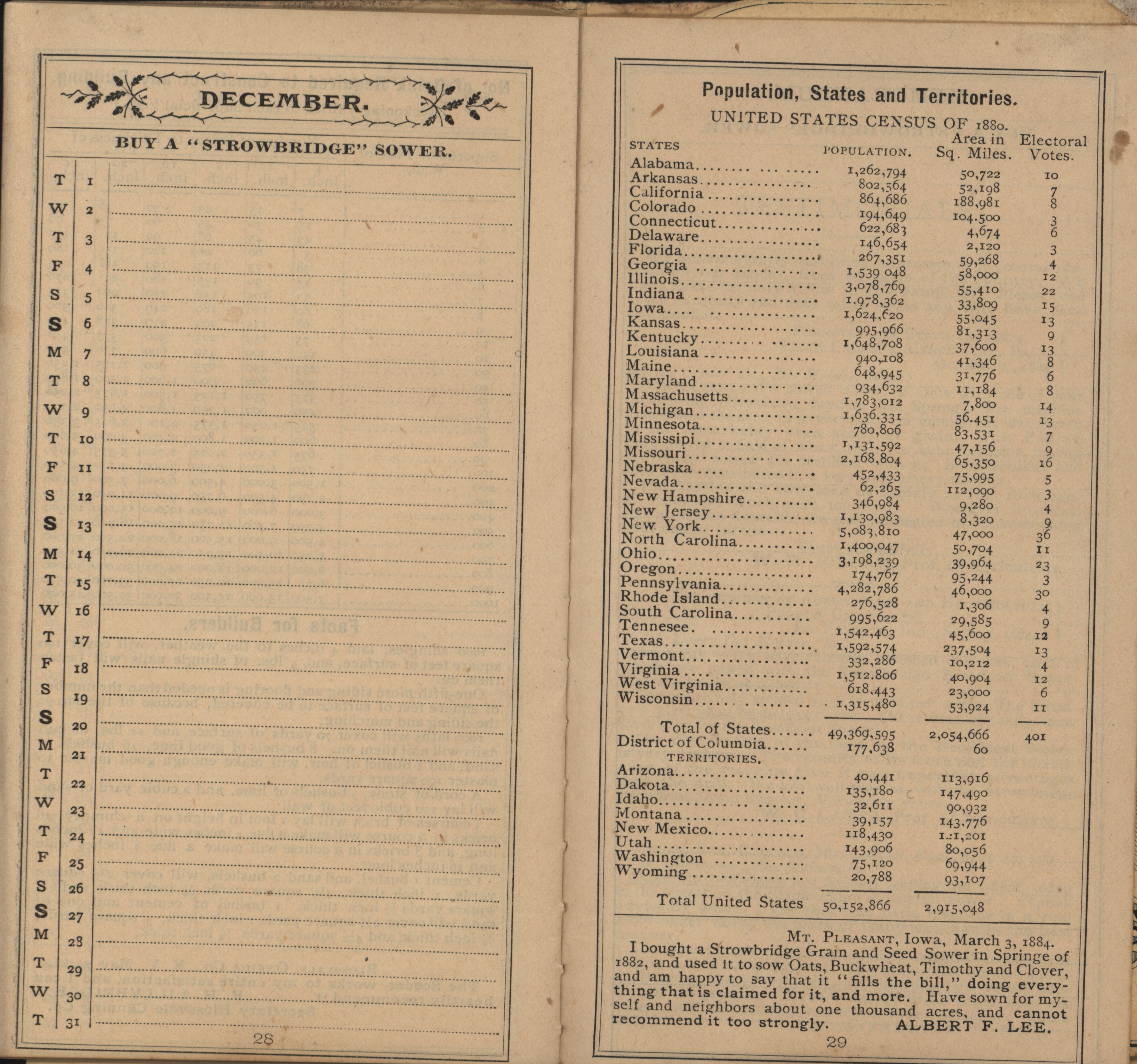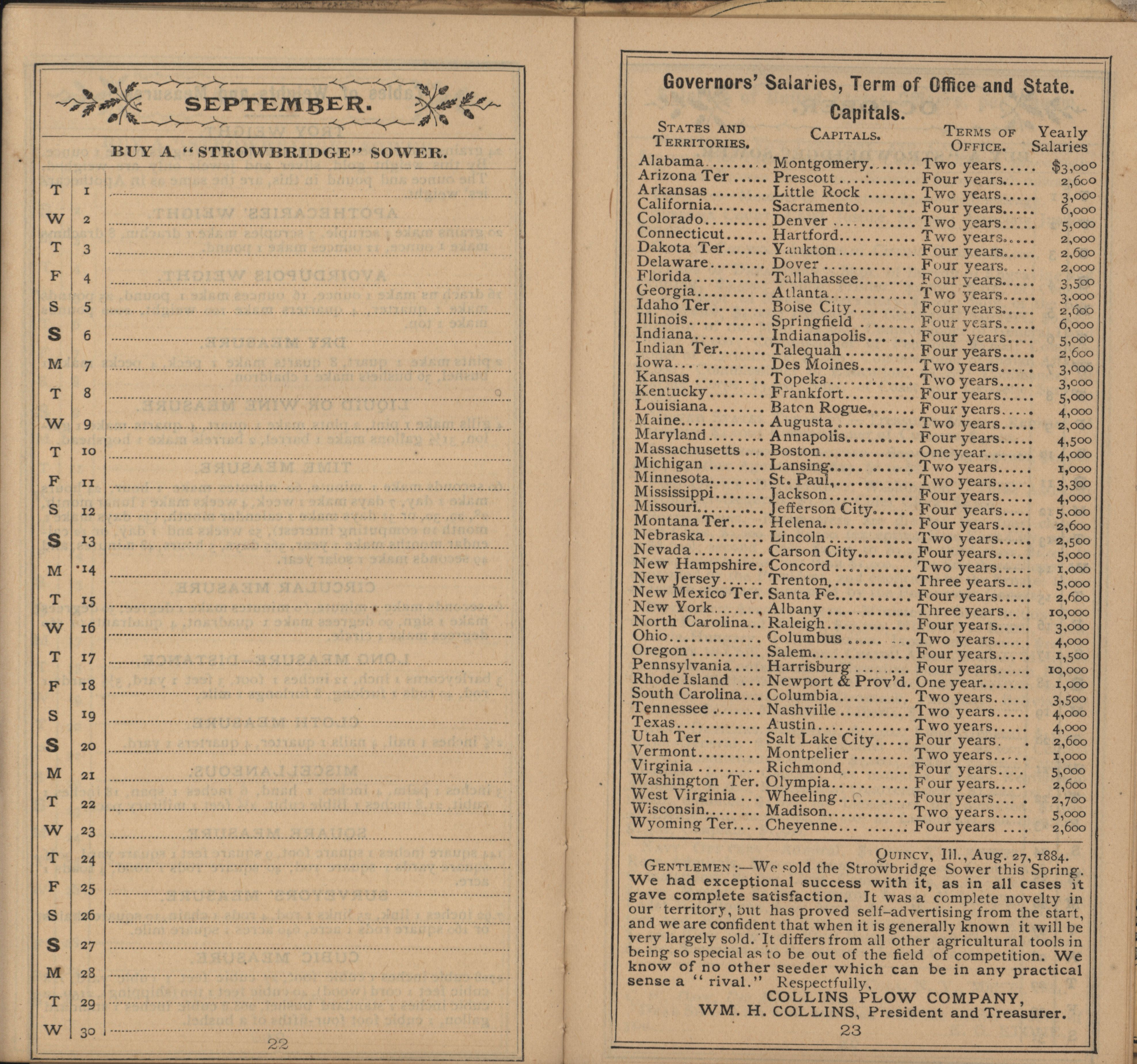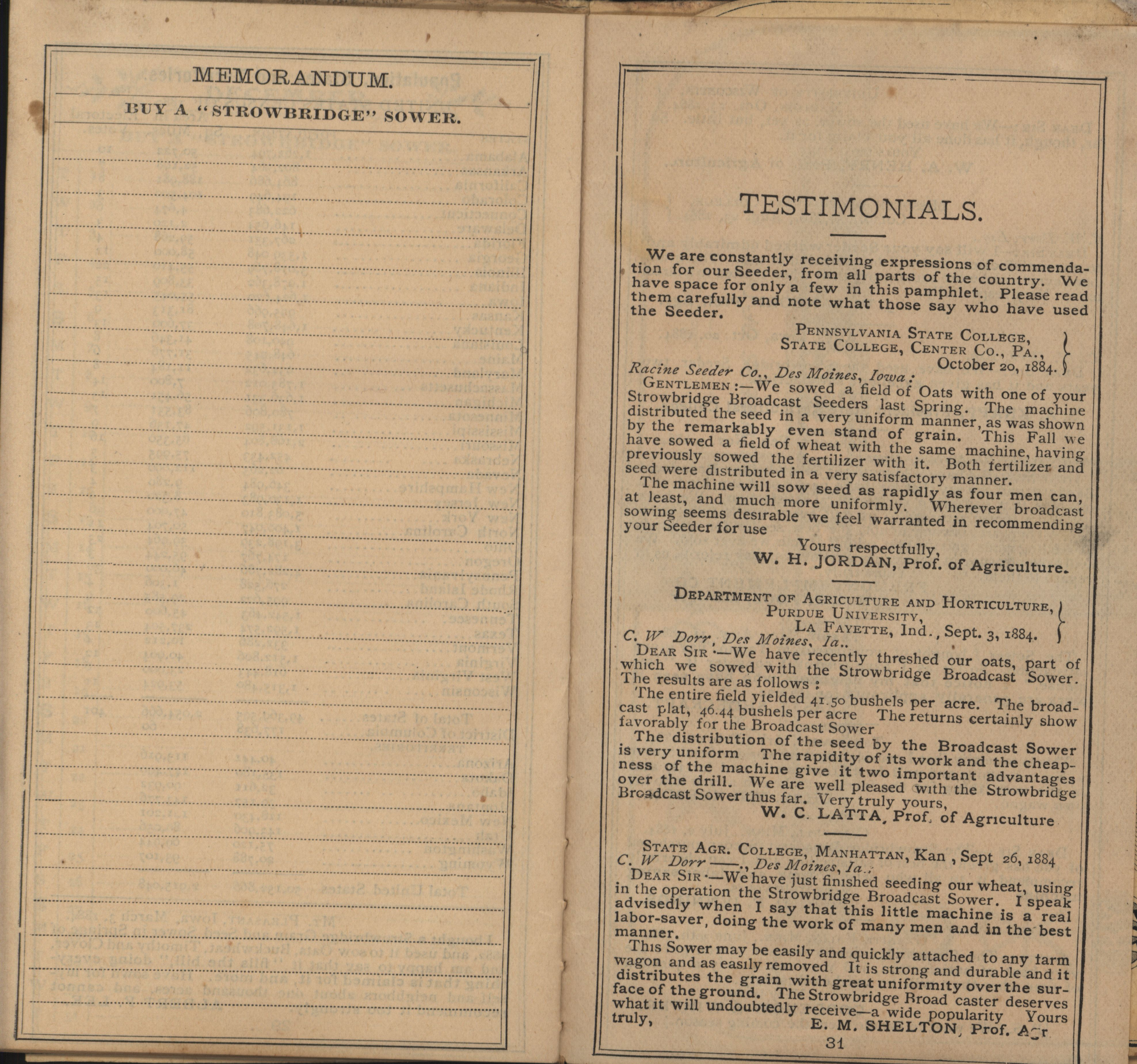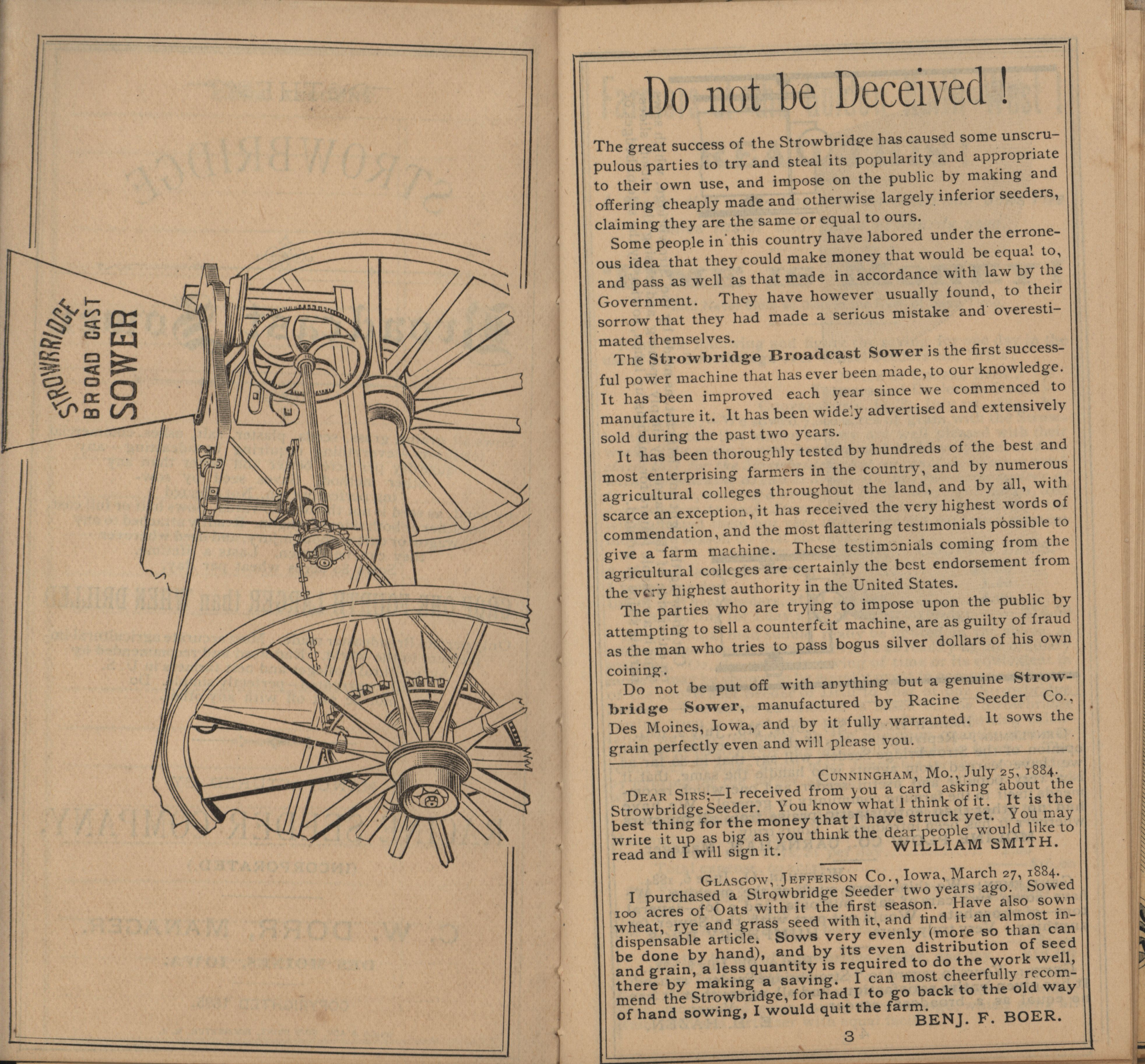 - "Racine Seeder Company 1885 Strowbridge pocket memorandum and calendar", Agricultural Machinery Literature Collection, Iowa State University Library Digital Collections