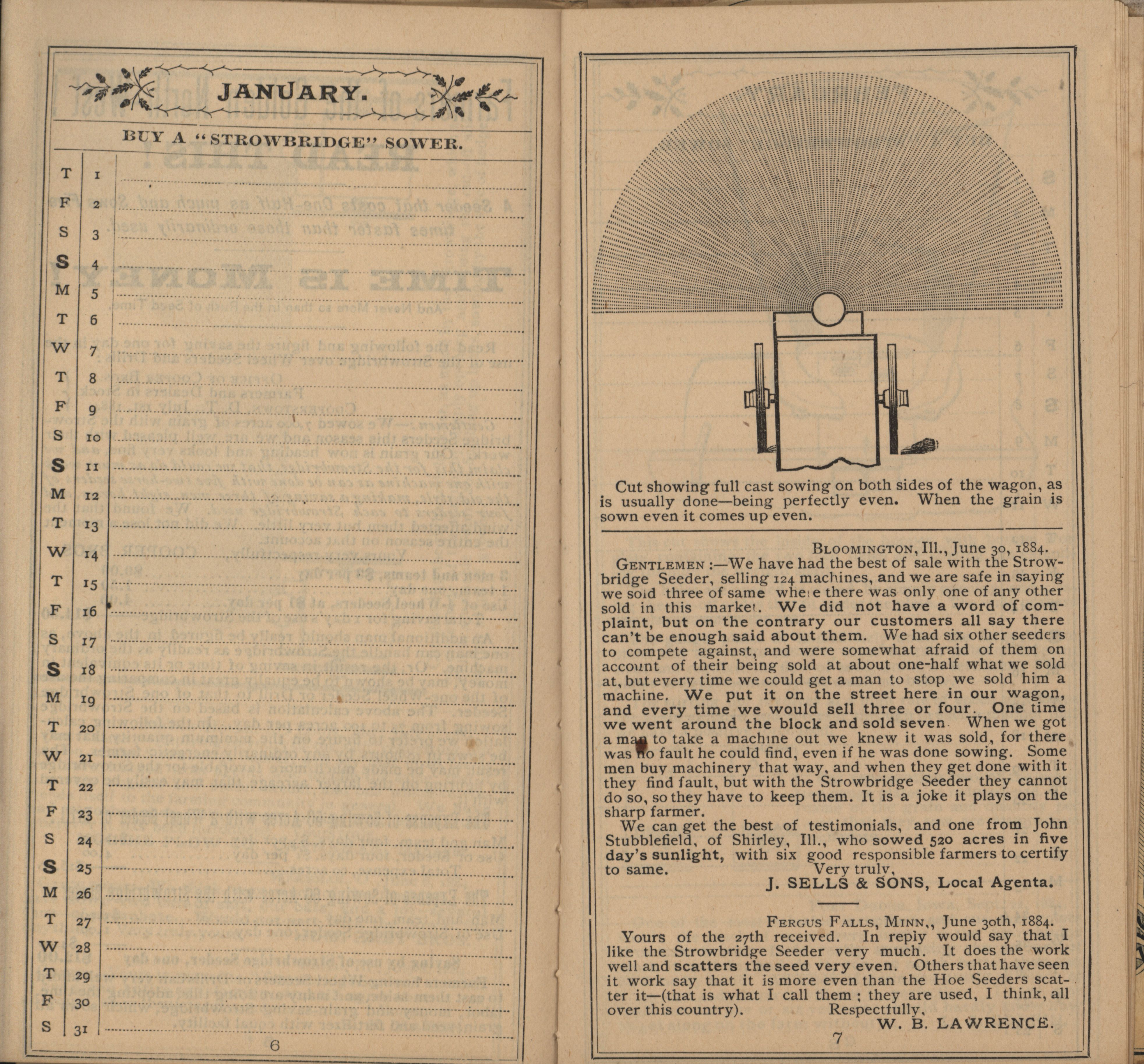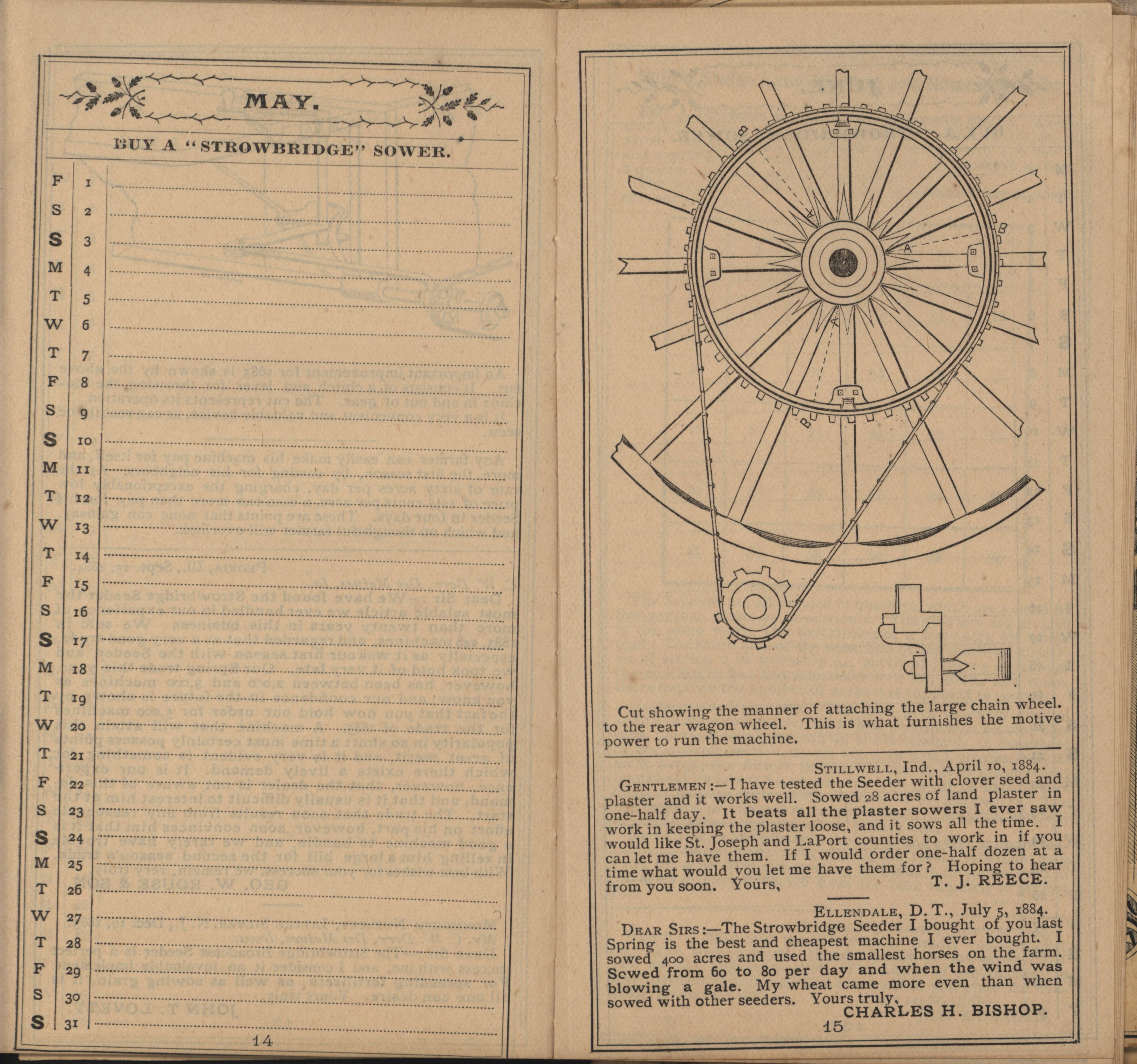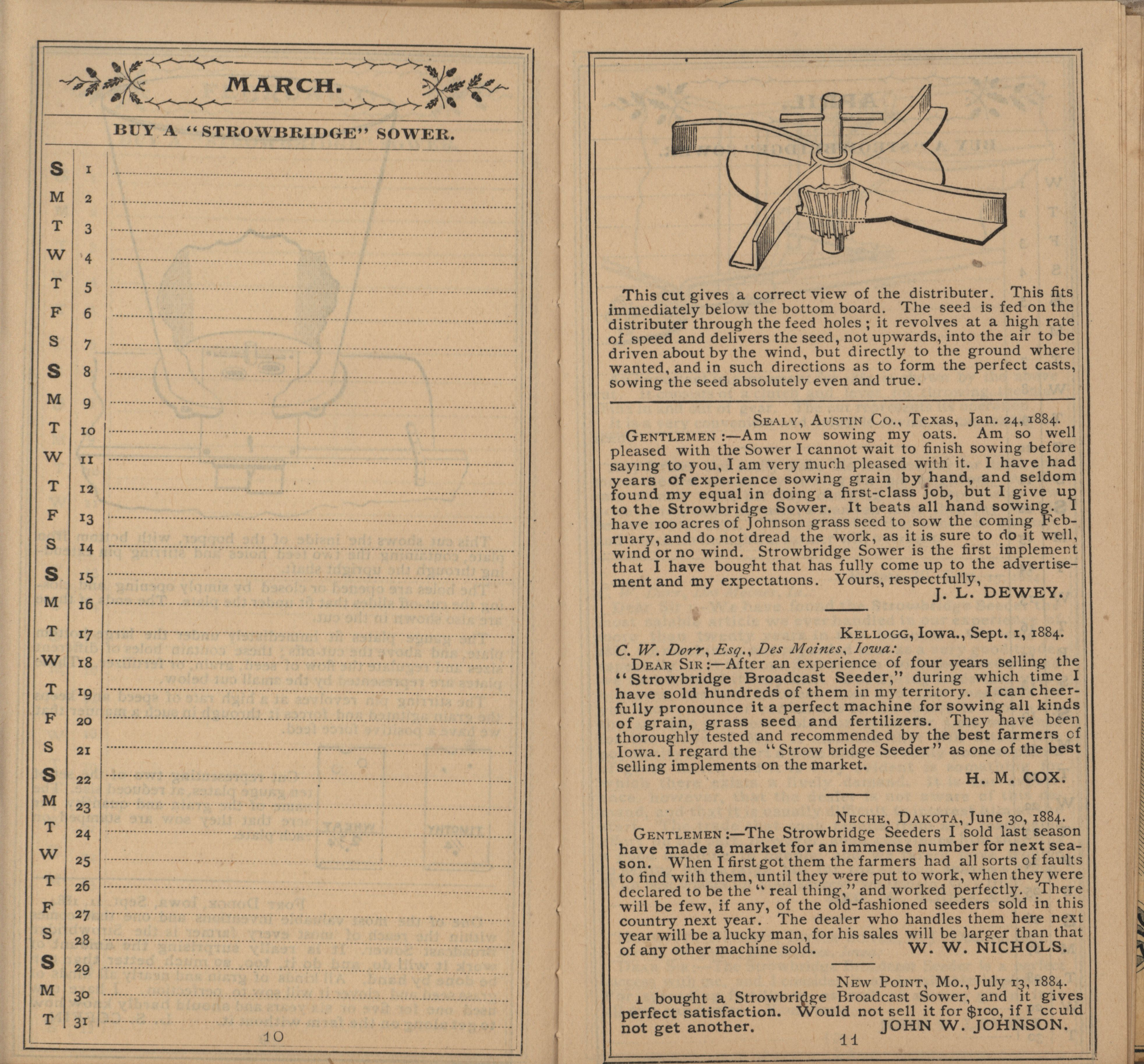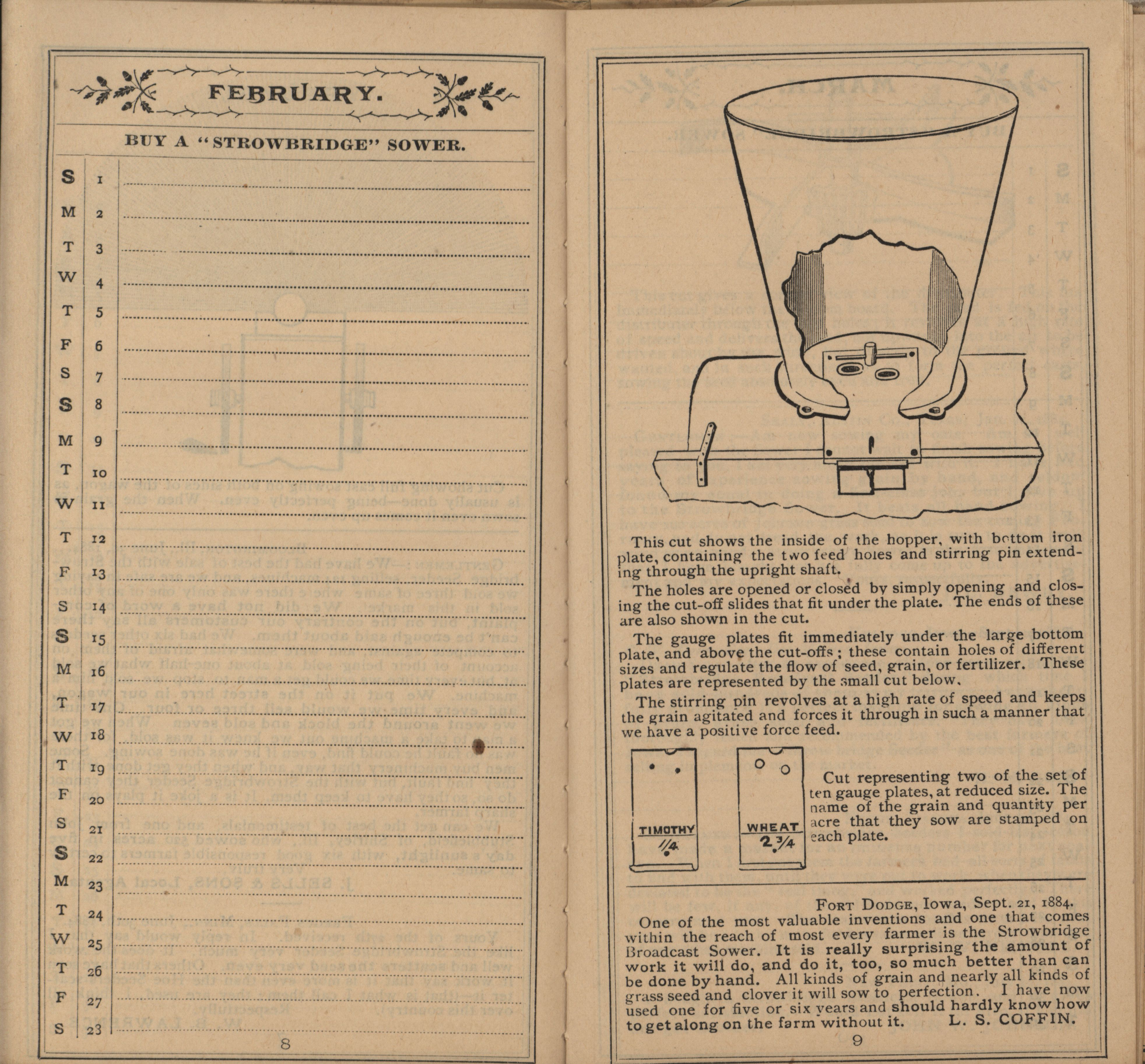 - Illustrated Strowbridge pocket memorandum and calendar produced by Racine Seeder Company in 1885.