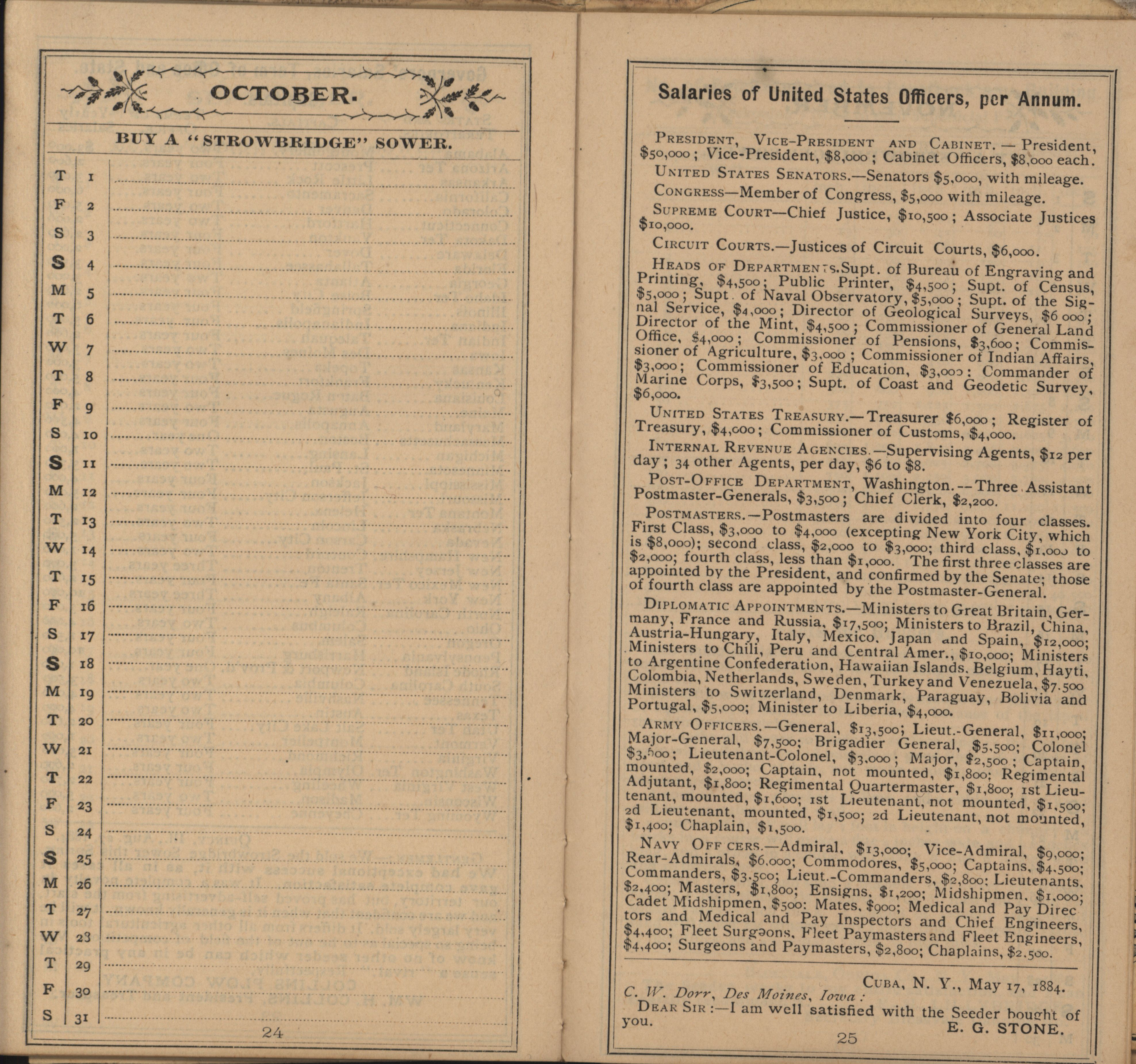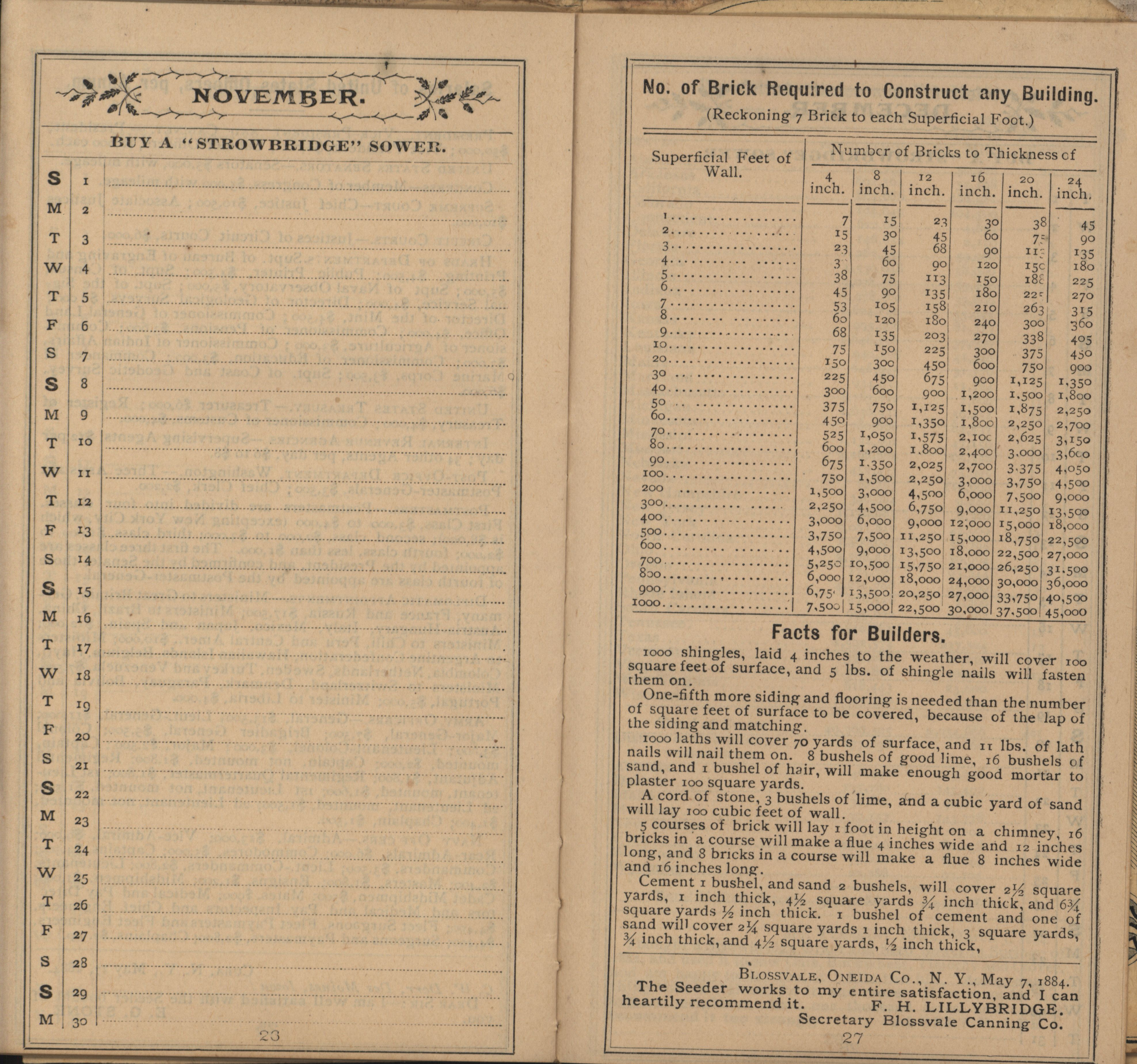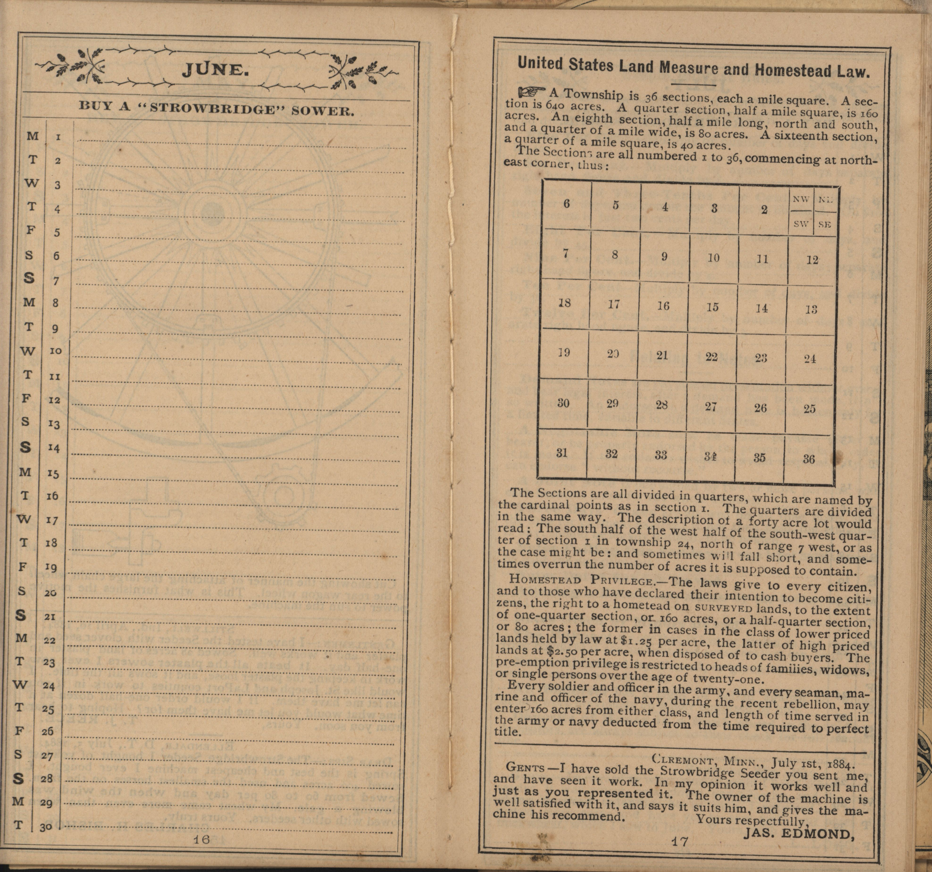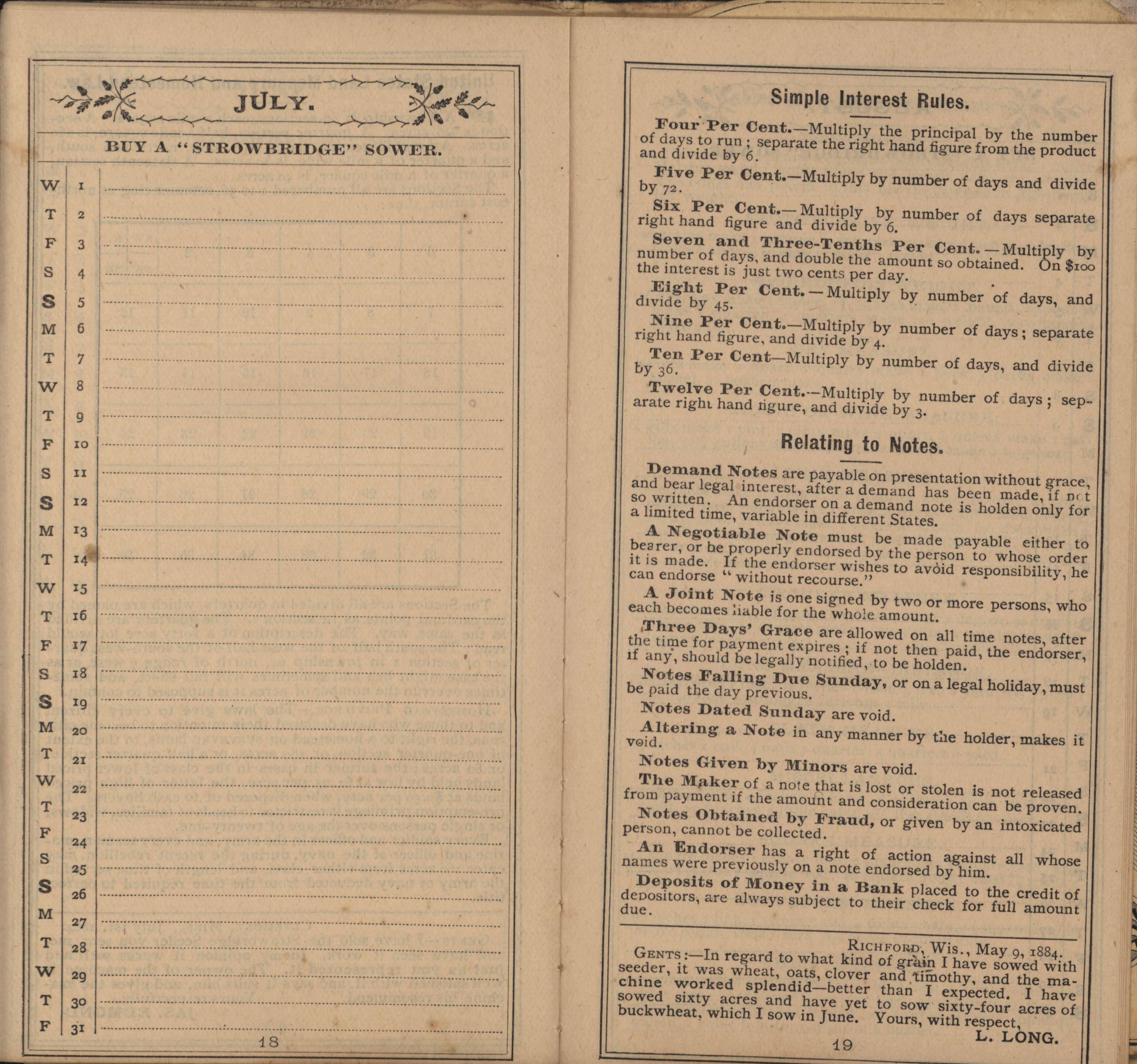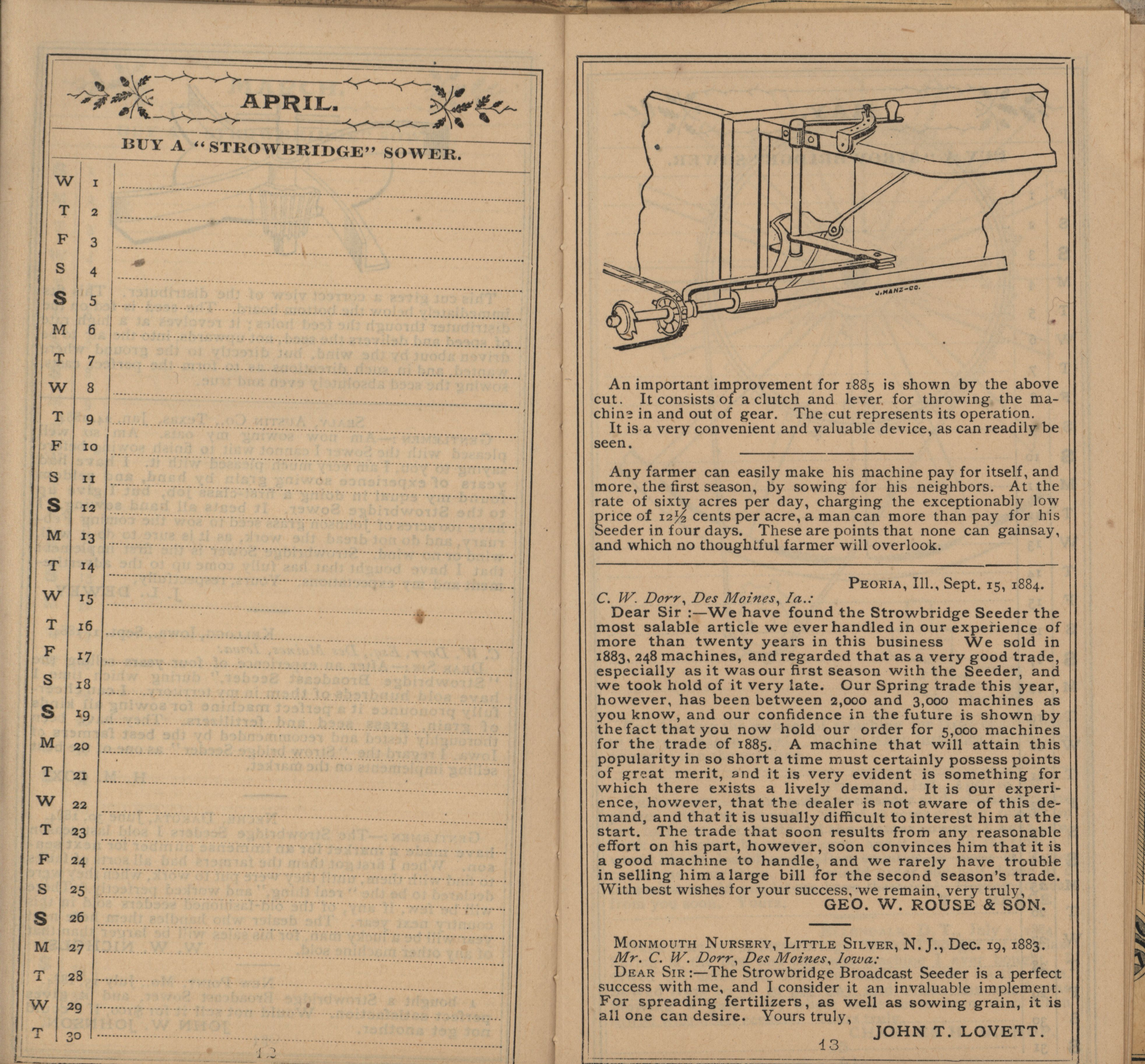 - Illustrated Strowbridge pocket memorandum and calendar produced by Racine Seeder Company in 1885.