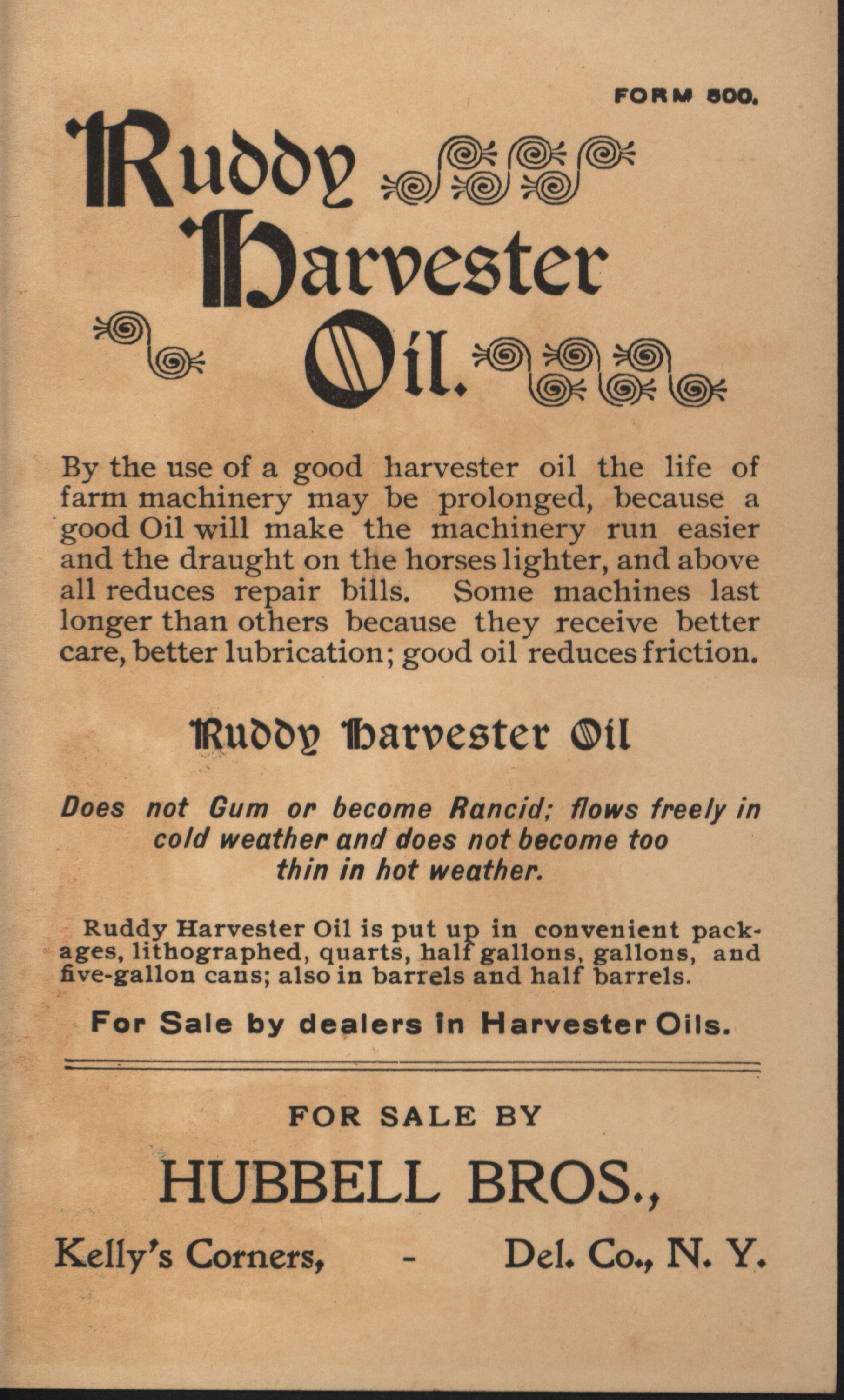 - "Hubbell Brothers Ruddy Harvester Oil advertisement", Agricultural Machinery Literature Collection, Iowa State University Library Digital Collections
