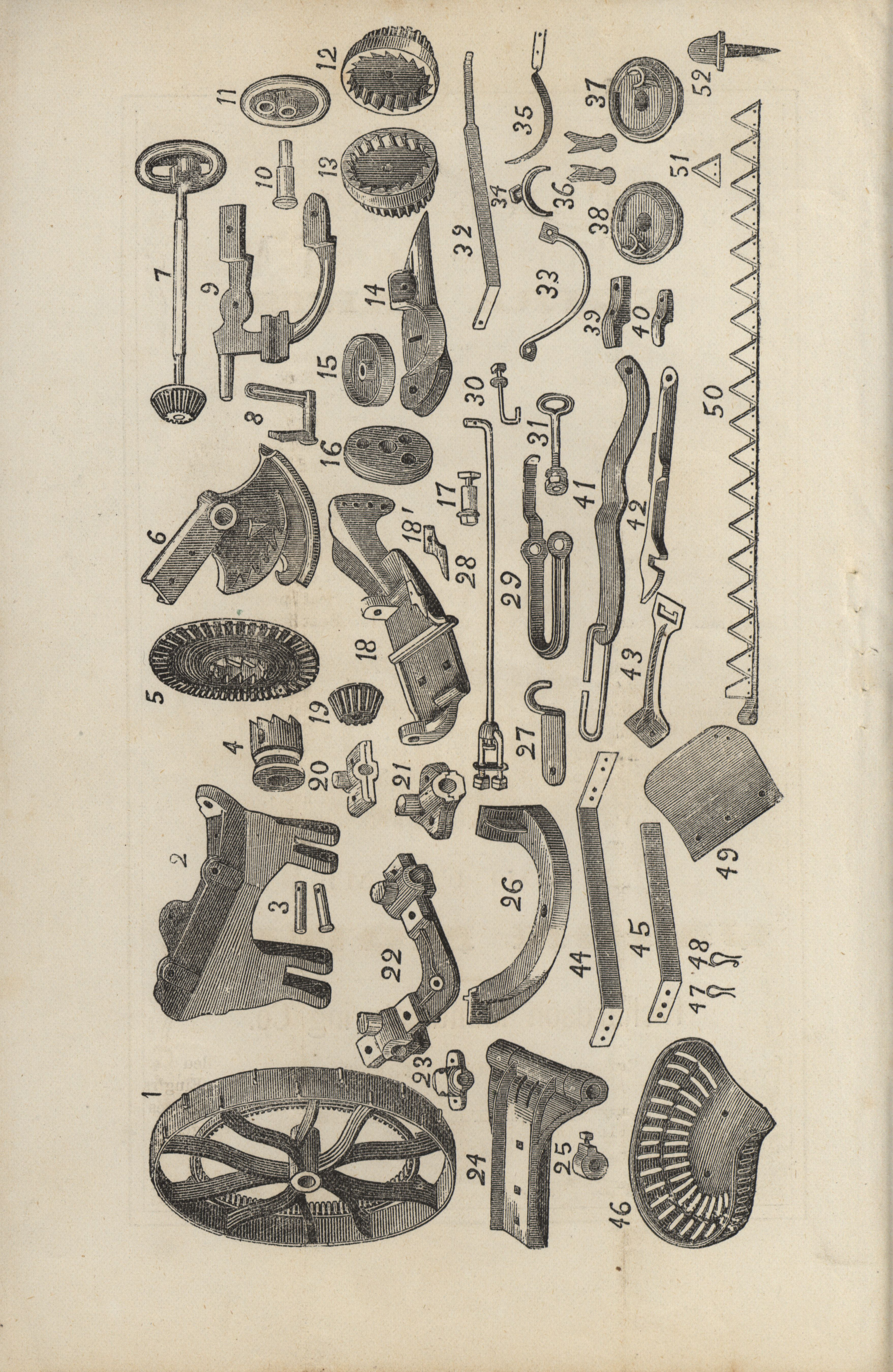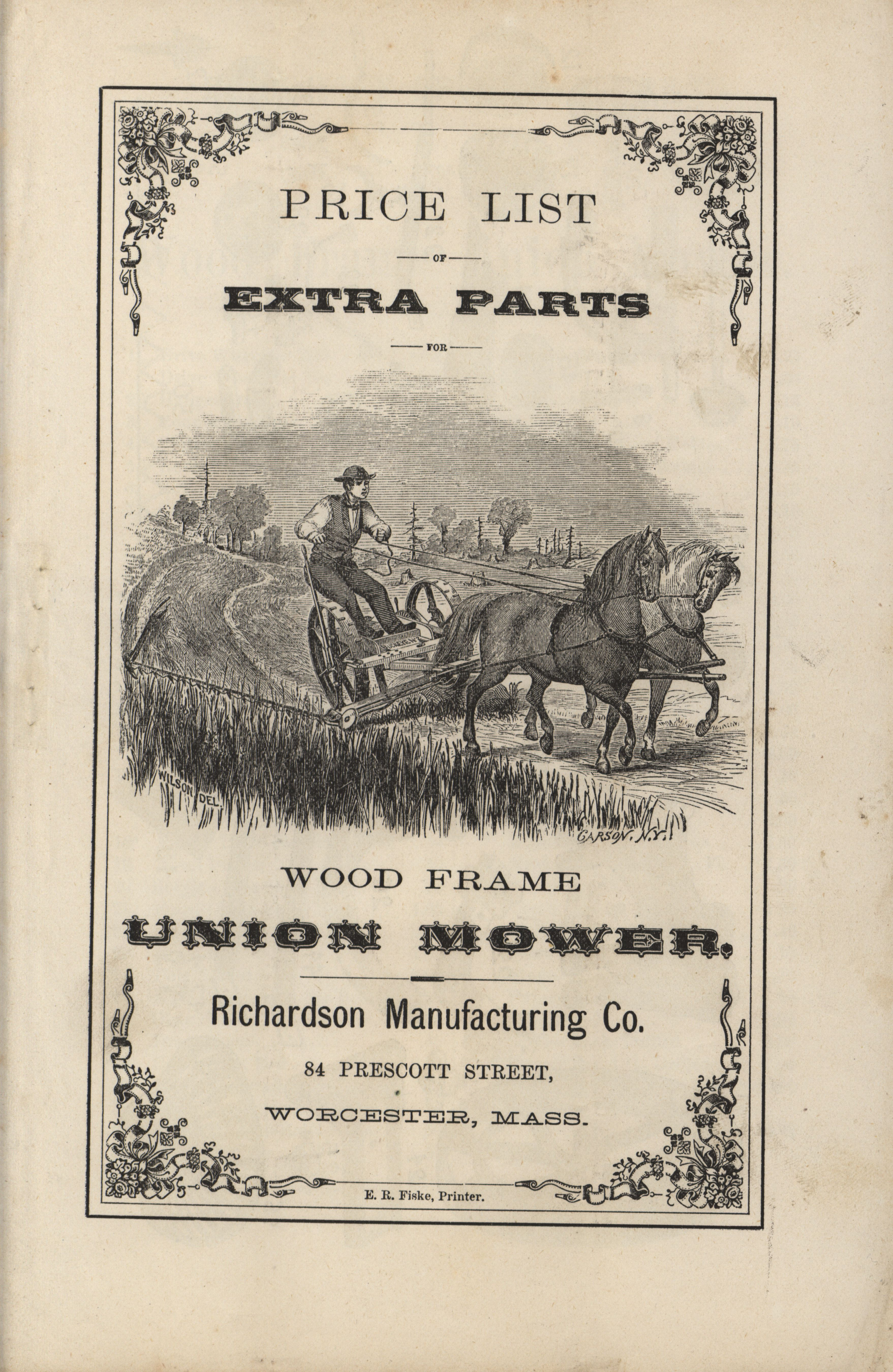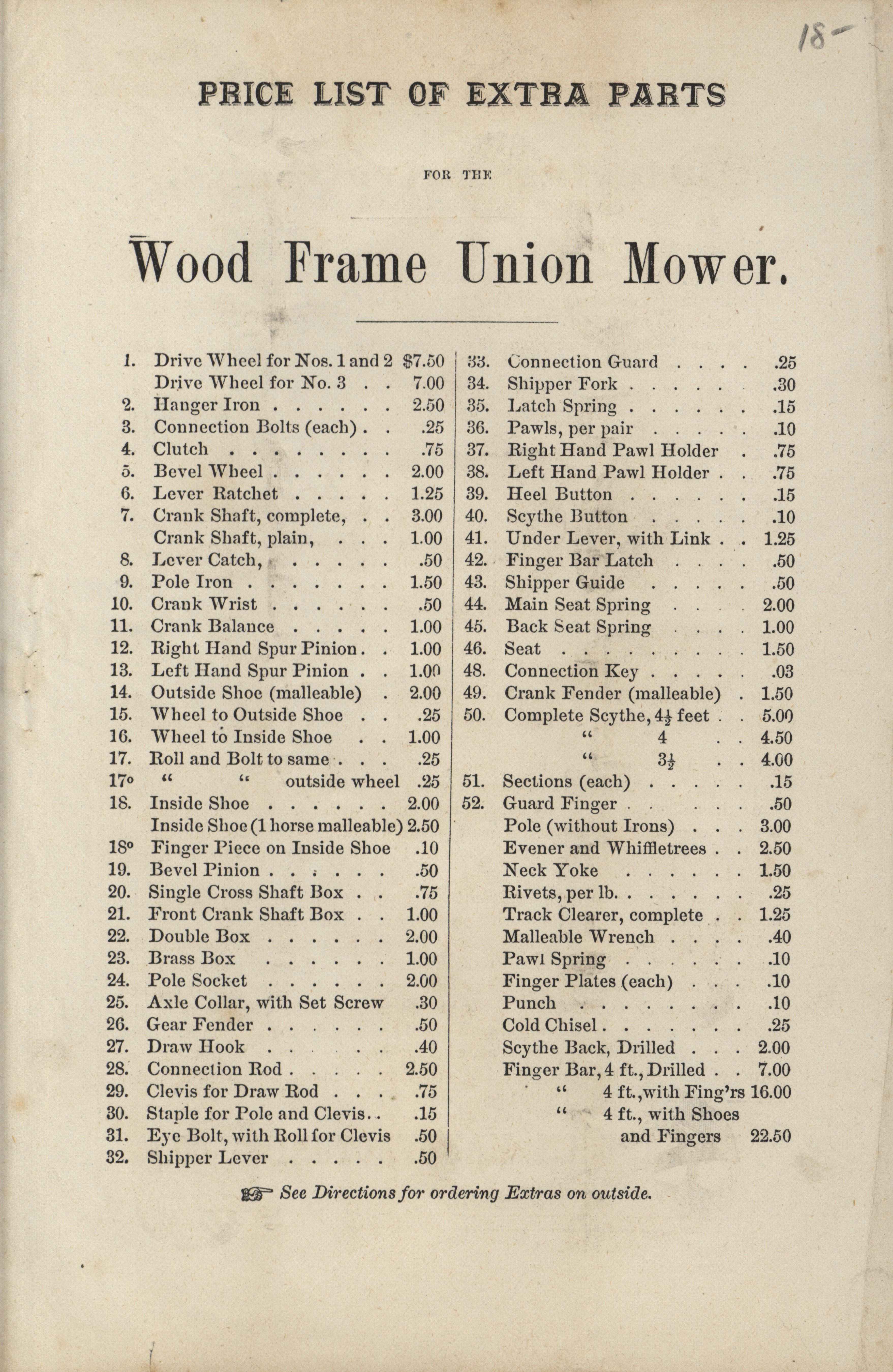 - Illustrated price list of extra parts for the Wood Frame Union Mower offered by the Richardson Manufacturing Company.