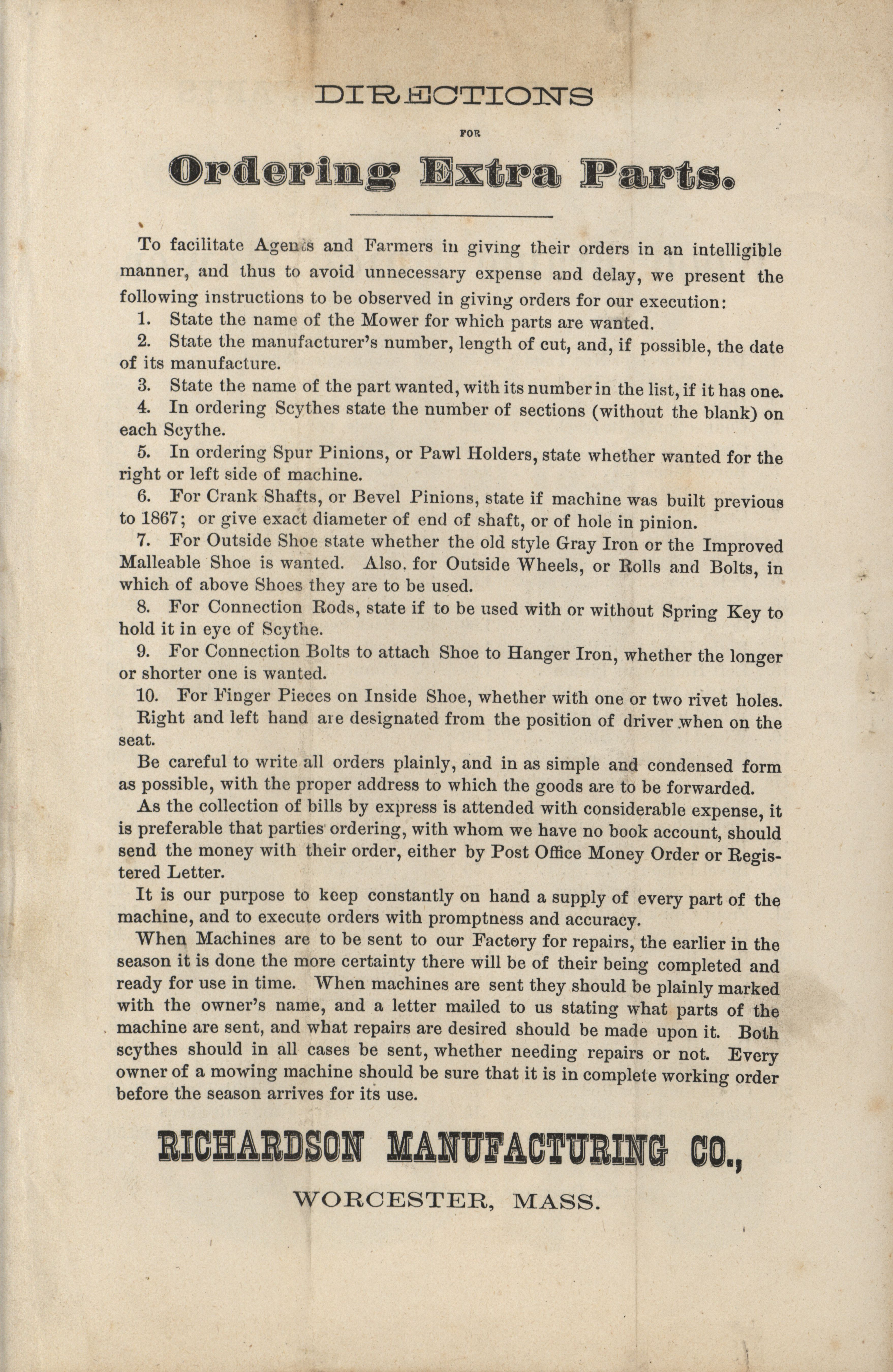 - "Richardson Manufacturing Company price list of extra parts", Agricultural Machinery Literature Collection, Iowa State University Library Digital Collections