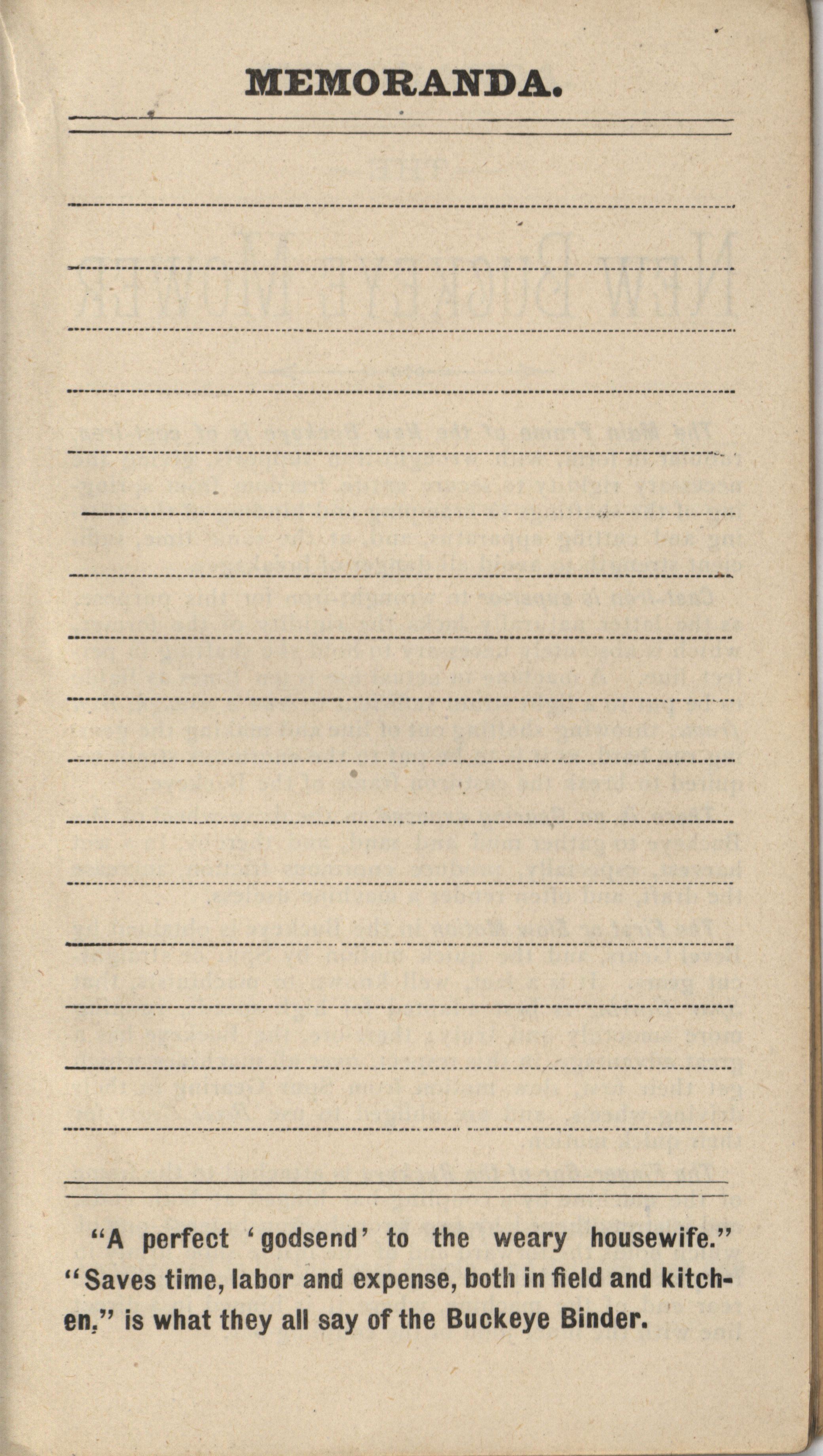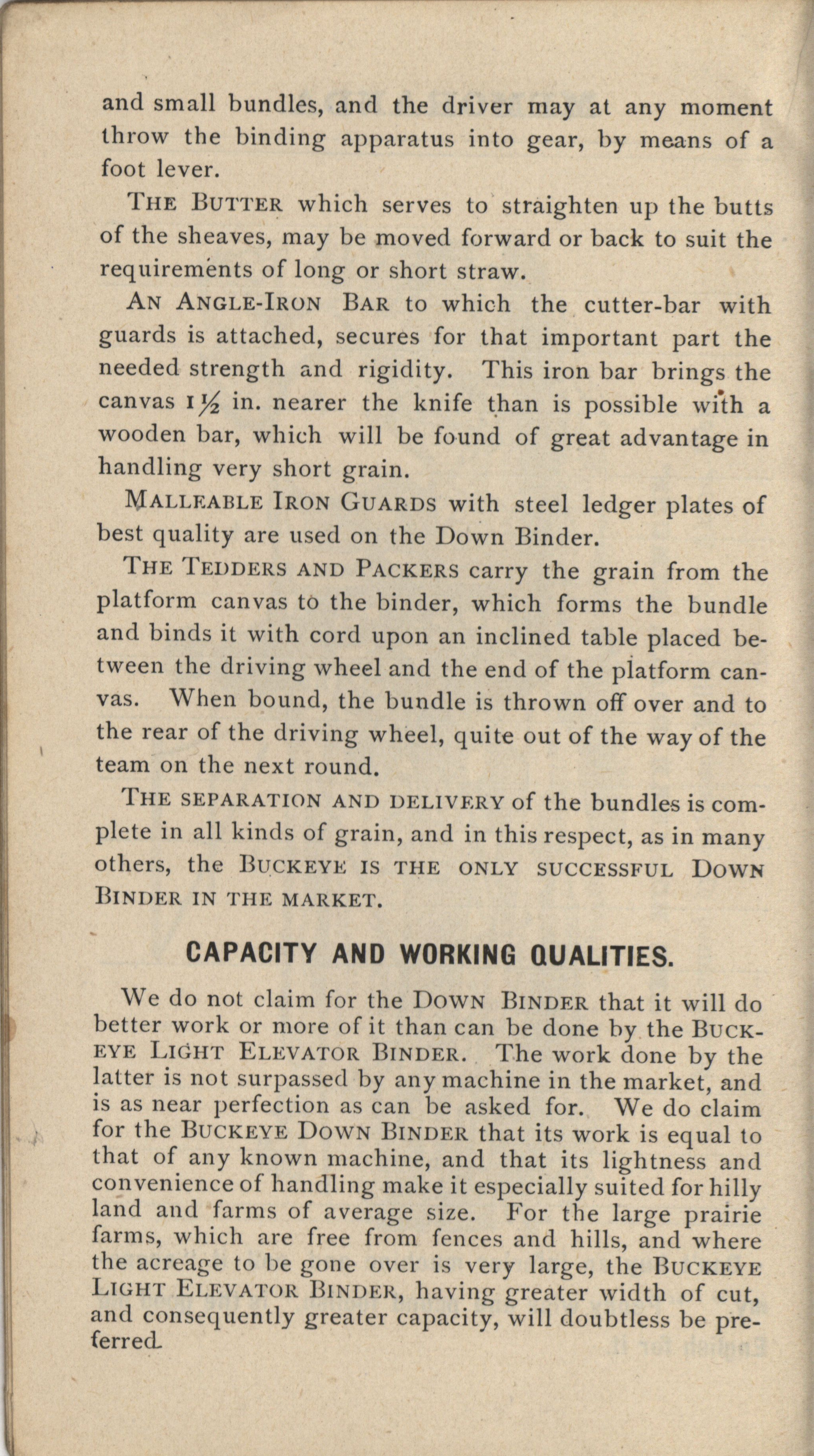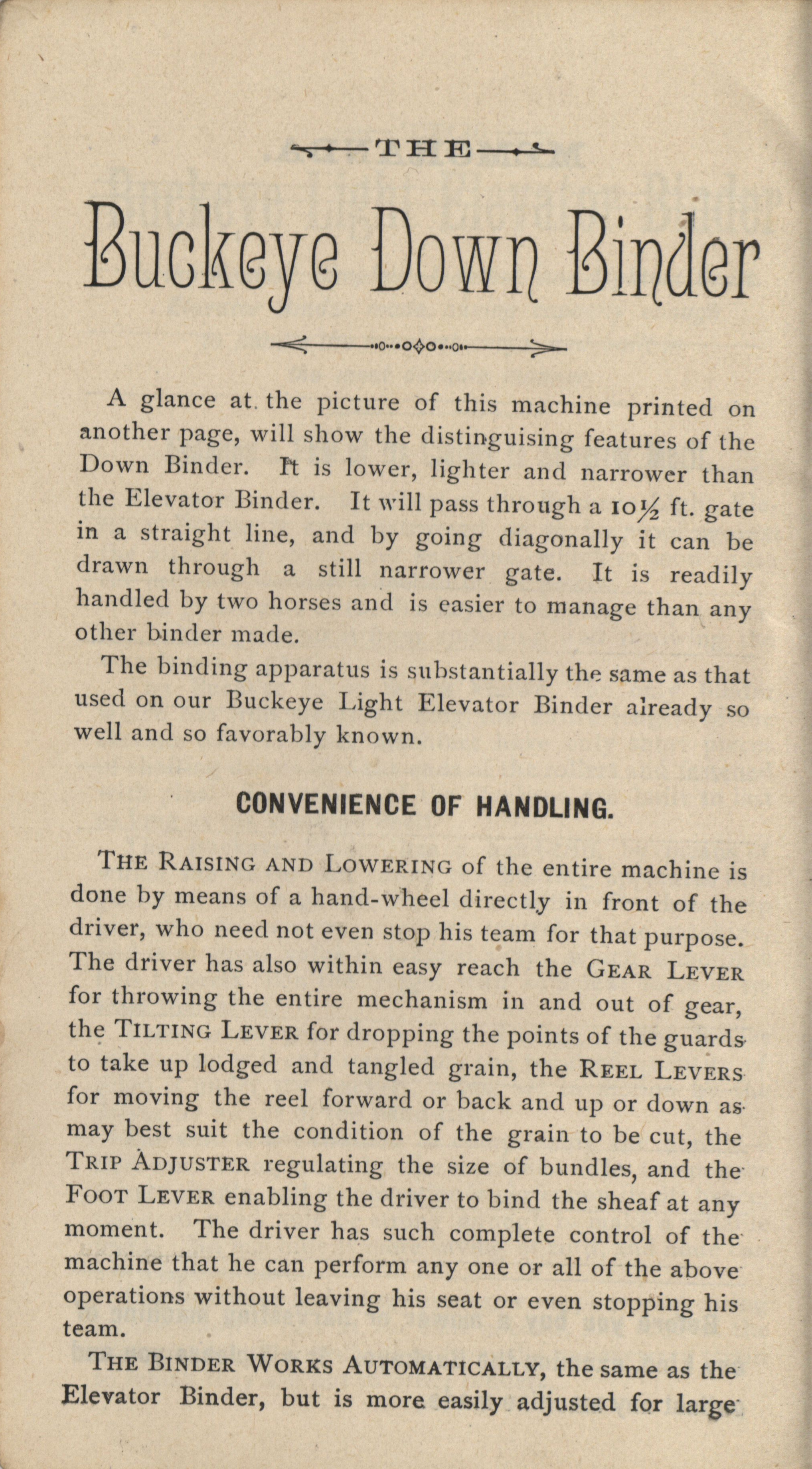 - Catalog for the Buckeye Down Binder and associated products from the Aultman, Miller and Company, includes illustrations.