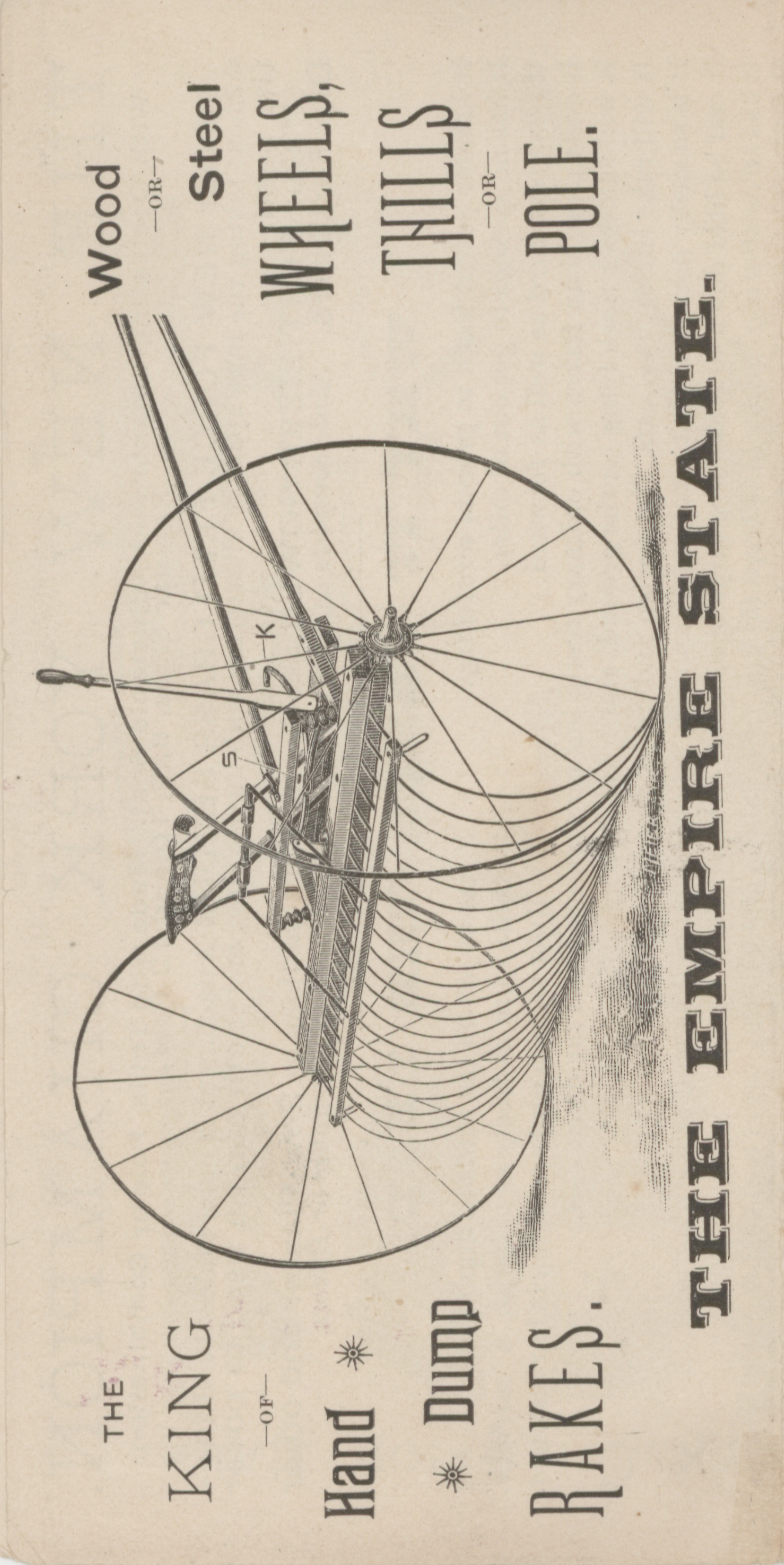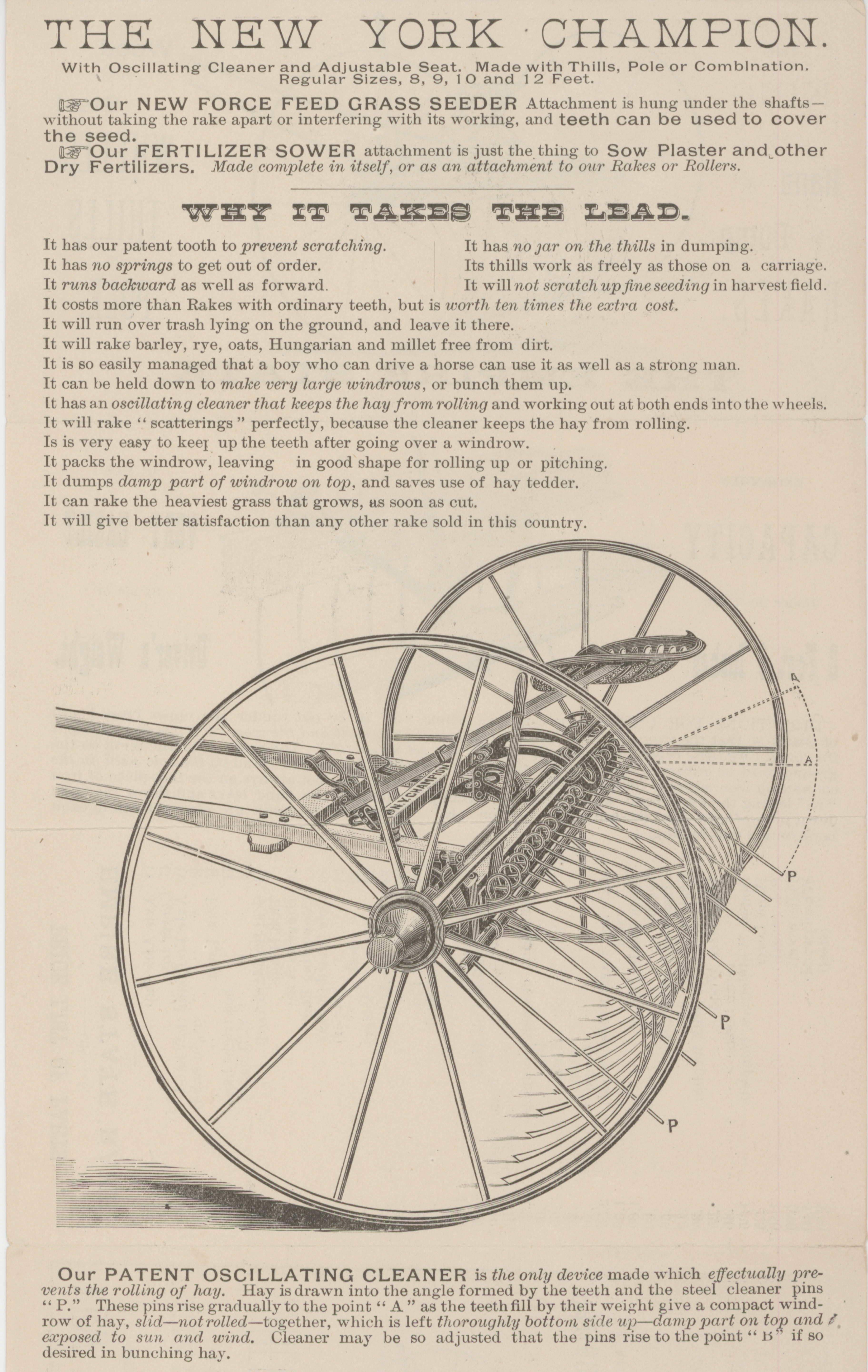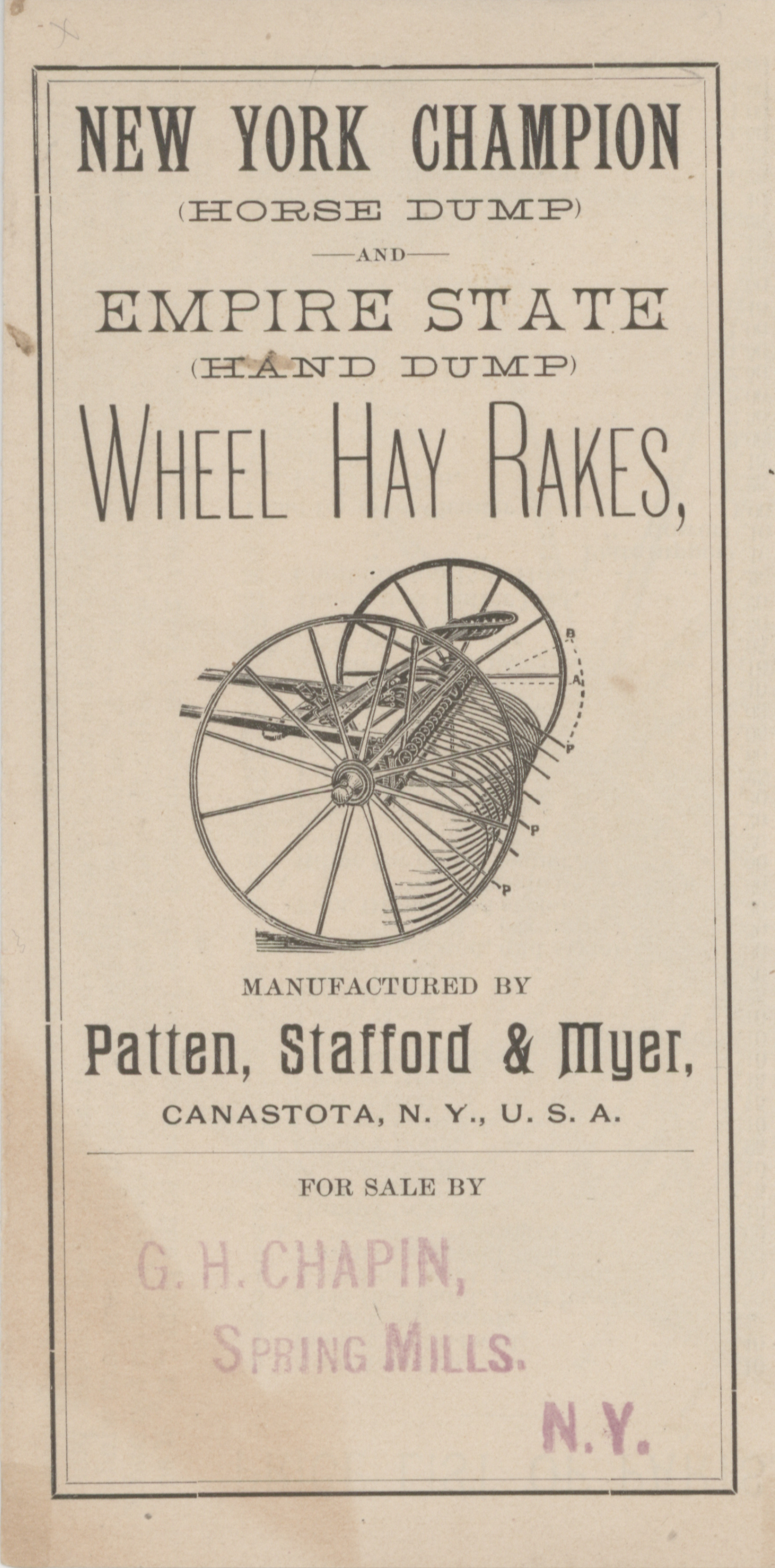 - Illustrated catalog describing the New York Champion horse dump, Empire State hand dump and wheel hay rakes offered by the Patten, Stafford and Myer Manufacturers.