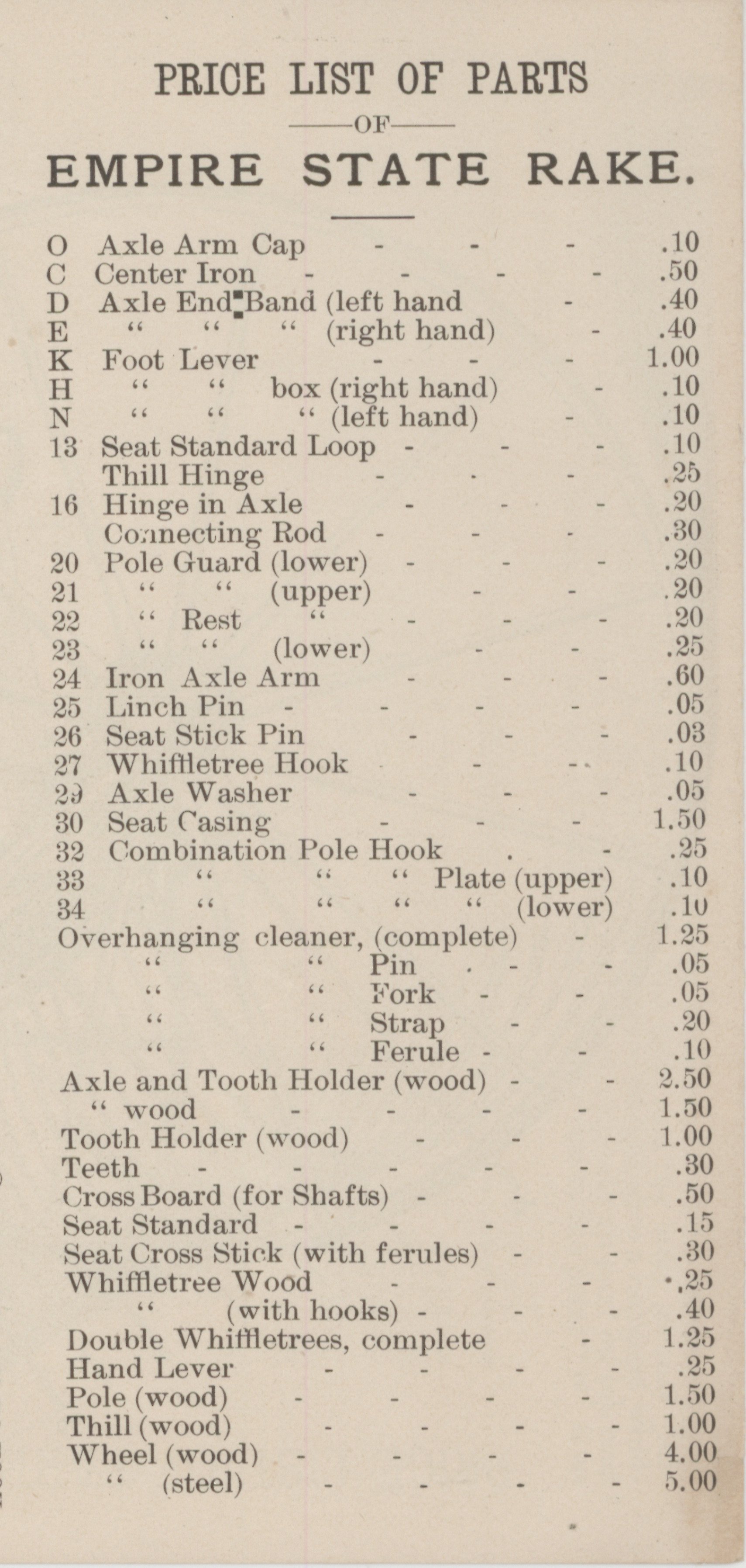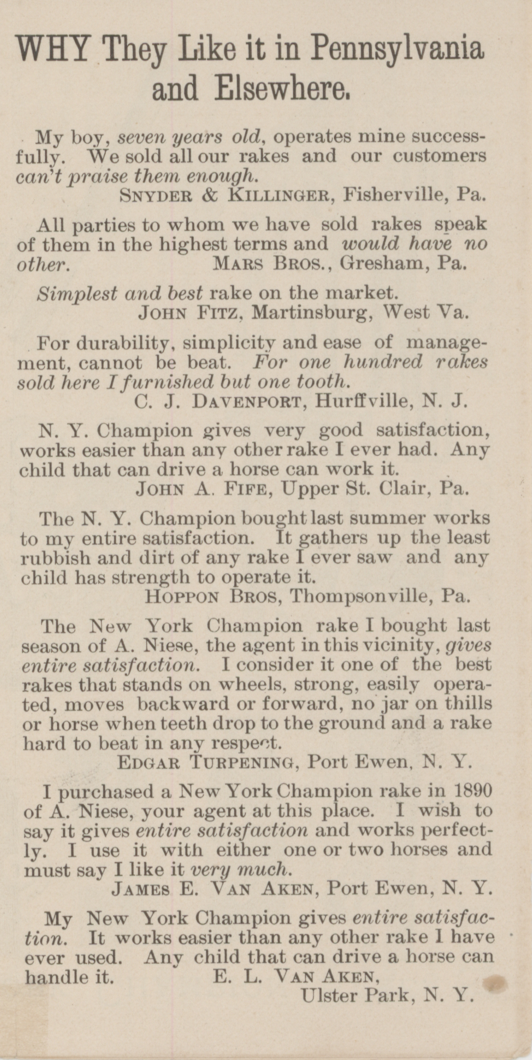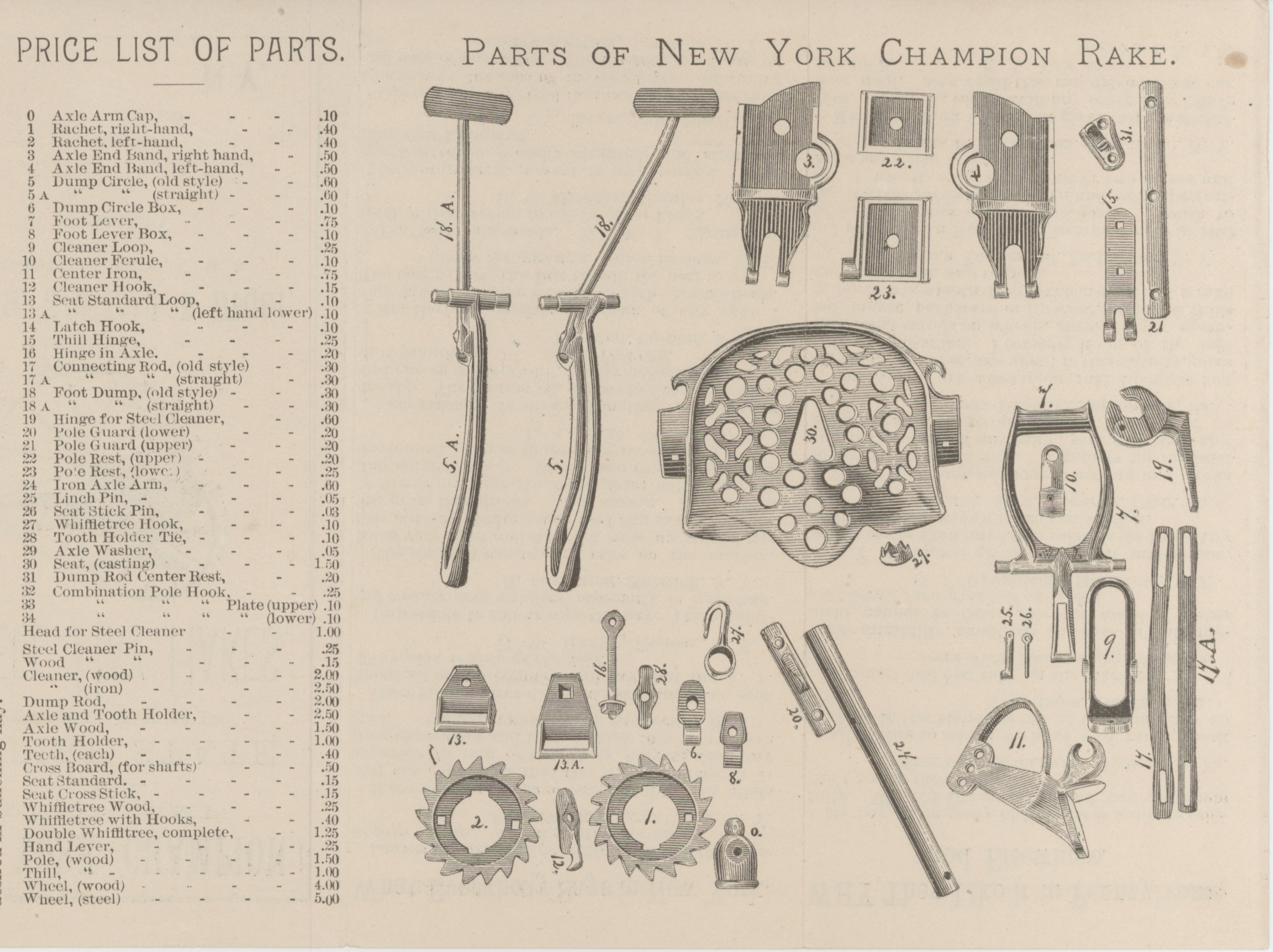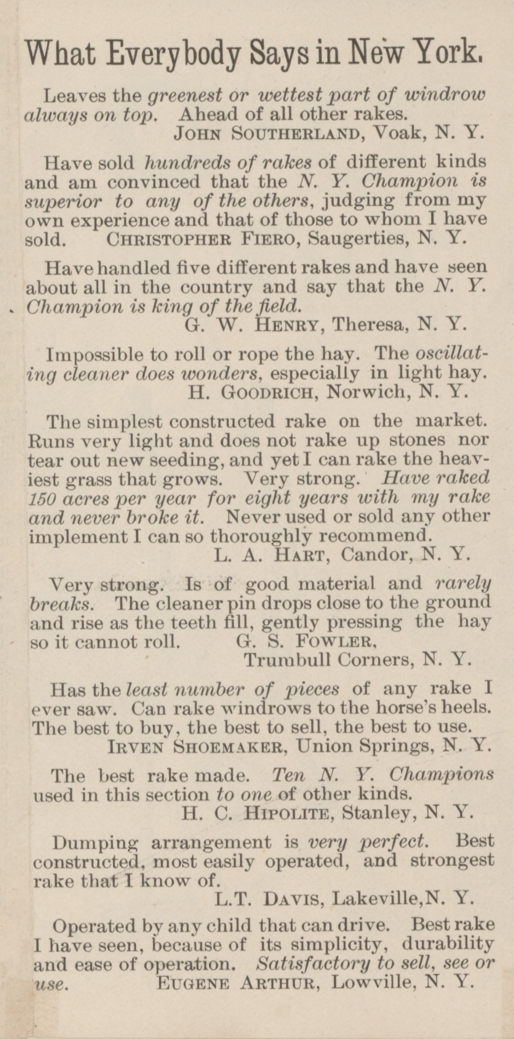 - Illustrated catalog describing the New York Champion horse dump, Empire State hand dump and wheel hay rakes offered by the Patten, Stafford and Myer Manufacturers.