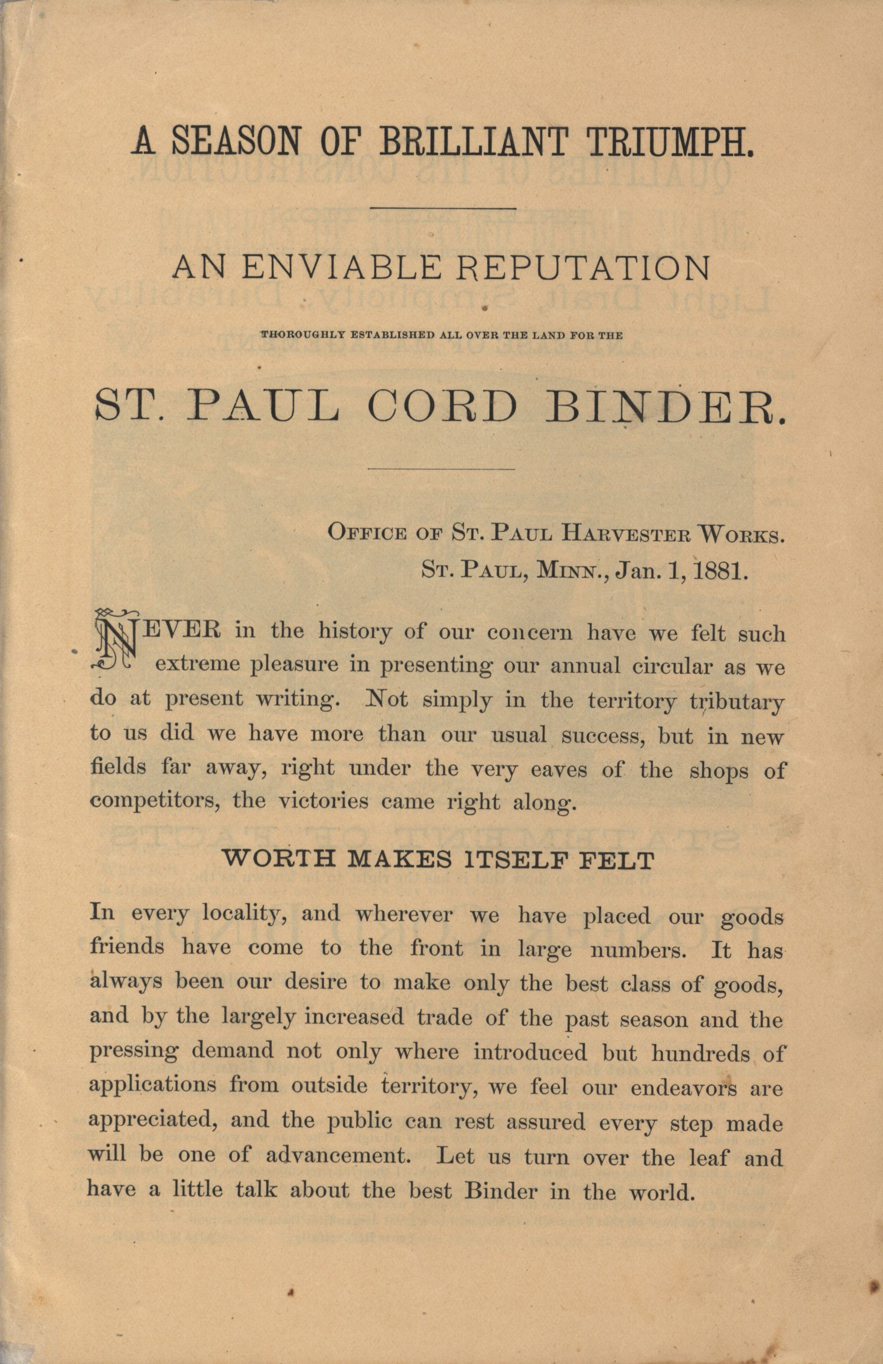 - Illustrated catalog describing the agricultural implements offered by the Saint Paul Harvester Works.
