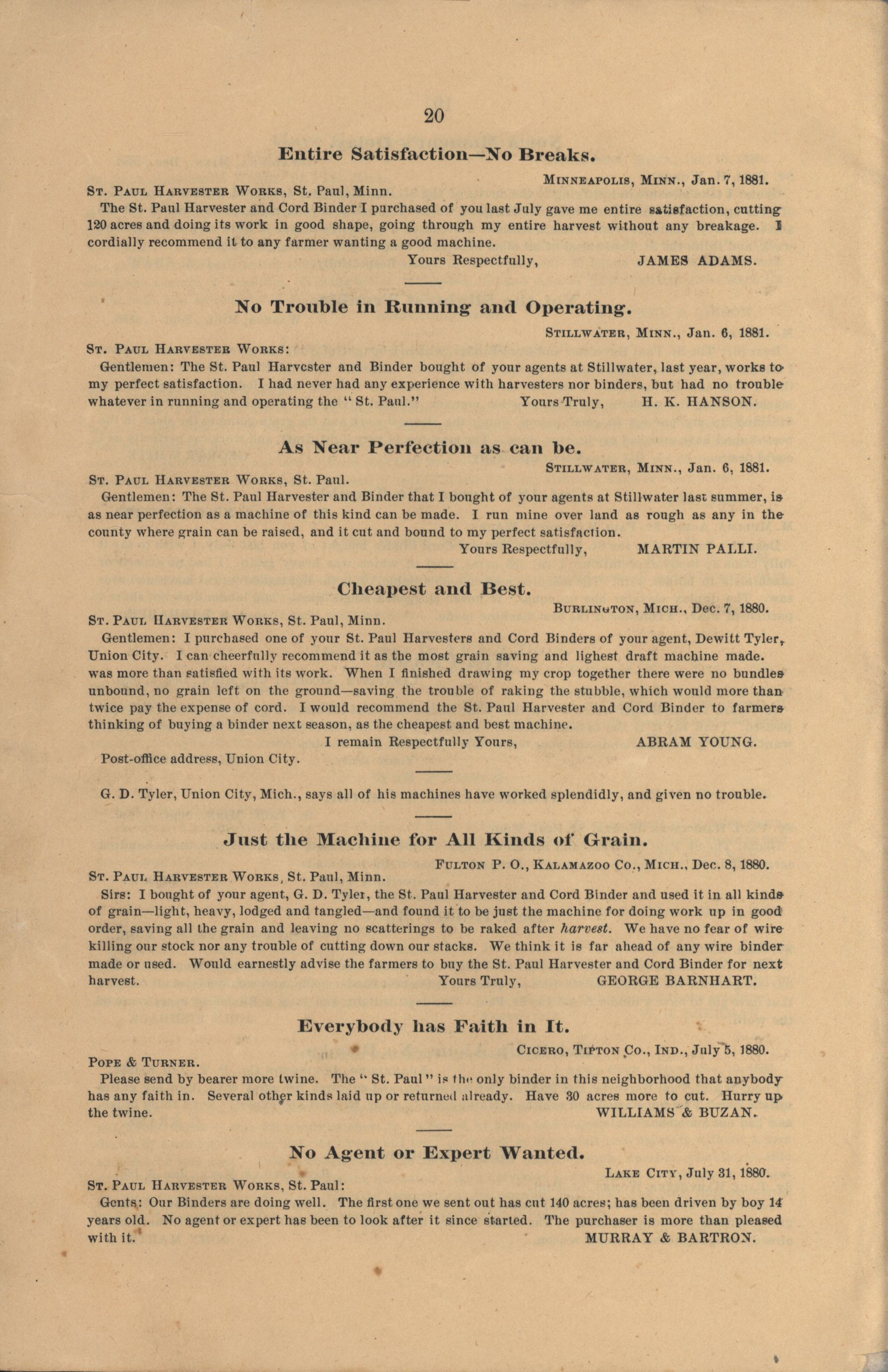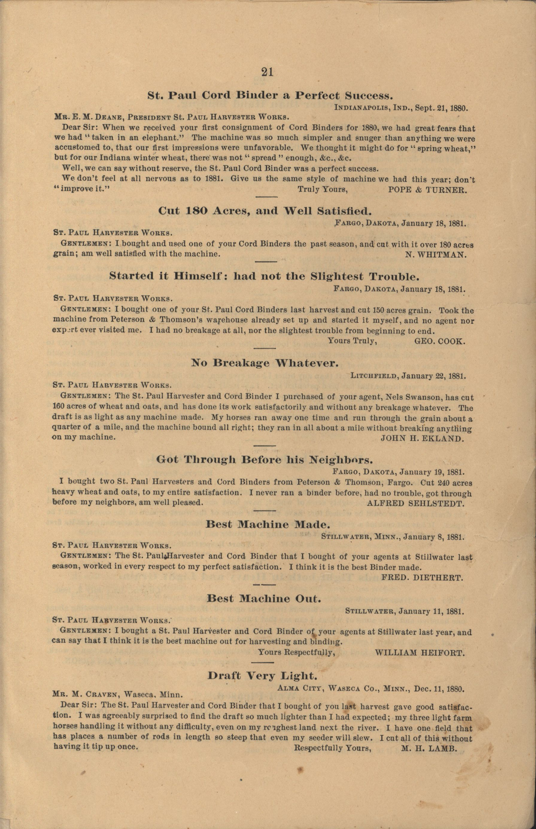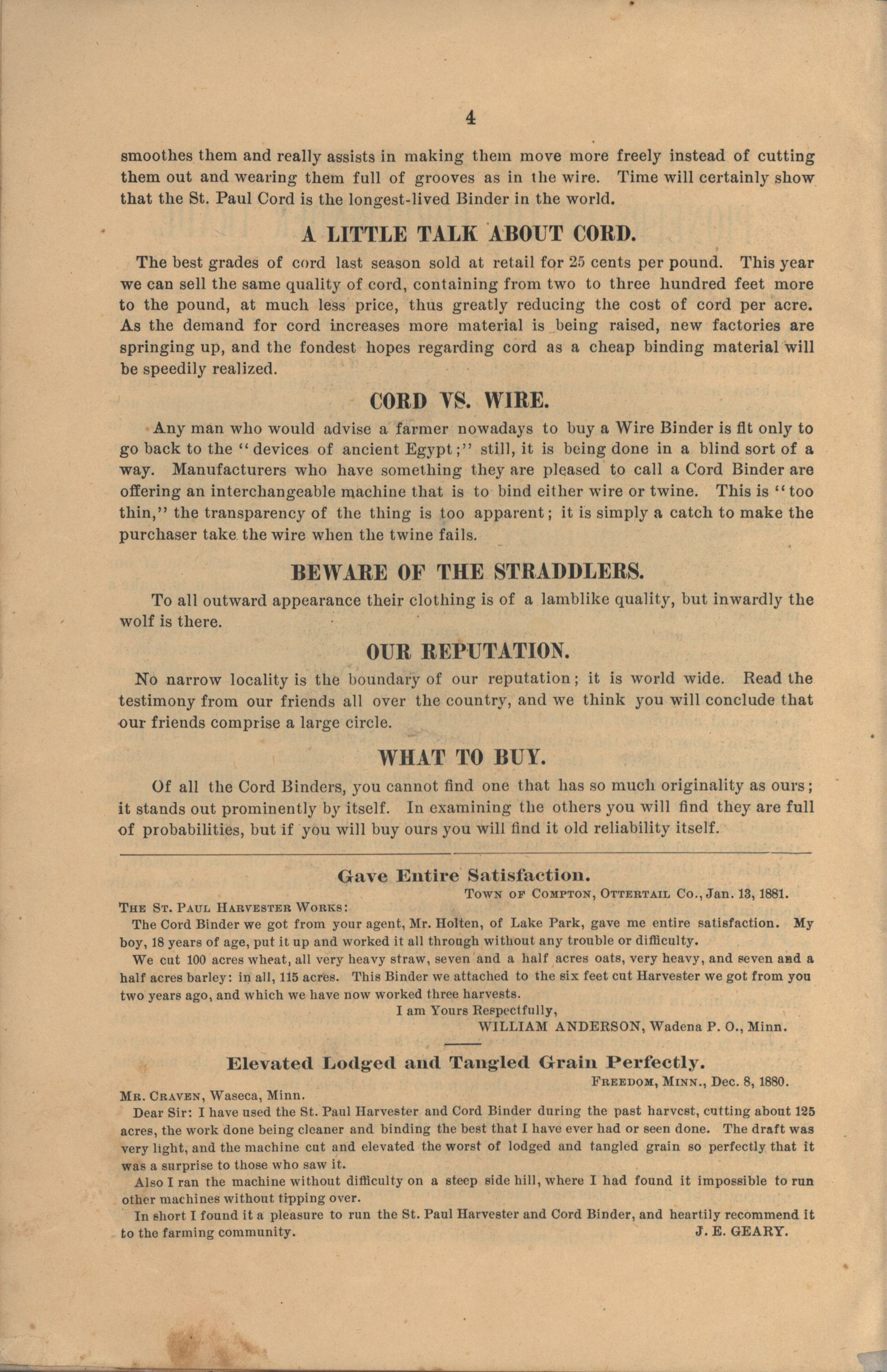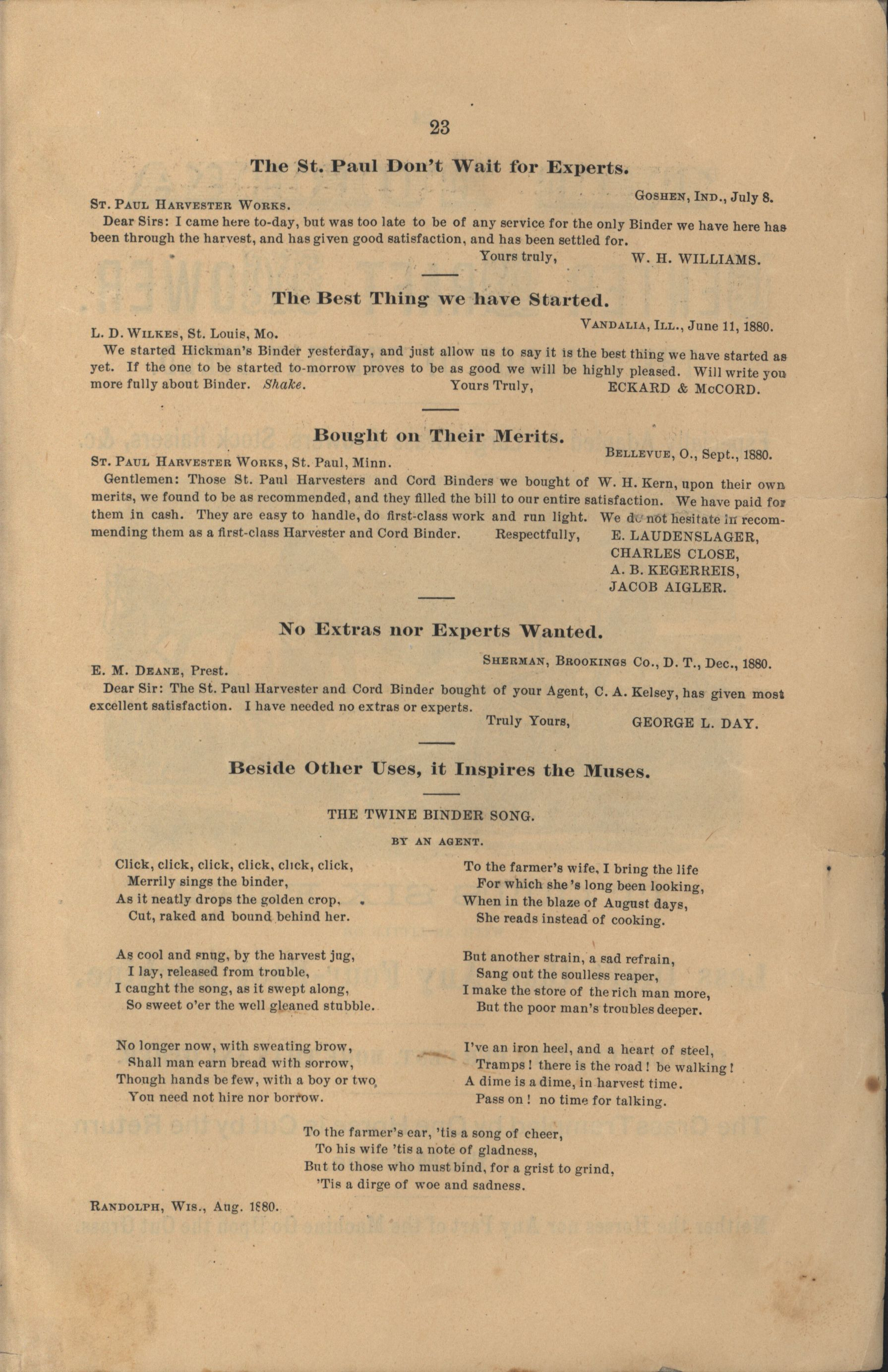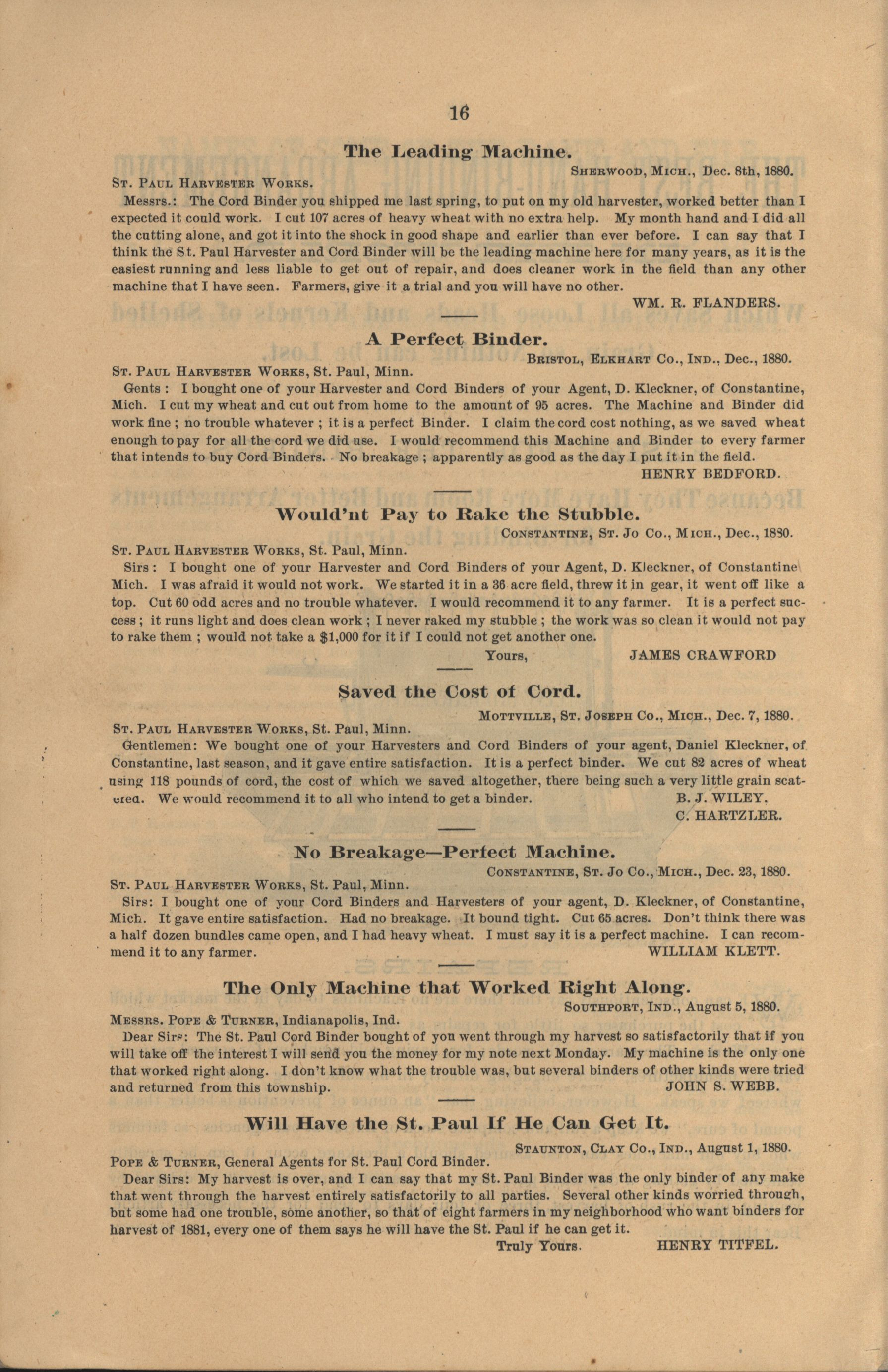 - "The Saint Paul Harvester and Cord Binder catalog", Agricultural Machinery Literature Collection, Iowa State University Library Digital Collections