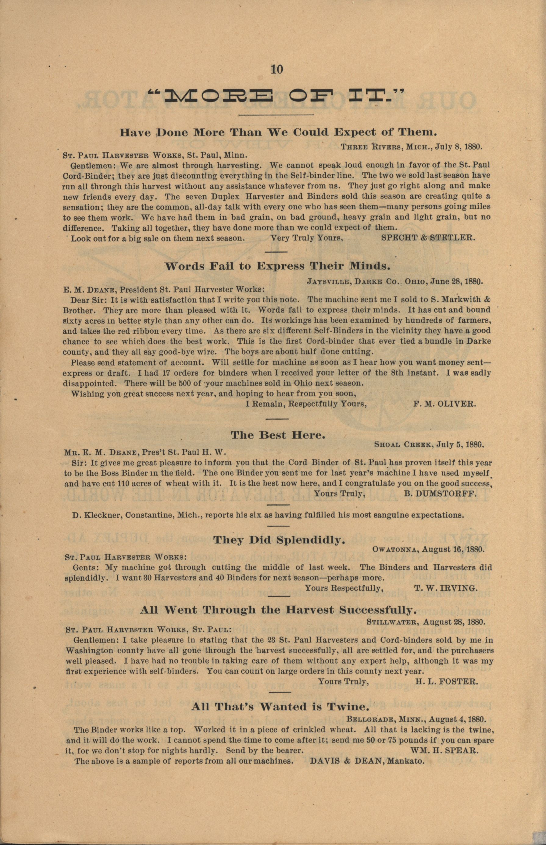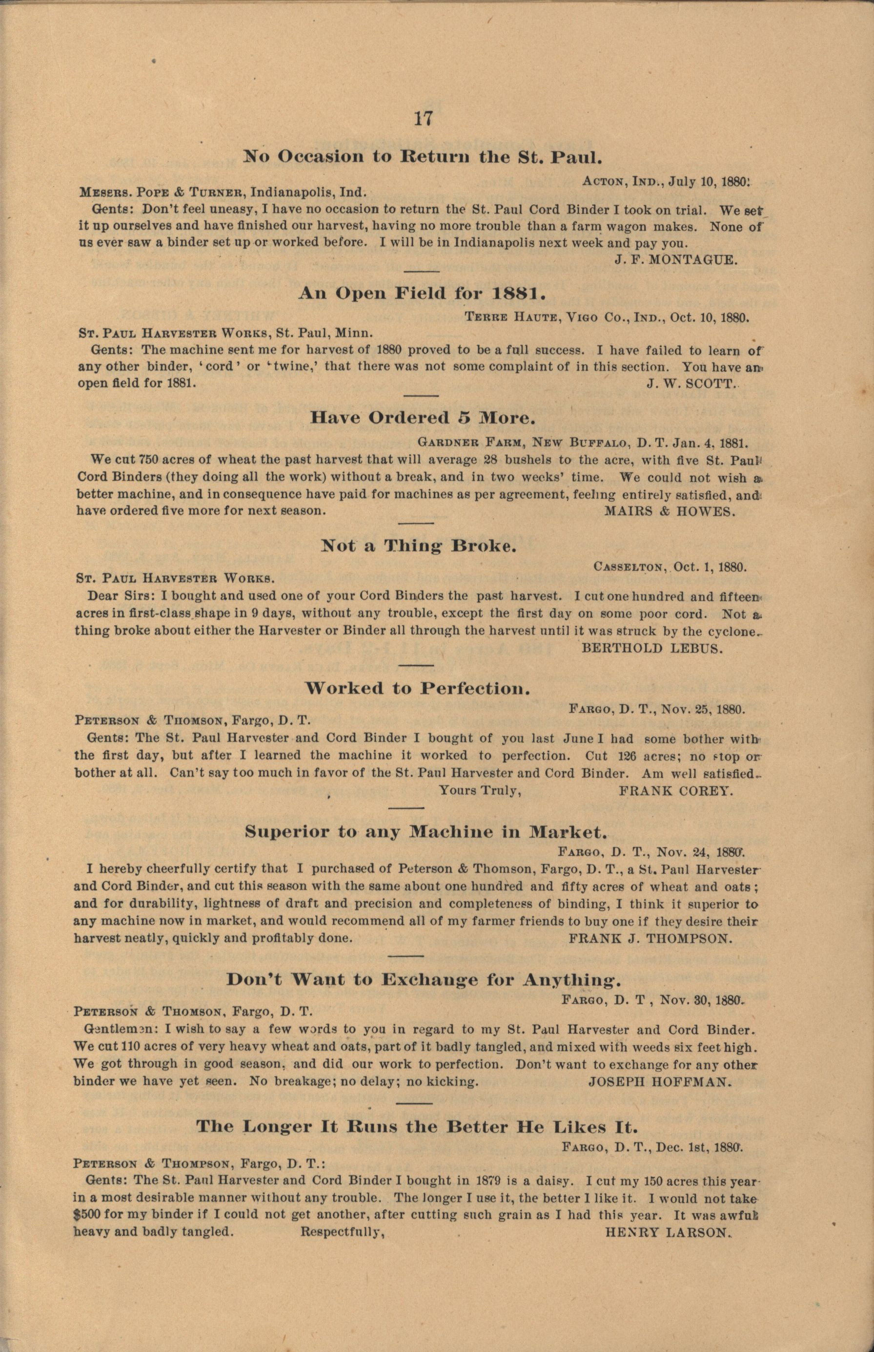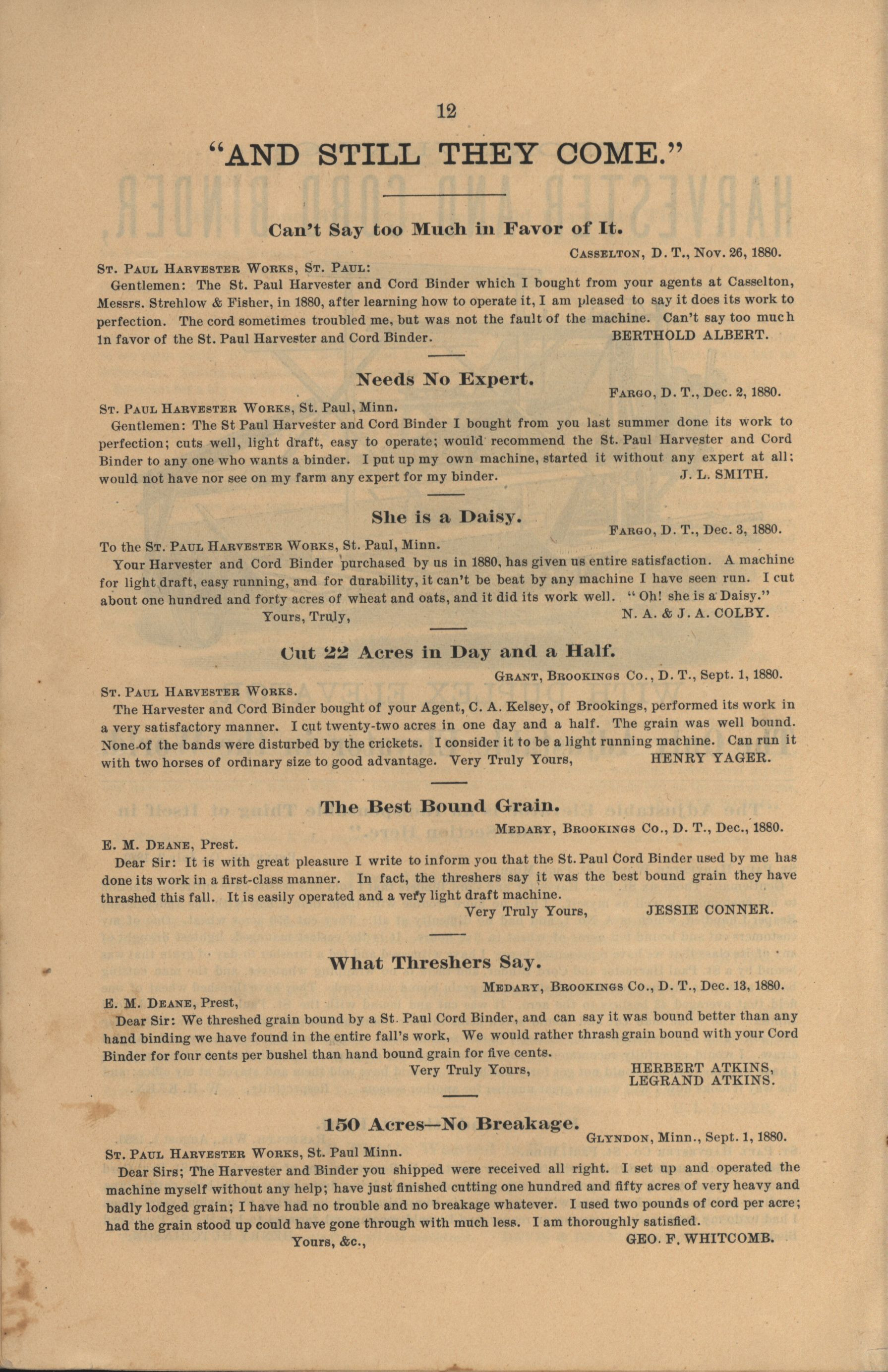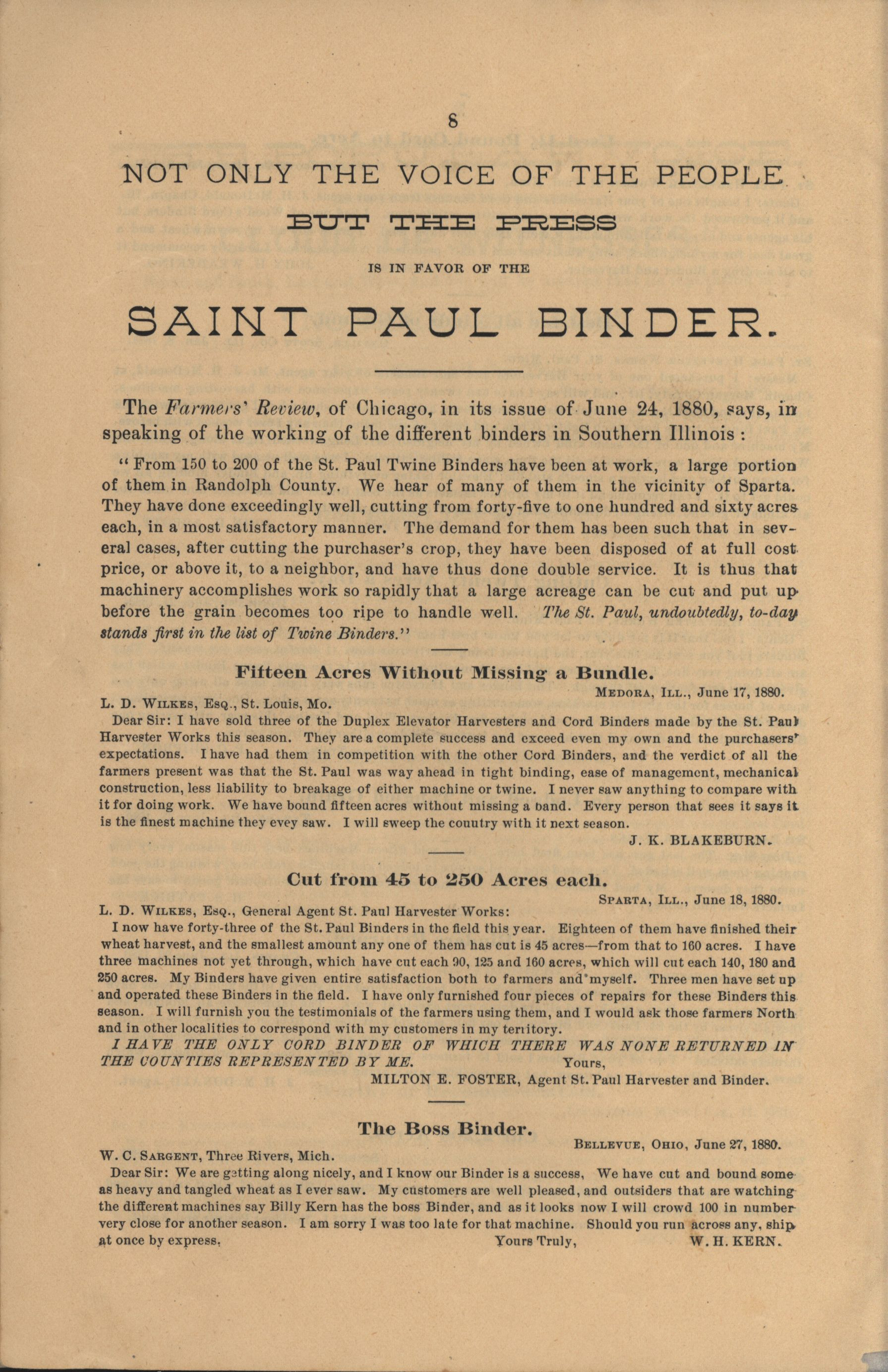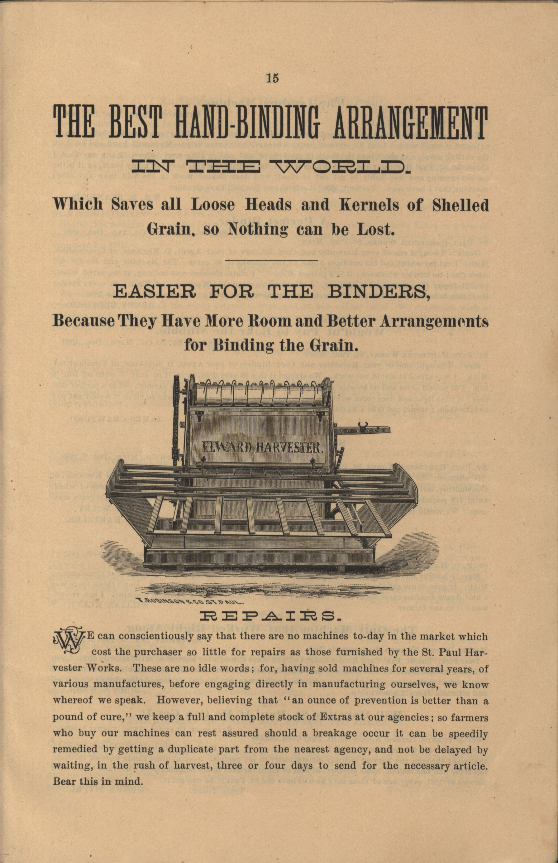 - "The Saint Paul Harvester and Cord Binder catalog", Agricultural Machinery Literature Collection, Iowa State University Library Digital Collections