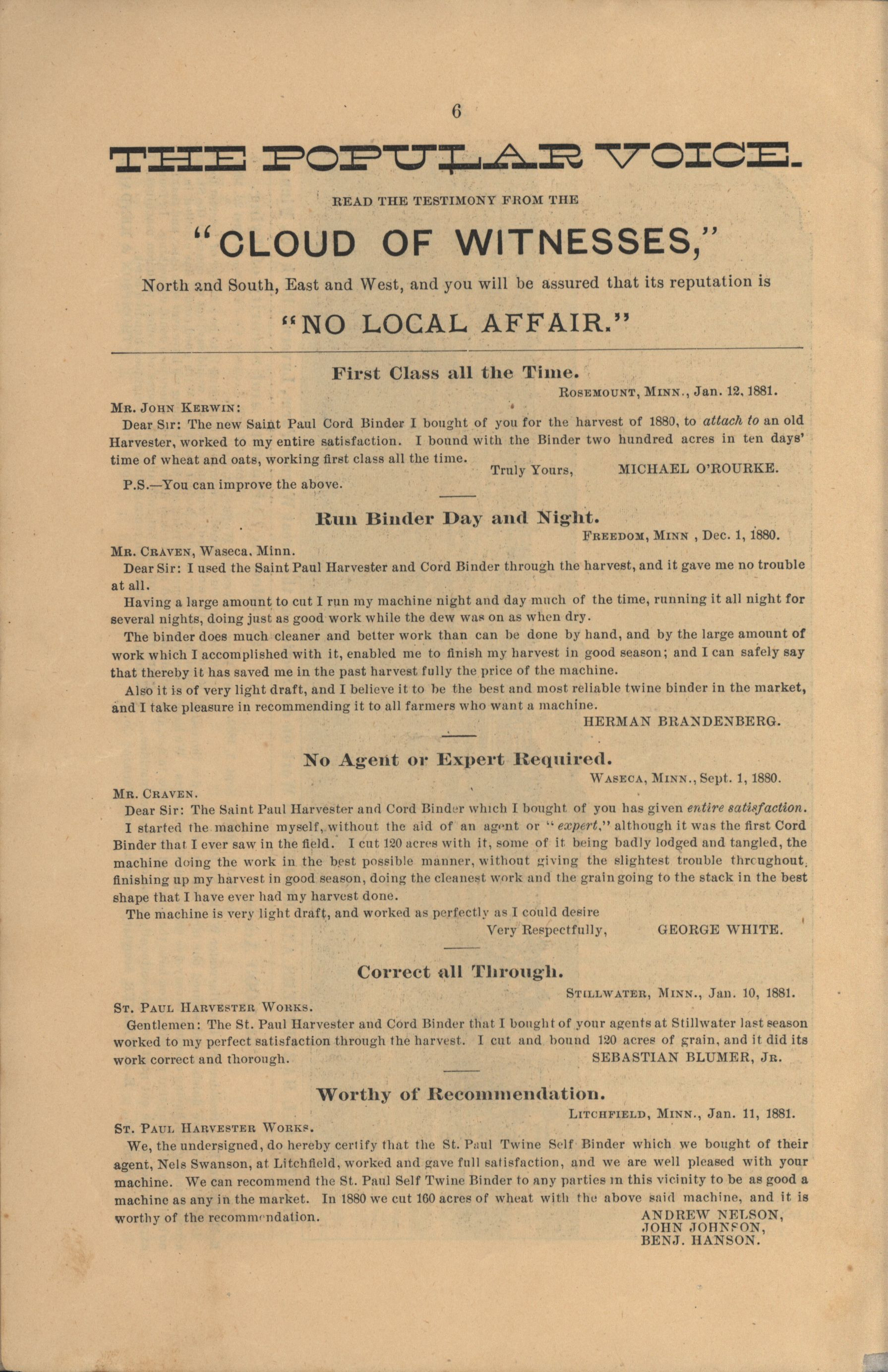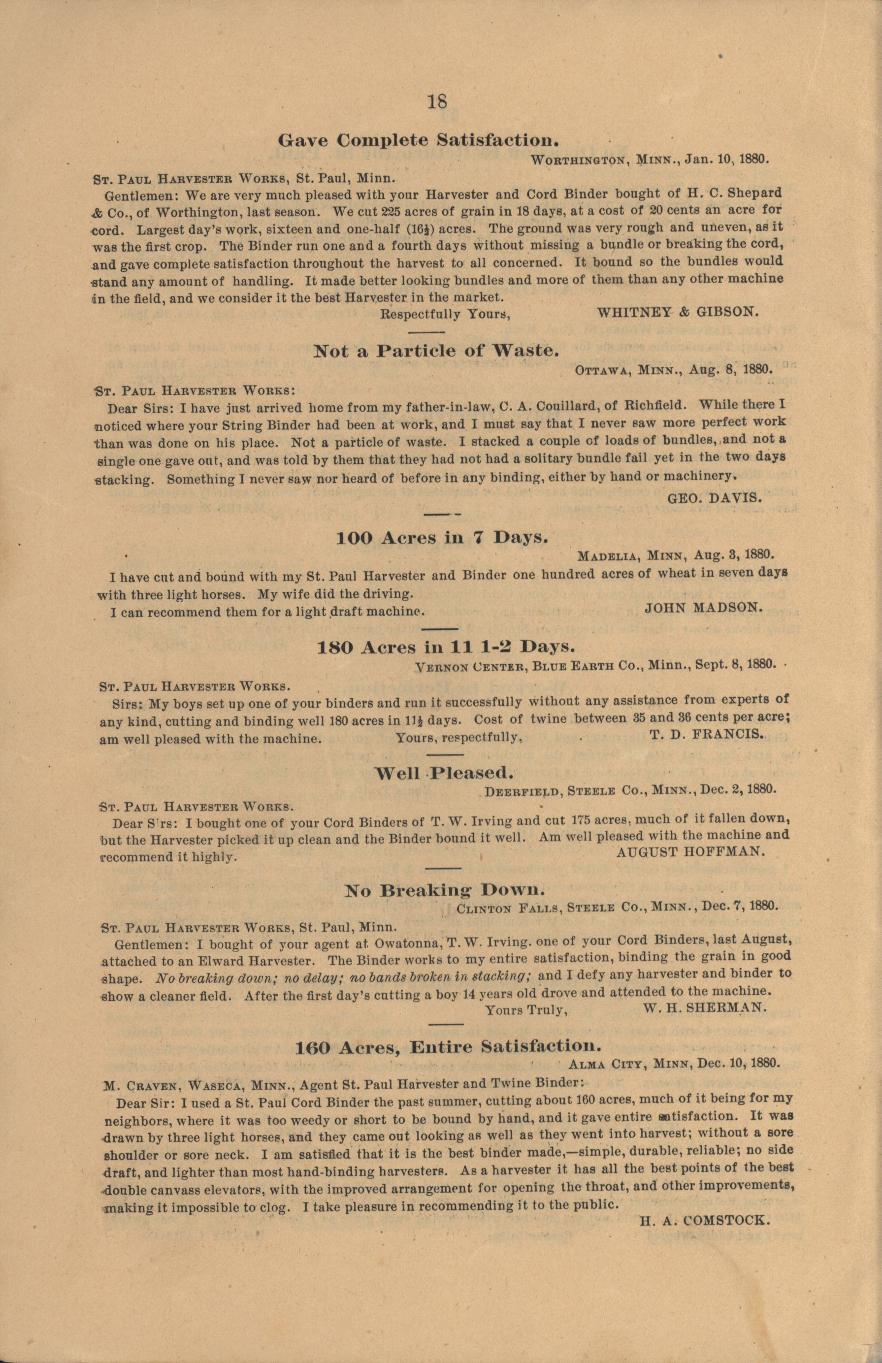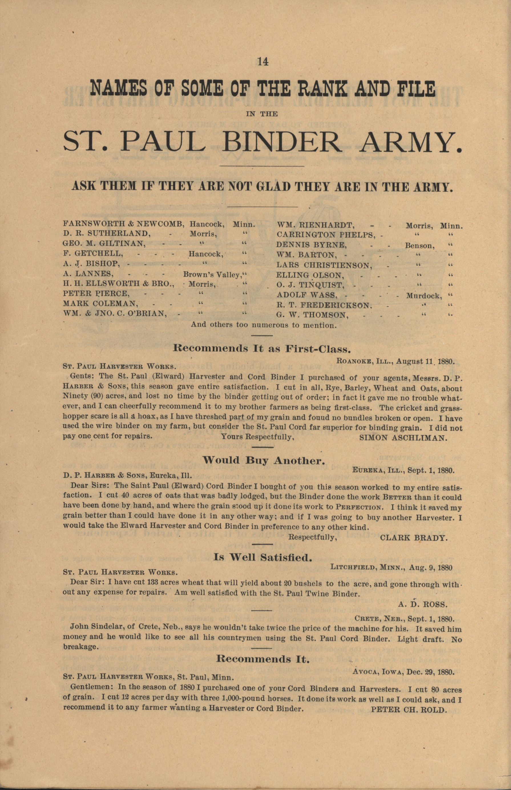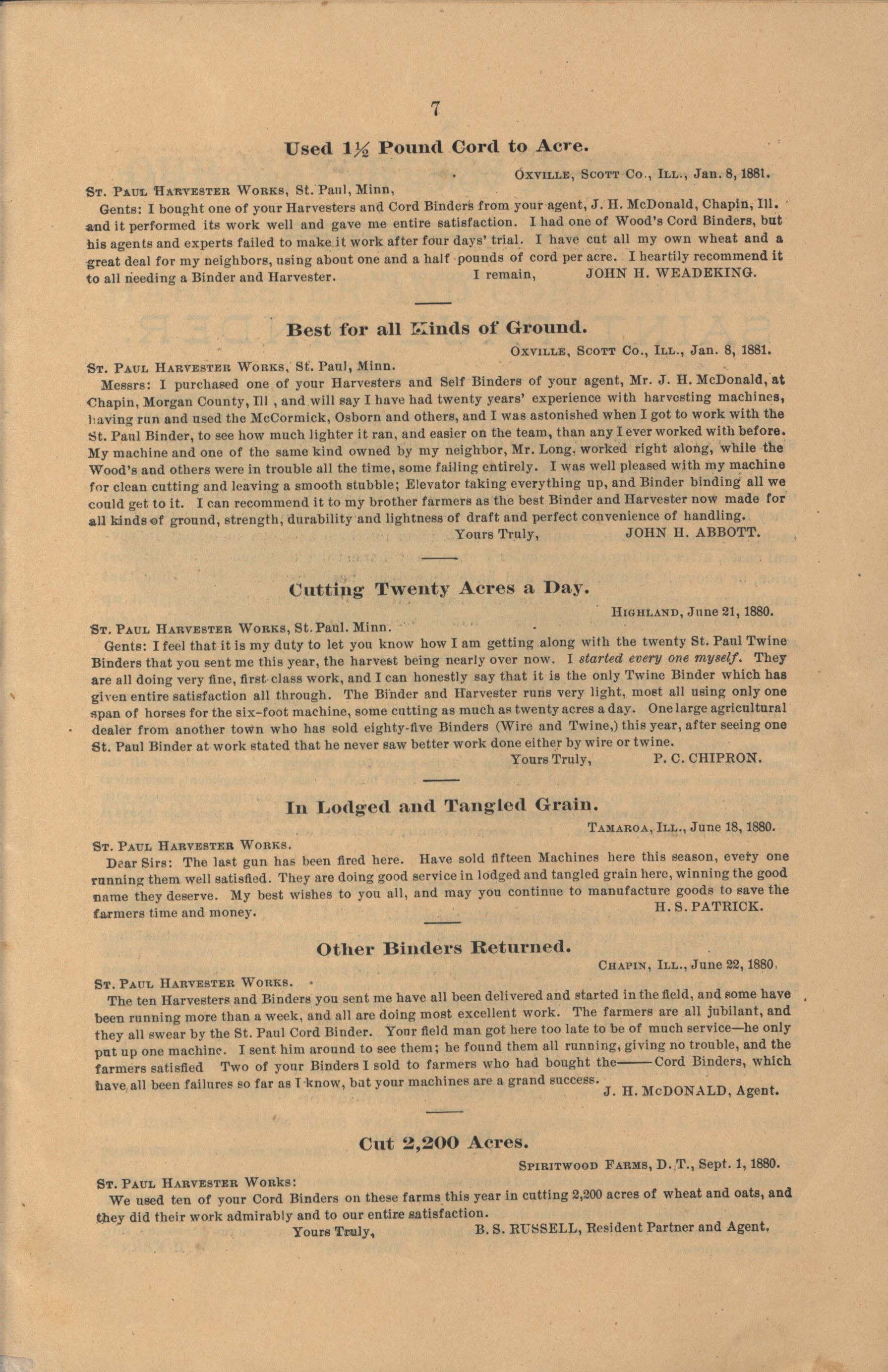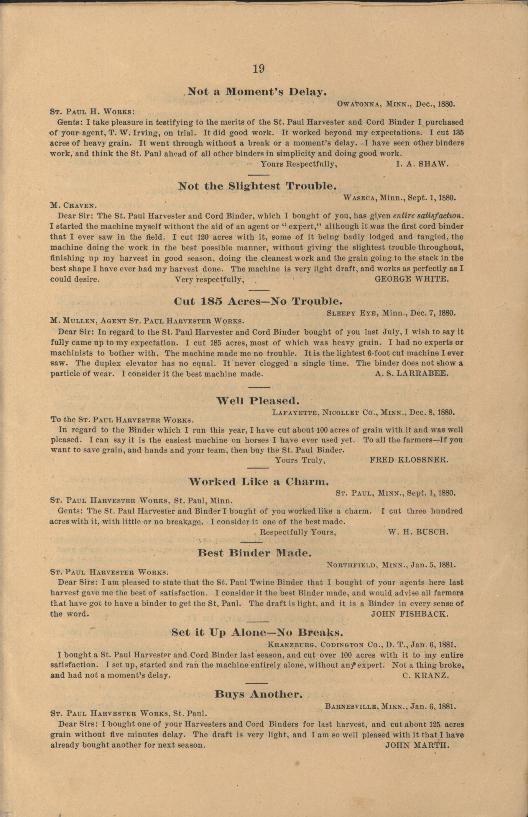- "The Saint Paul Harvester and Cord Binder catalog", Agricultural Machinery Literature Collection, Iowa State University Library Digital Collections