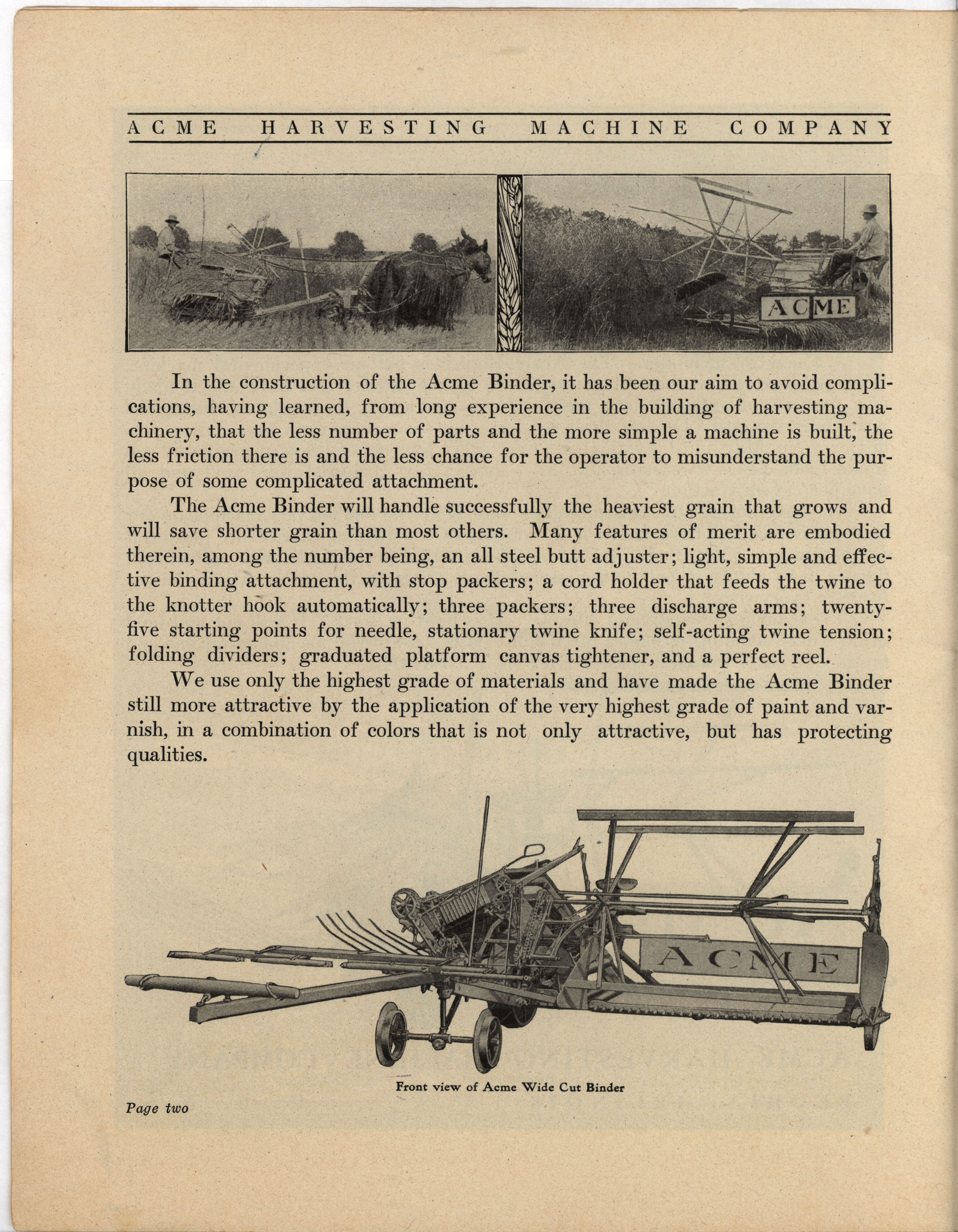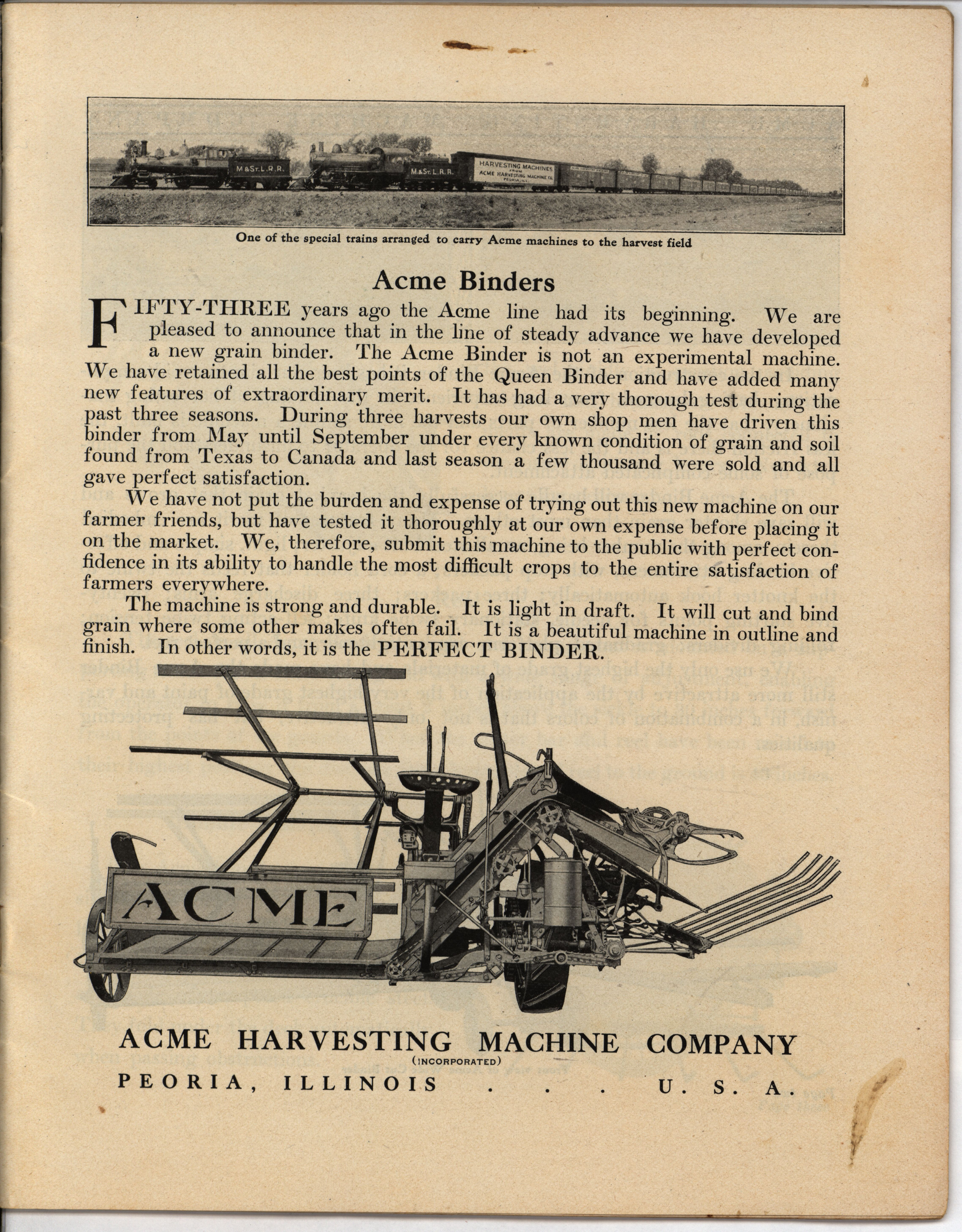 - Publication detailing the products of the Acme Harvesting Machine Company, specifically the binder and associated attachments, mowers, and rakes.