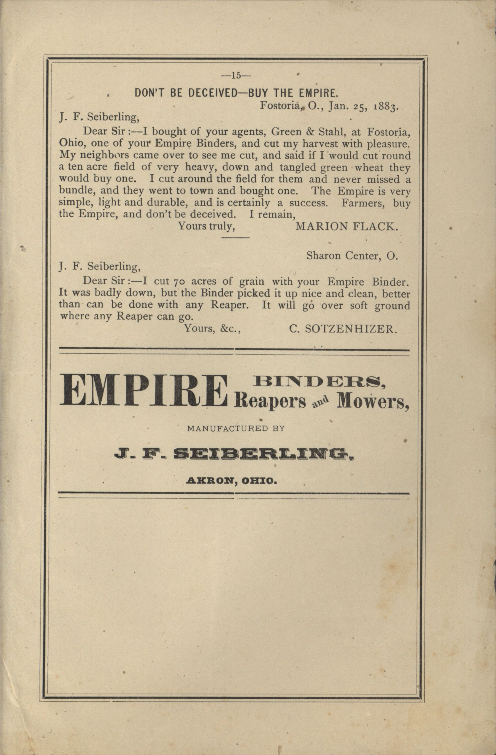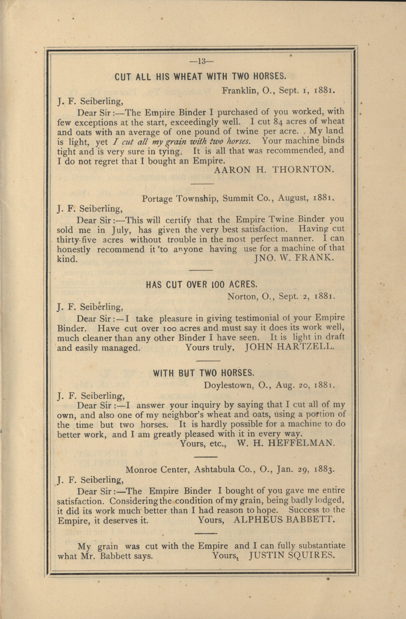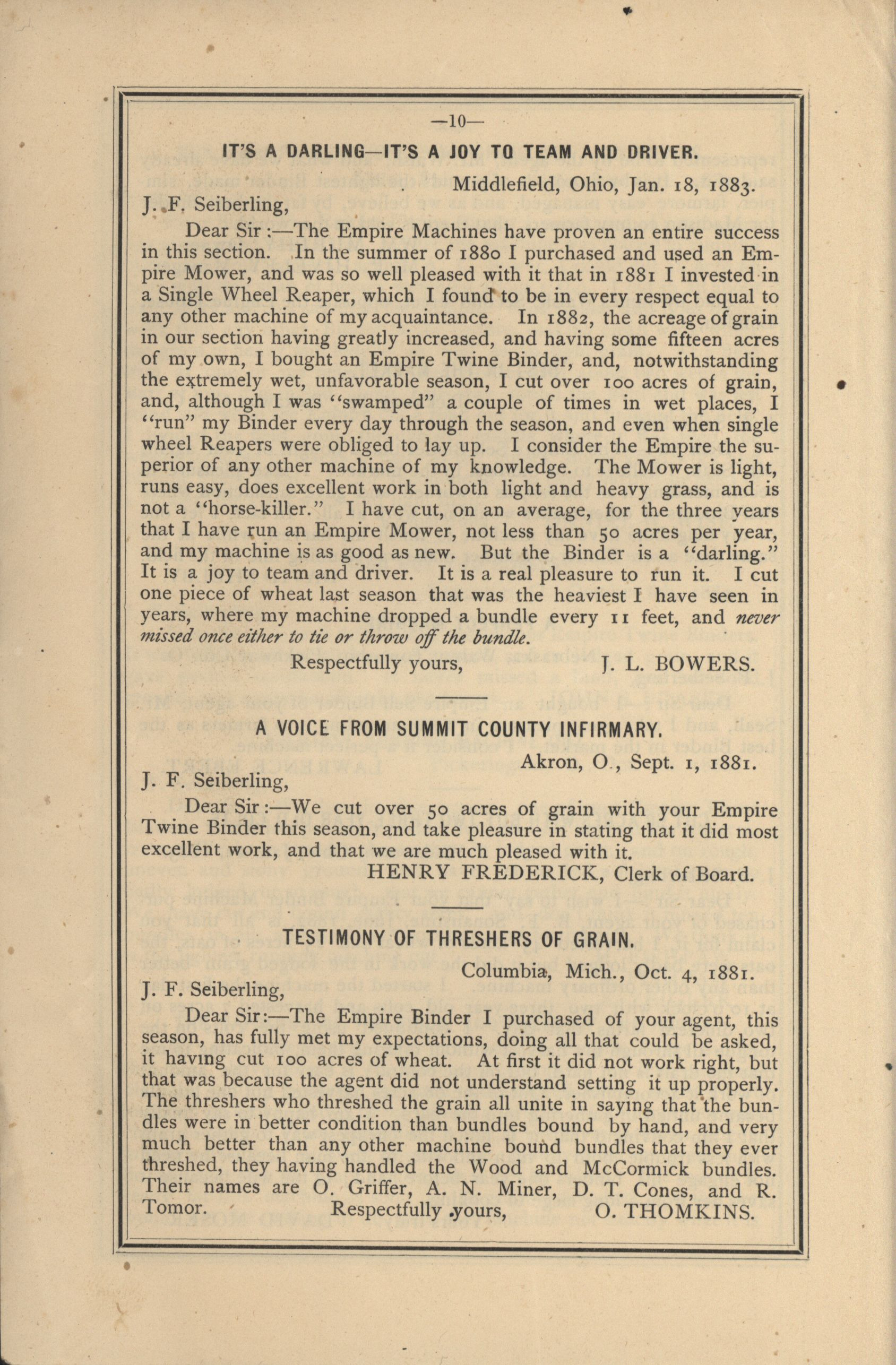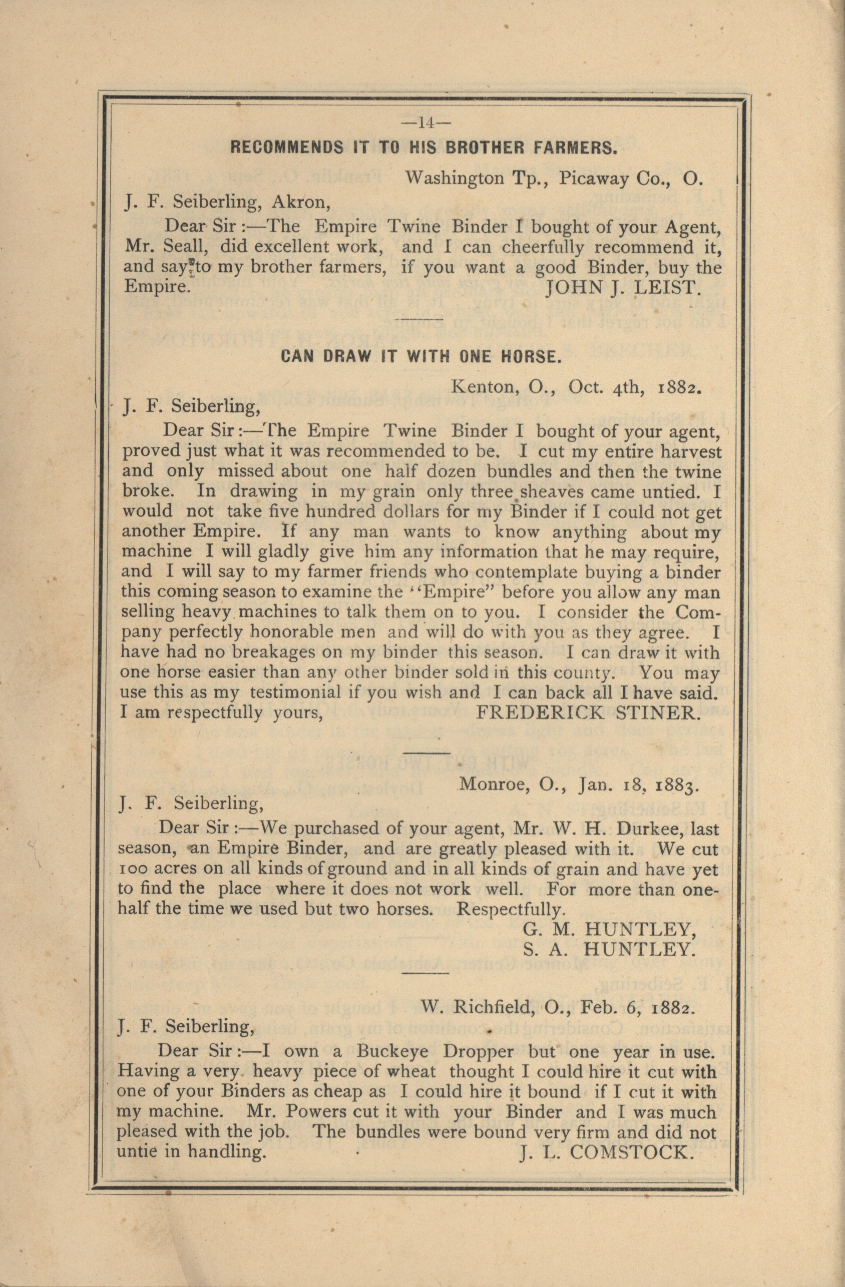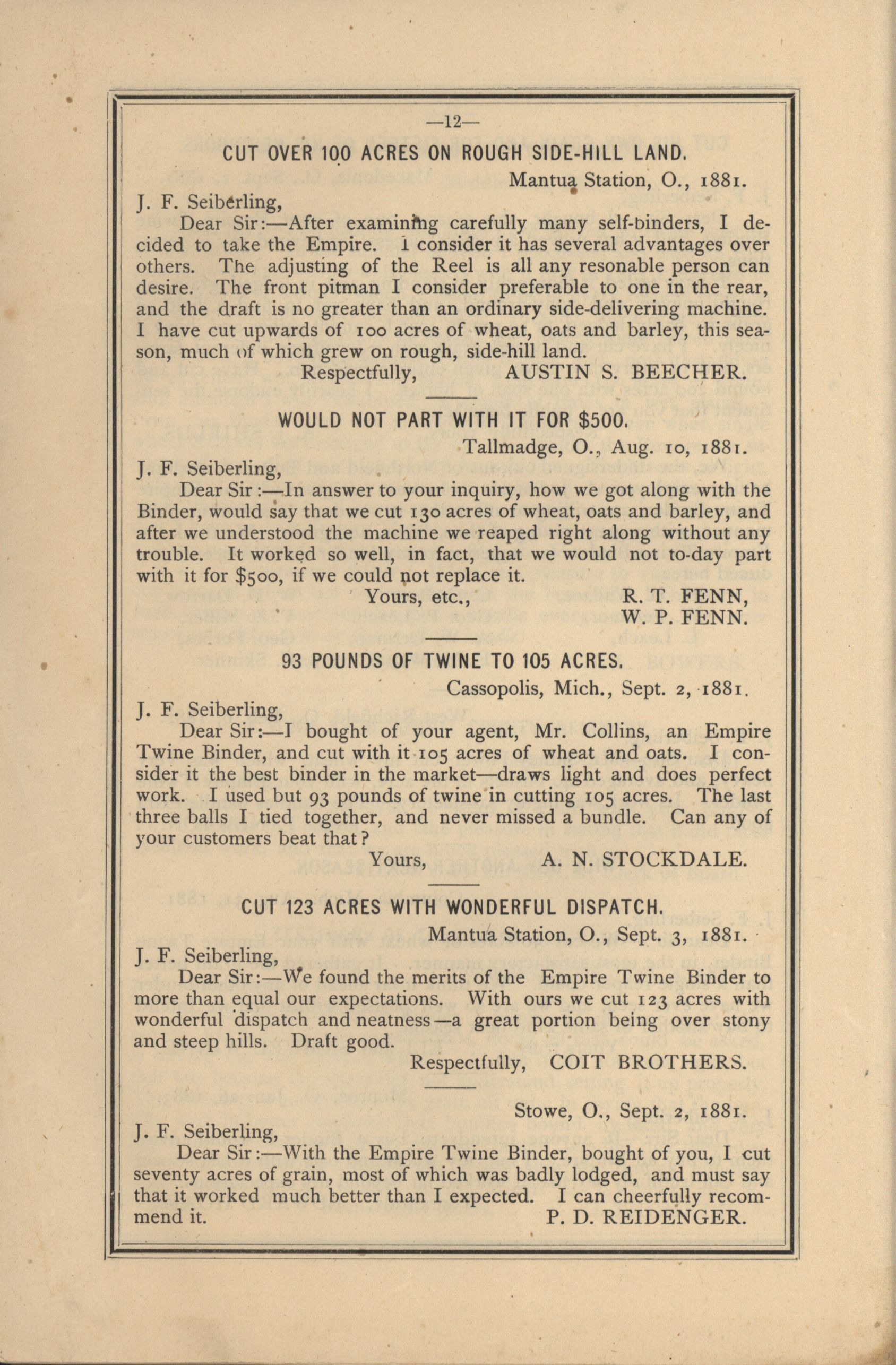 - Catalog detailing the testimonials of customers of a harvesters and binders manufactured by J.F. Seiberling Company.