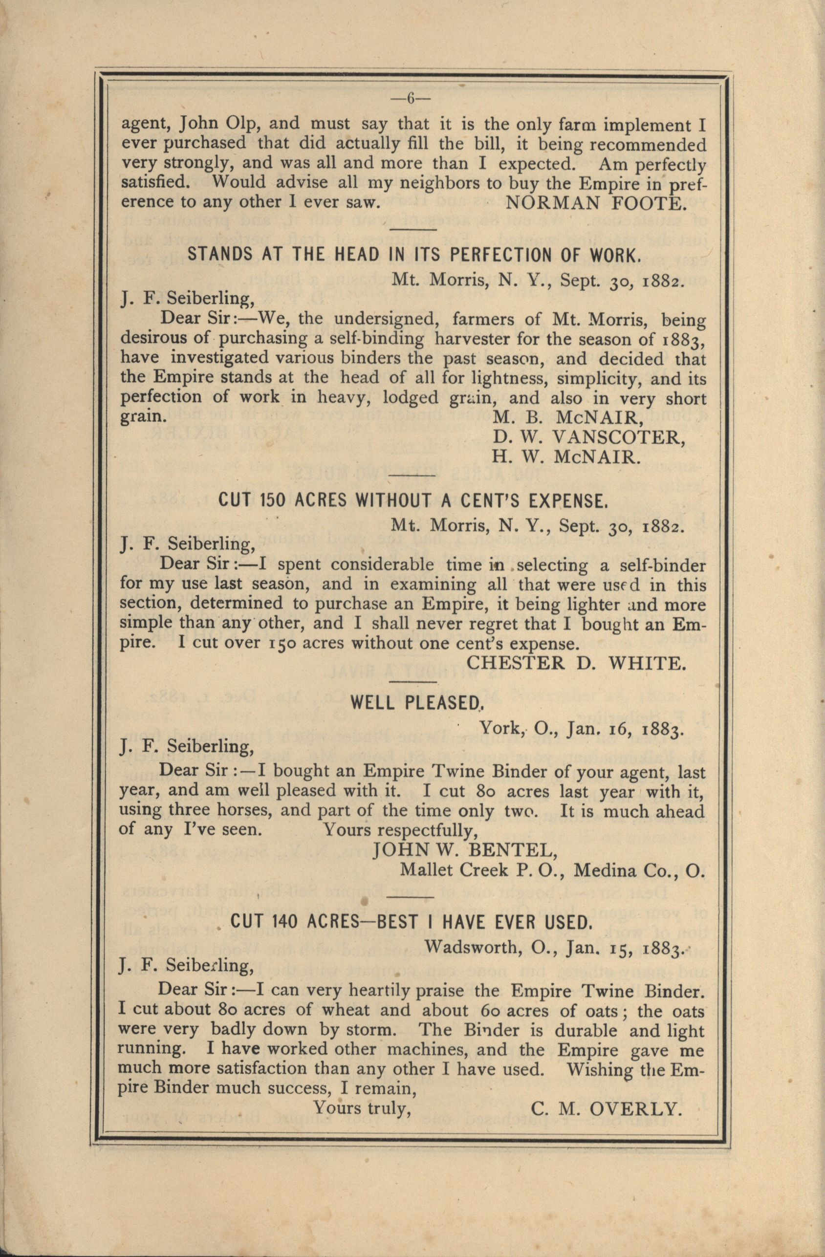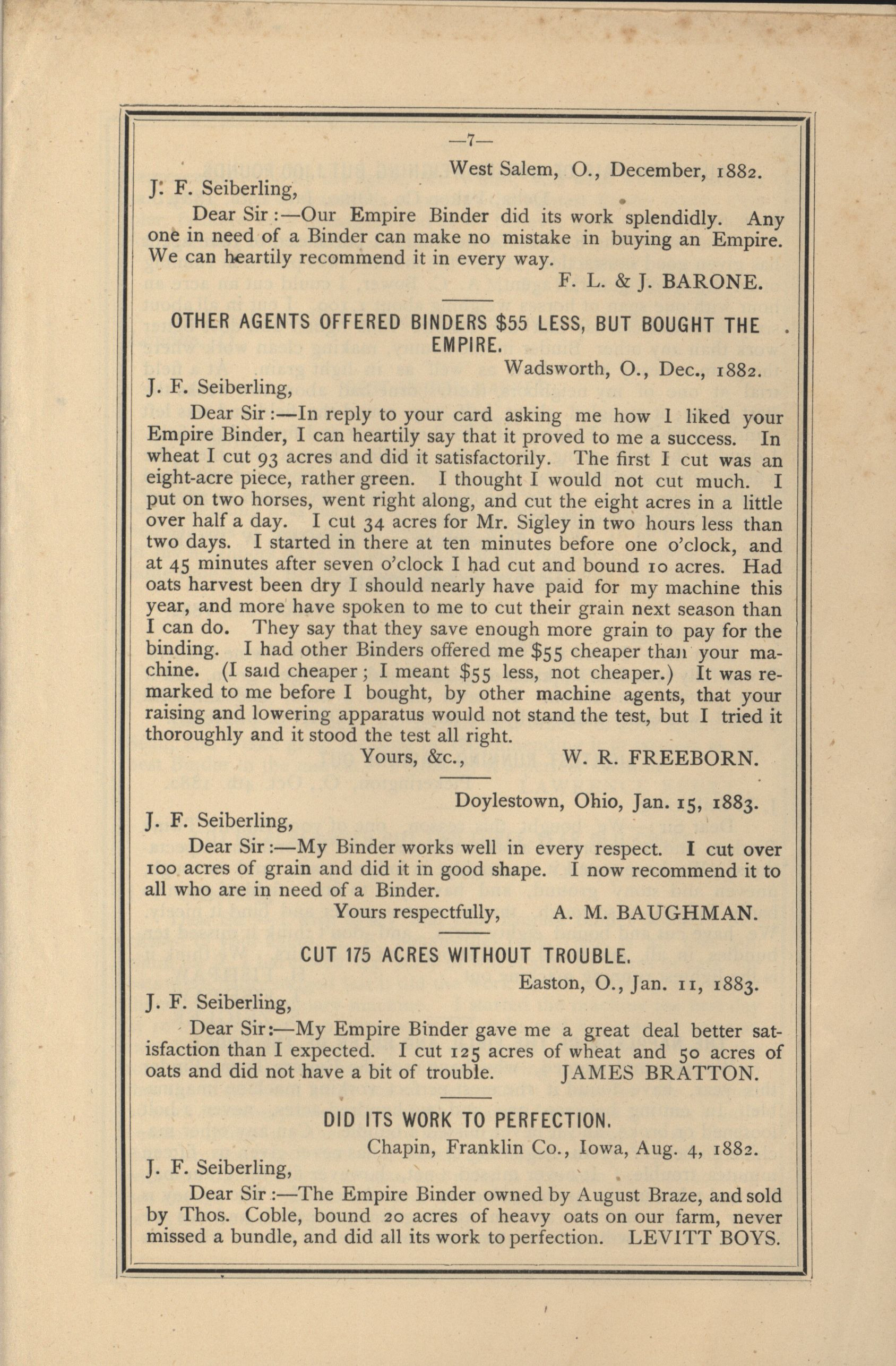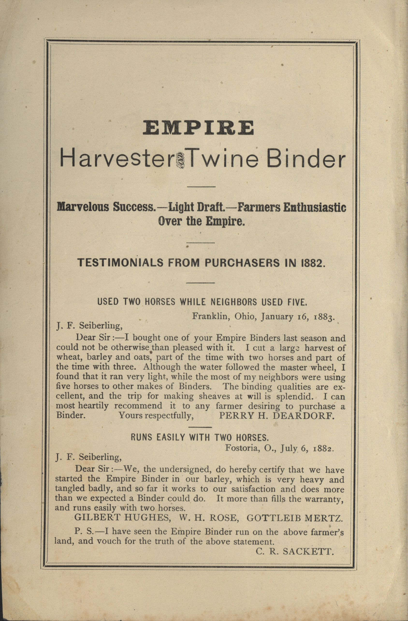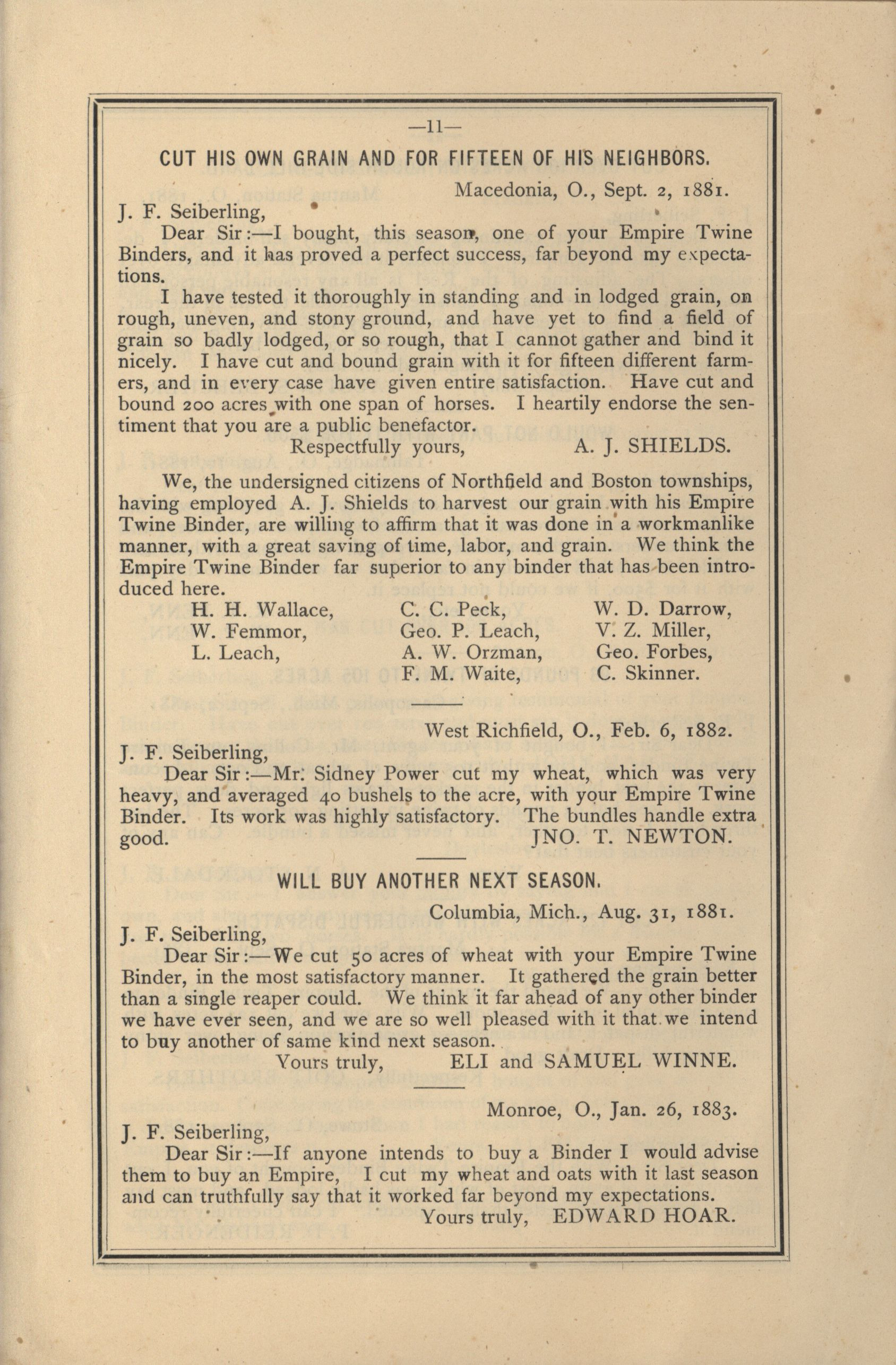 - Catalog detailing the testimonials of customers of a harvesters and binders manufactured by J.F. Seiberling Company.