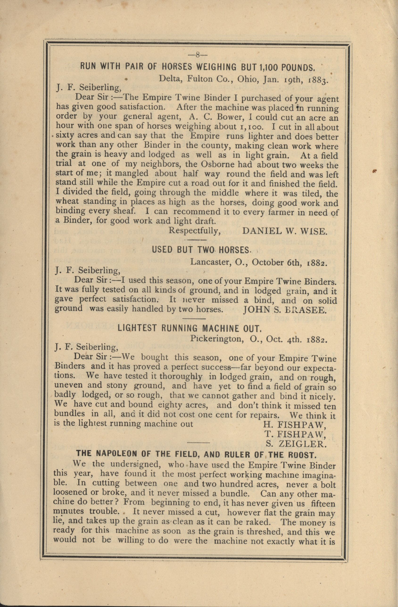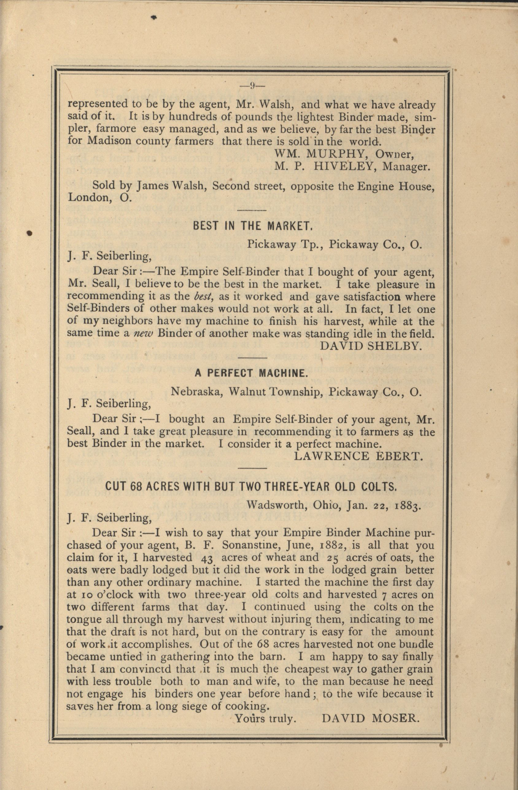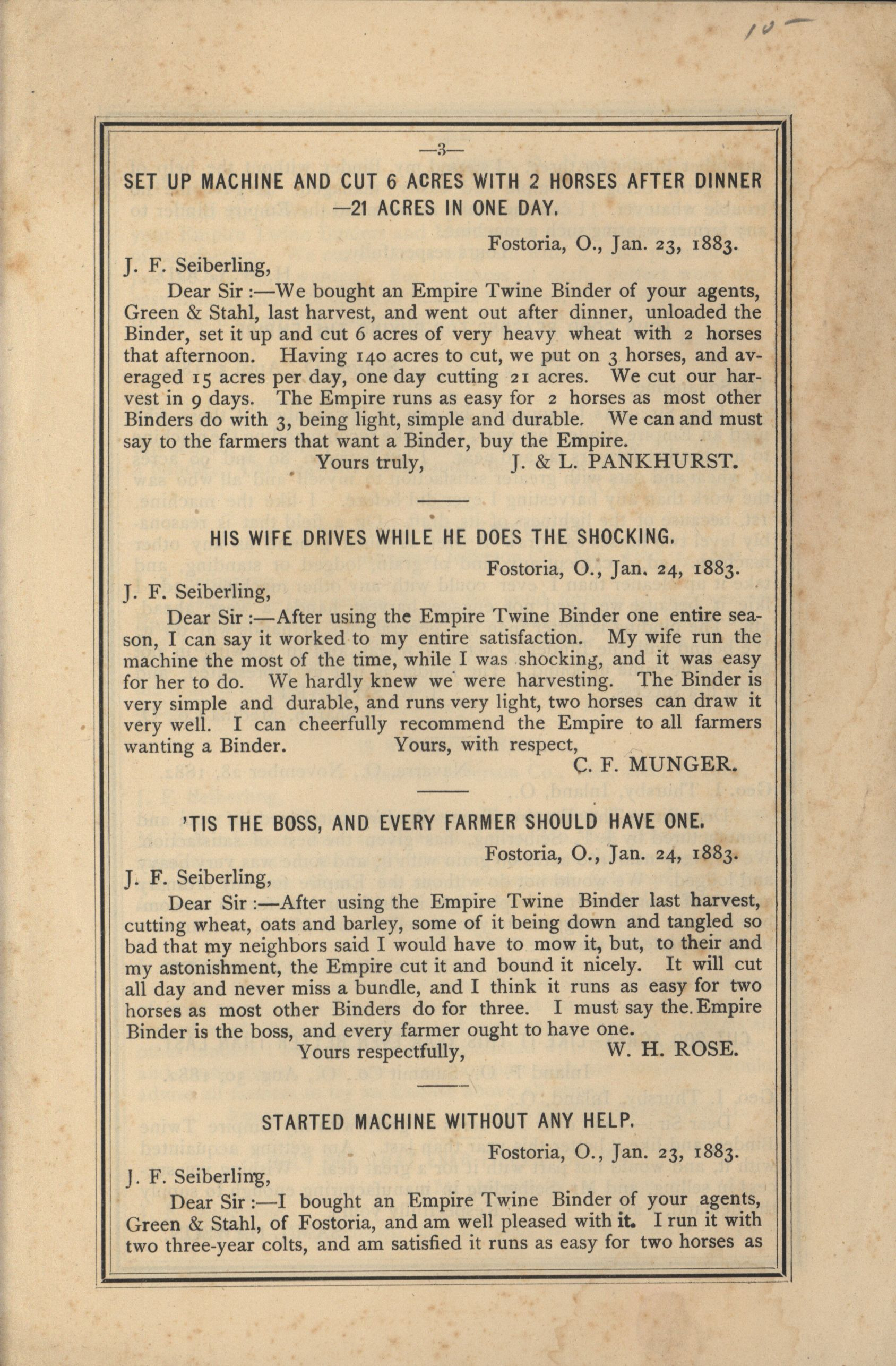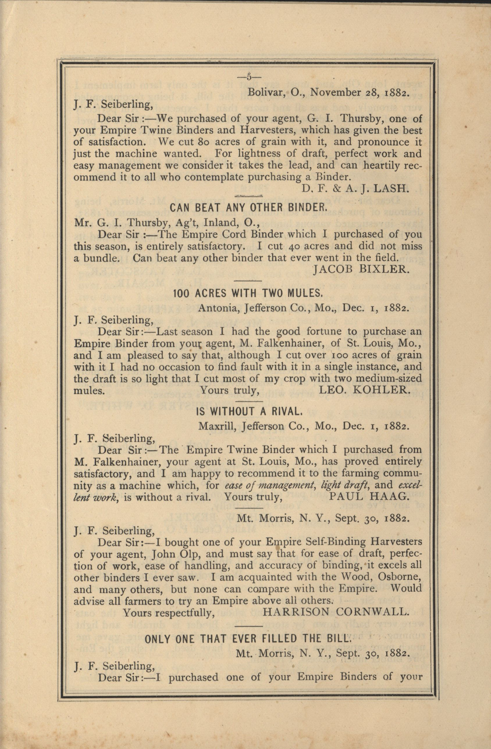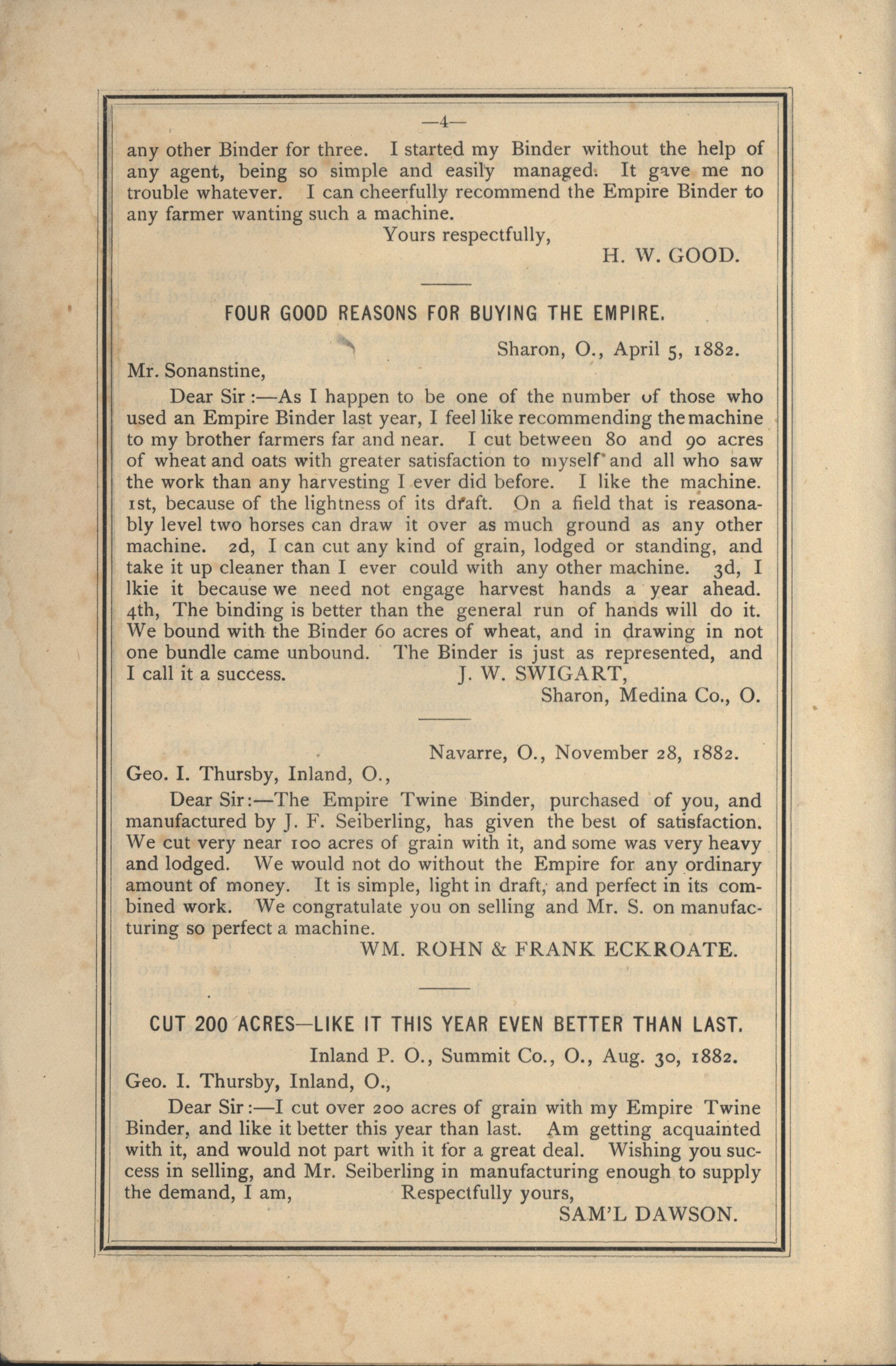 - Catalog detailing the testimonials of customers of a harvesters and binders manufactured by J.F. Seiberling Company.