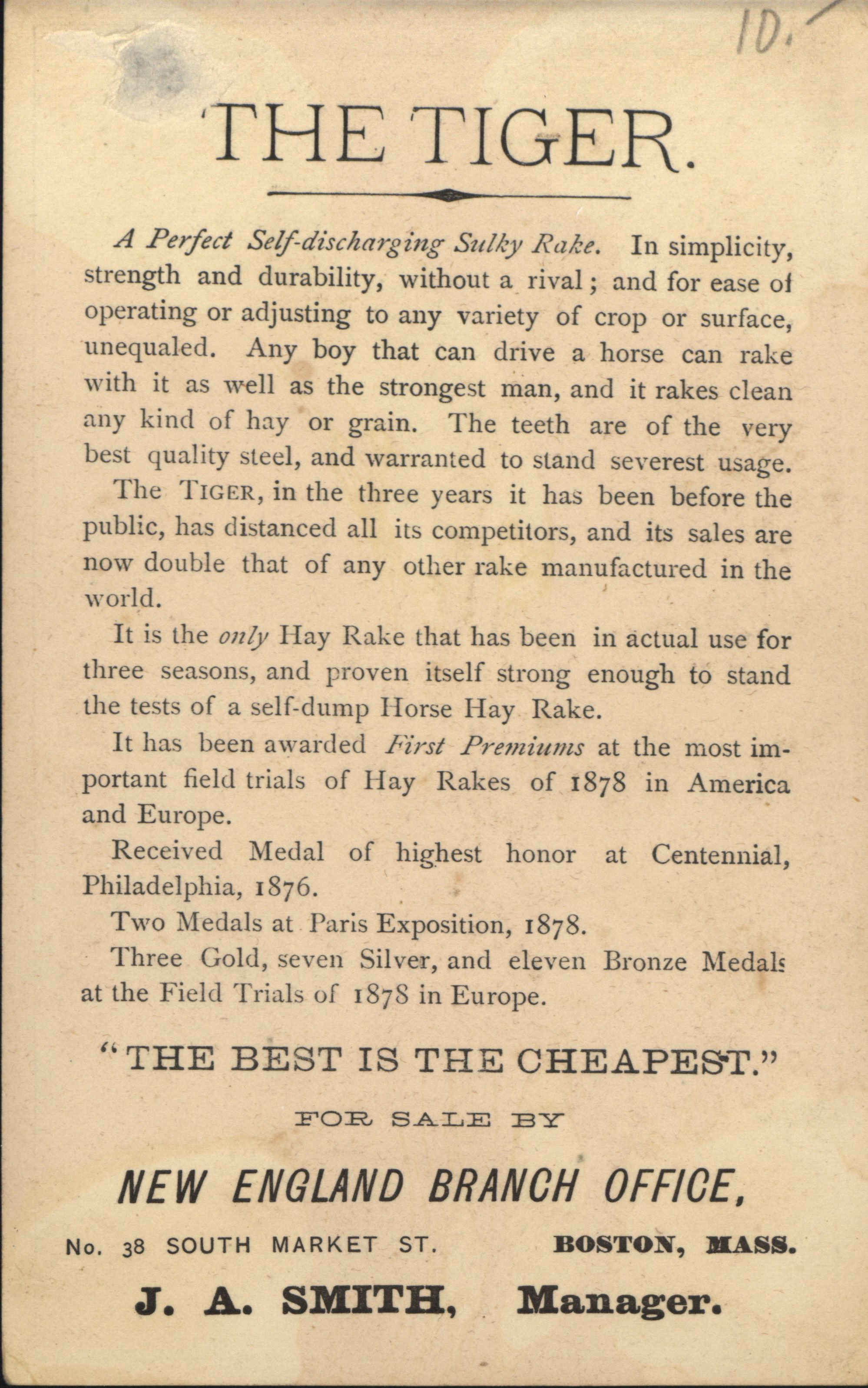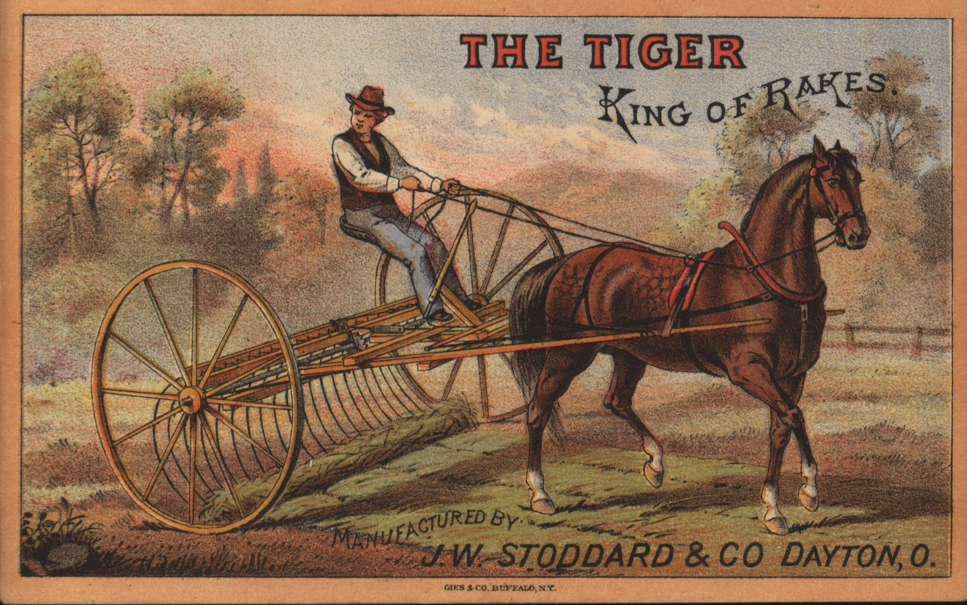 - Illustrated card advertising the Tiger rake produced by the Stoddard Manufacturing Company.