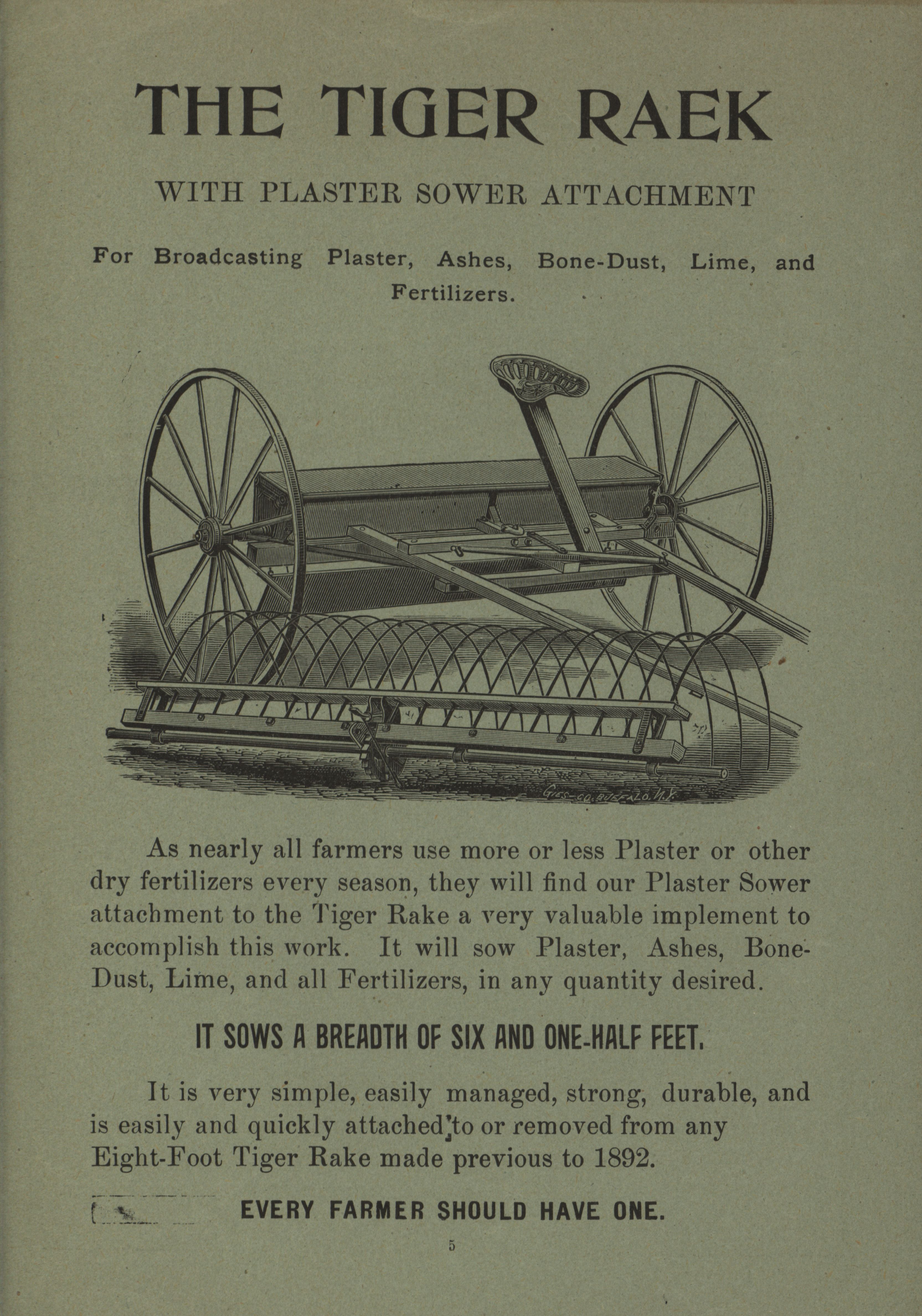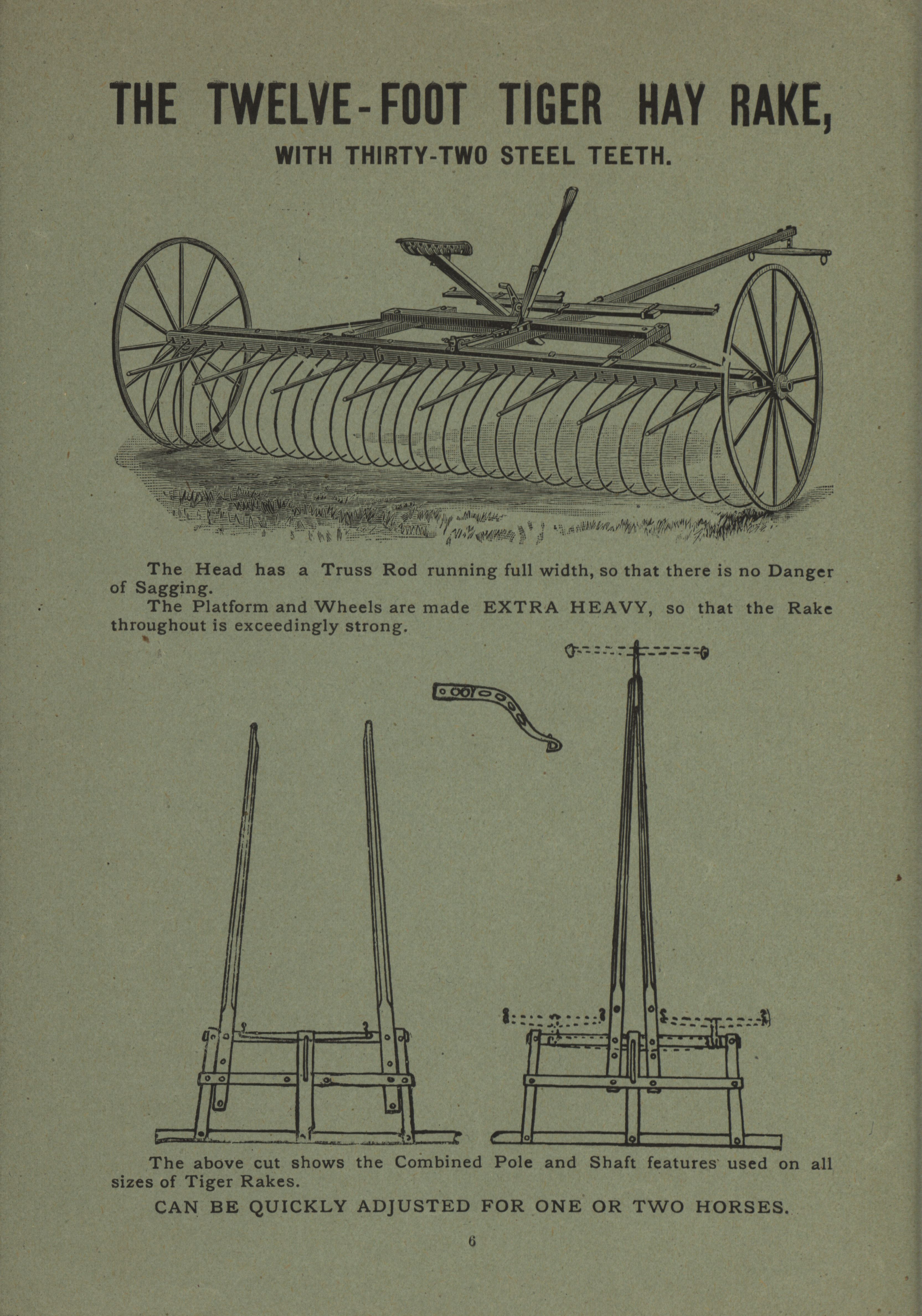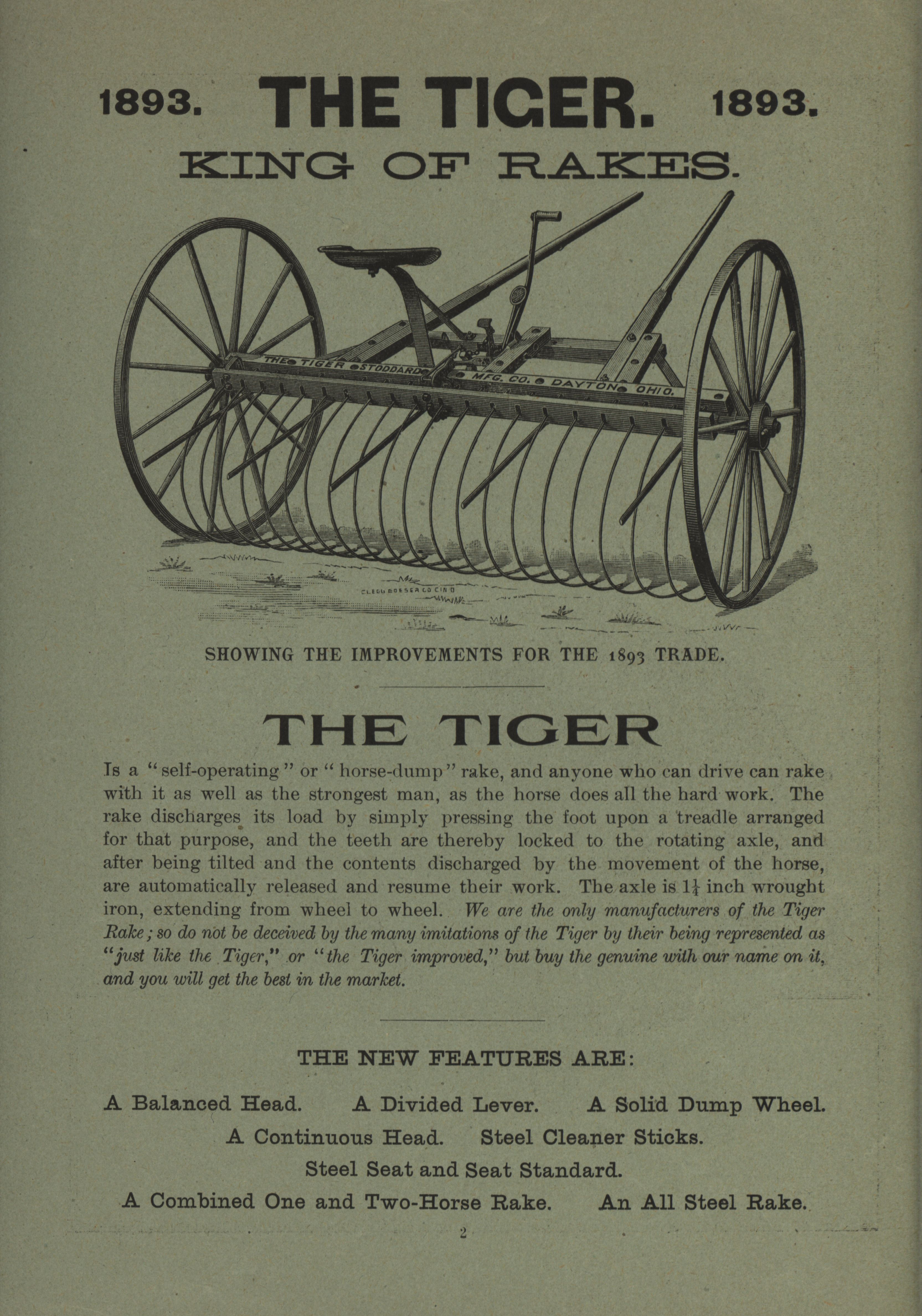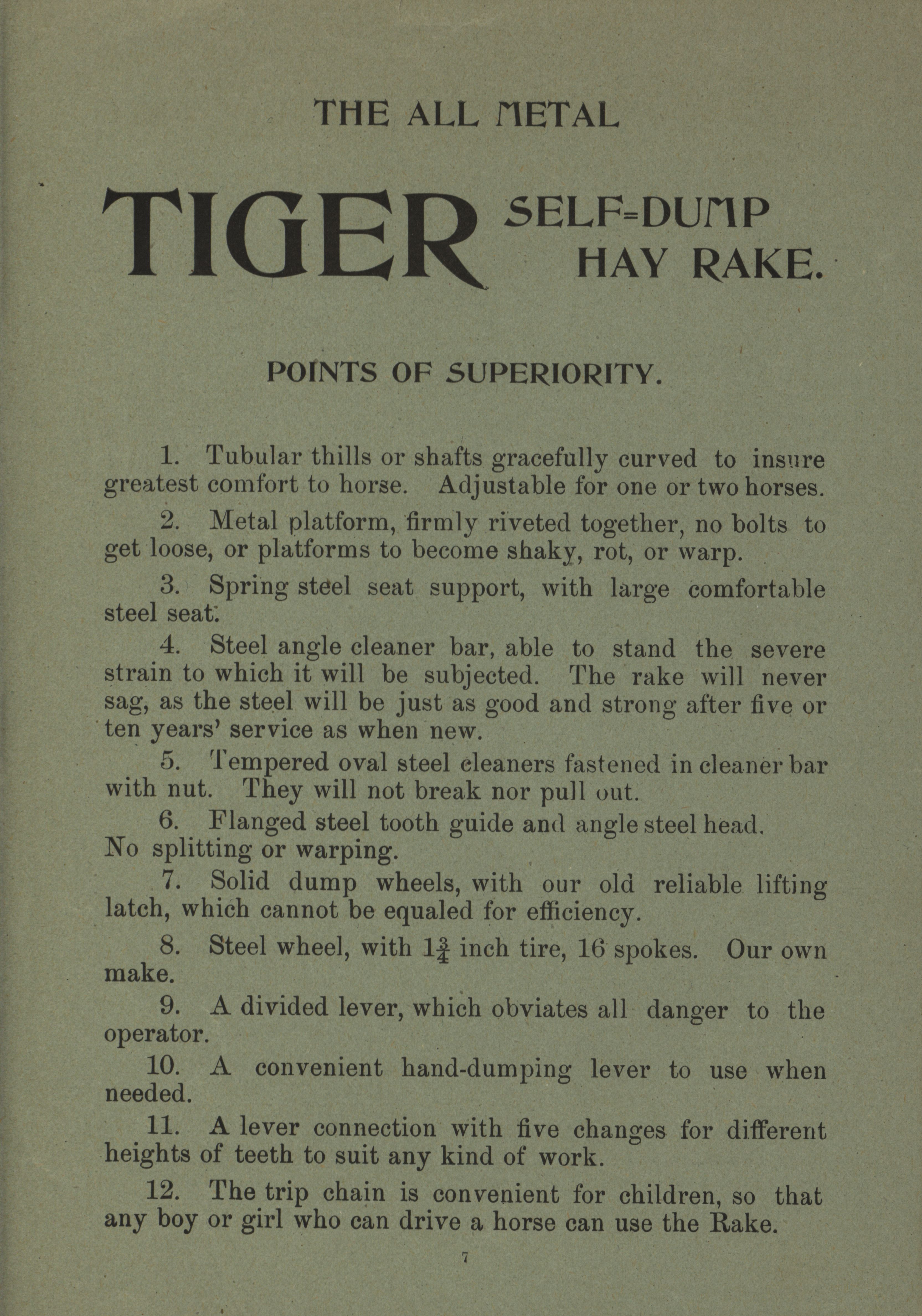 - "Tiger Self-Dump Sulky Hay Rake catalog", Agricultural Machinery Literature Collection, Iowa State University Library Digital Collections