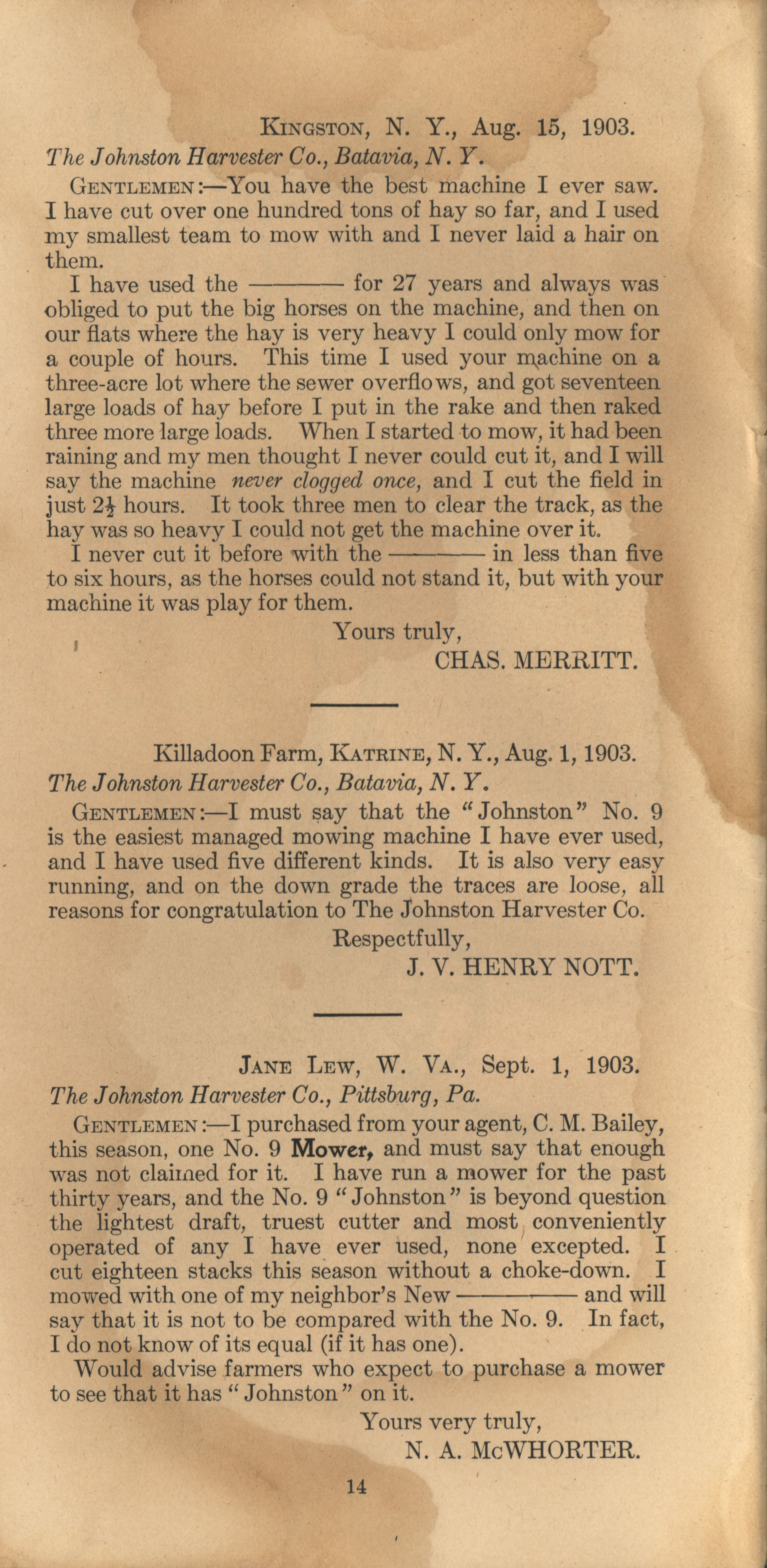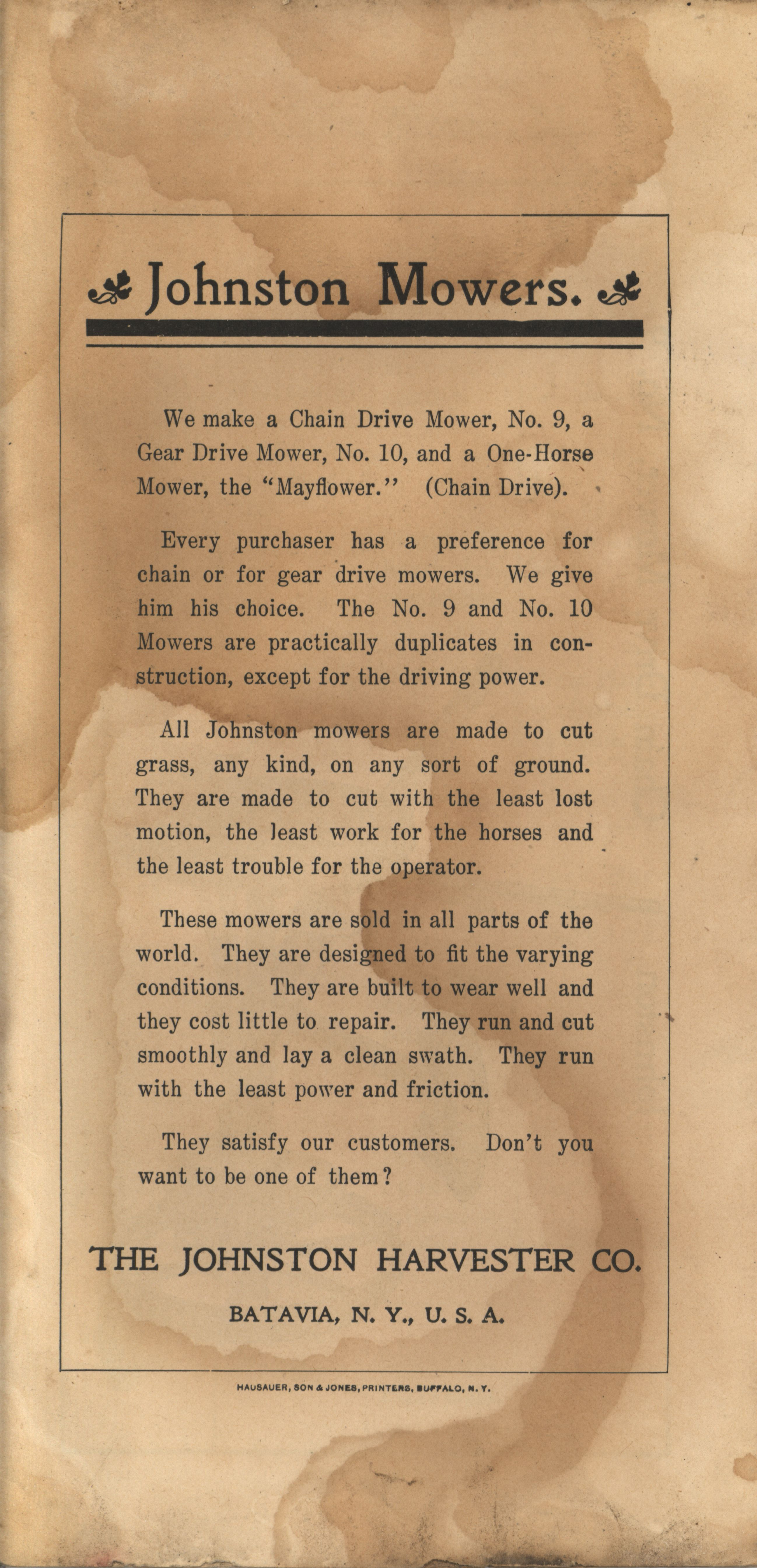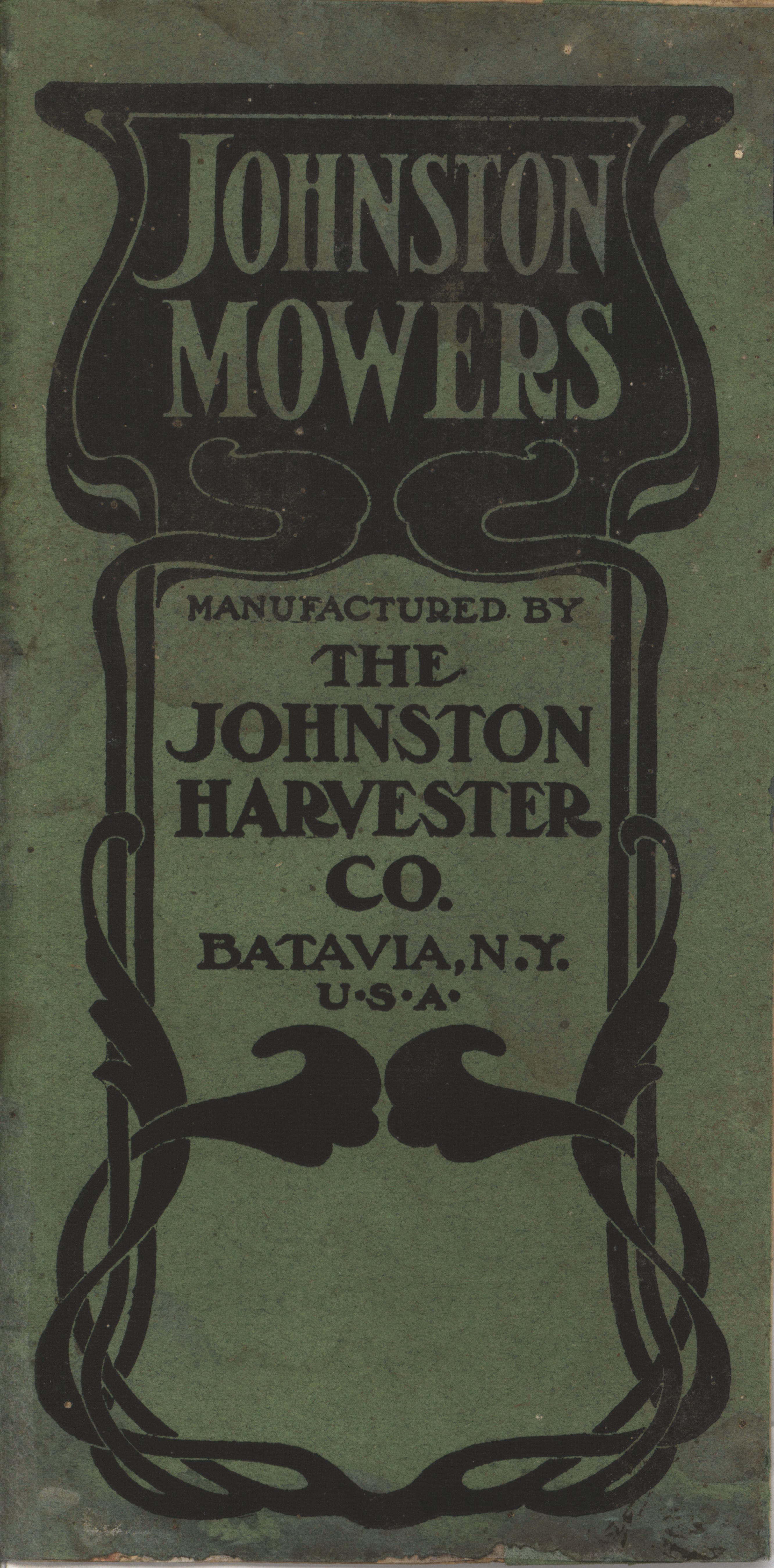 - Illustrated booklet advertising mowers produced by the Johnston Harvester Company.