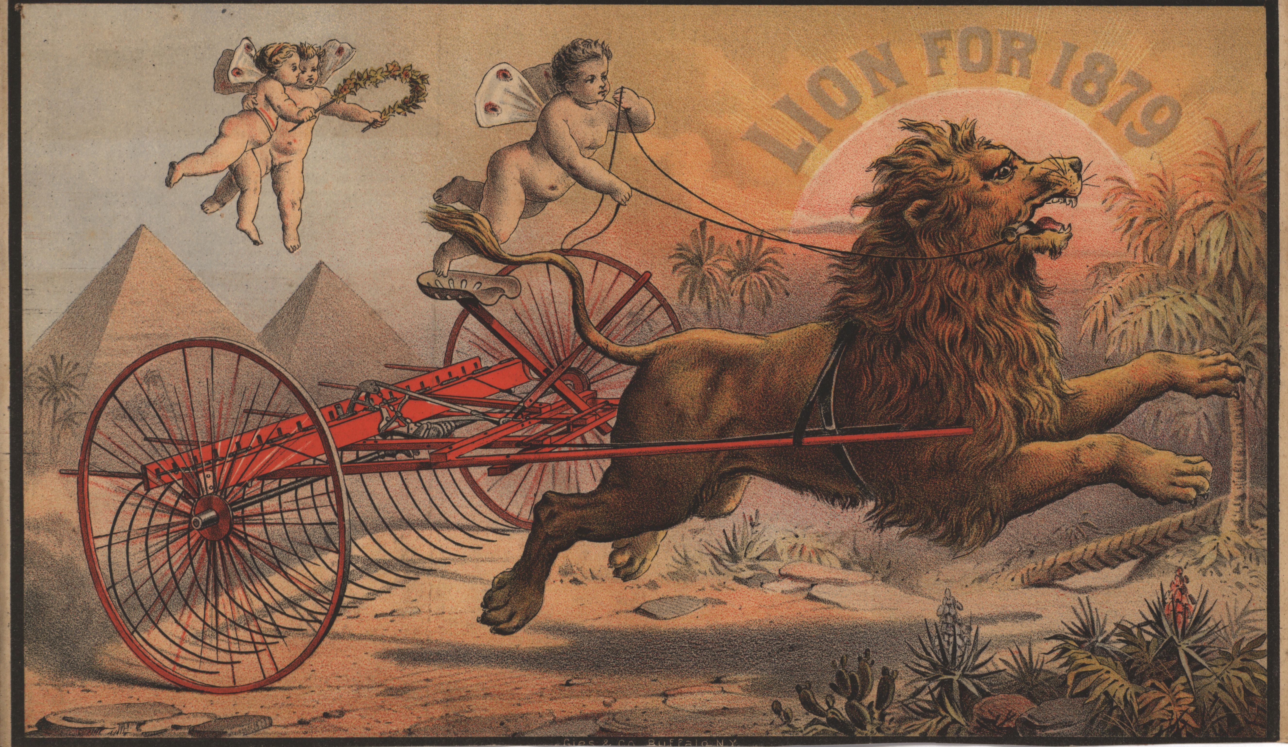 - Illustrated advertisement describing the Improved Lion Sulky Rake offered by A. W. Miner and Company in 1879.