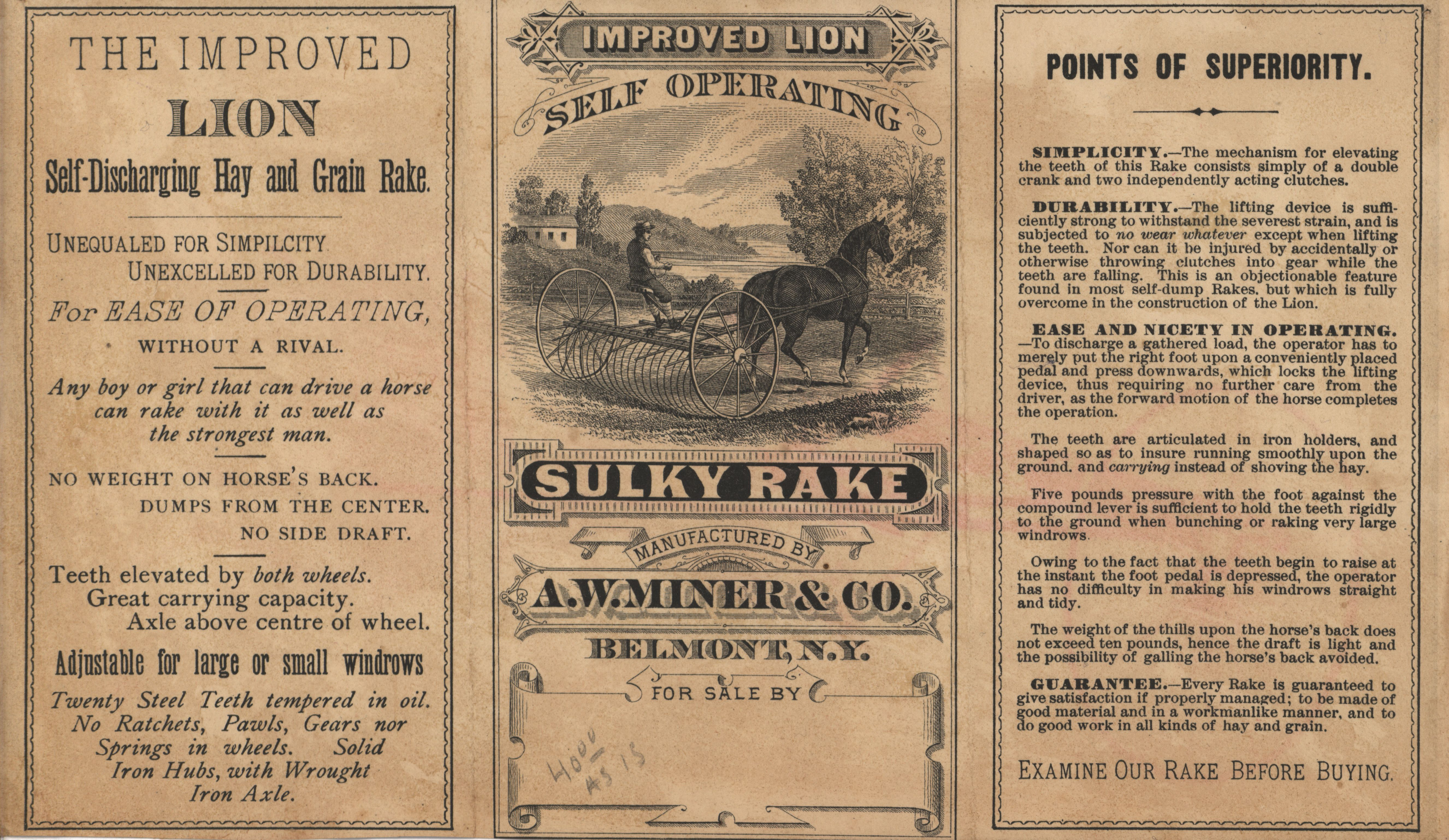 - "A. W. Miner and Company 1879 Improved Lion Sulky Rake advertisement", Agricultural Machinery Literature Collection, Iowa State University Library Digital Collections