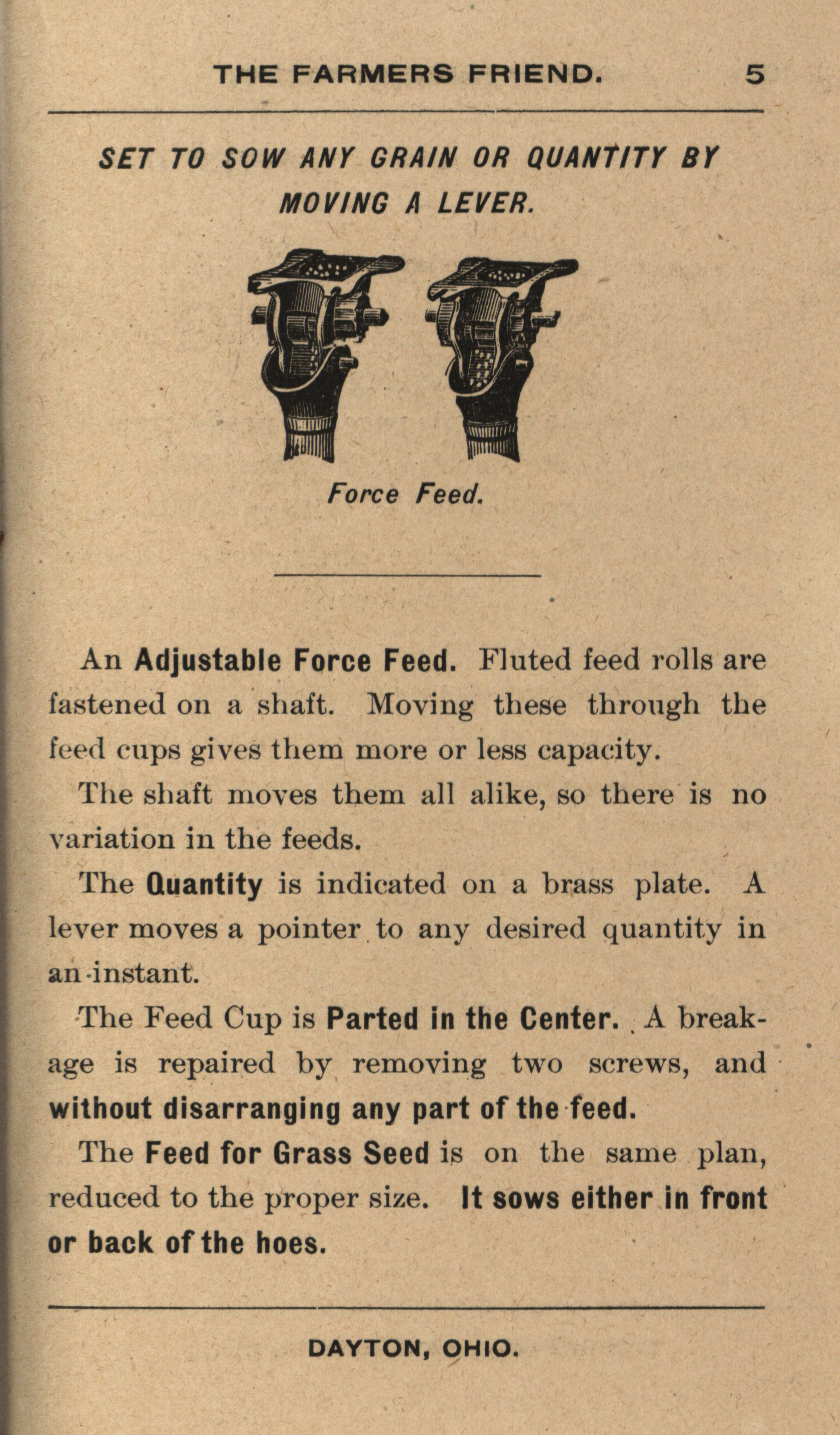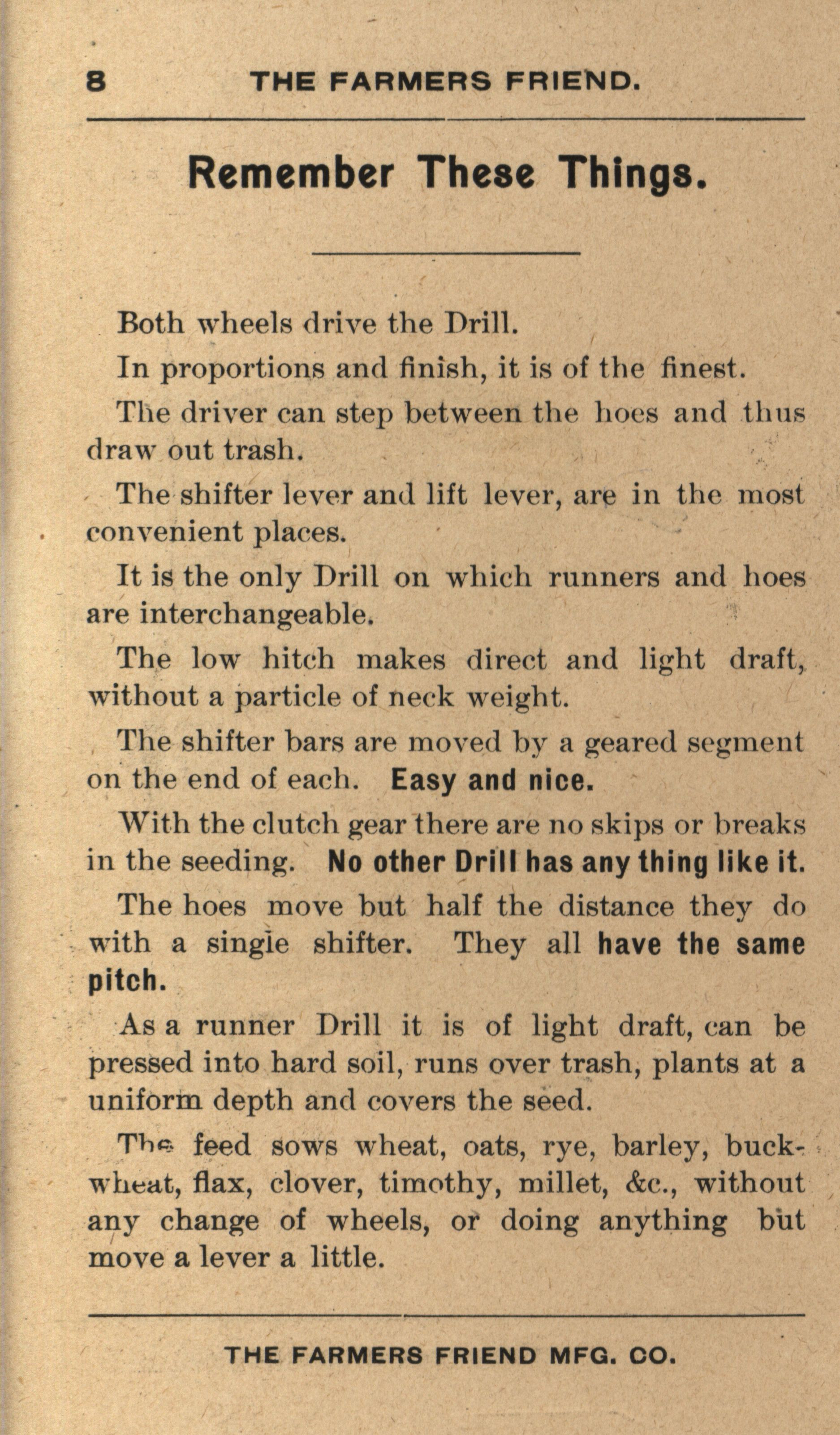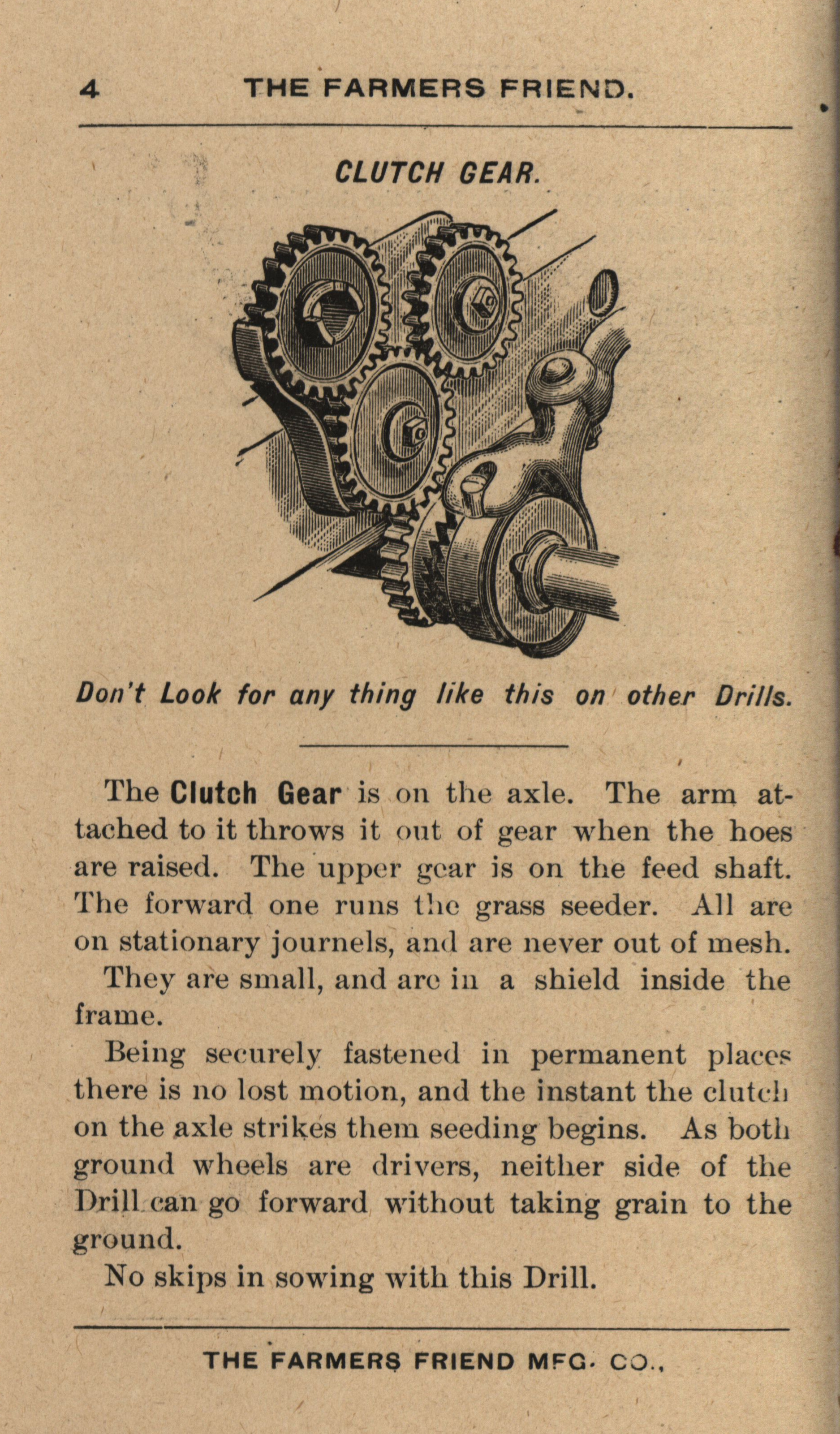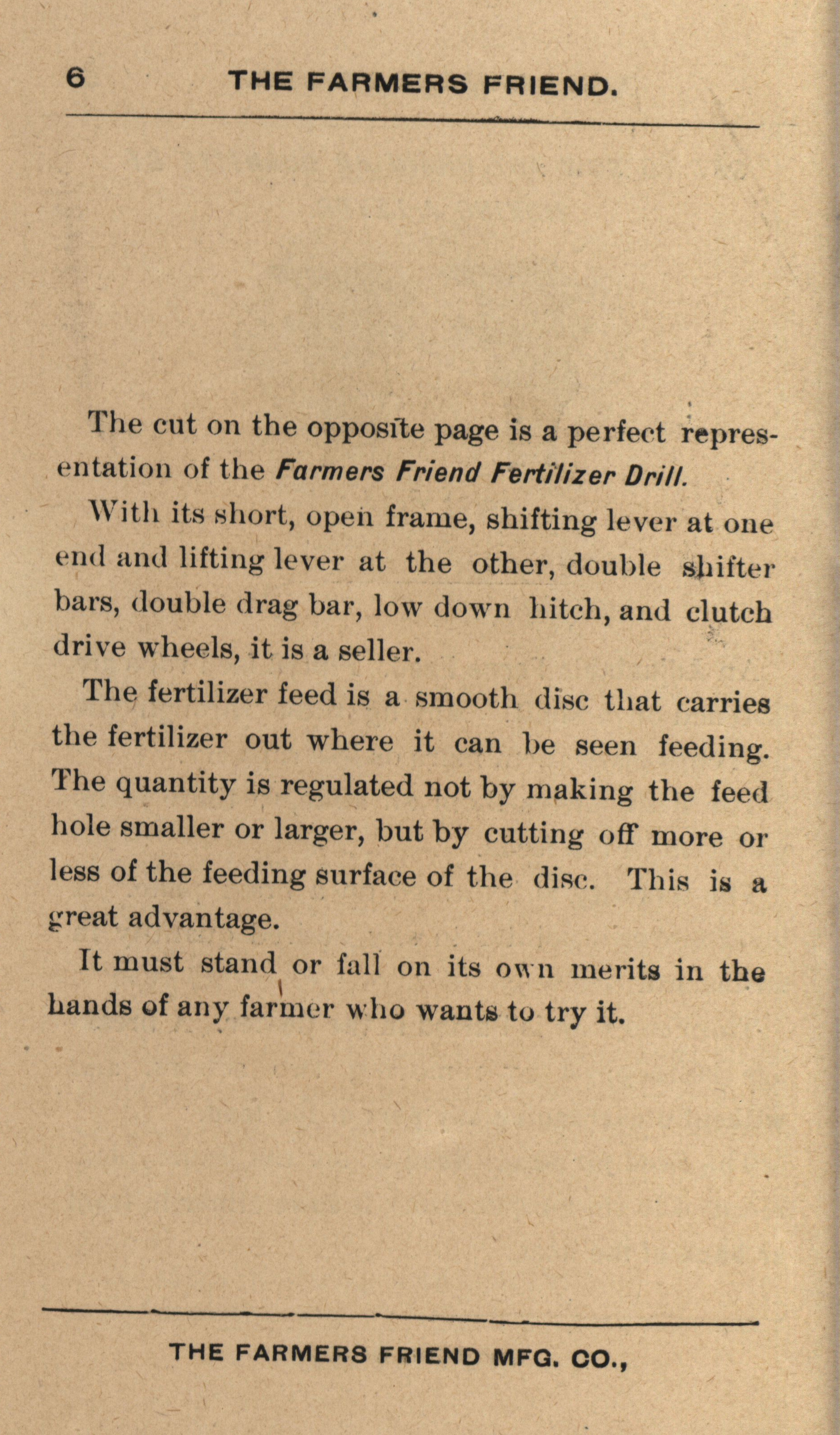 - "Farmers Friend Manufacturing Company catalog", Agricultural Machinery Literature Collection, Iowa State University Library Digital Collections