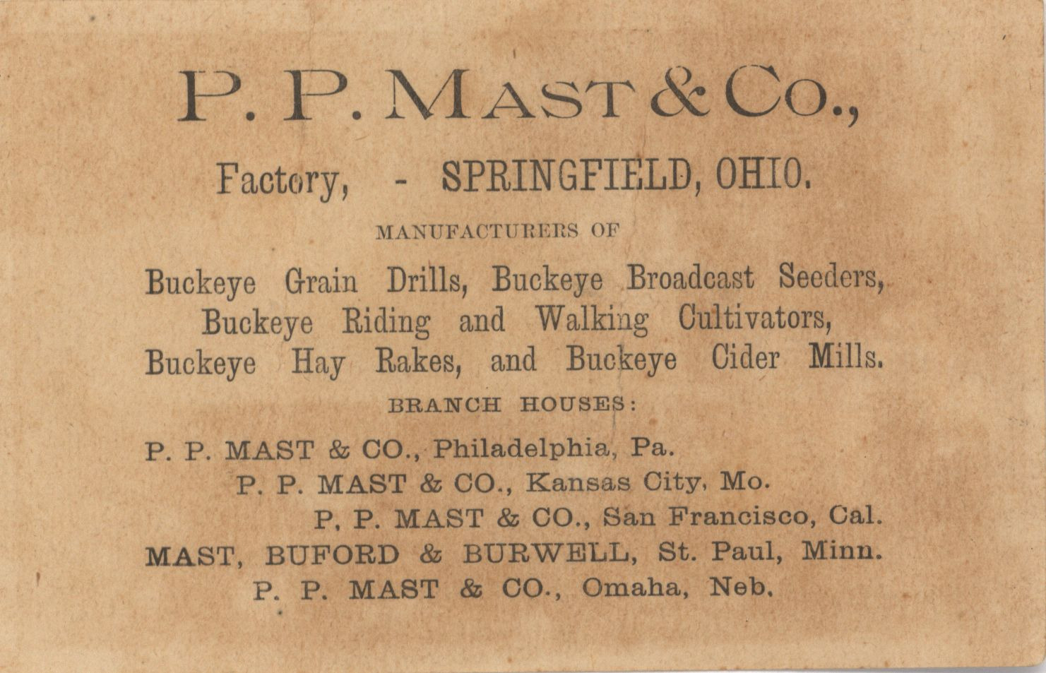 - "P. P. Mast and Company advertisement", Agricultural Machinery Literature Collection, Iowa State University Library Digital Collections
