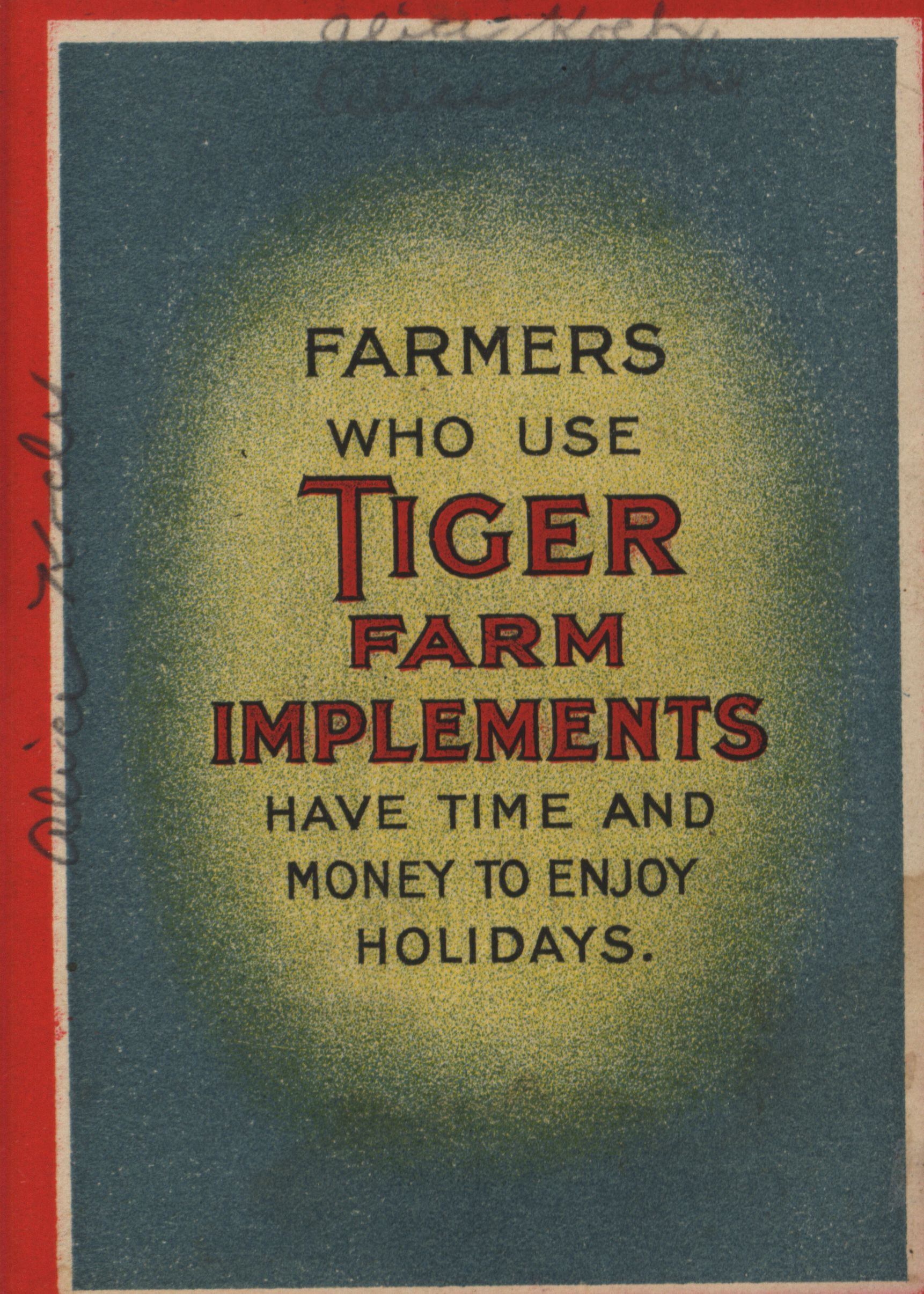 - "Tiger Farm Implements advertisement booklet", Agricultural Machinery Literature Collection, Iowa State University Library Digital Collections