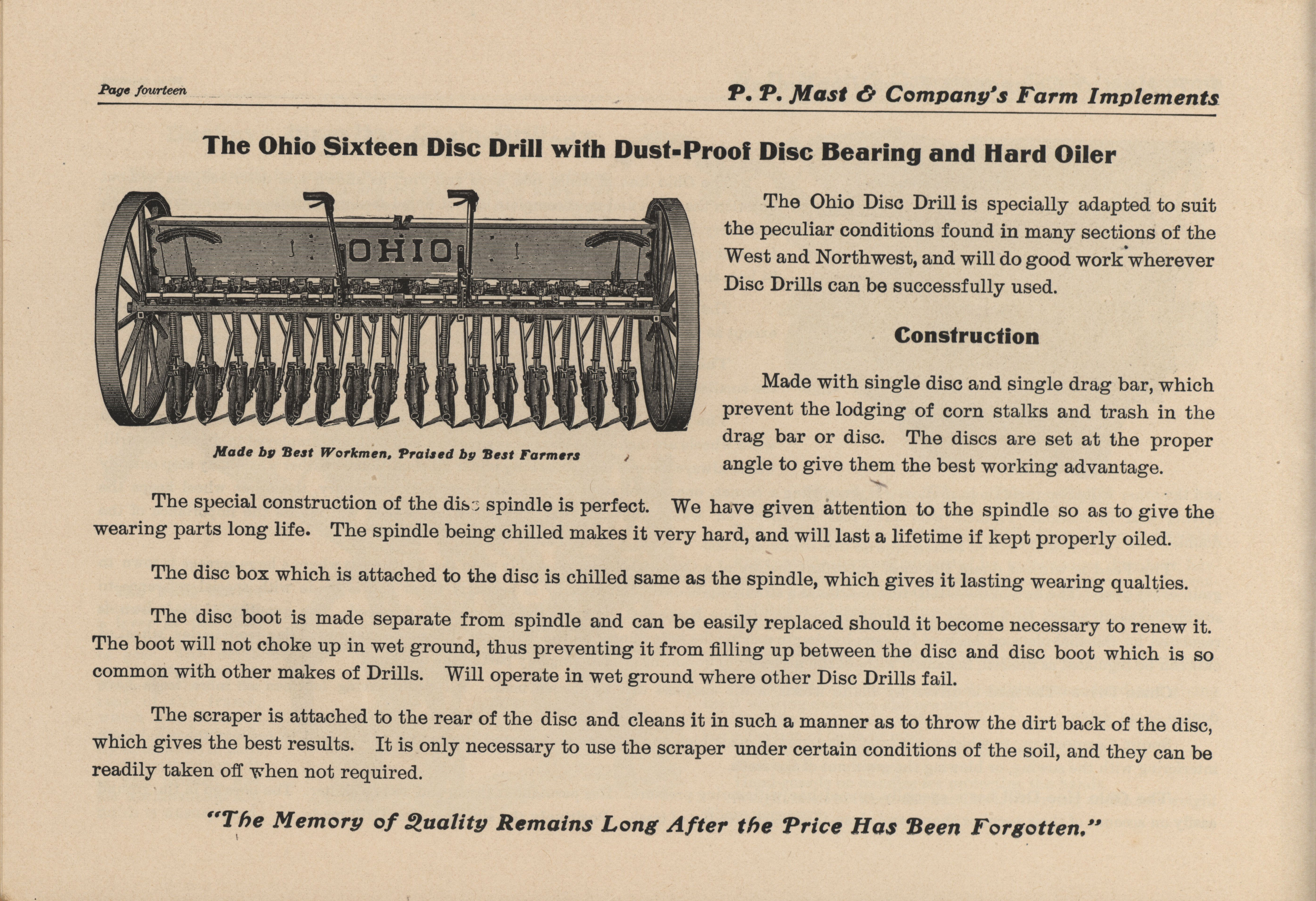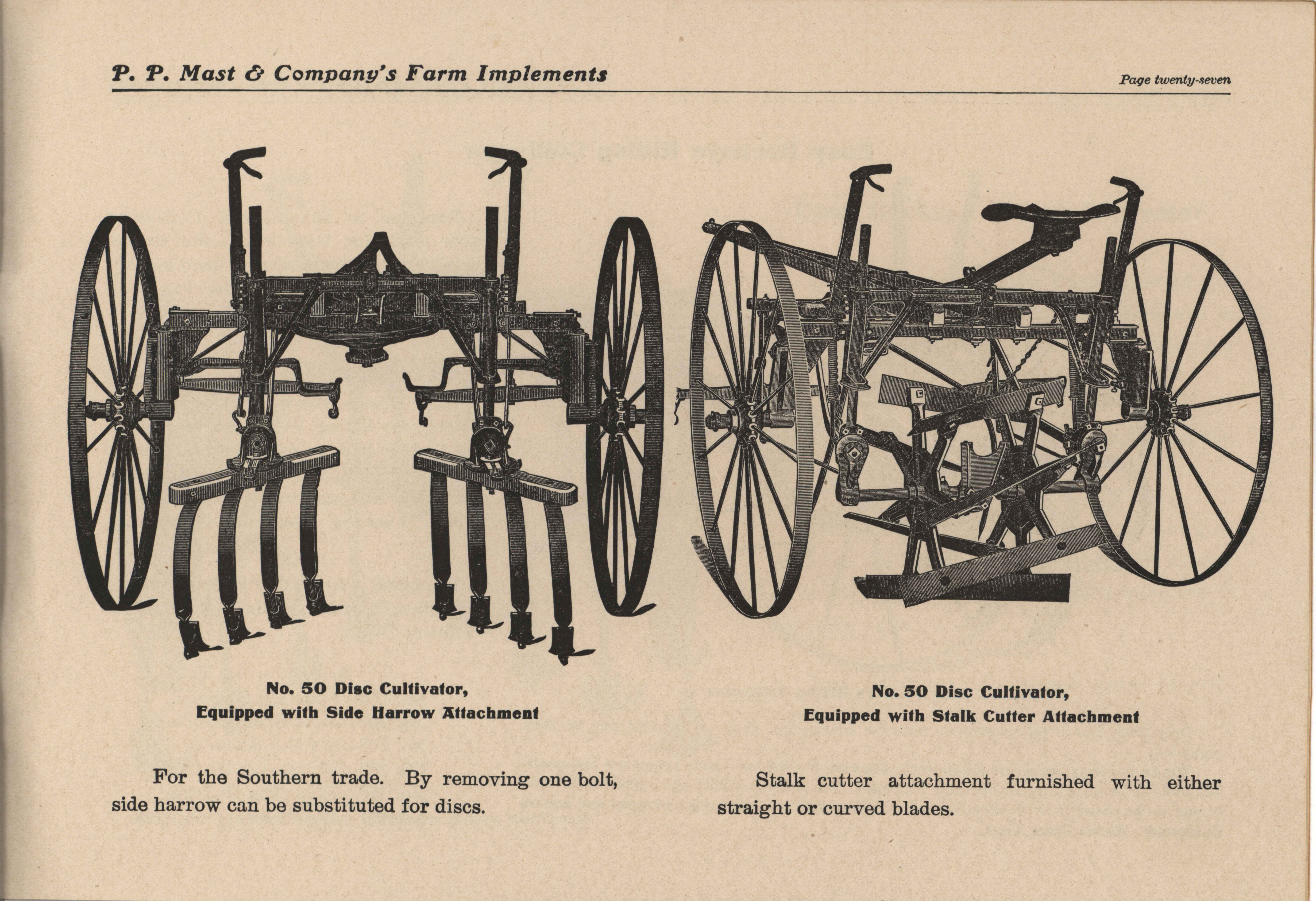 - Illustrated catalog describing the agricultural implements offered by P. P. Mast and Company in 1908.