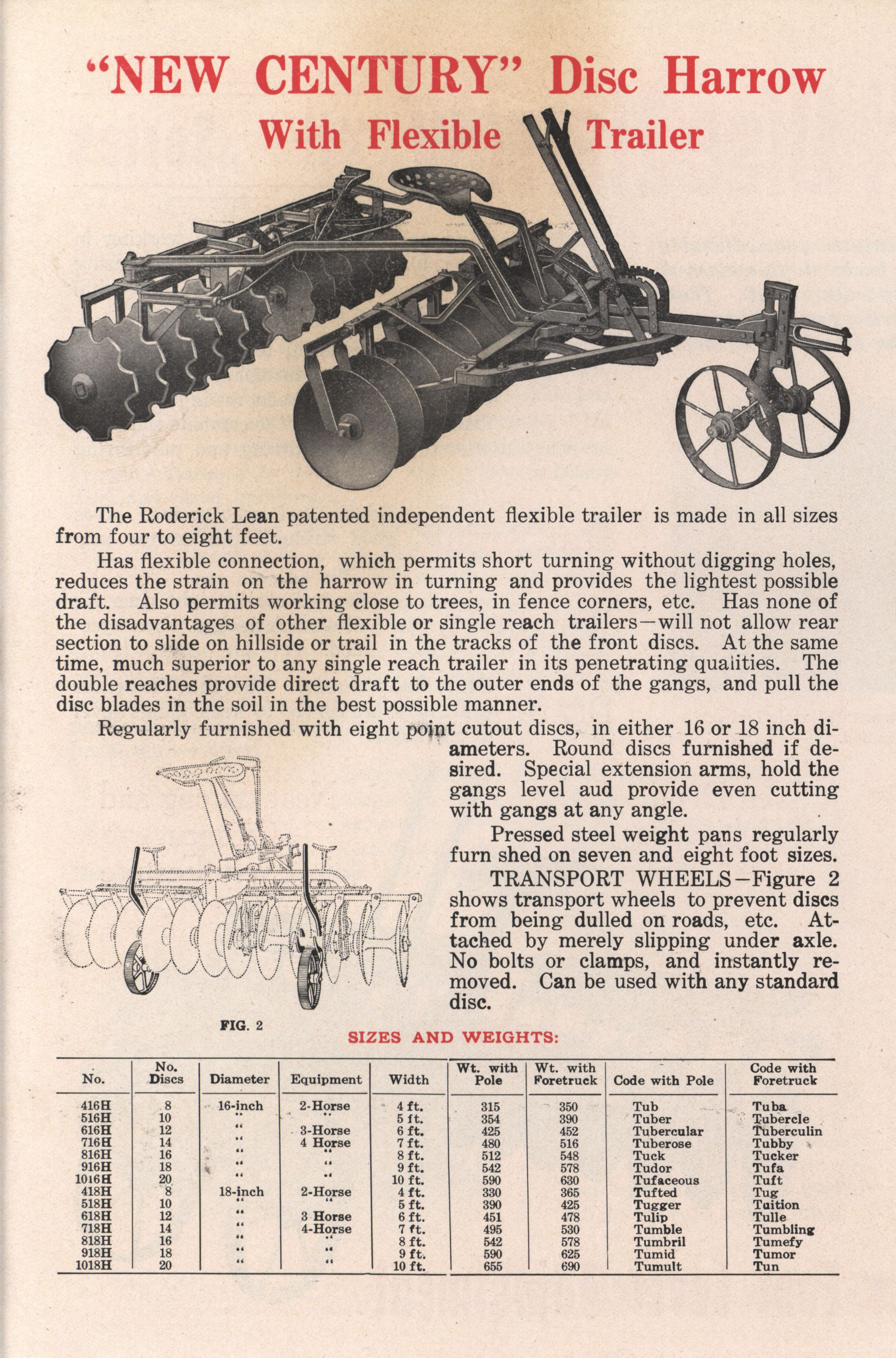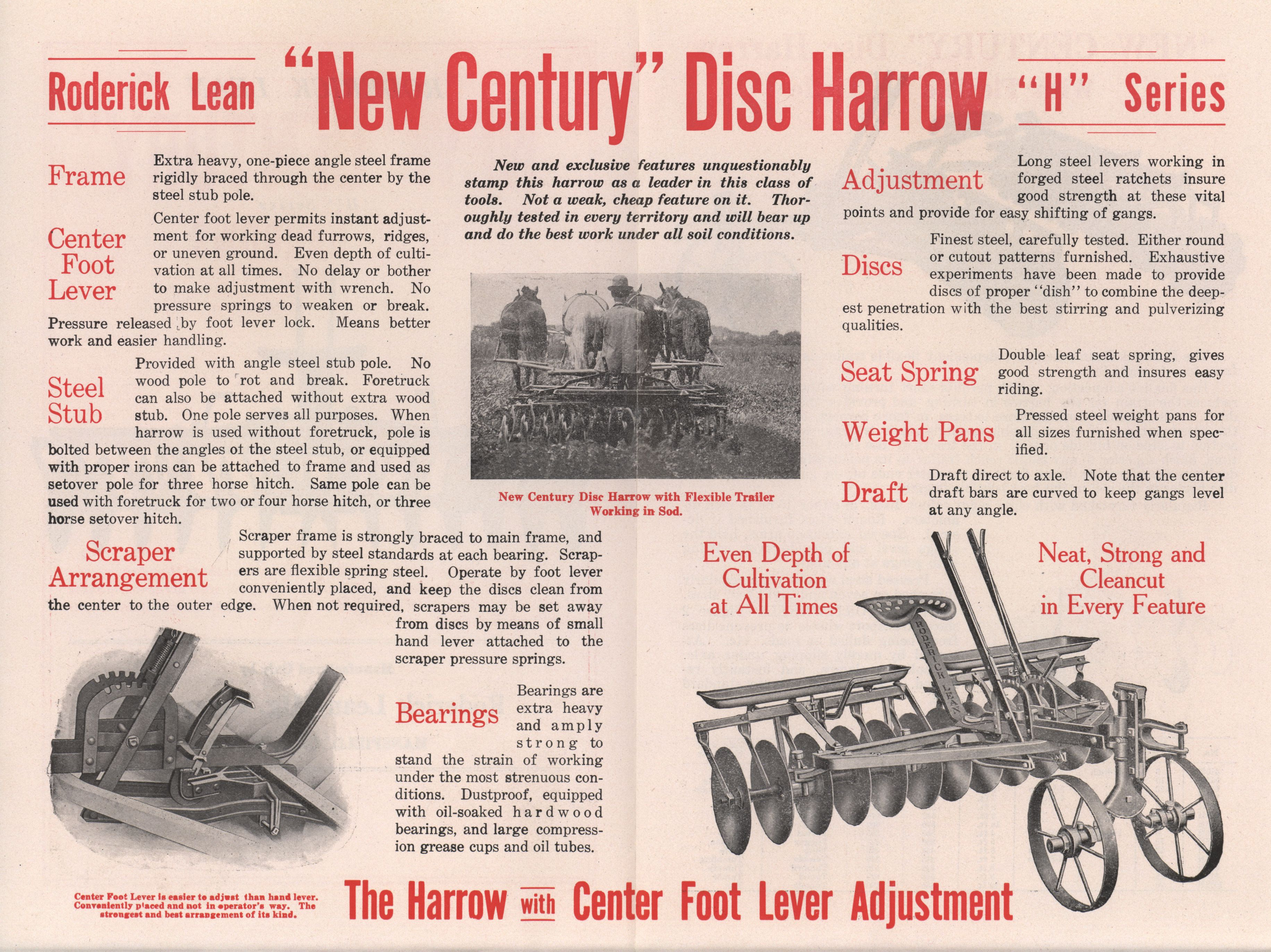 - Illustrated advertisement for the New Century H Series Disc Harrows offered by the Roderick Lean Manufacturing Company.