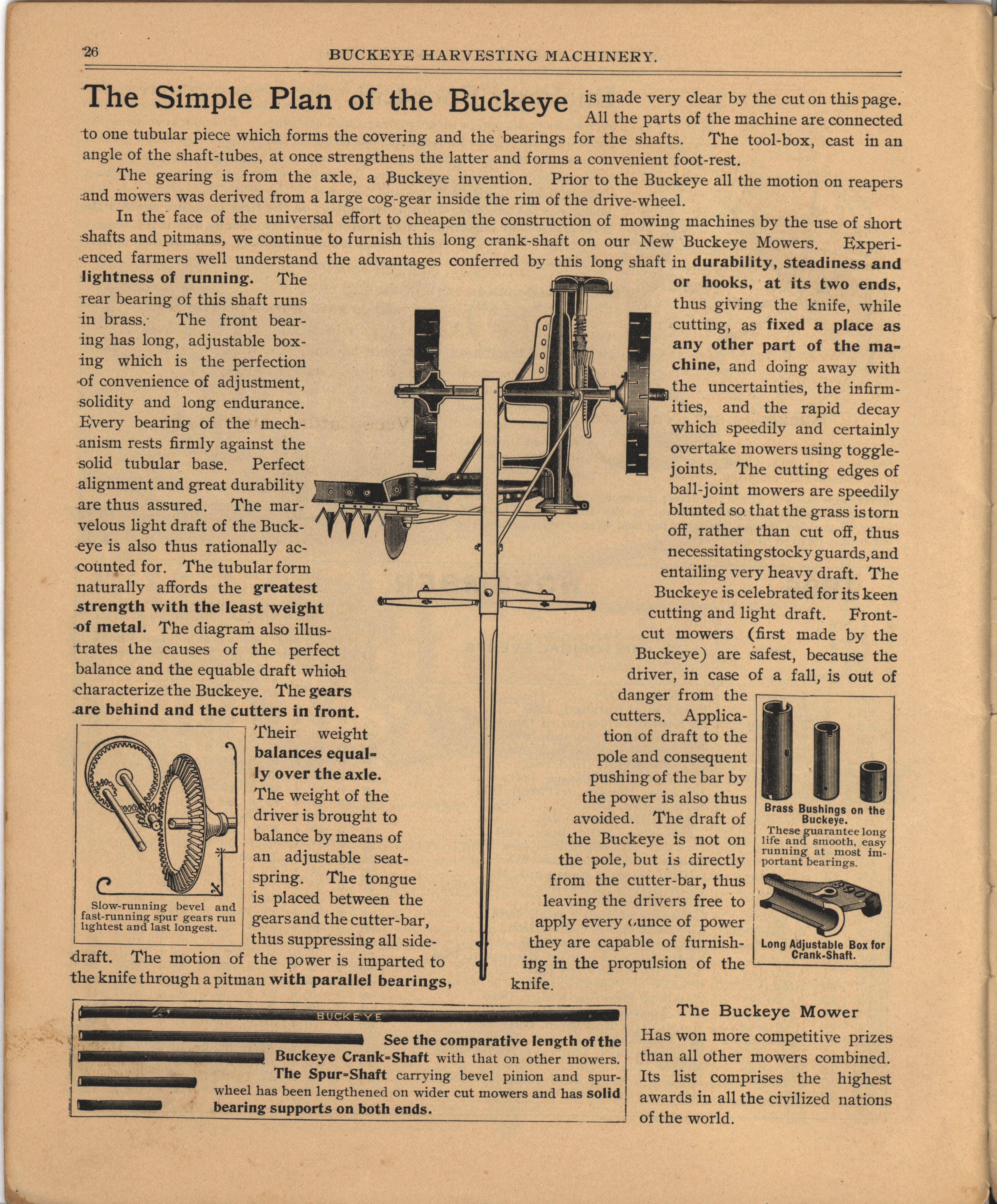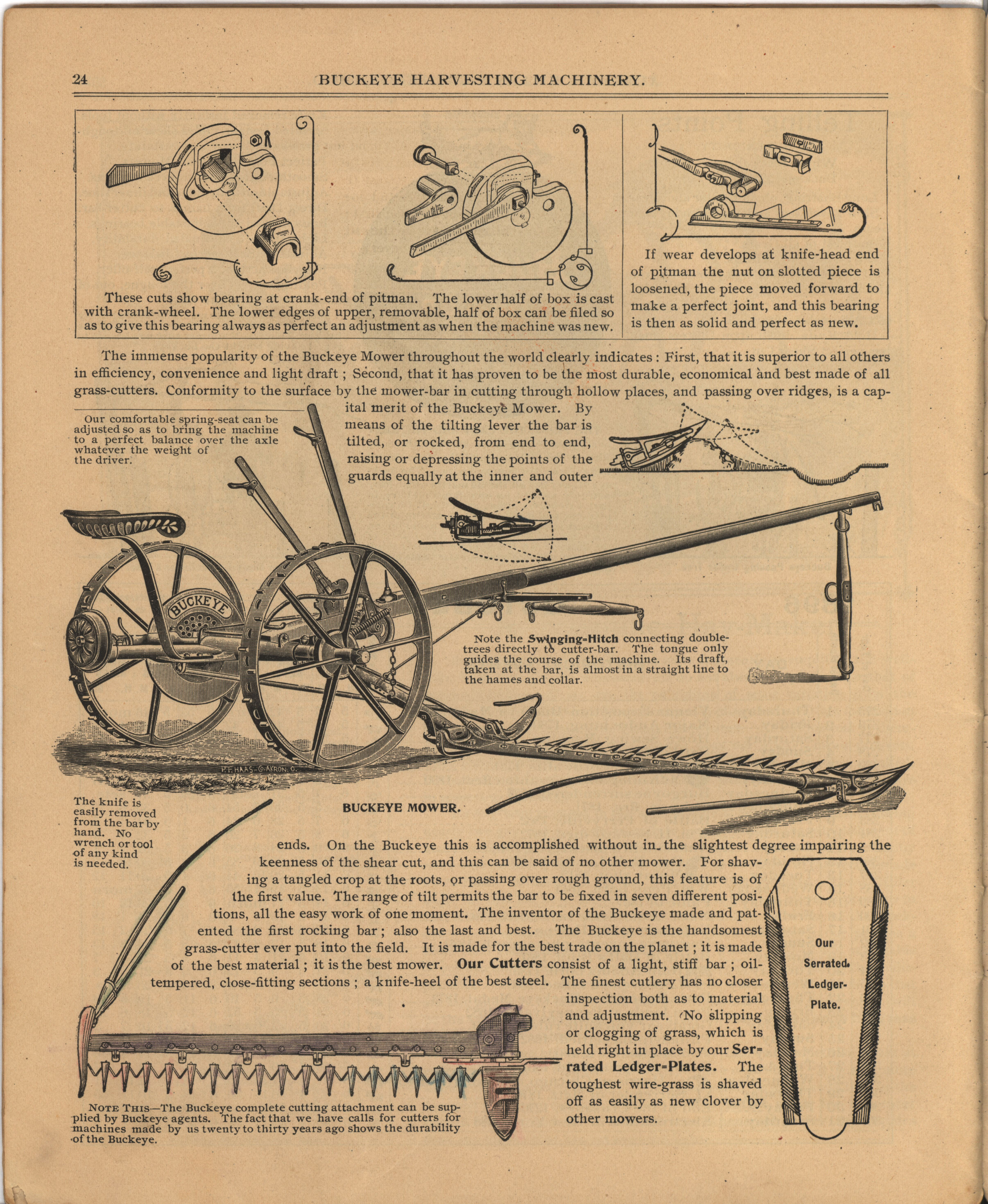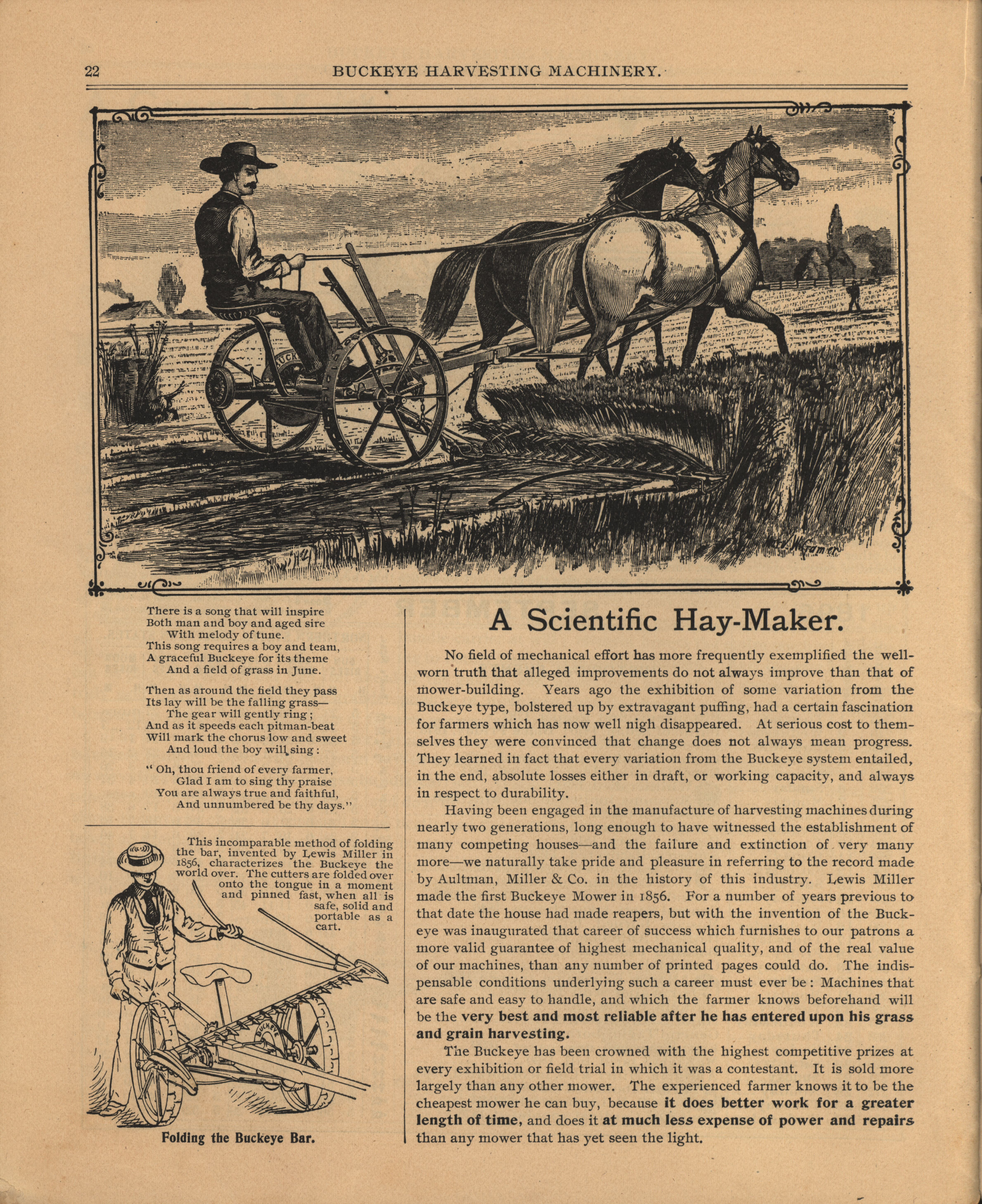 - Catalog describing the Buckeye Mower product line offered by the Aultman, Miller and Company, includes illustrations.