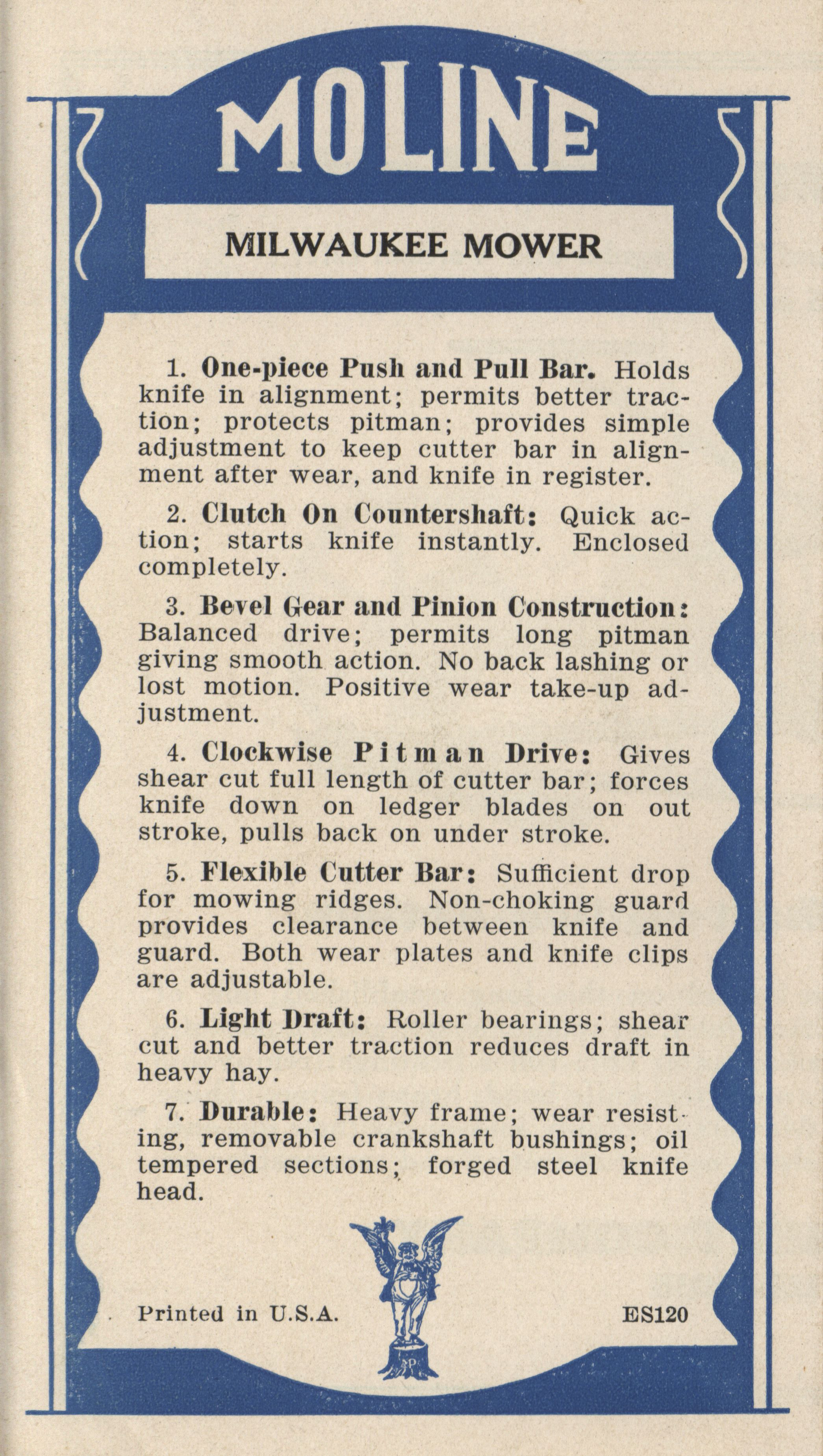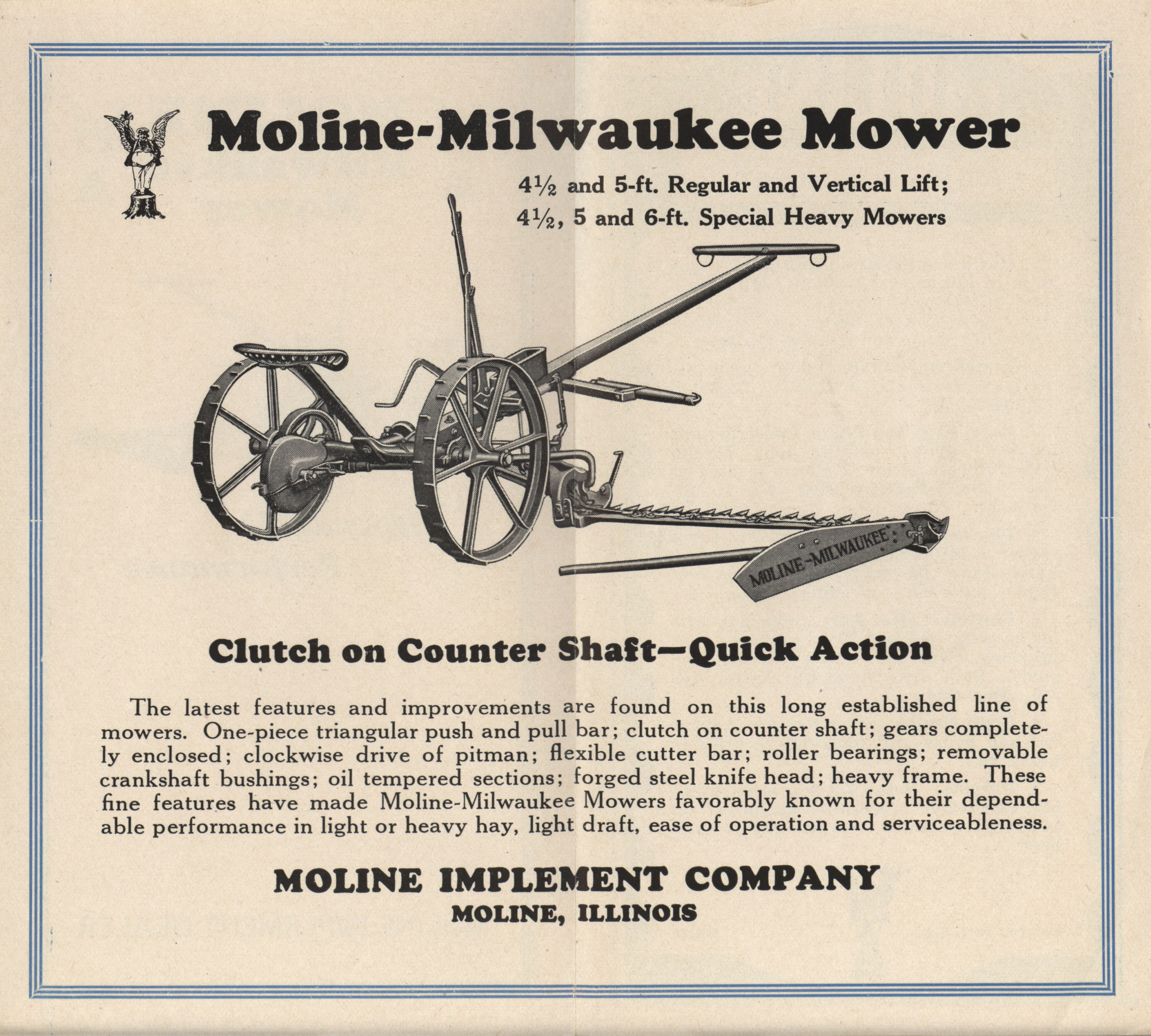 - "Moline Implement Company Milwaukee Mower advertisement", Agricultural Machinery Literature Collection, Iowa State University Library Digital Collections
