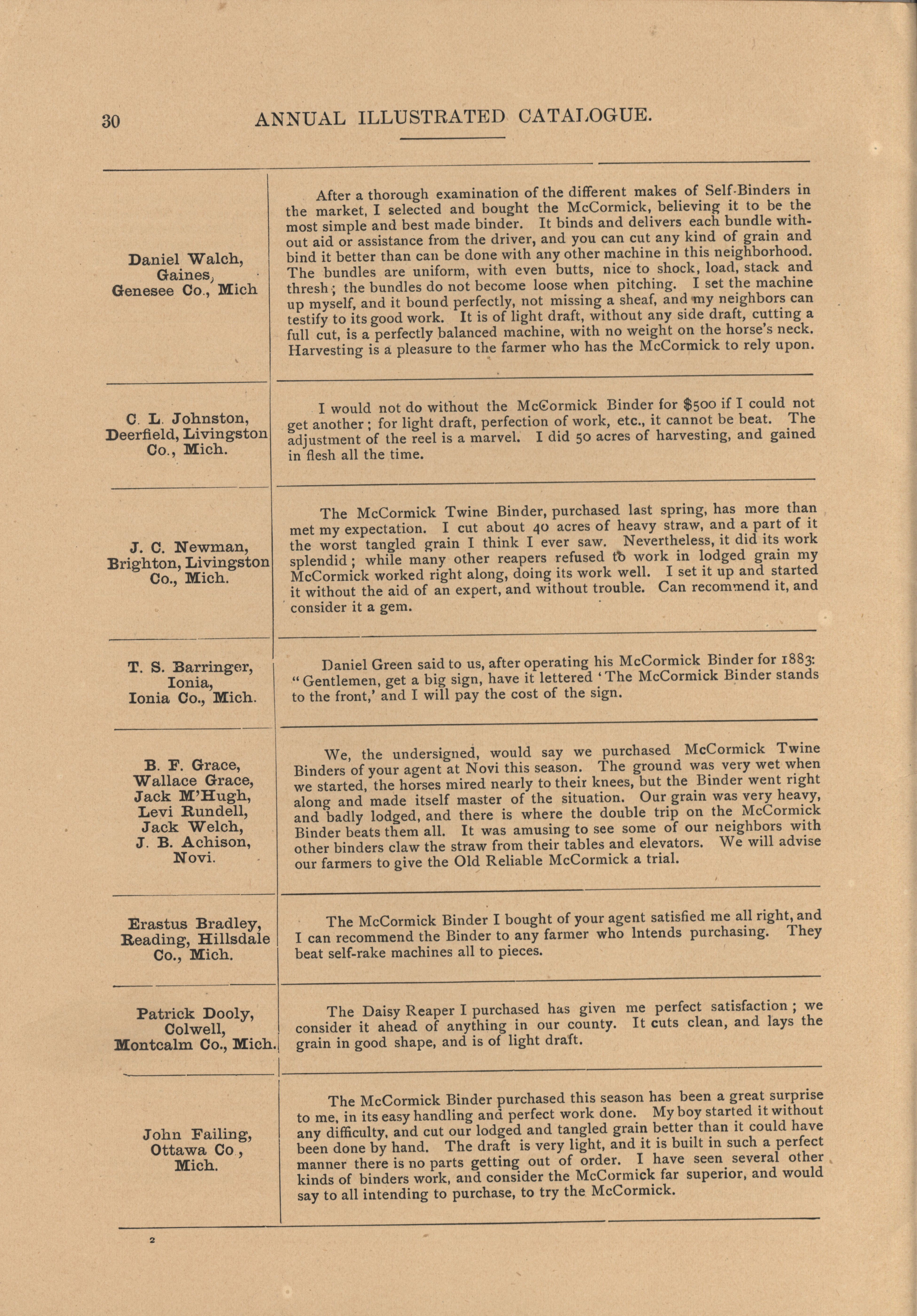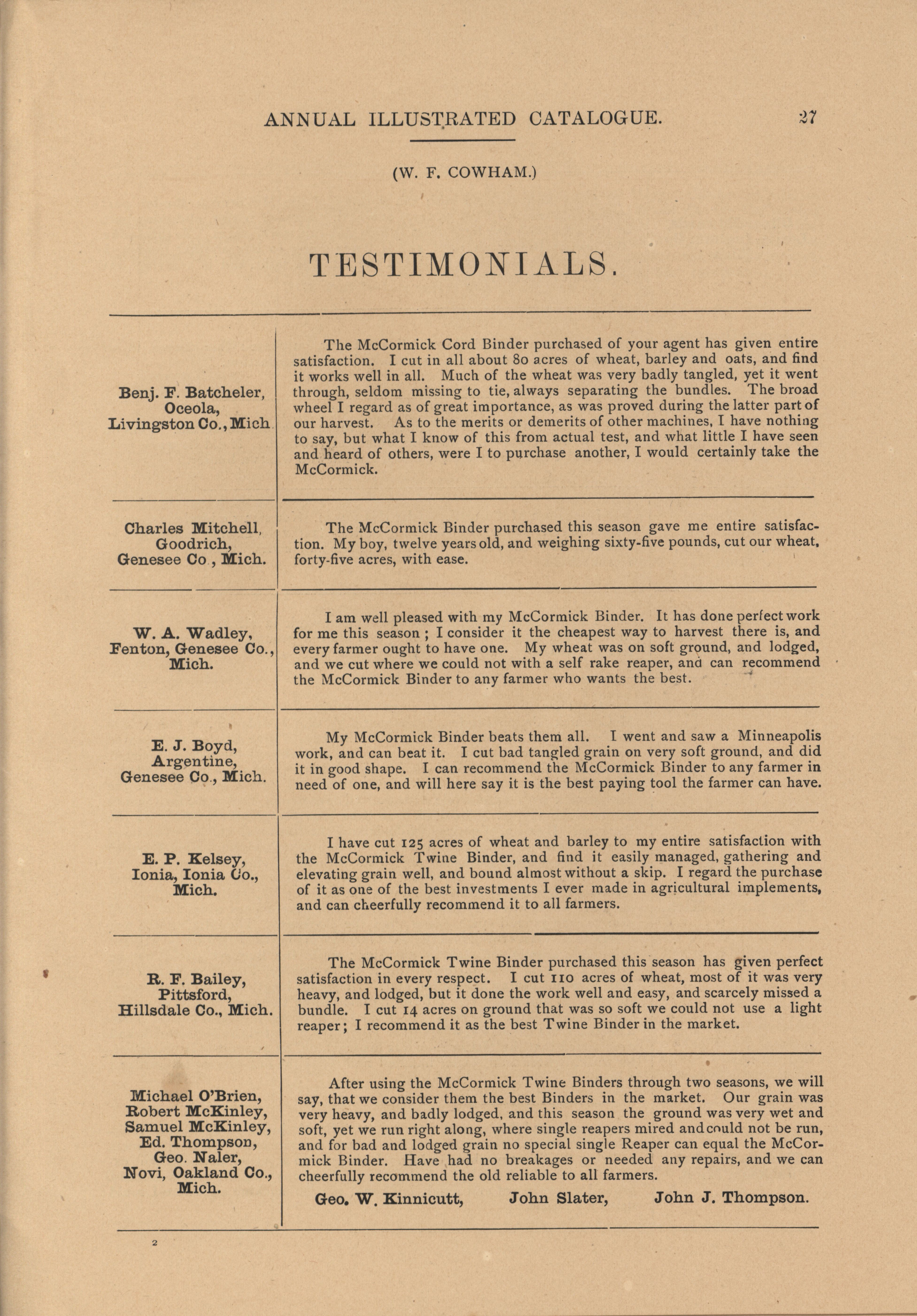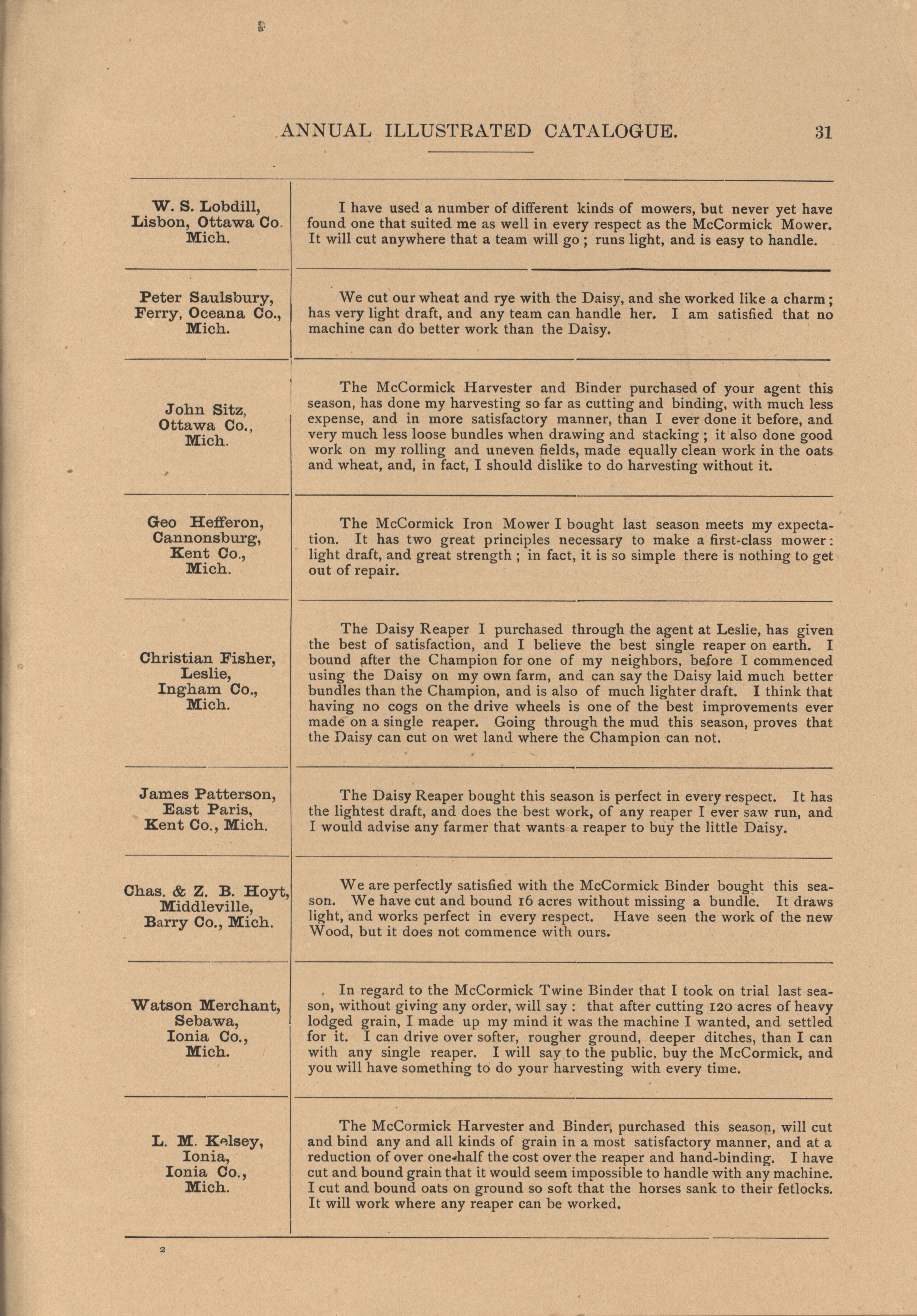 - "McCormick Harvesting Machine Company 1884 catalog", Agricultural Machinery Literature Collection, Iowa State University Library Digital Collections