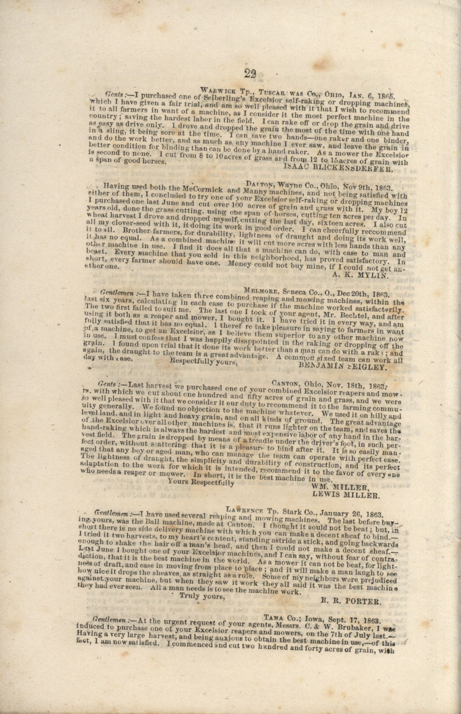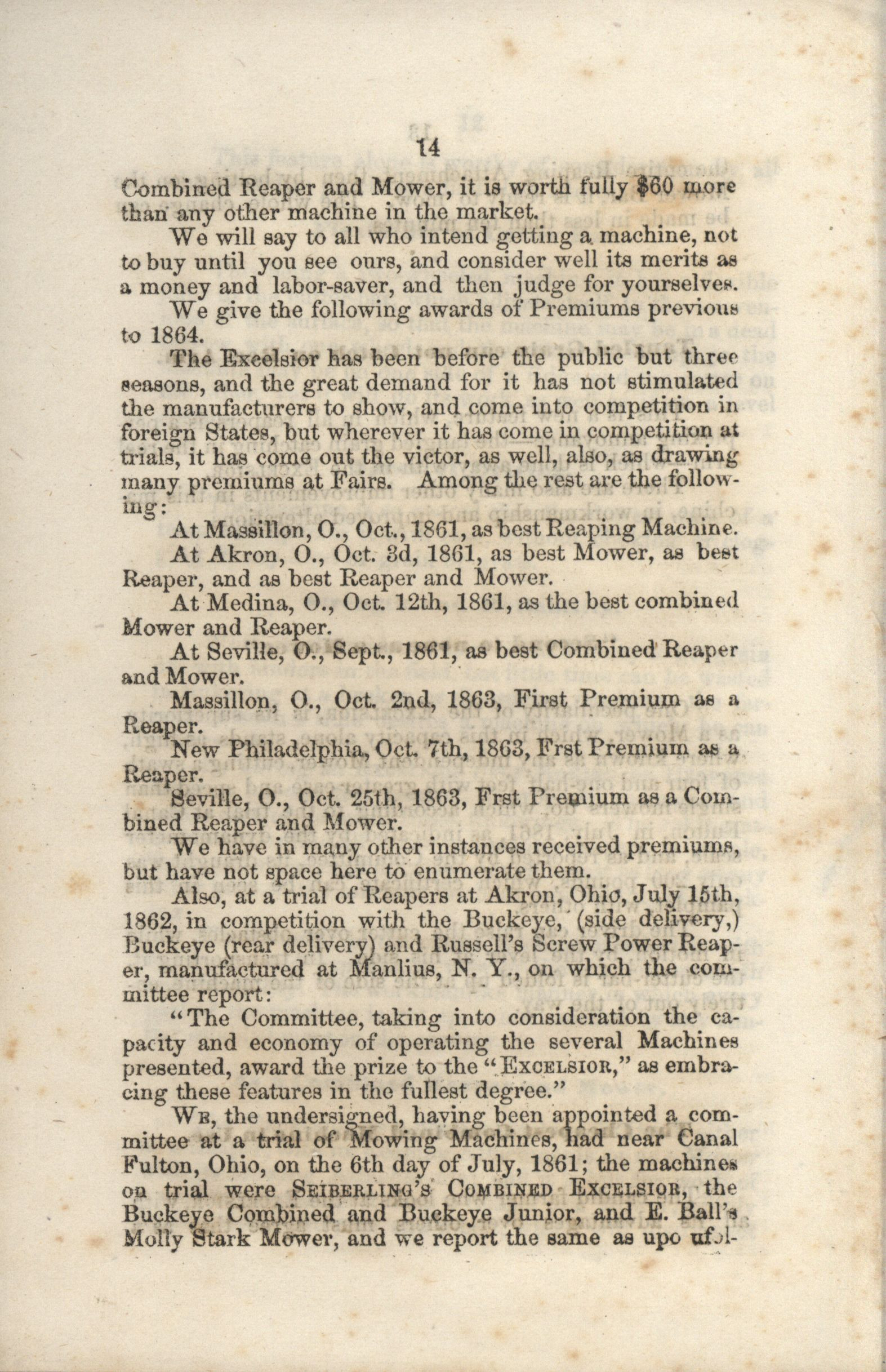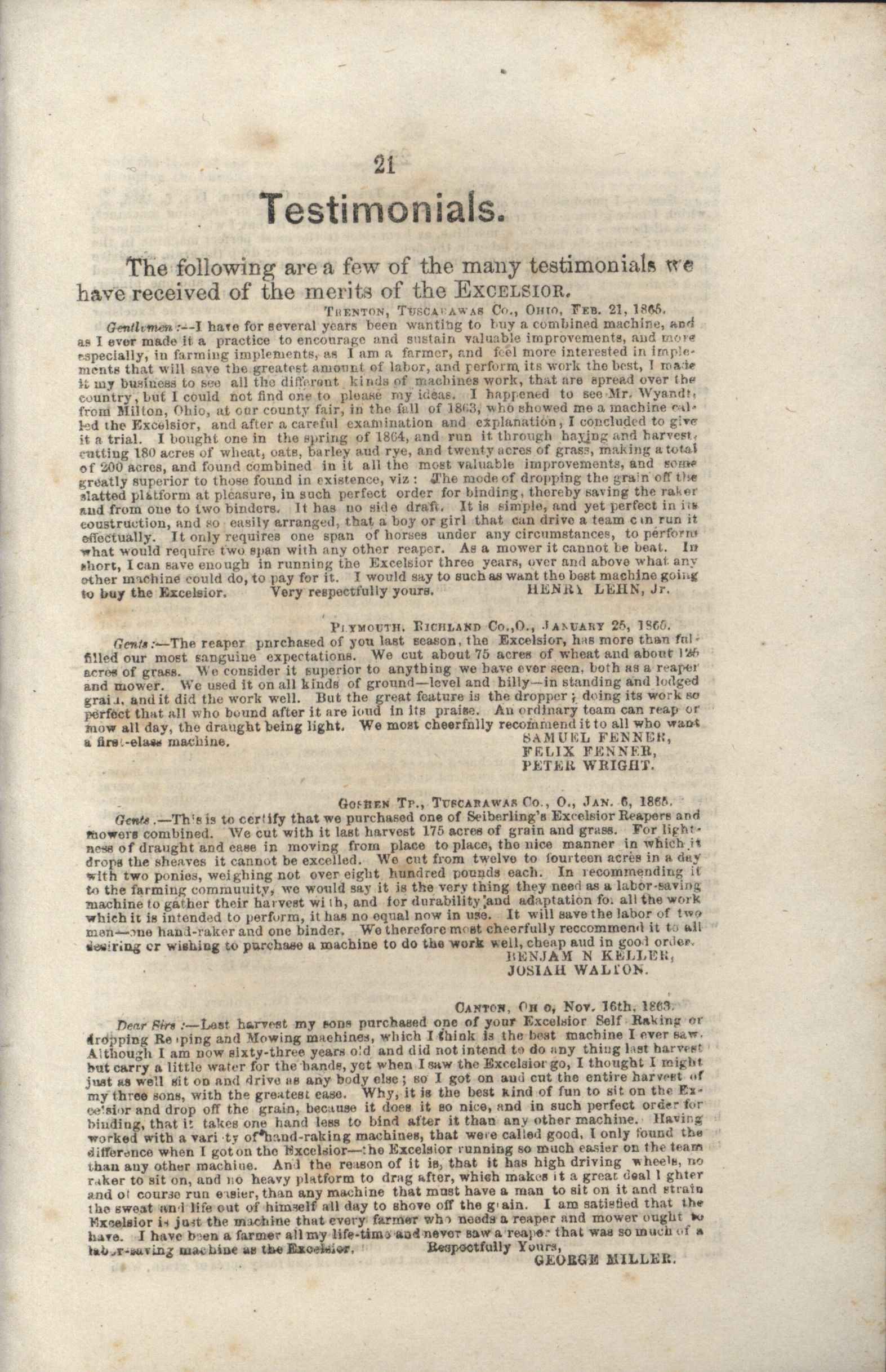 - "Seiberling's Excelsior Self-Raking of Dropping Reaper and Mower, Manufactured by Wyandts Putman and Company catalog", Agricultural Machinery Literature Collection, Iowa State University Library Digital Collections
