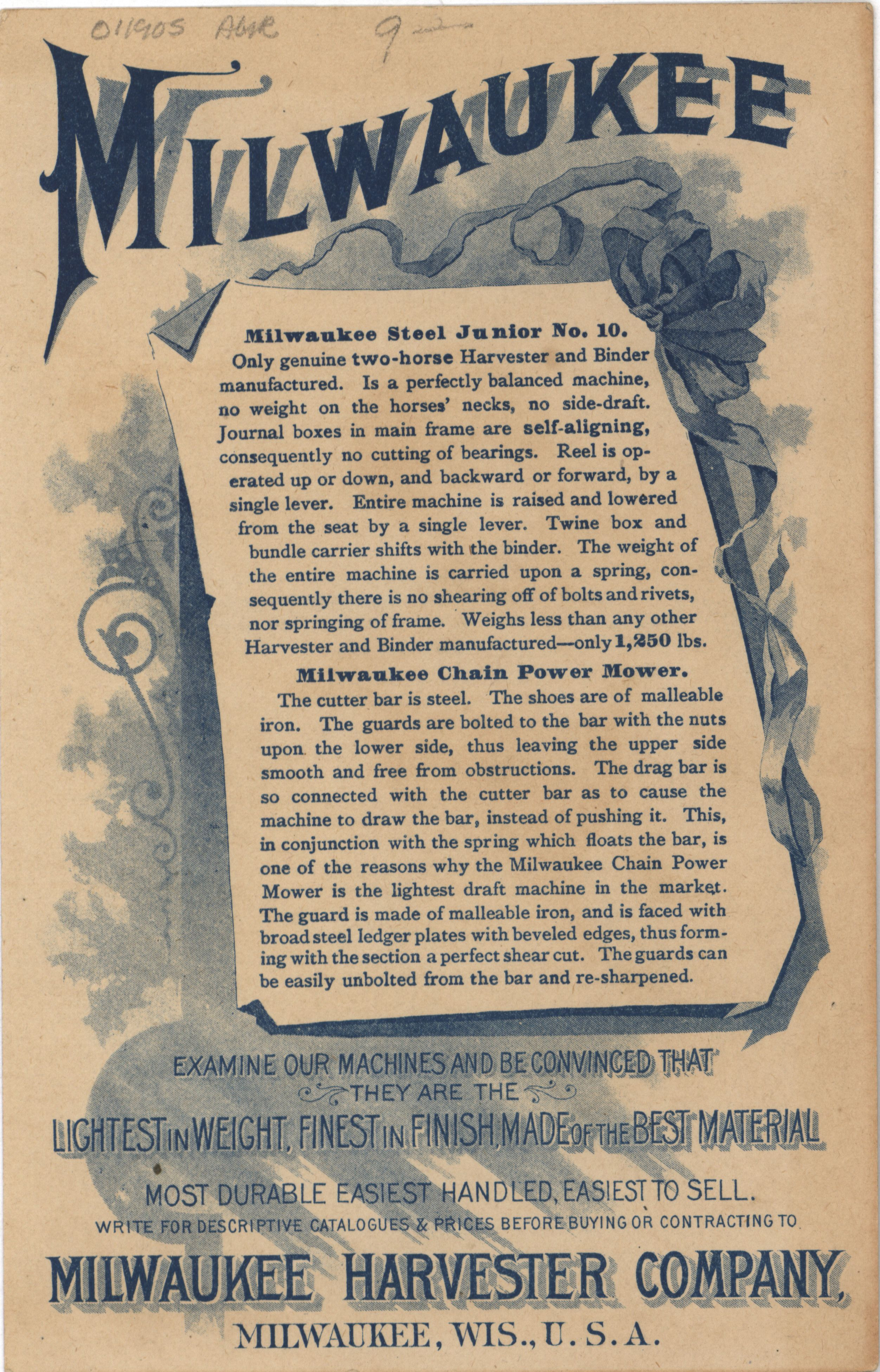 - "Milwaukee Harvester Company advertisement", Agricultural Machinery Literature Collection, Iowa State University Library Digital Collections